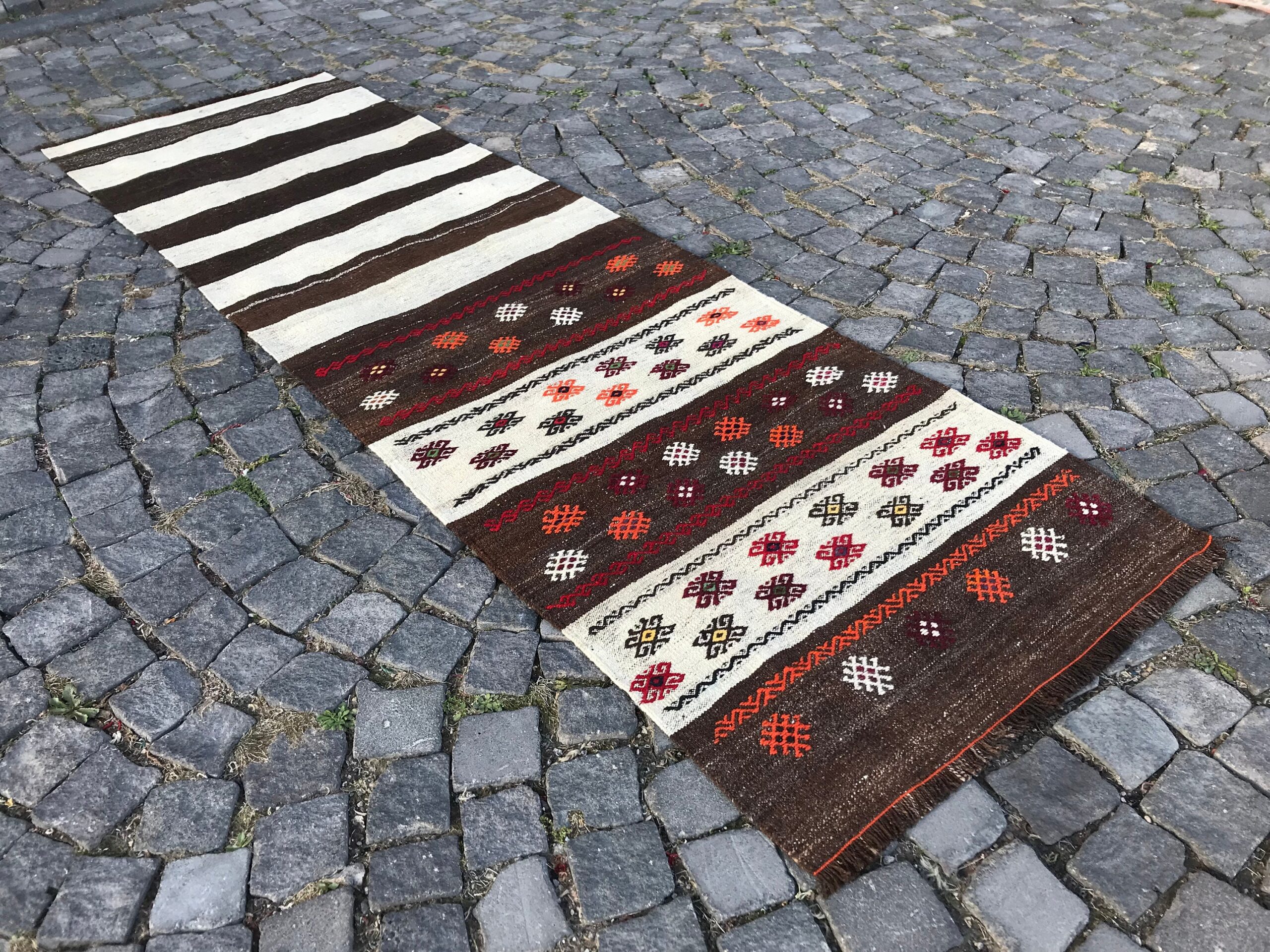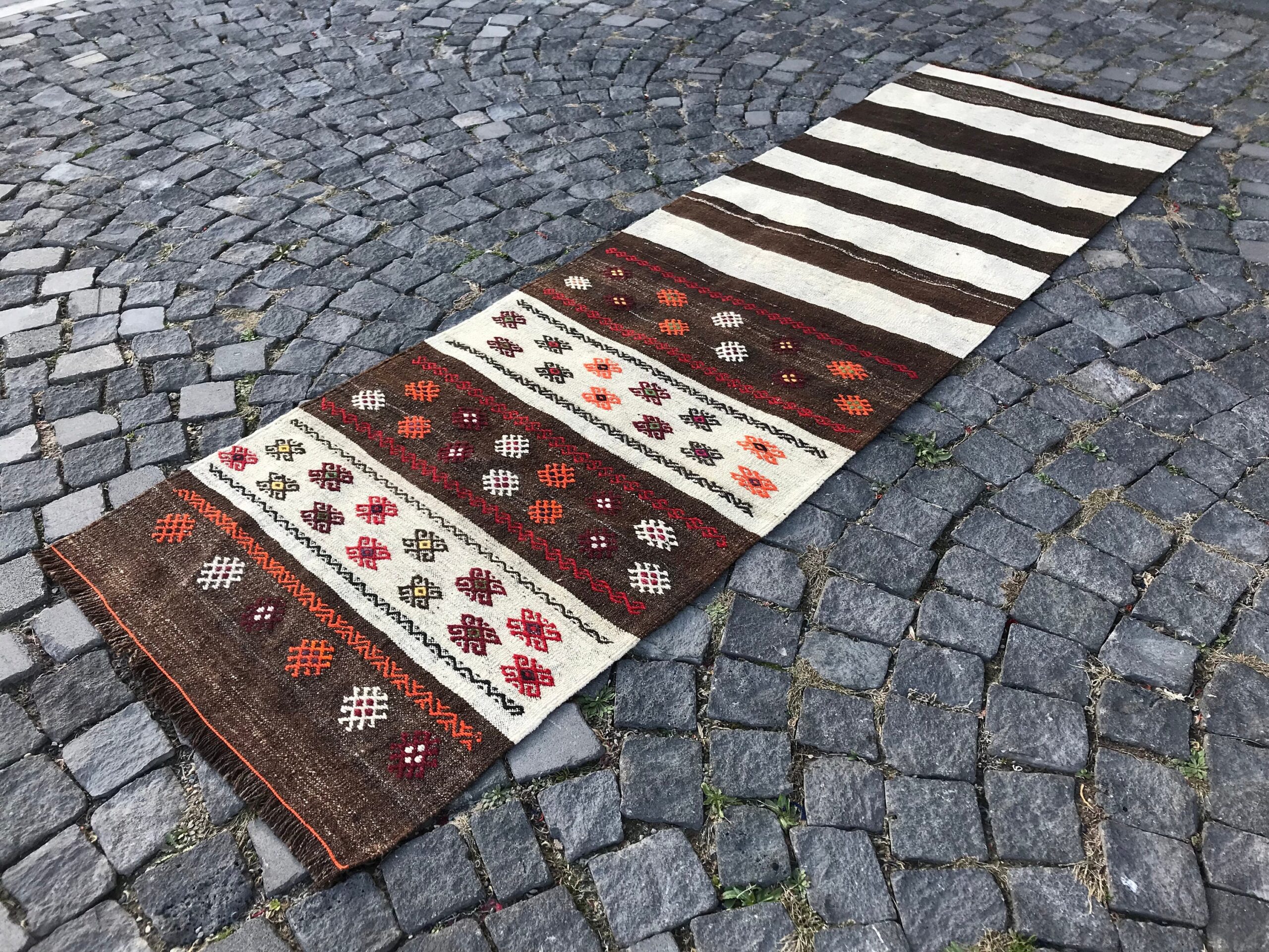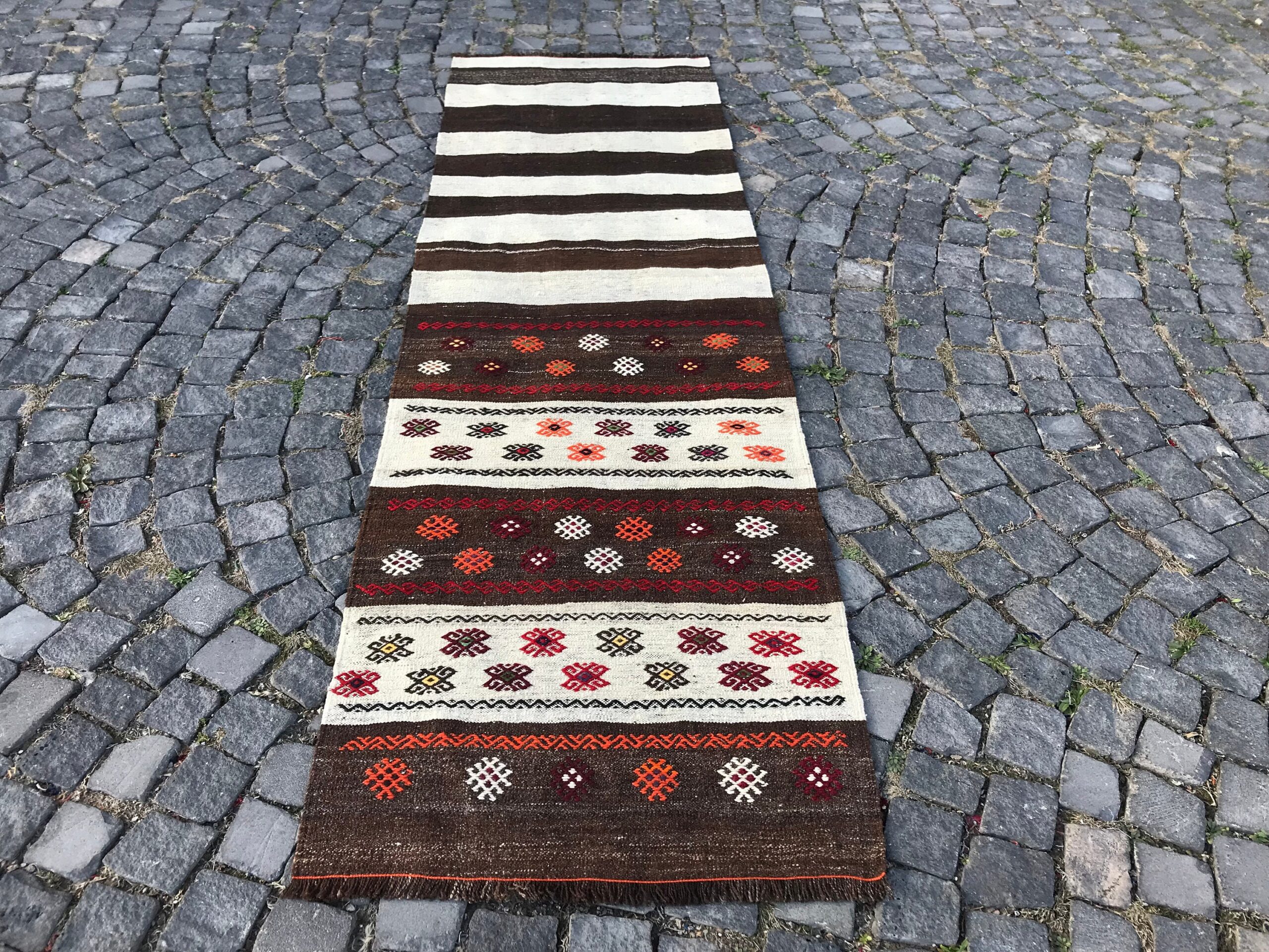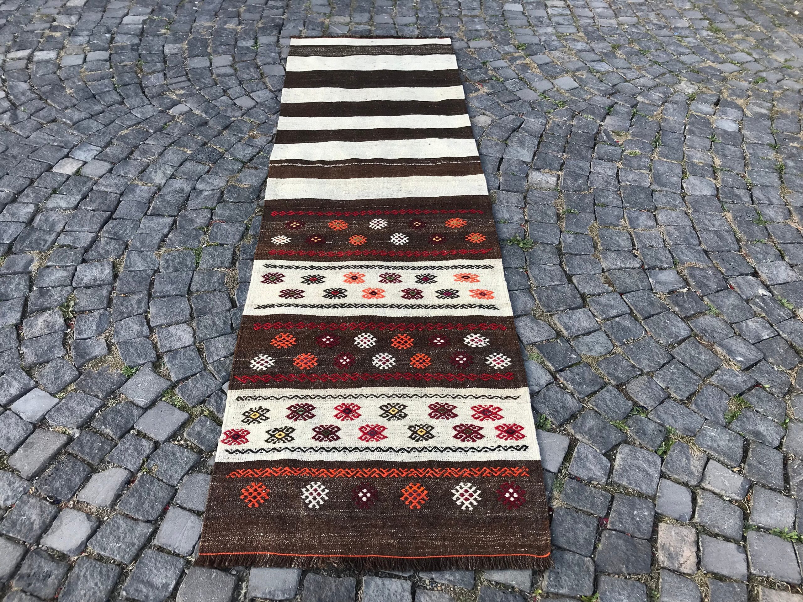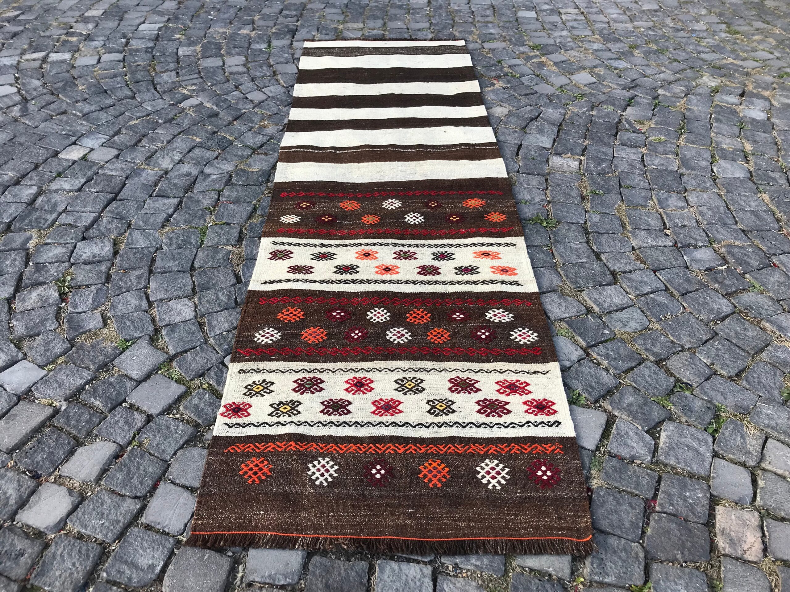 Lovely and unique 2.6 ft. x 8.7 ft. (79 cm x 264 cm) vintage kilim rug hand-woven in Turkey from organic wool. This is an authentic vintage kilim rug from the 1980s that has worn beautifully to perfection.