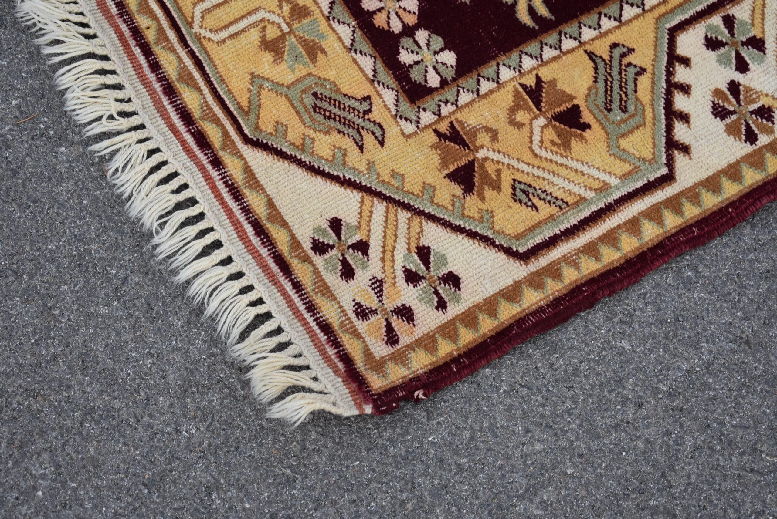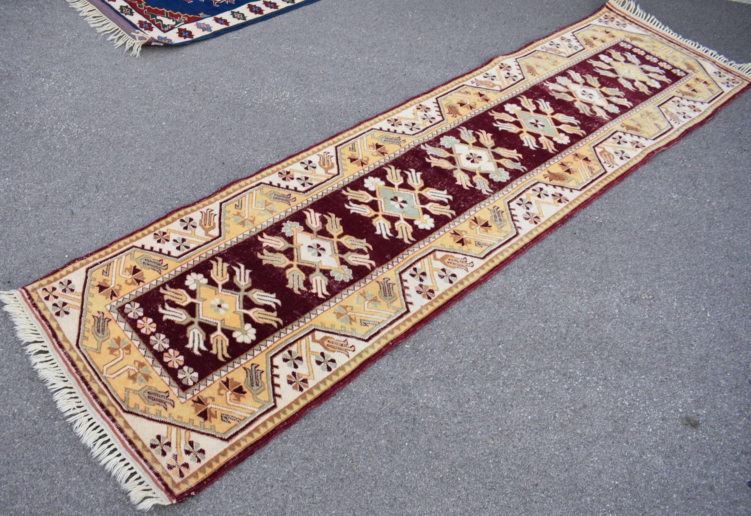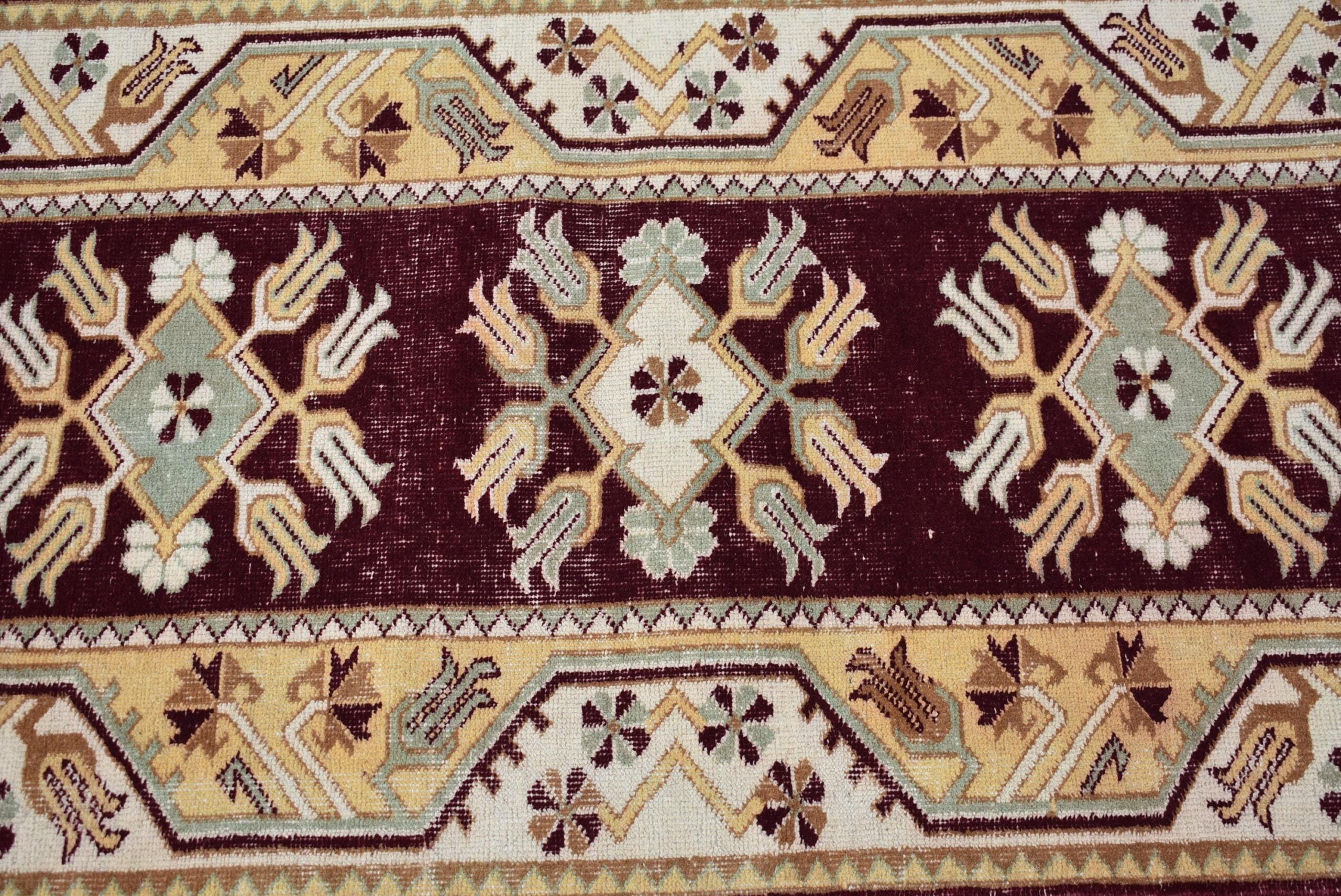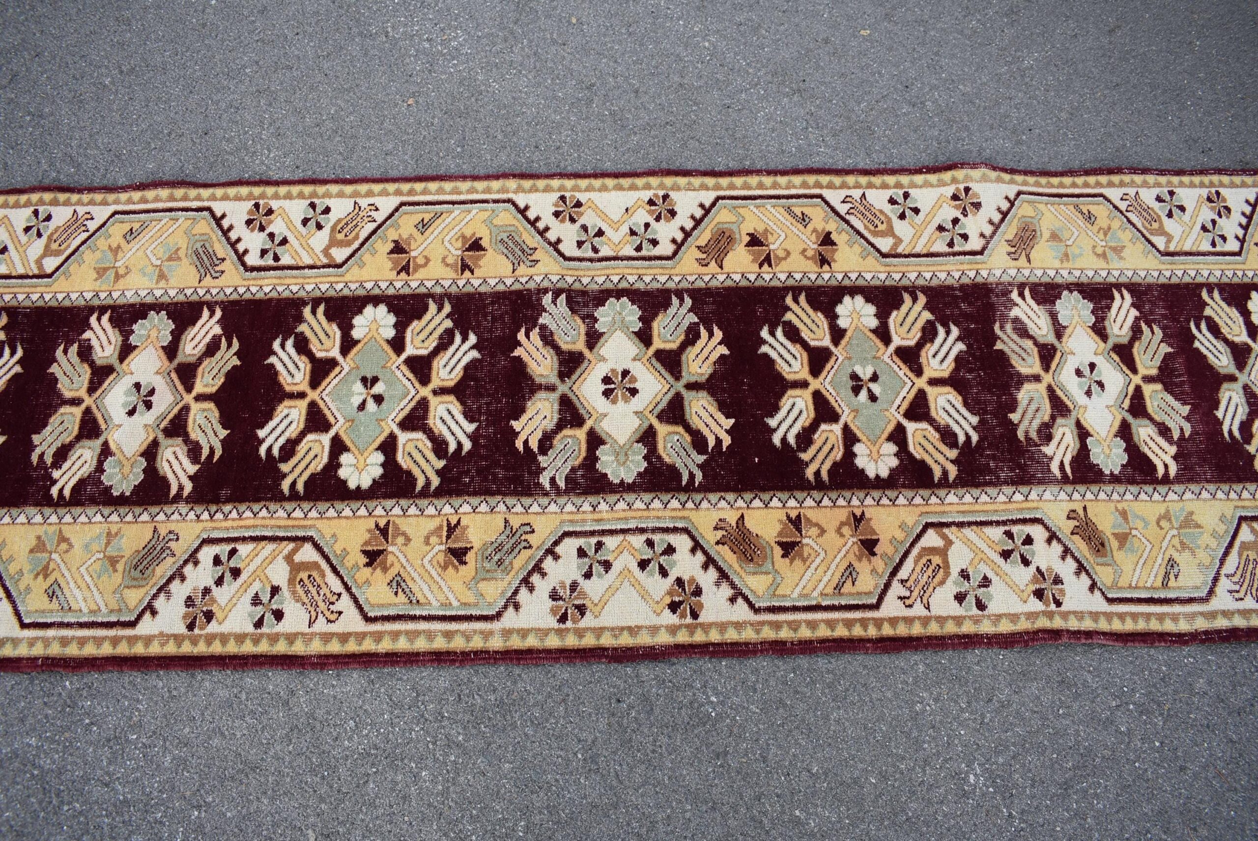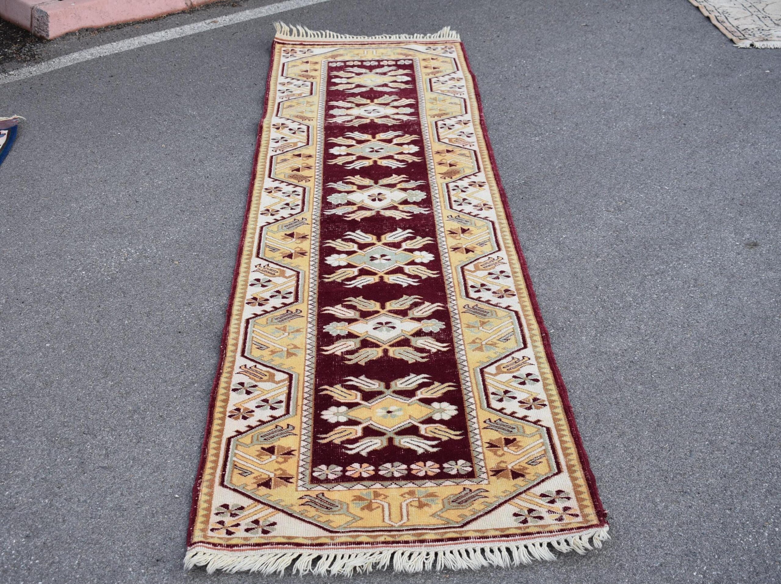 Lovely and unique 2.6 ft. x 9.5 ft. (78 cm x 290 cm) vintage Turkish rug hand-knotted in Turkey from organic wool. This is an authentic vintage Turkish rug from the 1990s that has worn beautifully to perfection.