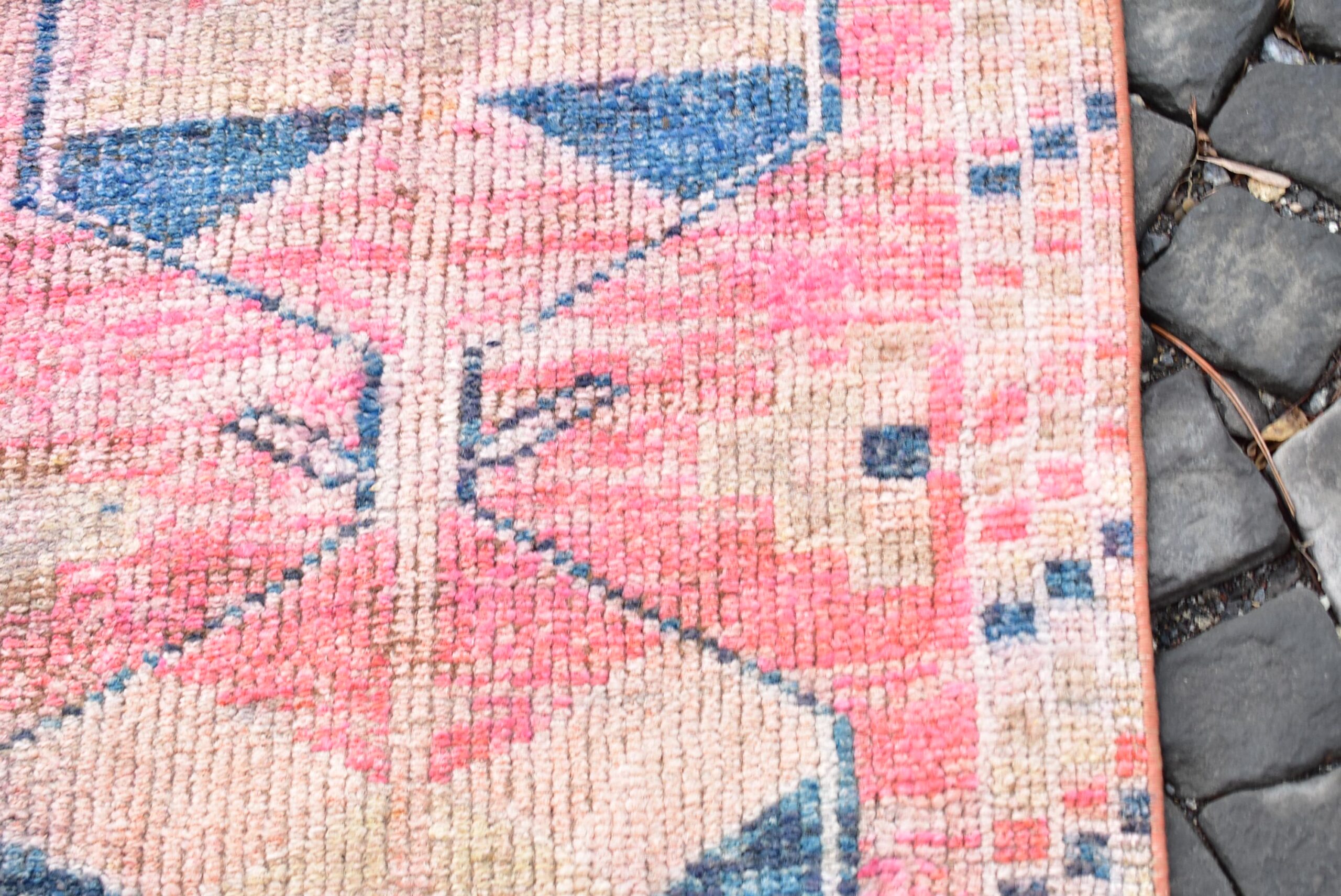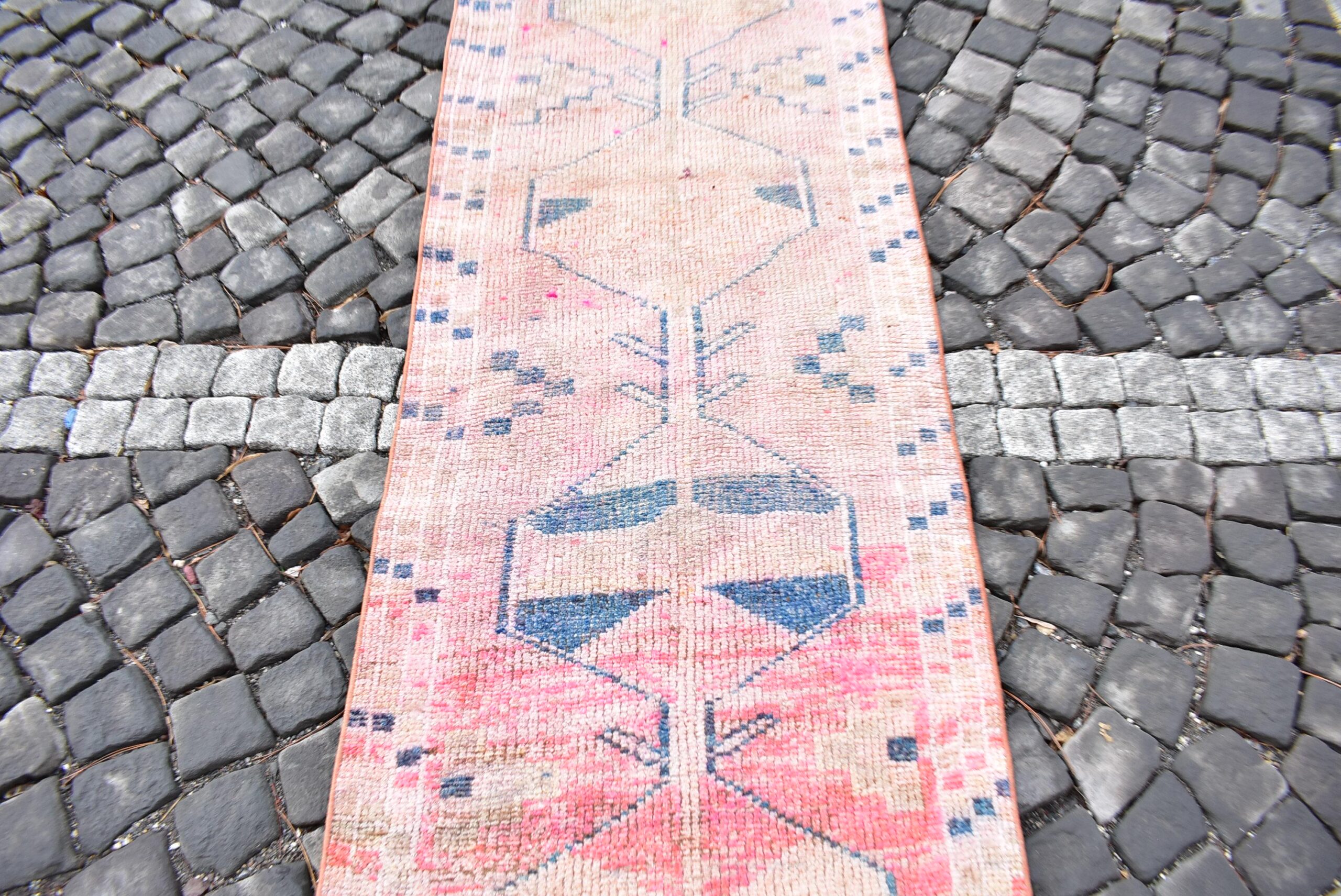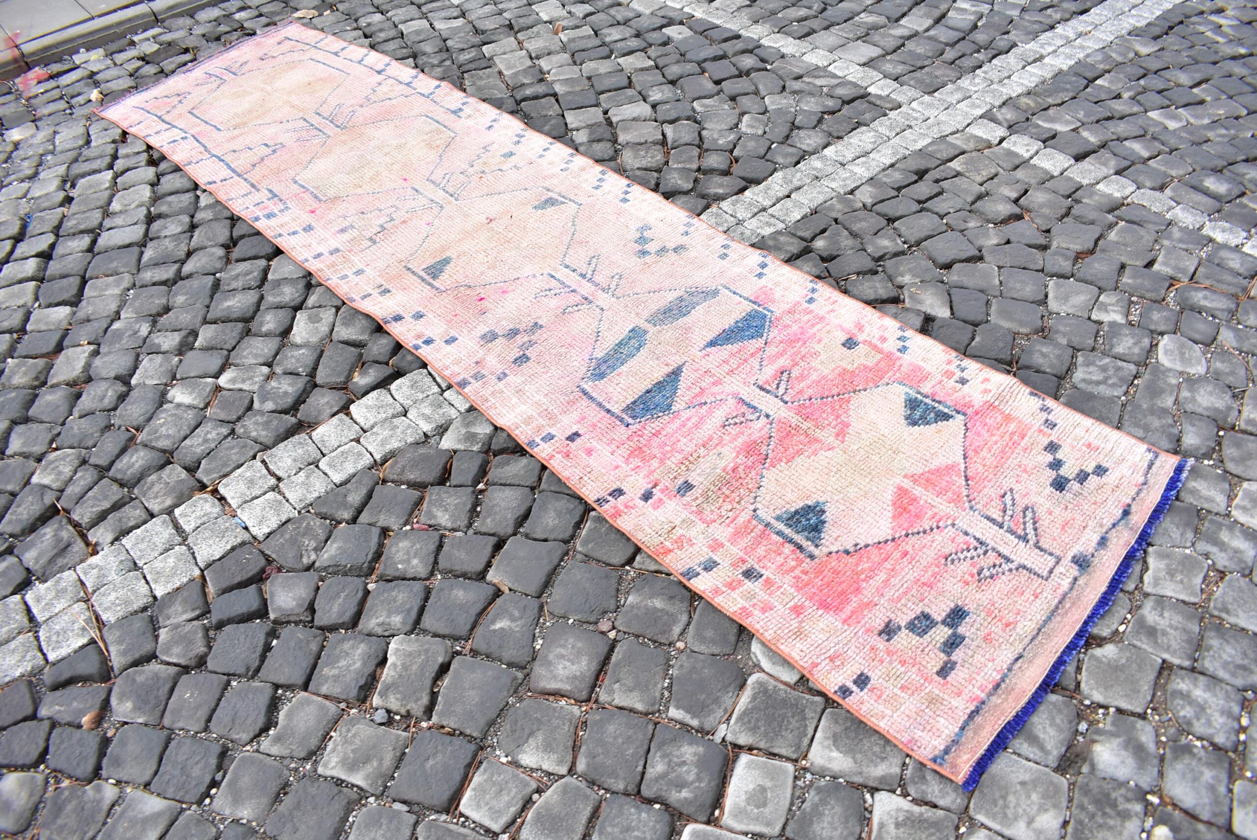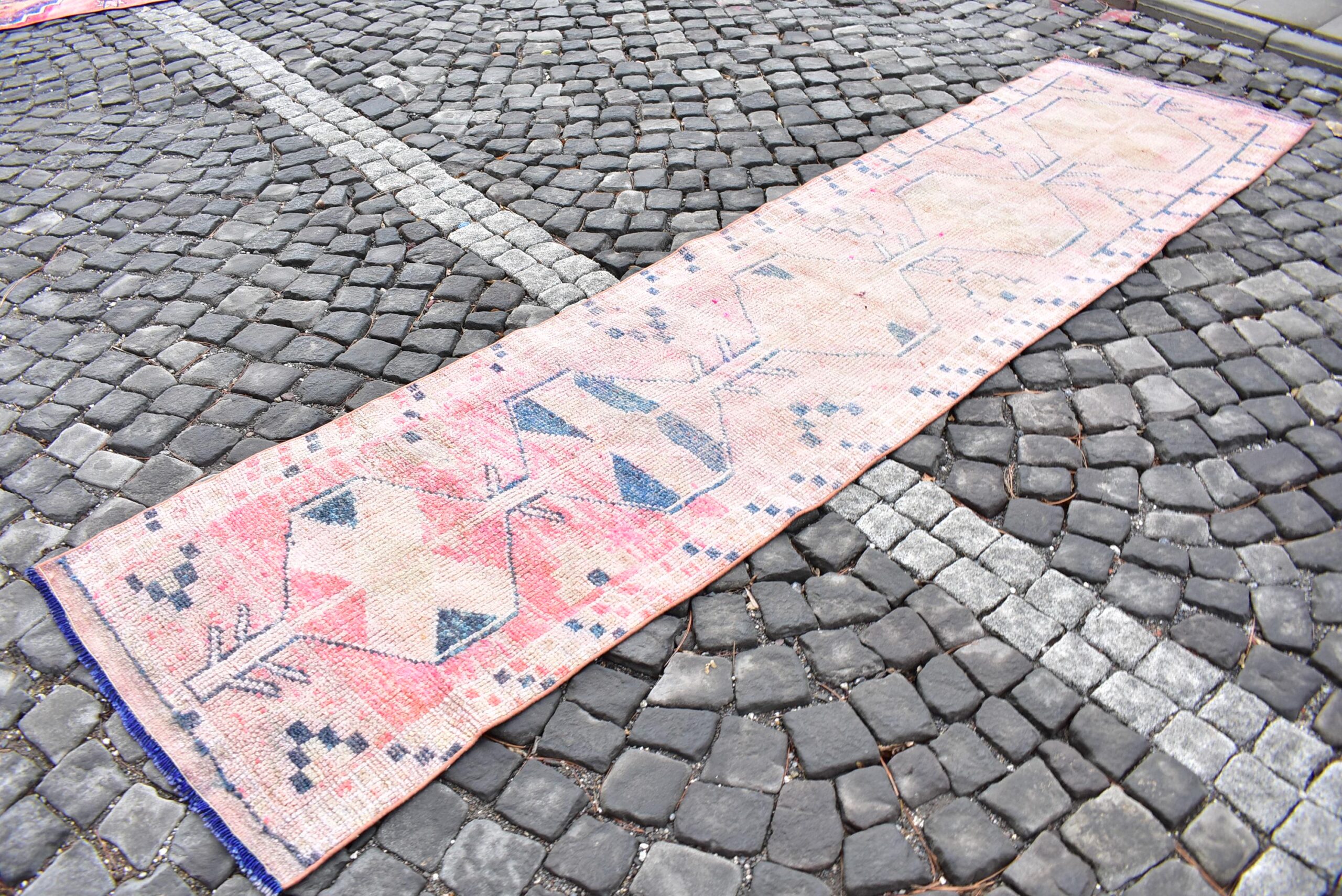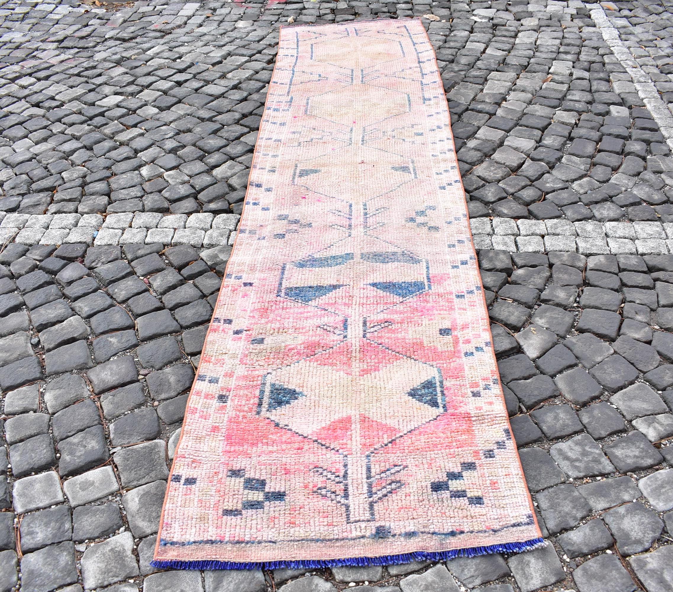 Pretty and one-of-a-kind 2.7 ft. x 11.1 ft. (82 cm x 338 cm) vintage Turkish rug hand-knotted in Turkey from organic wool. This is an authentic vintage Turkish rug from the 1970s that has worn splendidly to perfection.