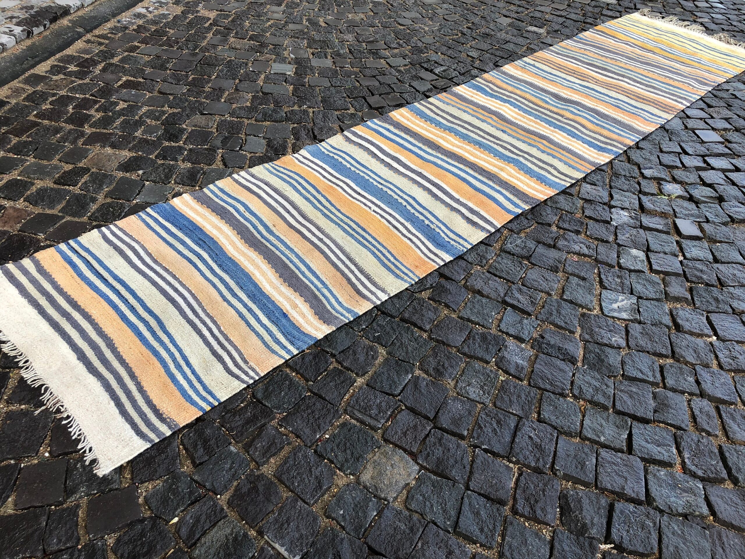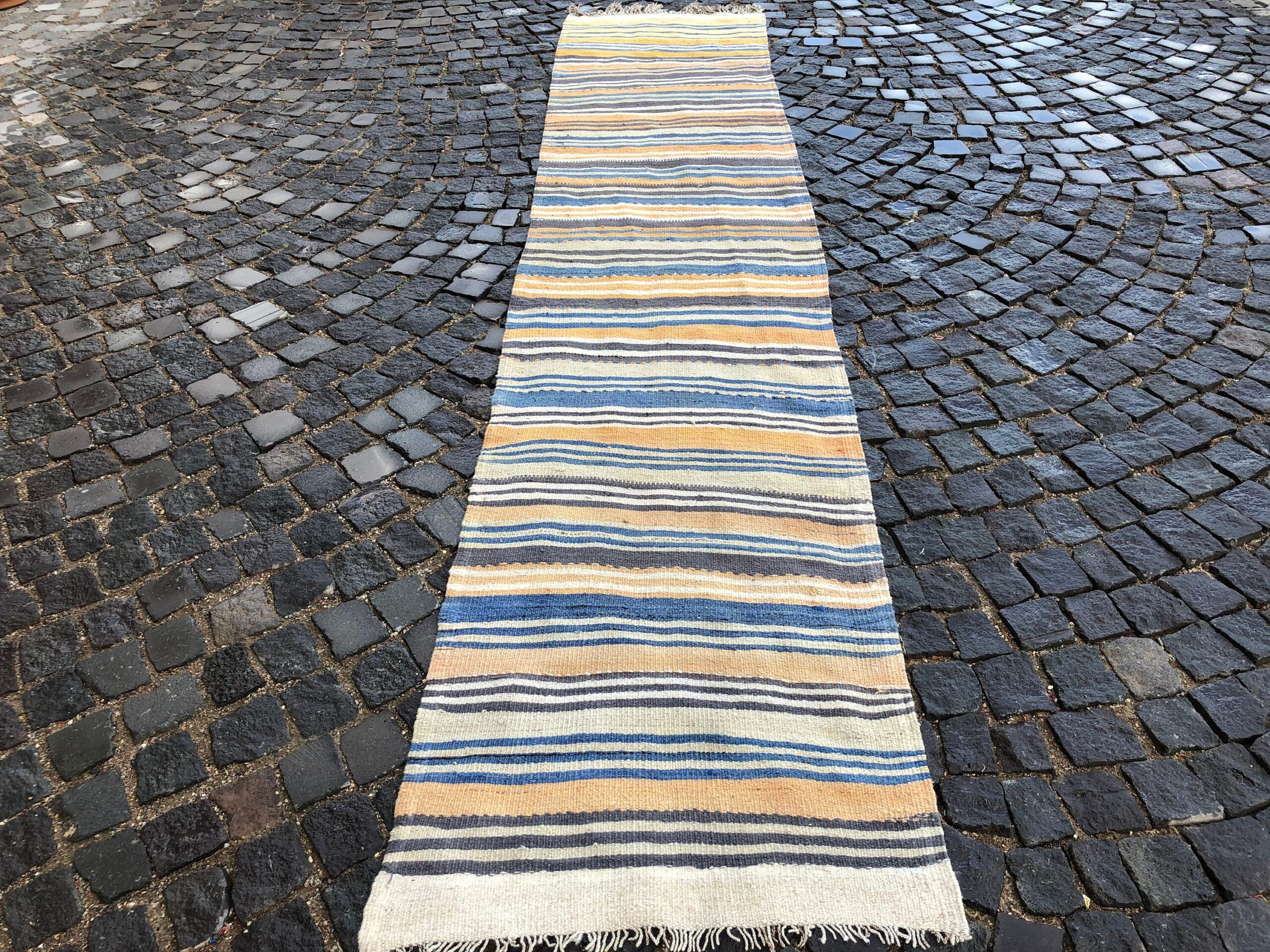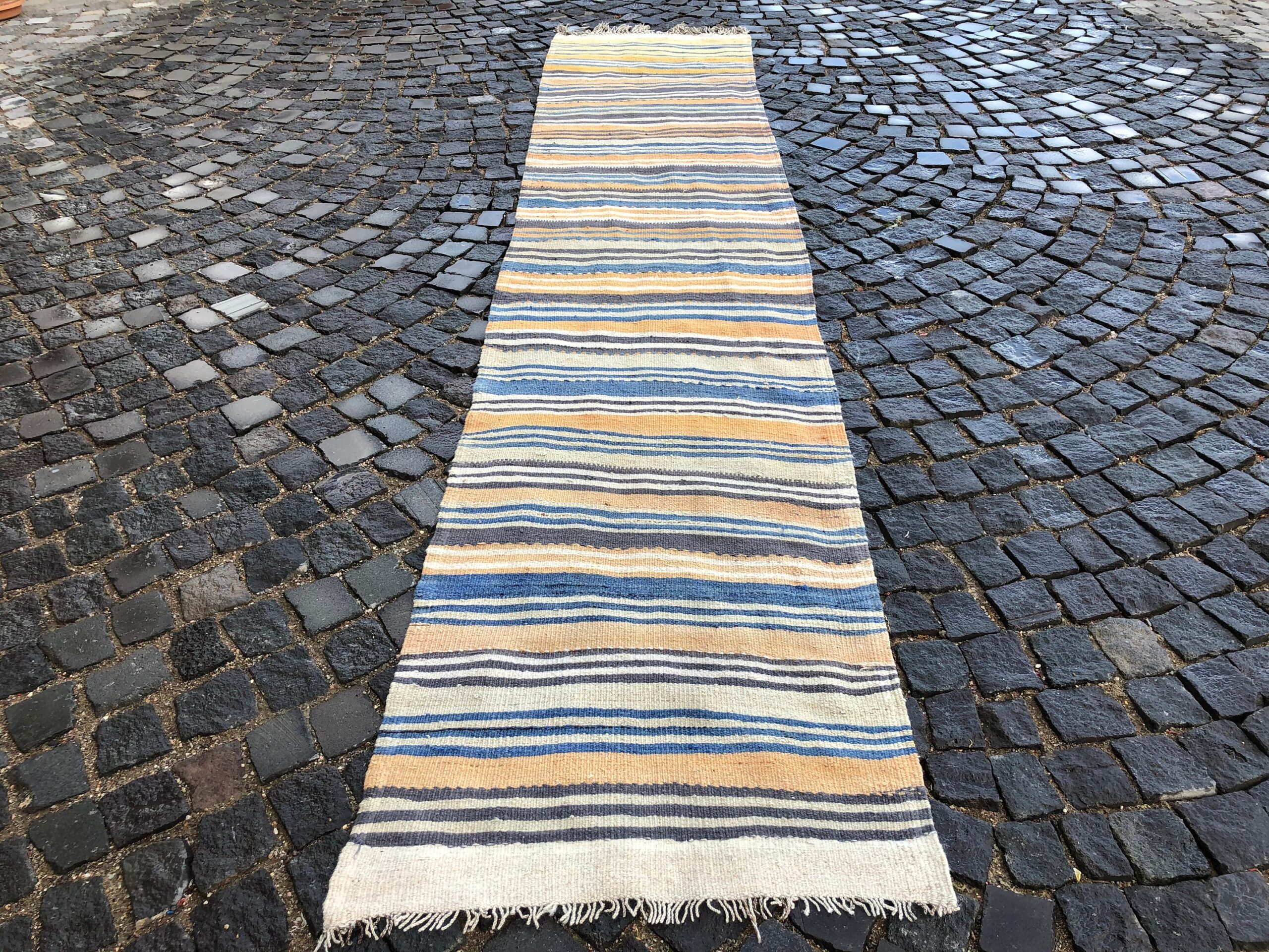 Beautiful and one-of-a-kind 2.7 ft. x 12.8 ft. (81 cm x 390 cm) vintage kilim rug hand-woven in Turkey from organic wool. This is an authentic vintage kilim rug from the 1970s that has worn admirably to perfection.