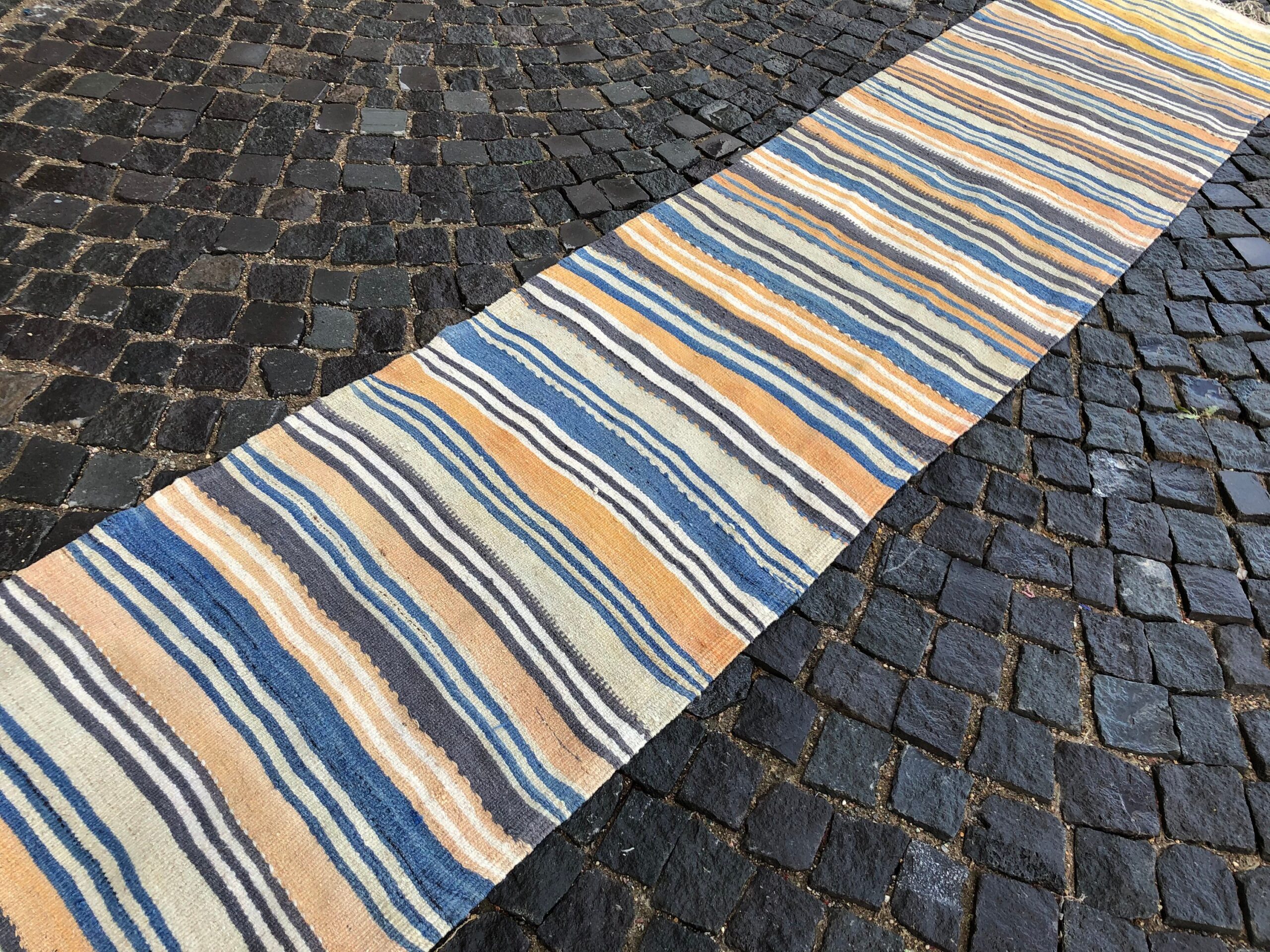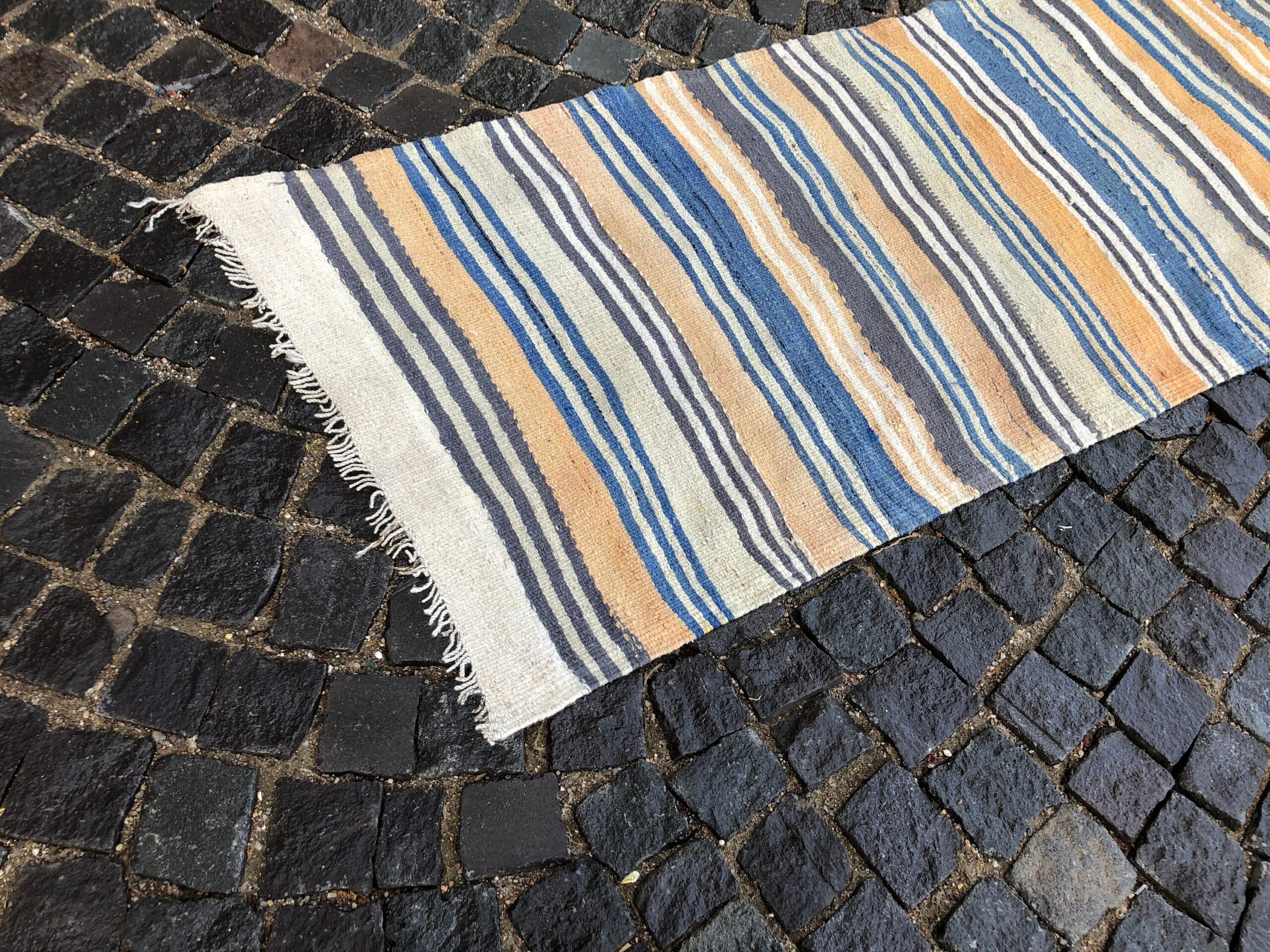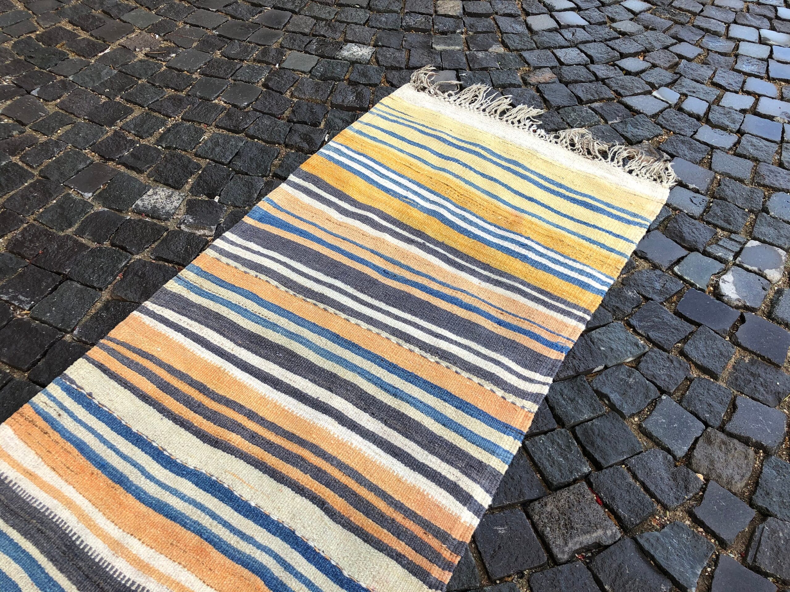 Beautiful and one-of-a-kind 2.7 ft. x 12.8 ft. (81 cm x 390 cm) vintage kilim rug hand-woven in Turkey from organic wool. This is an authentic vintage kilim rug from the 1970s that has worn admirably to perfection.