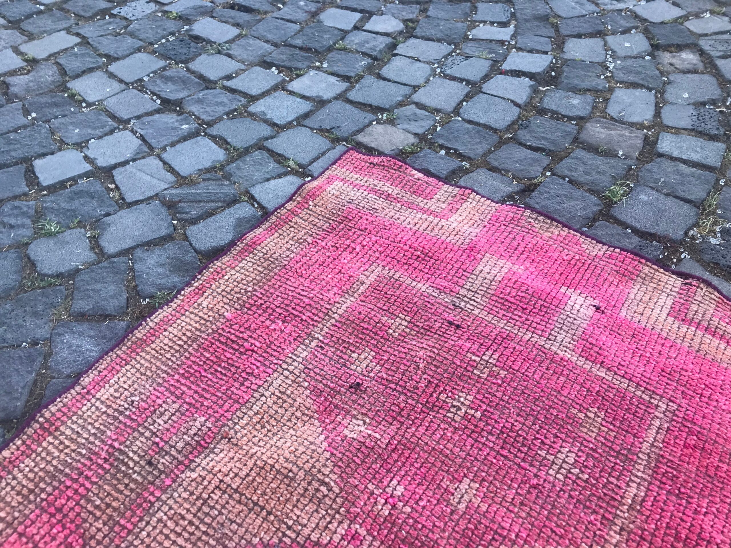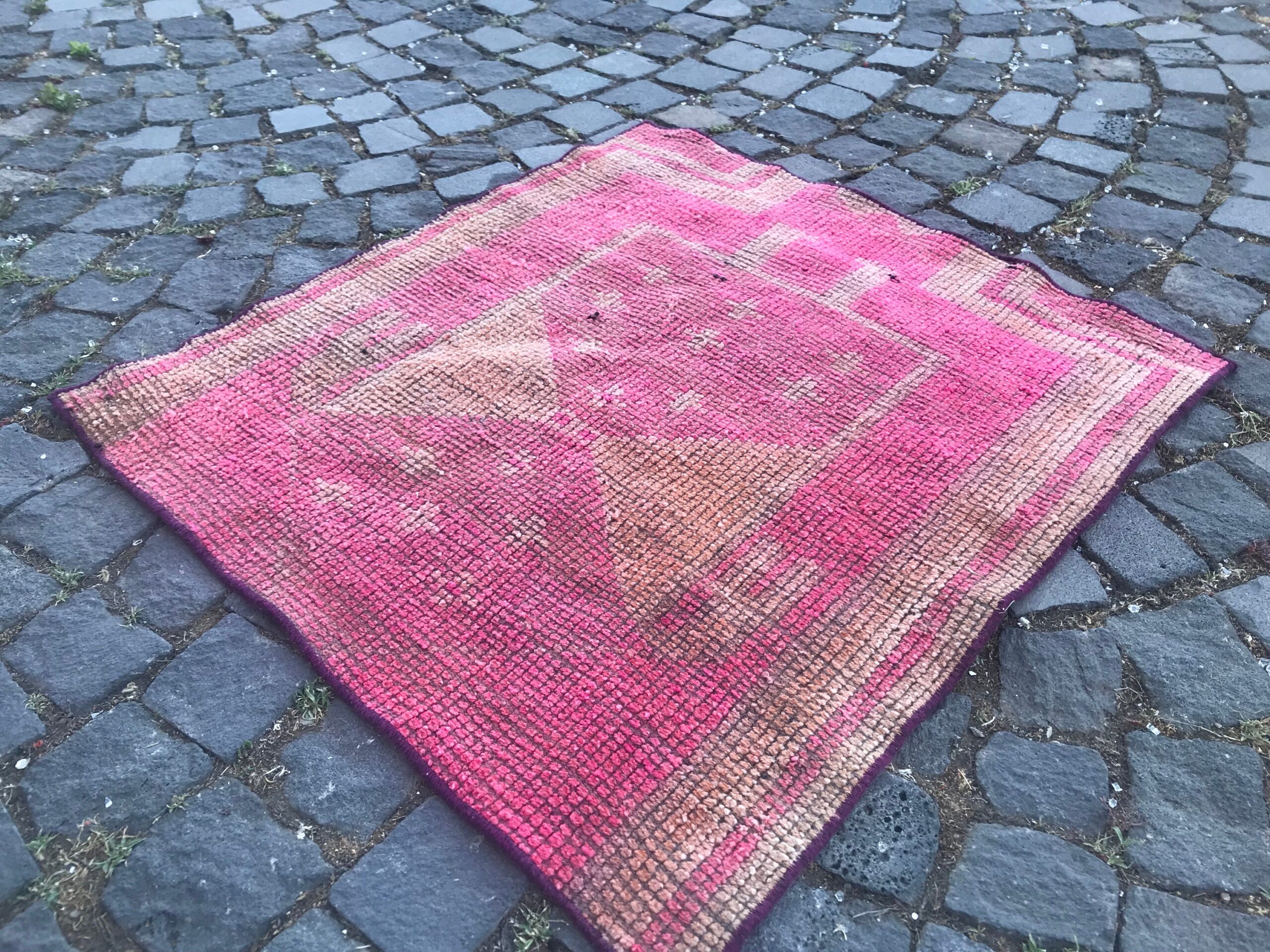 This is a vintage Turkish rug hand-knotted in a small village in Turkey by skilled Anatolian women during around the 1990s. It is made from natural wool (sheep) and dyed using all-natural (vegetable) dyes. Natural materials are more durable than synthetic materials guaranteeing a rug that can last for years while natural dyes provide colors that gets more beautiful as years pass by especially when in direct sunlight.