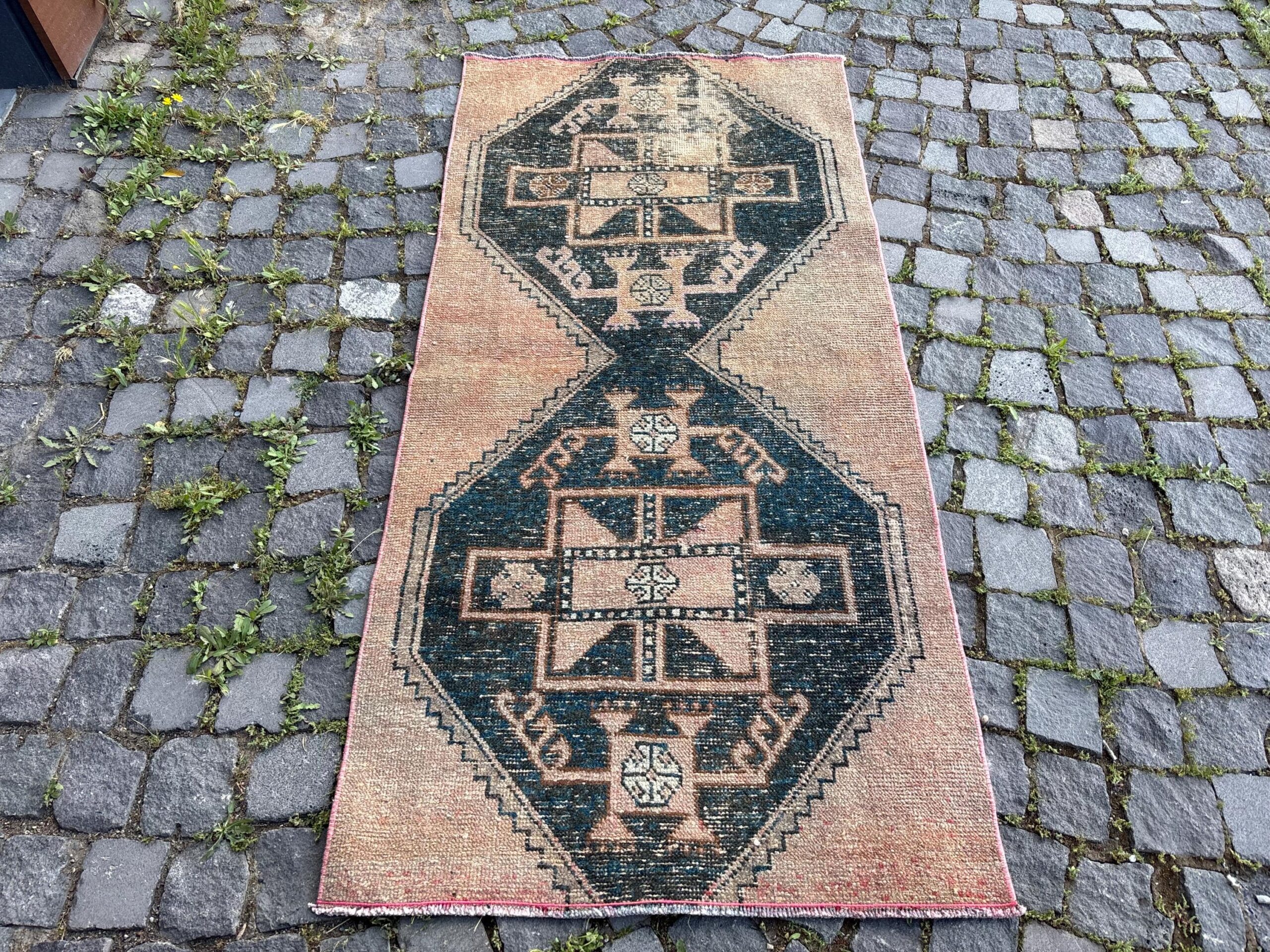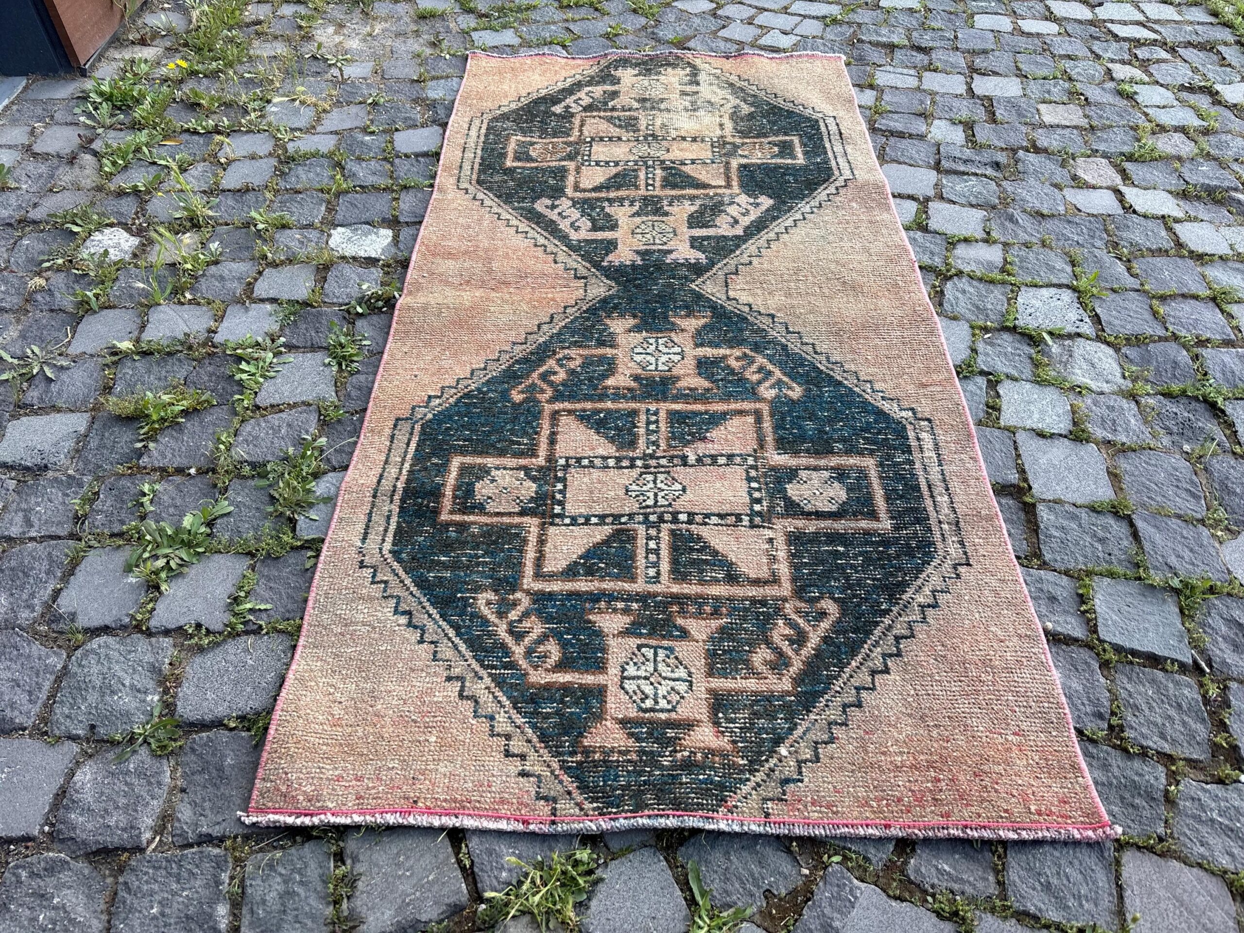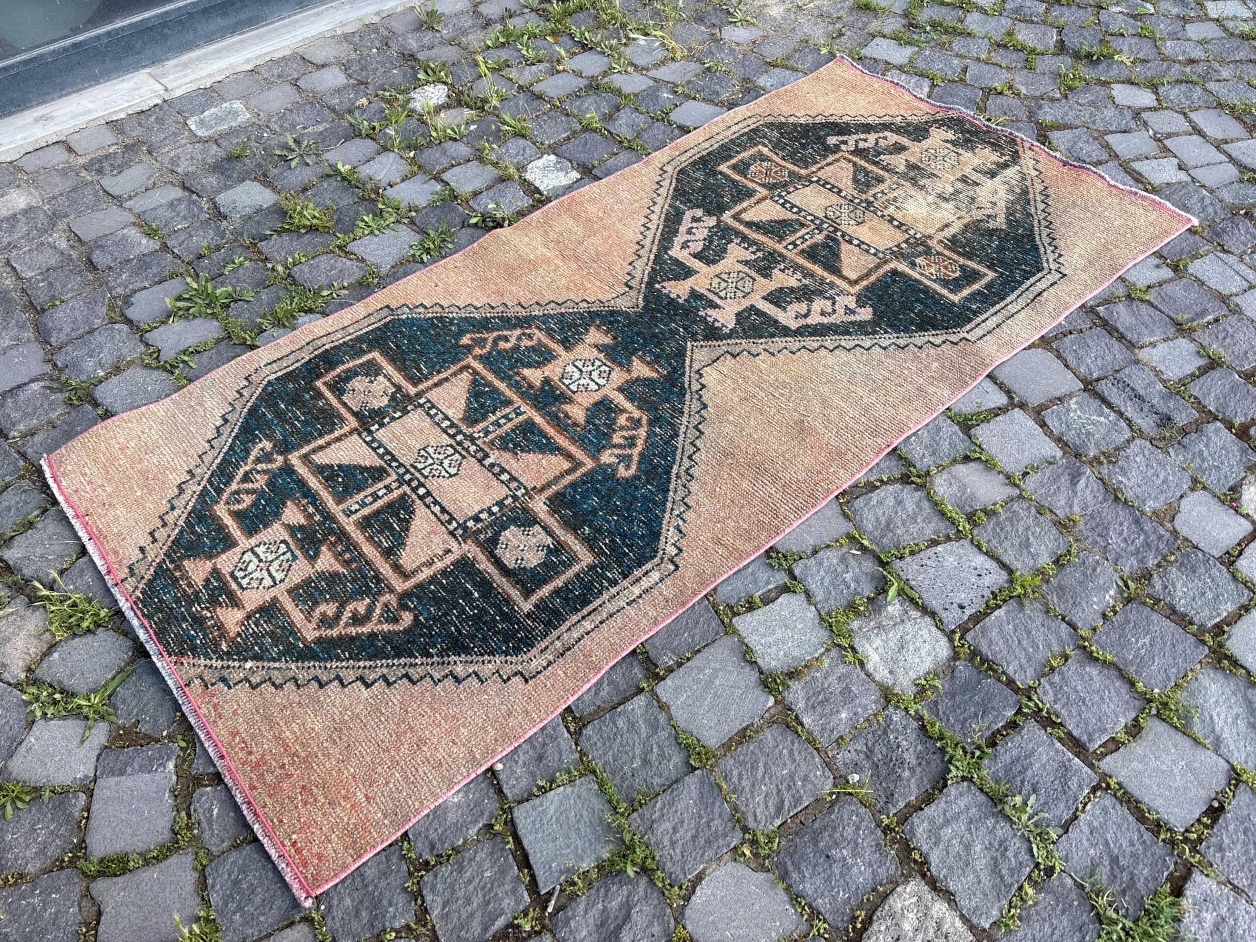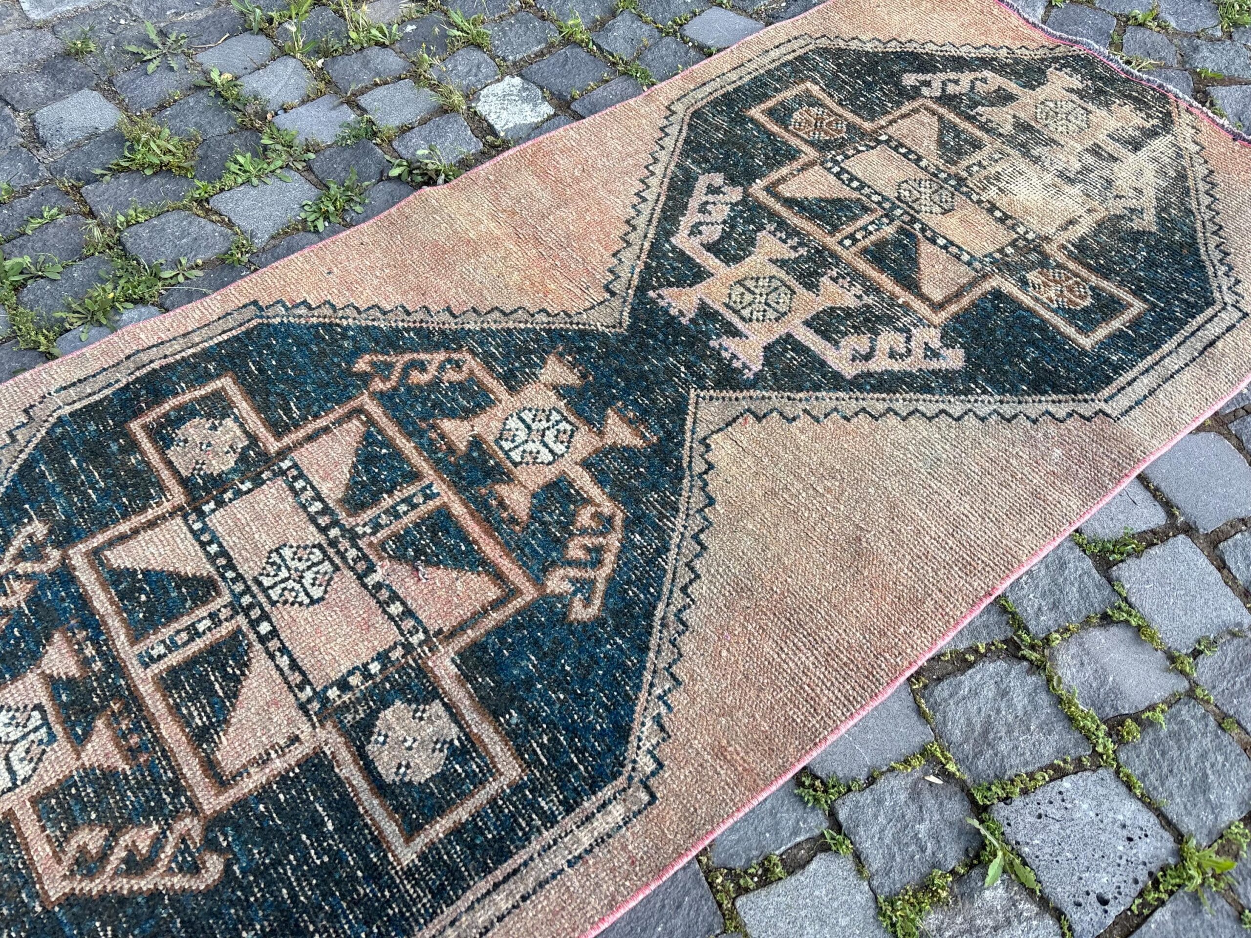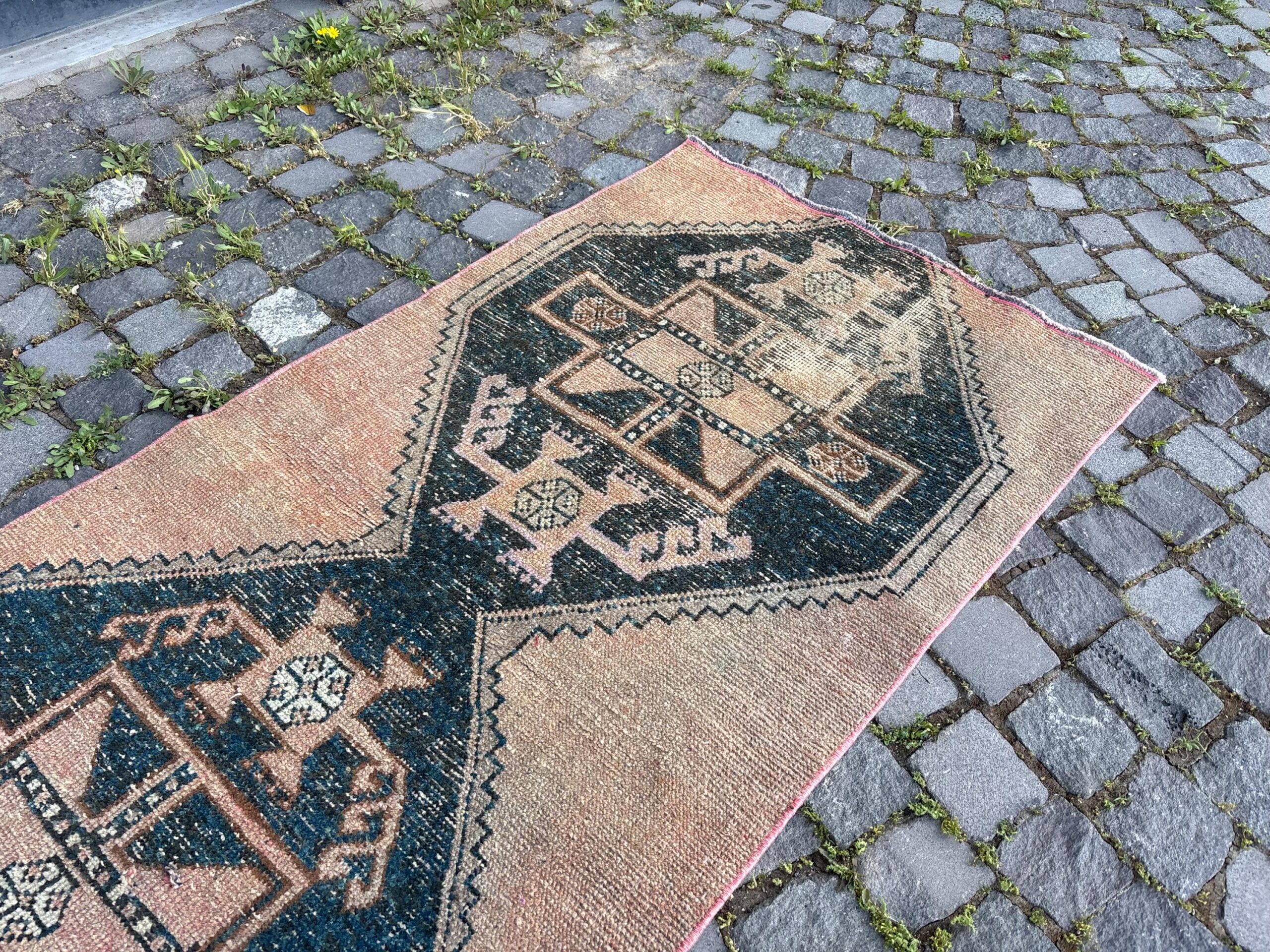 This is a vintage Turkish rug hand-knotted in a small village in Turkey by skilled Anatolian women during around the 1980s. It is made from natural wool (sheep) and dyed using all-natural (vegetable) dyes. Natural materials are more durable than synthetic materials guaranteeing a rug that can last for years while natural dyes provide colors that gets more beautiful as years pass by especially when in direct sunlight.