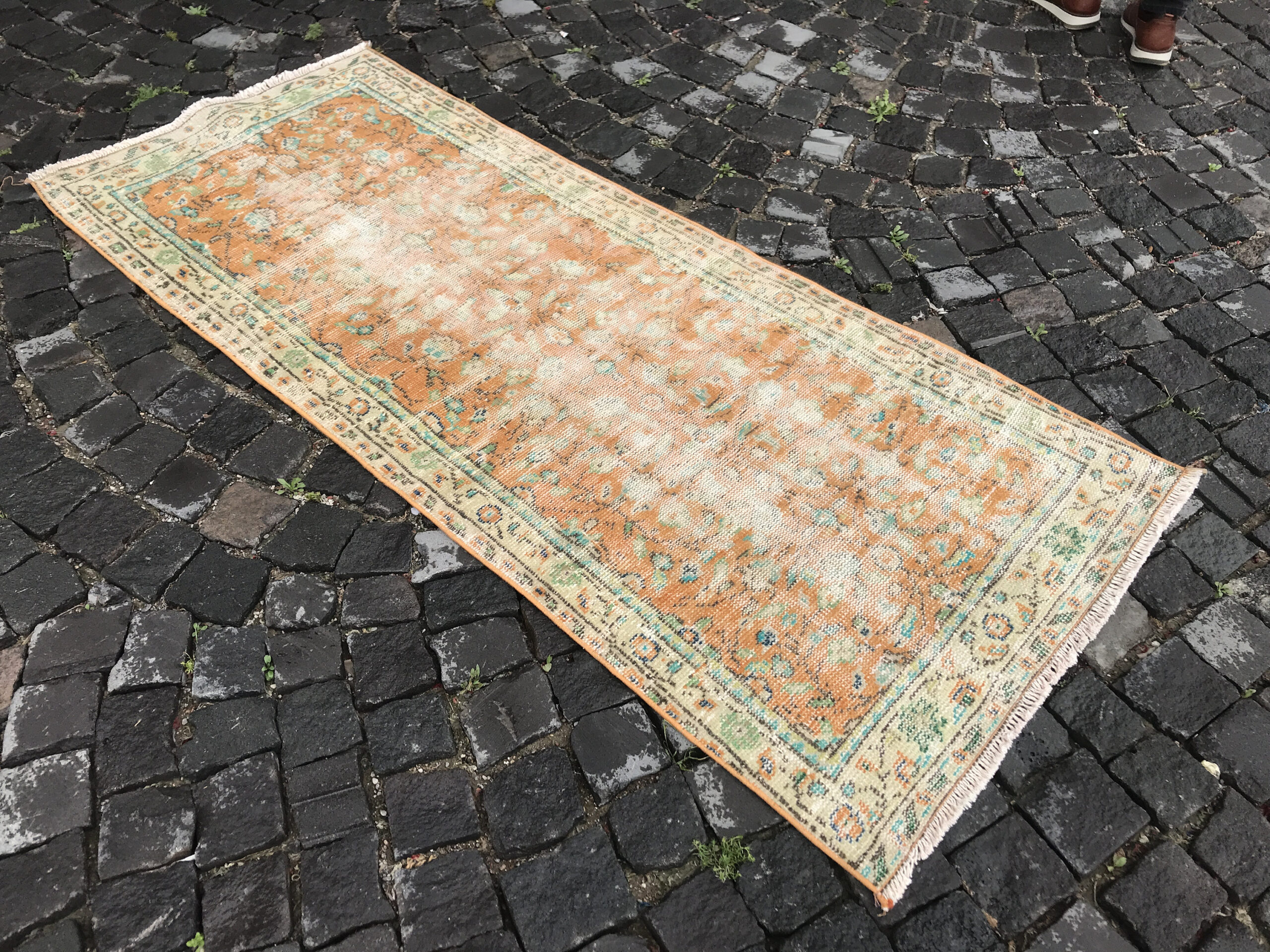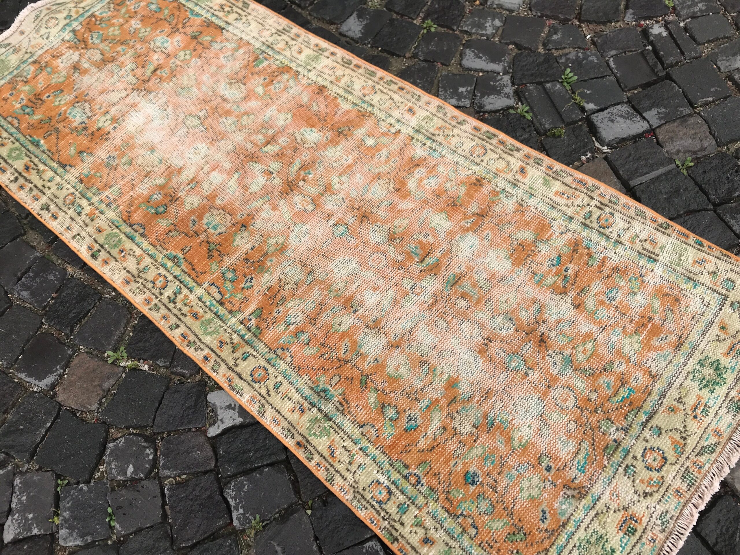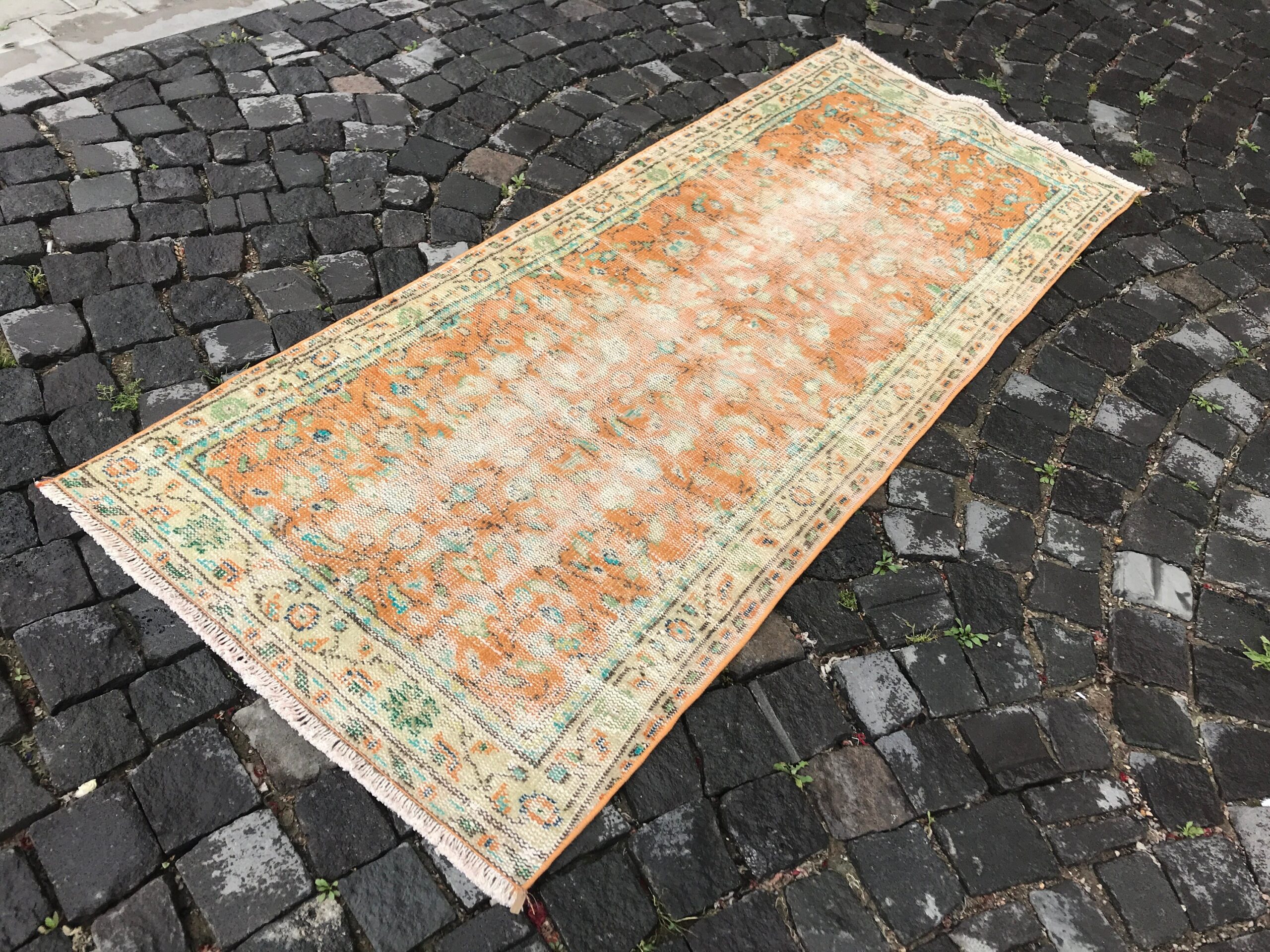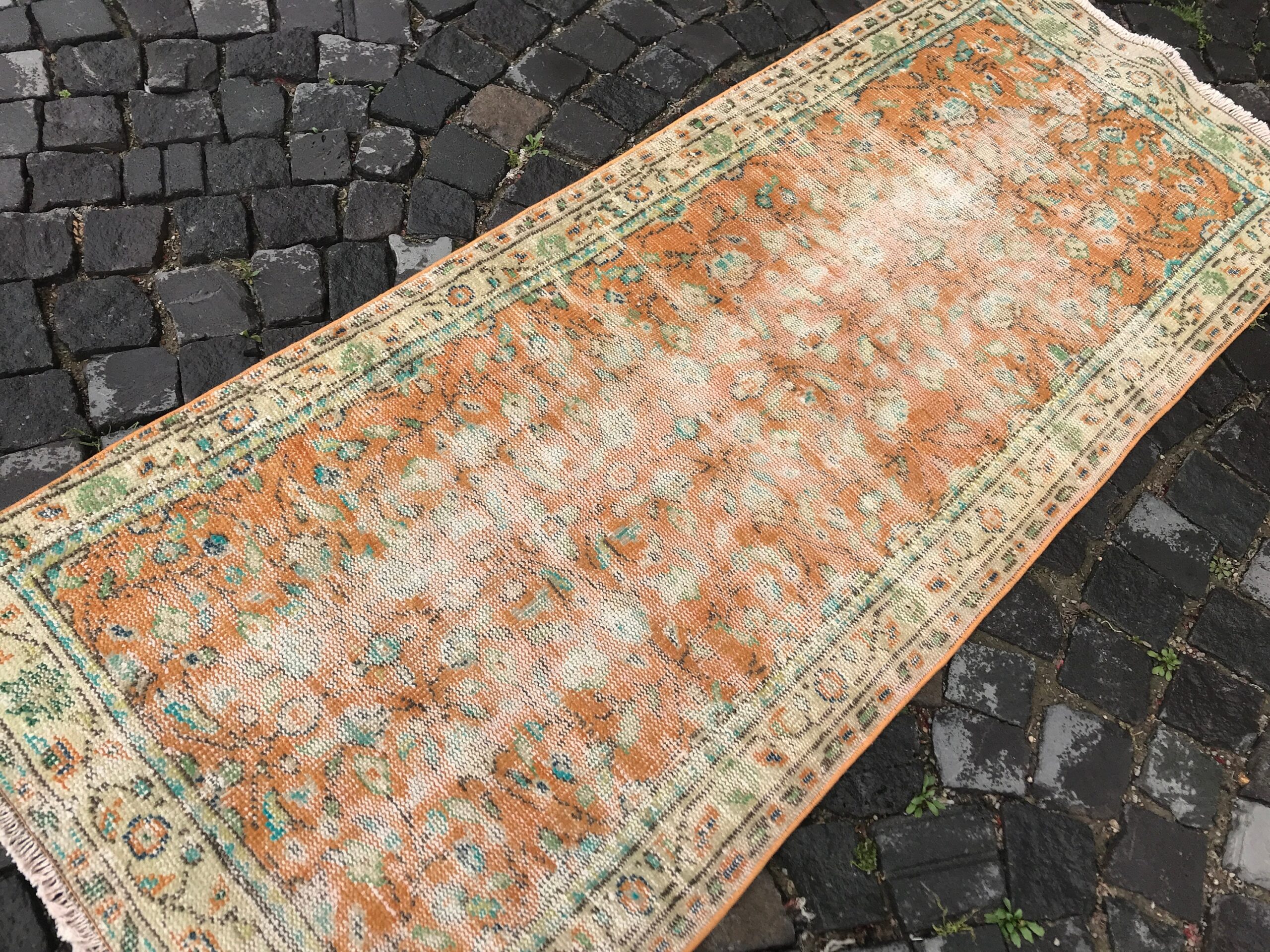 Lovely and unique 2.7 ft. x 6.5 ft. (81 cm x 197 cm) vintage Turkish rug hand-knotted in Turkey from organic wool. This is an authentic vintage Turkish rug from the 1980s that has worn beautifully to perfection.