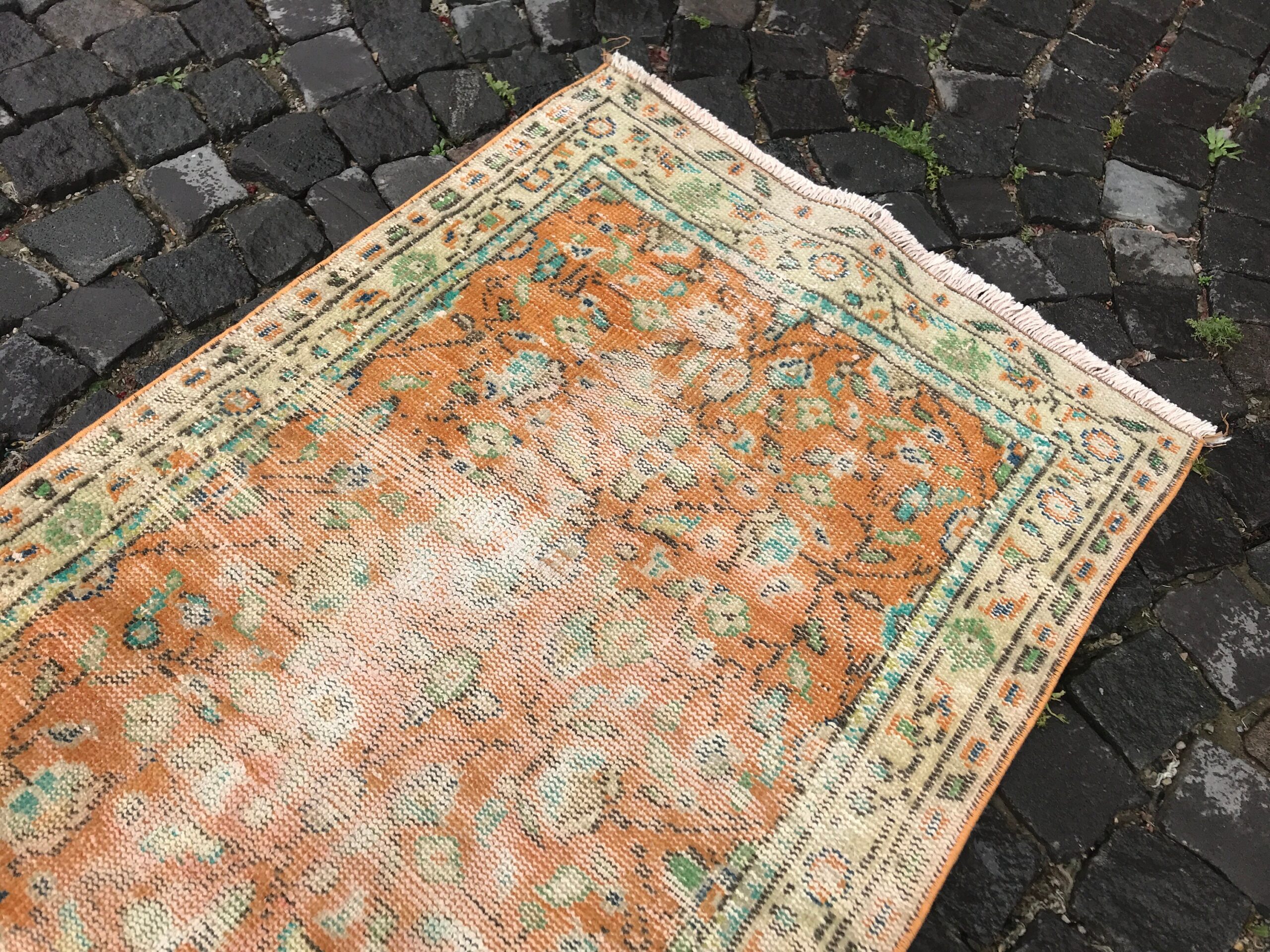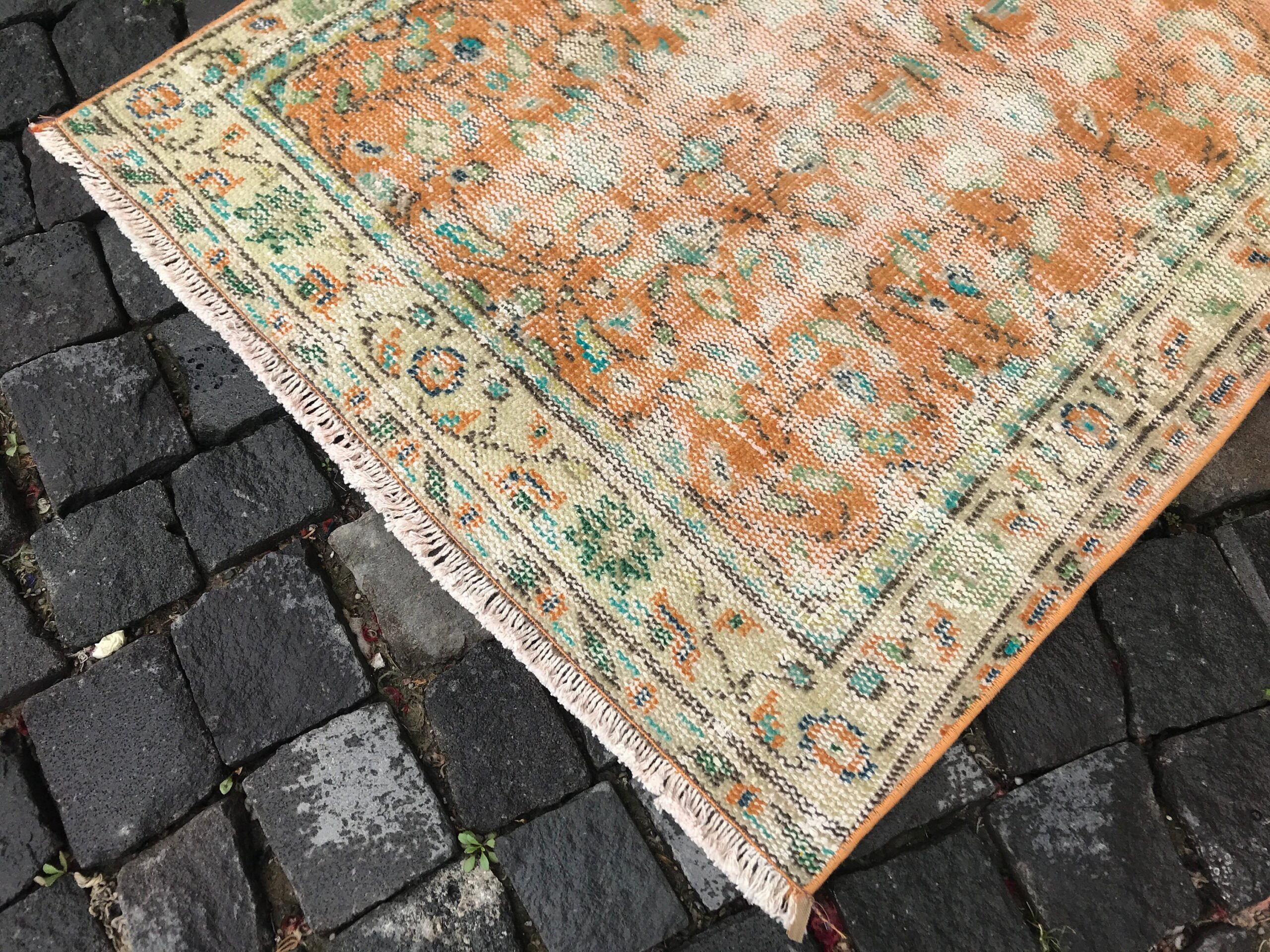 This is a vintage Turkish rug hand-knotted in a small village in Turkey by skilled Anatolian women during around the 1980s. It is made from natural wool (sheep) and dyed using all-natural (vegetable) dyes. Natural materials are more durable than synthetic materials guaranteeing a rug that can last for years while natural dyes provide colors that gets more beautiful as years pass by especially when in direct sunlight.