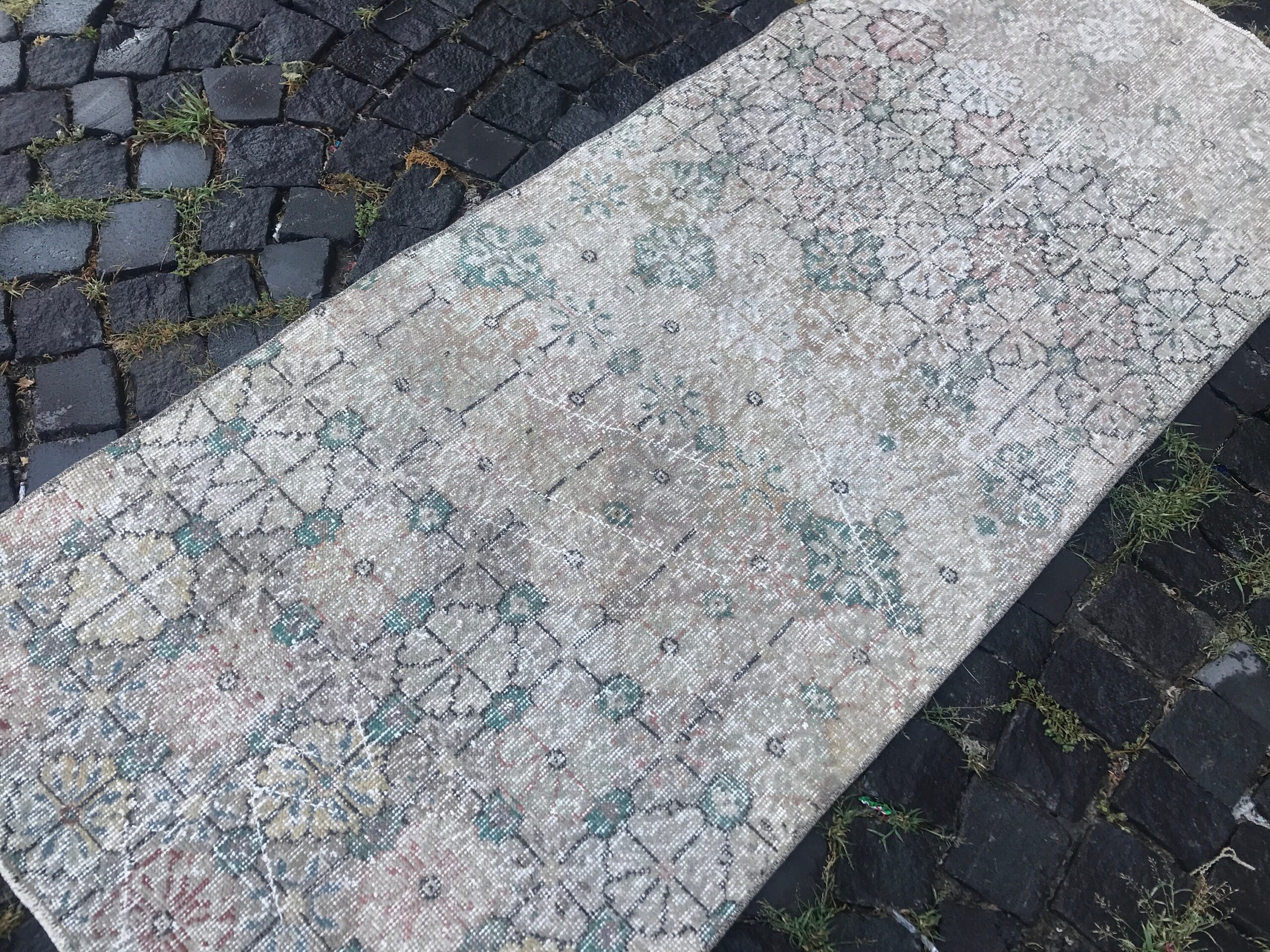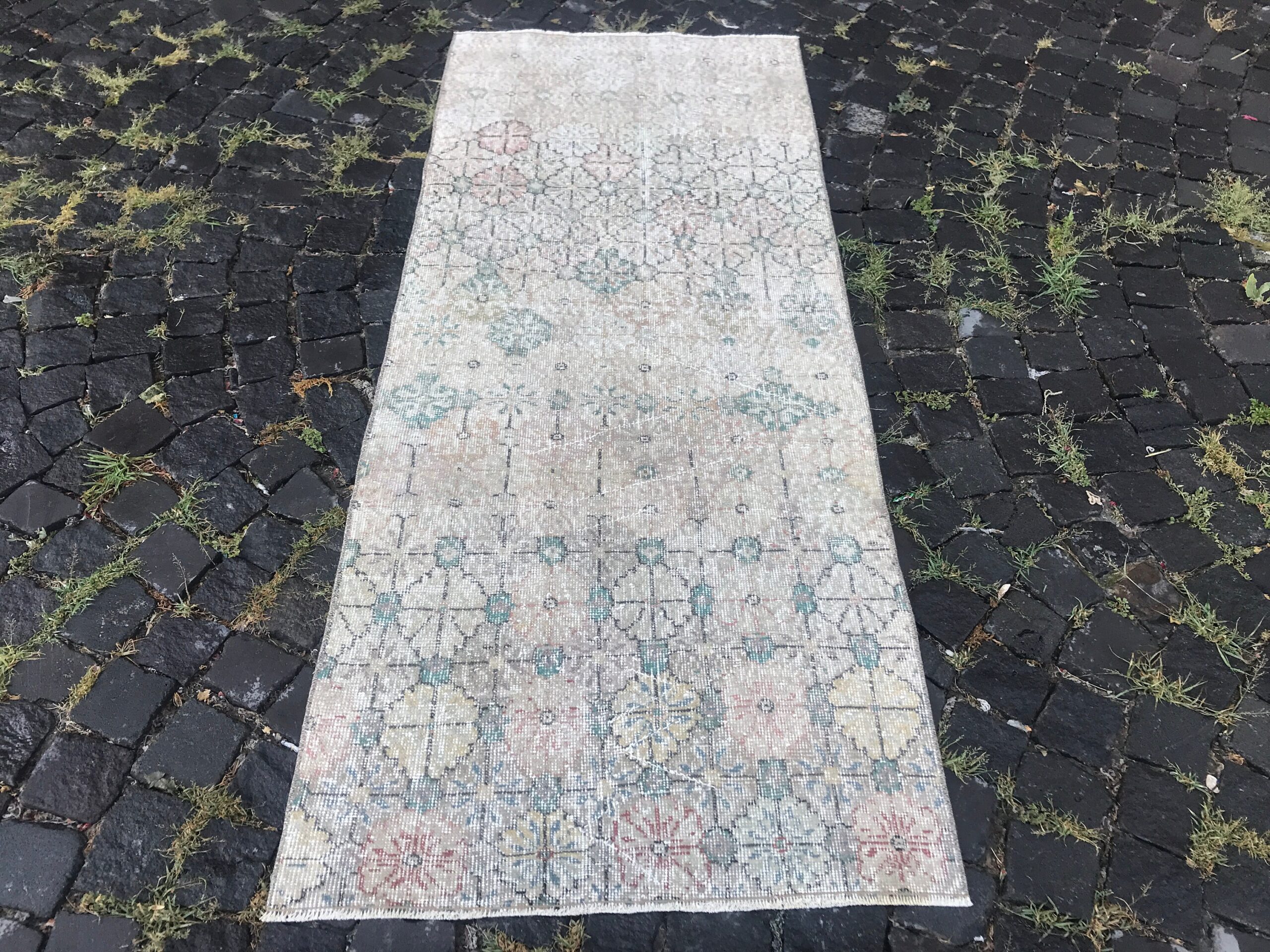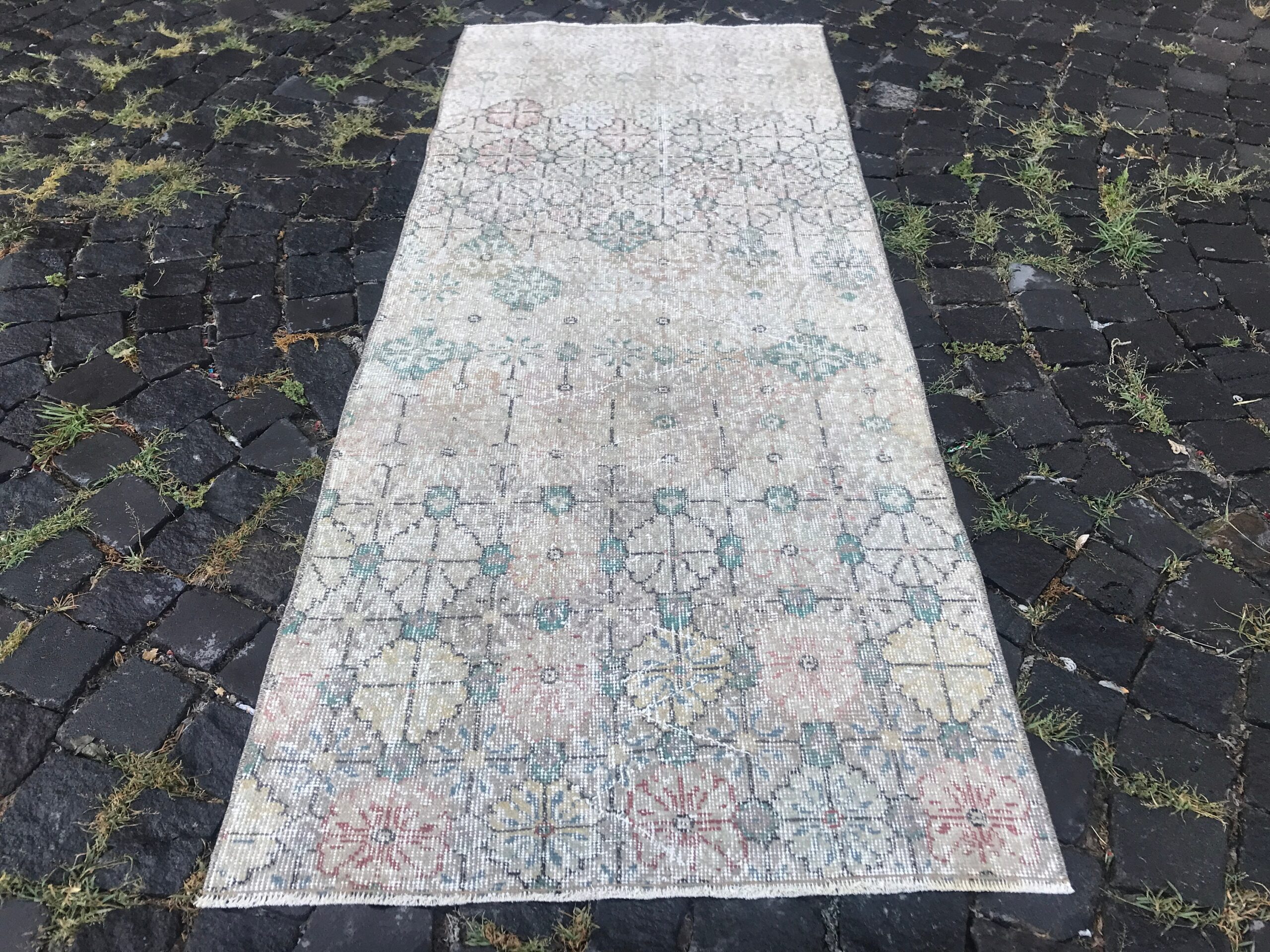 Lovely and unique 2.7 ft. x 6.7 ft. (83 cm x 203 cm) vintage Turkish rug hand-knotted in Turkey from organic wool. This is an authentic vintage Turkish rug from the 1970s that has worn beautifully to perfection.