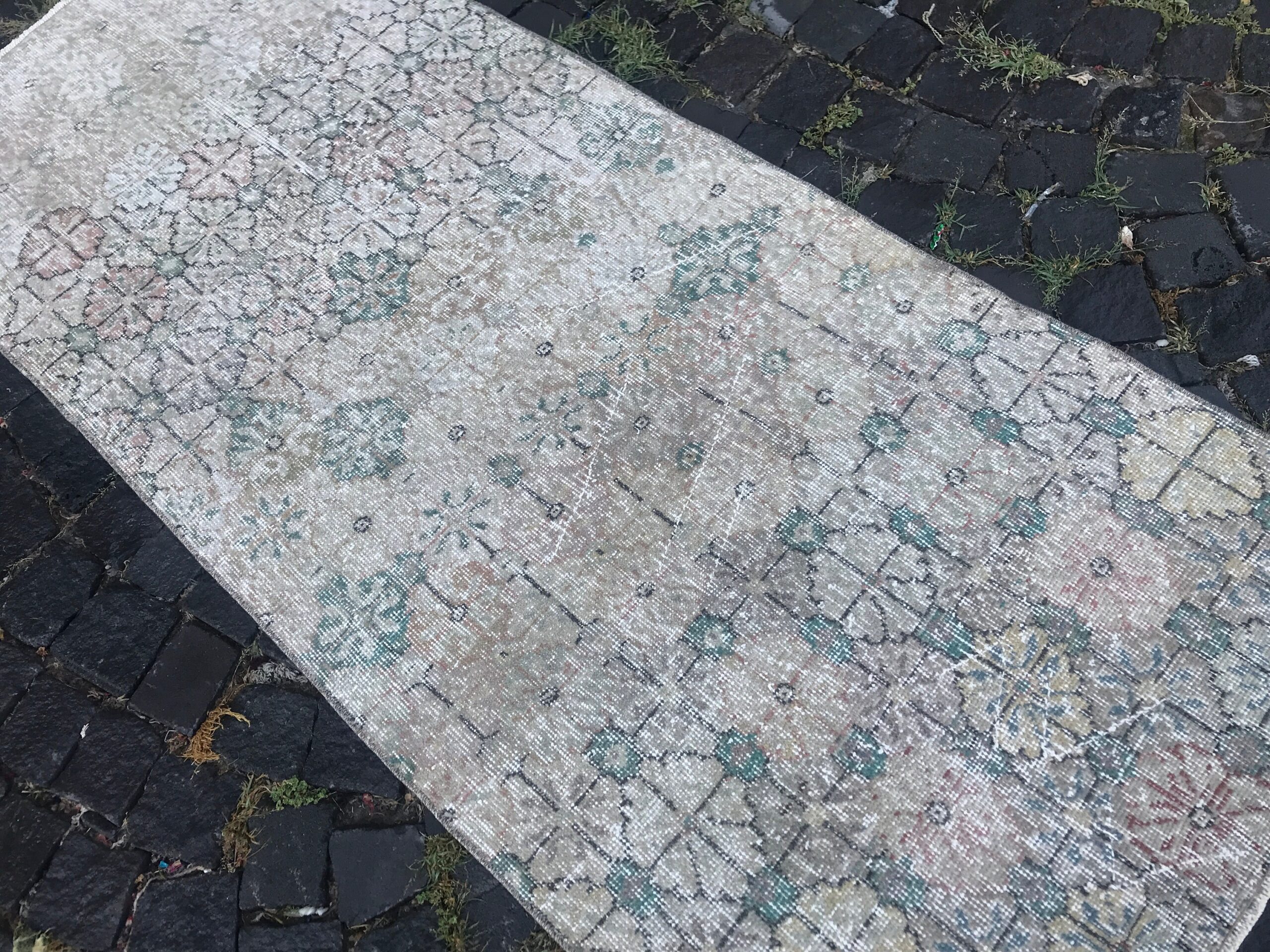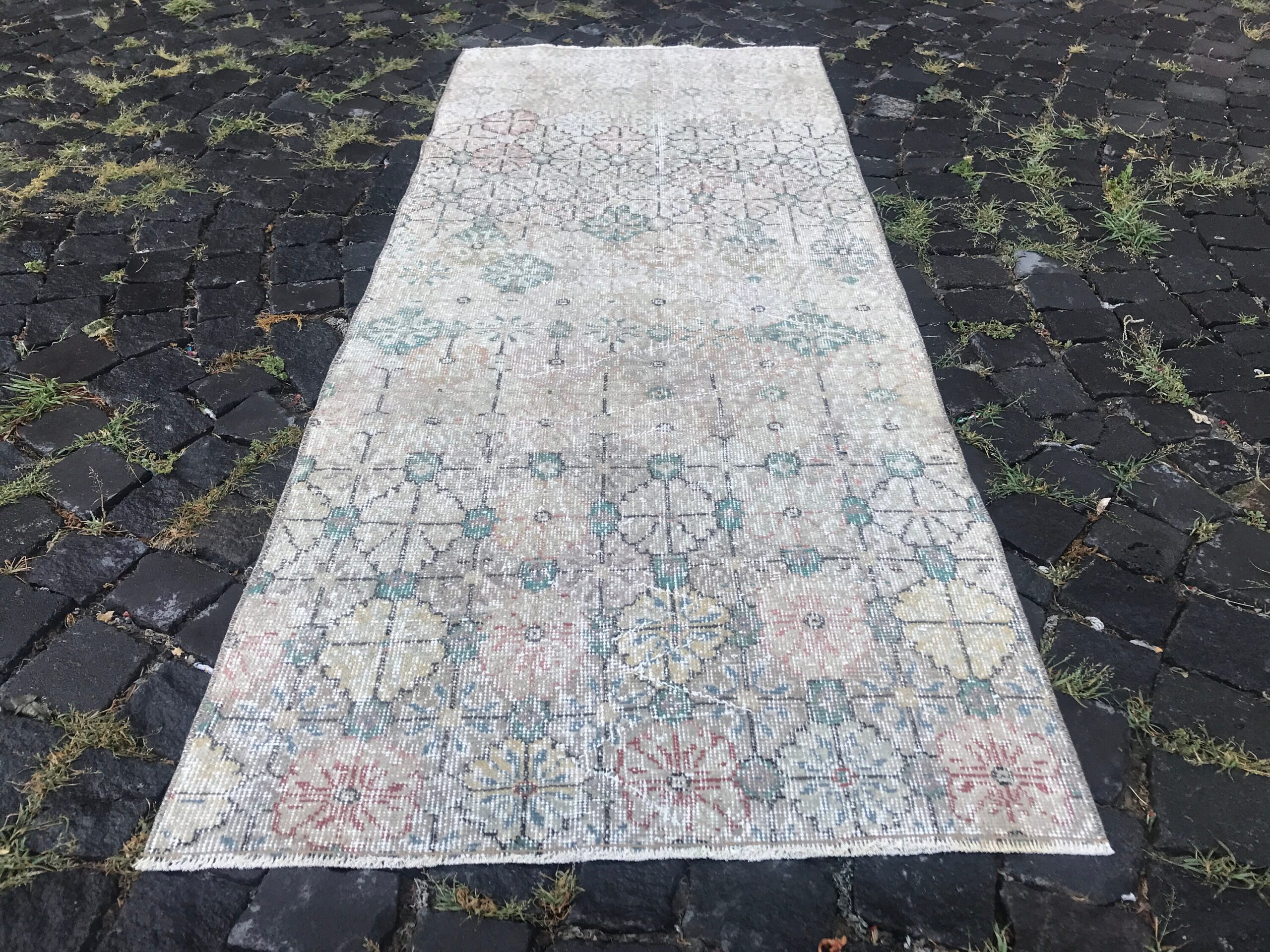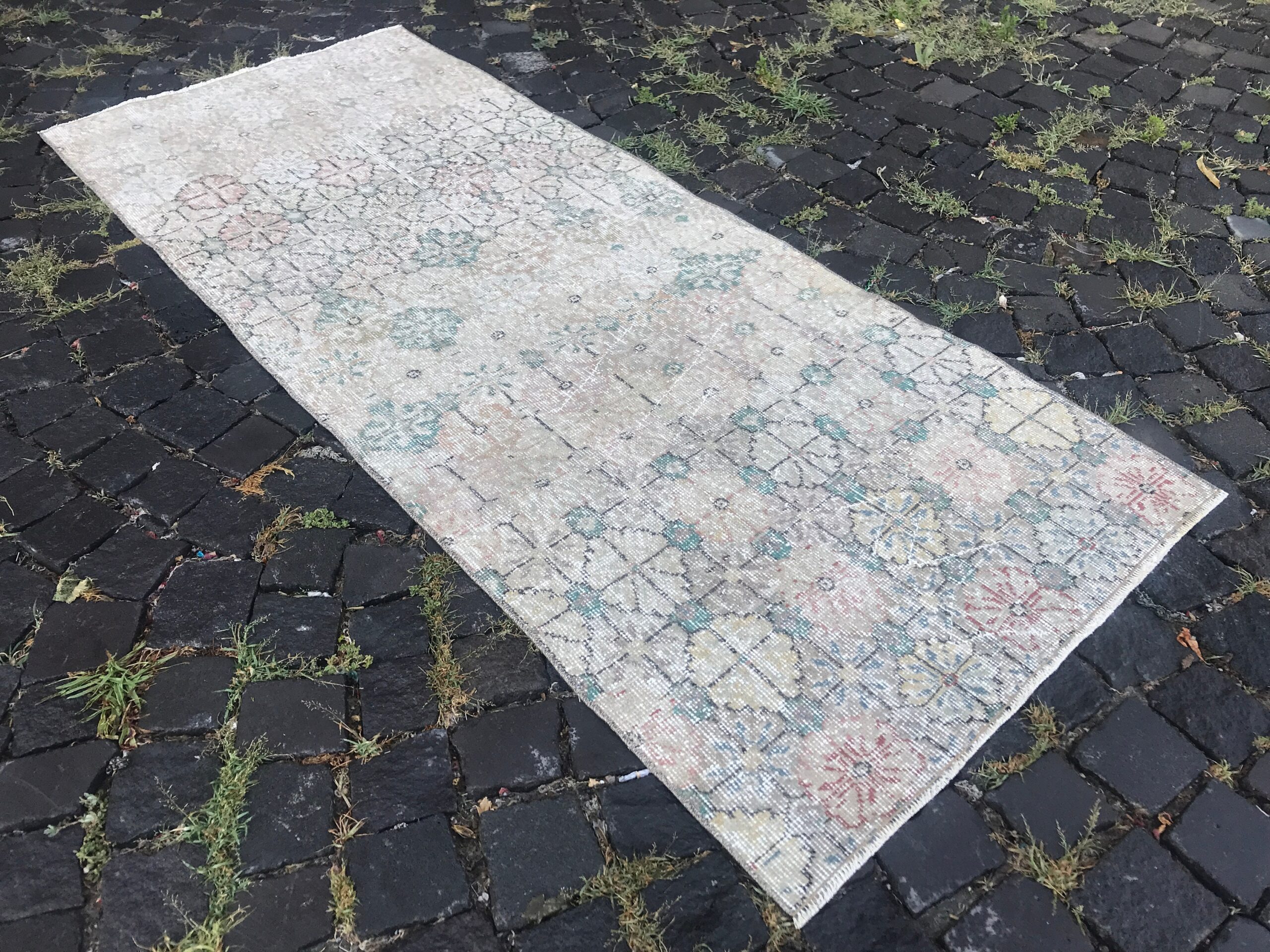 Lovely and unique 2.7 ft. x 6.7 ft. (83 cm x 203 cm) vintage Turkish rug hand-knotted in Turkey from organic wool. This is an authentic vintage Turkish rug from the 1970s that has worn beautifully to perfection.