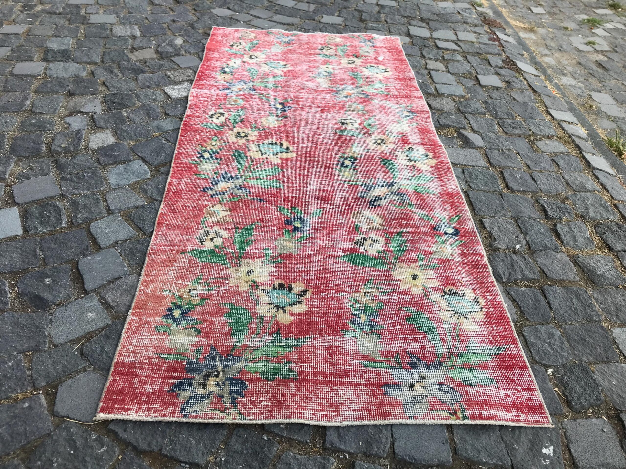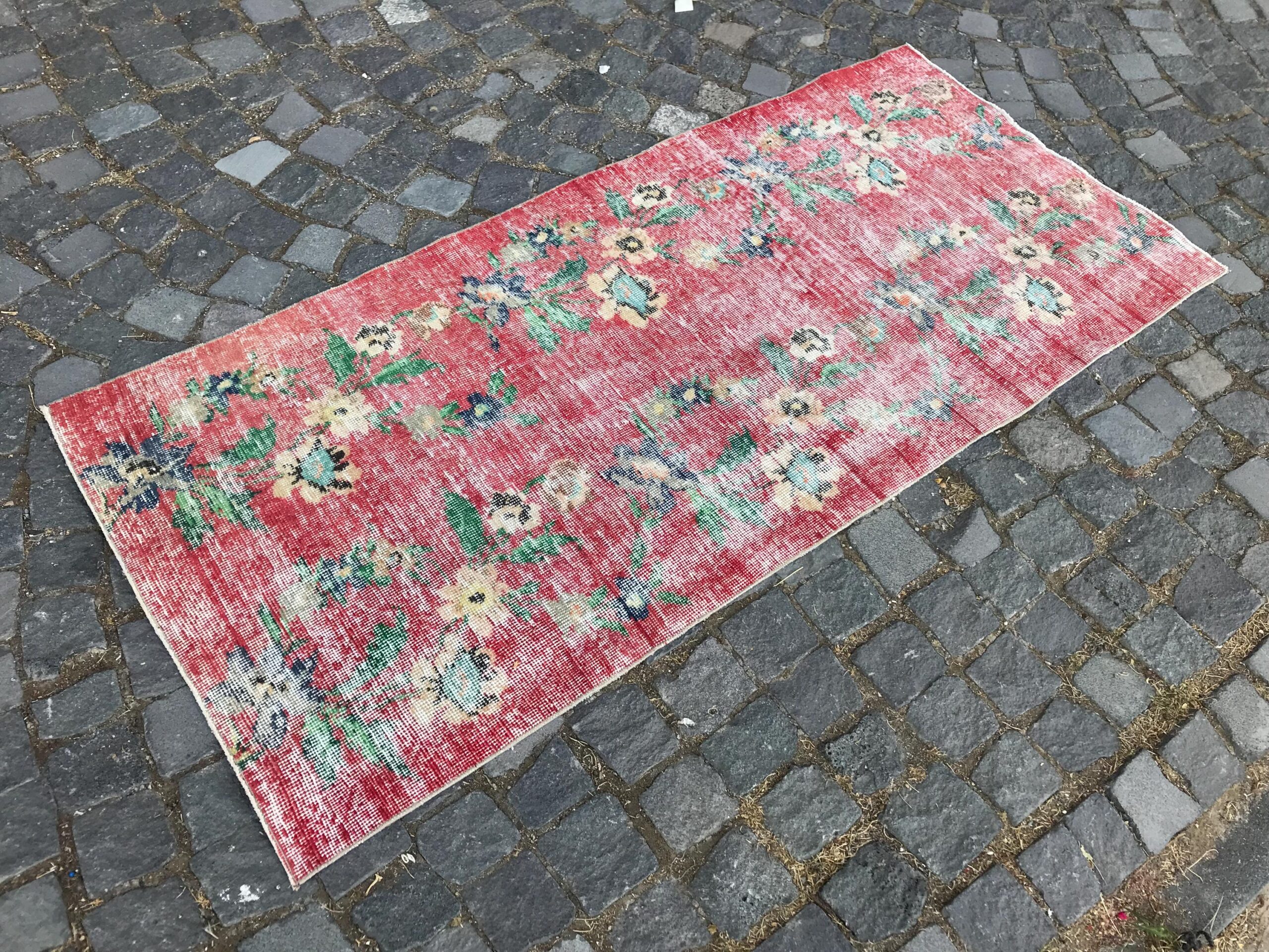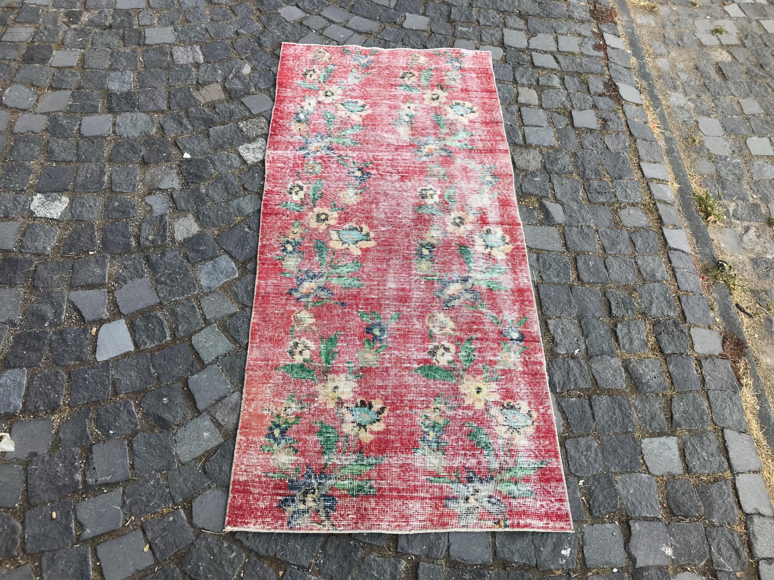 Lovely and unique 2.7 ft. x 6 ft. (83 cm x 184 cm) vintage Turkish rug hand-knotted in Turkey from organic wool. This is an authentic vintage Turkish rug from the 1990s that has worn beautifully to perfection.