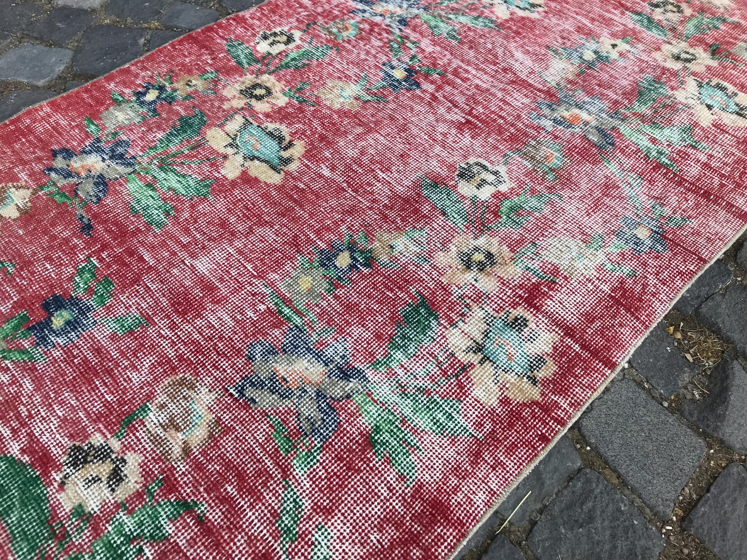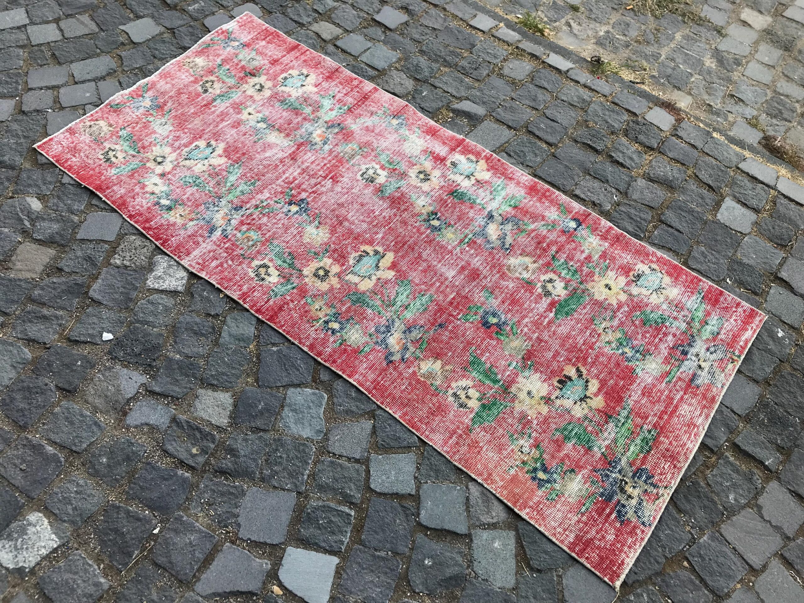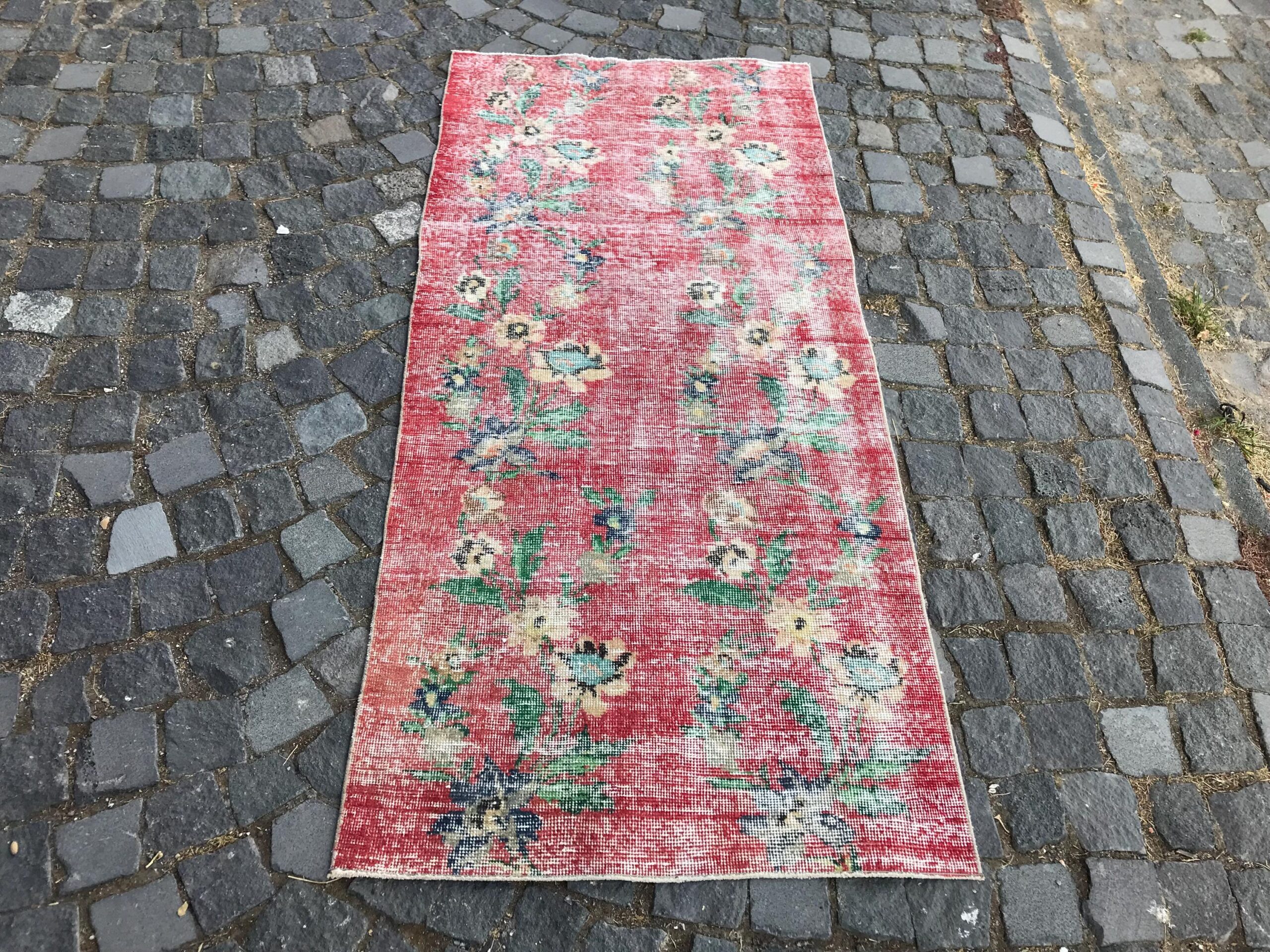 Lovely and unique 2.7 ft. x 6 ft. (83 cm x 184 cm) vintage Turkish rug hand-knotted in Turkey from organic wool. This is an authentic vintage Turkish rug from the 1990s that has worn beautifully to perfection.