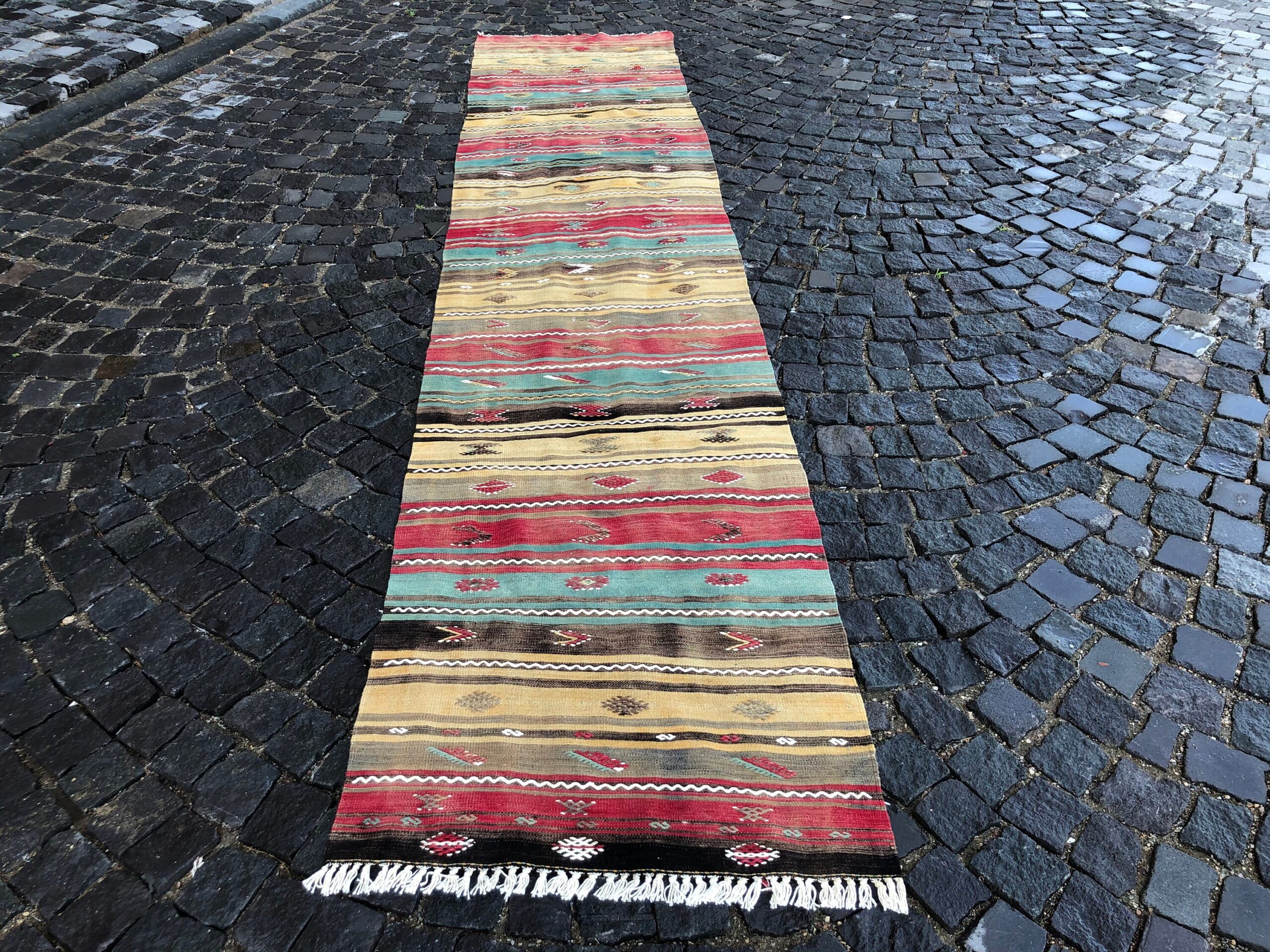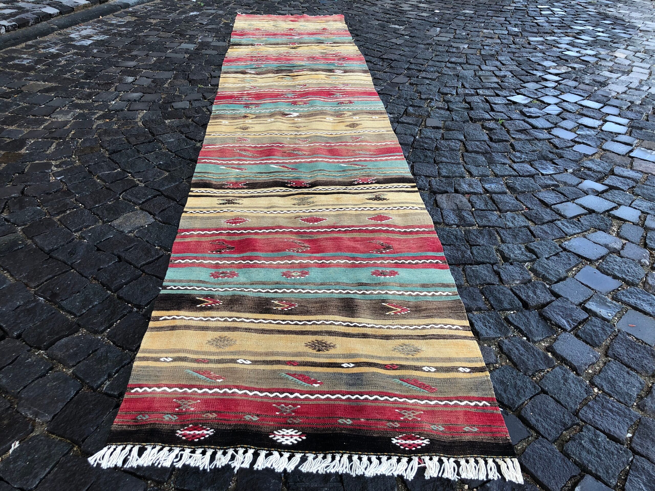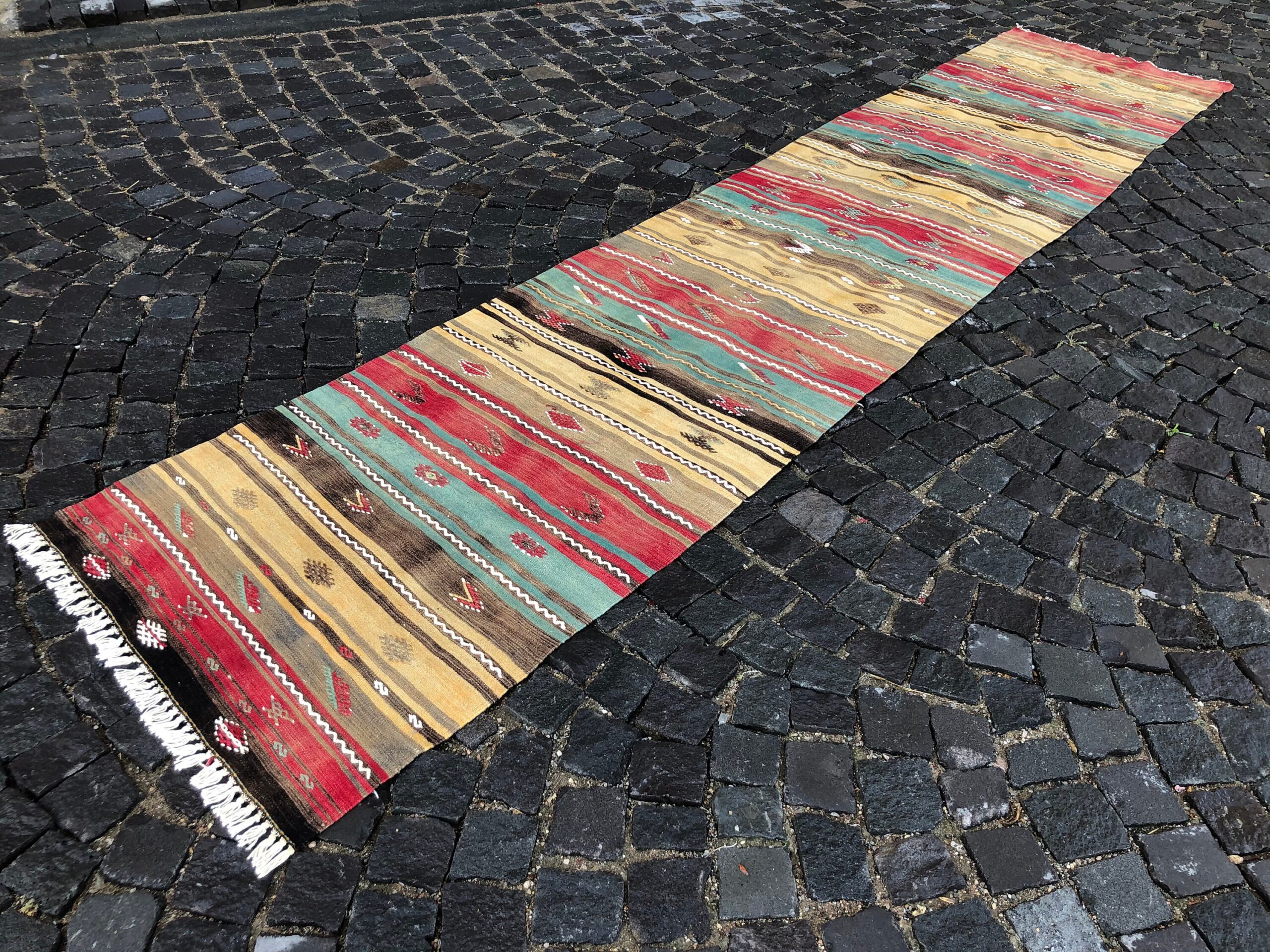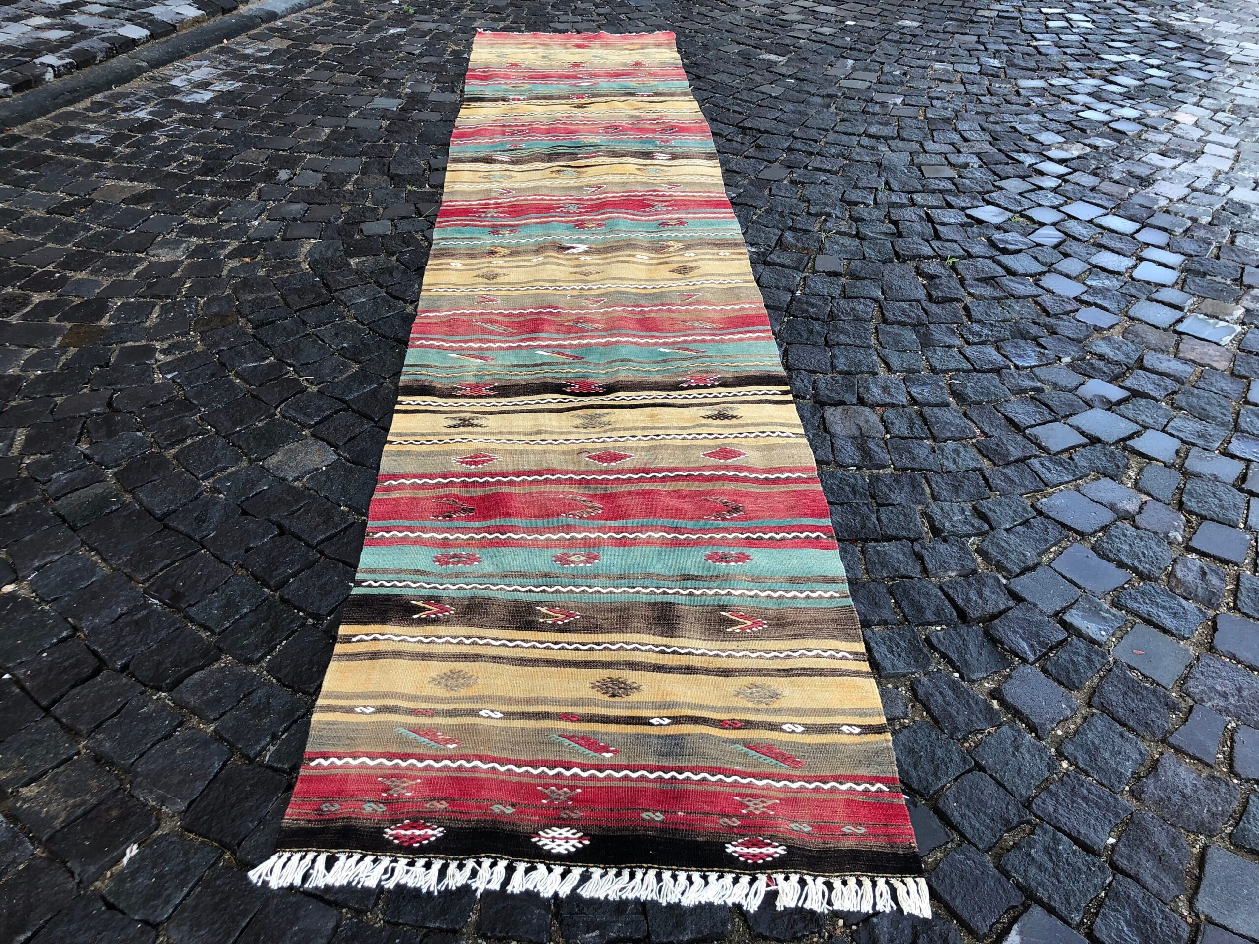 Lovely and unique 2.8 ft. x 13.1 ft. (85 cm x 398 cm) vintage kilim rug hand-woven in Turkey from organic wool. This is an authentic vintage kilim rug from the 1980s that has worn beautifully to perfection.