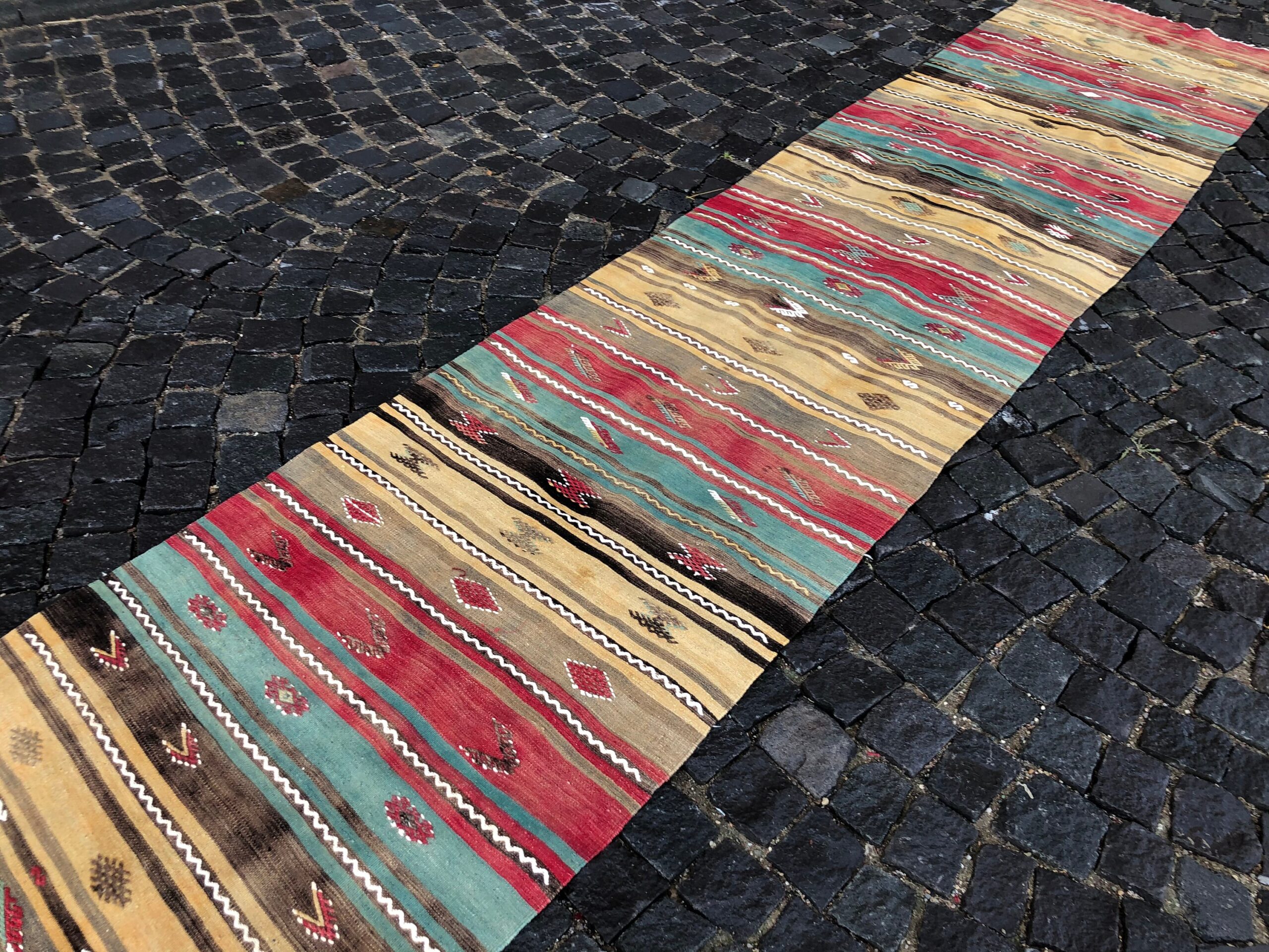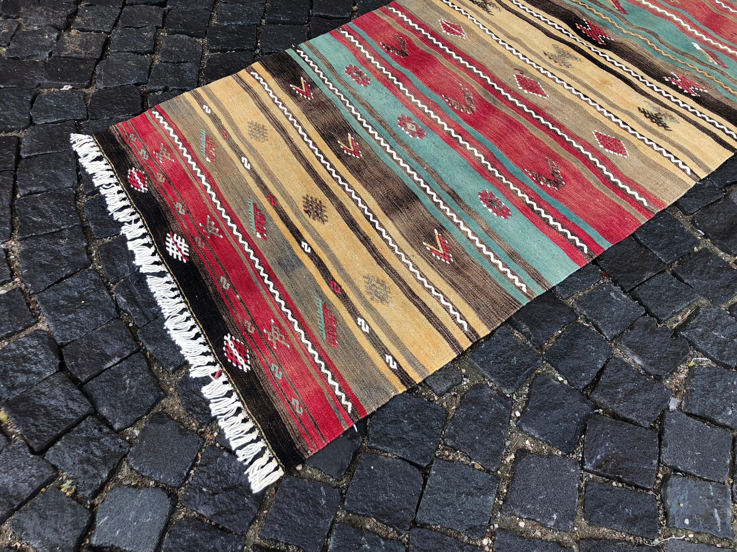 This is a vintage kilim rug hand-woven in a small village in Turkey by skilled Anatolian women during around the 1980s. It is made from natural wool (sheep) and dyed using all-natural (vegetable) dyes. Natural materials are more durable than synthetic materials guaranteeing a rug that can last for years while natural dyes provide colors that gets more beautiful as years pass by especially when in direct sunlight.