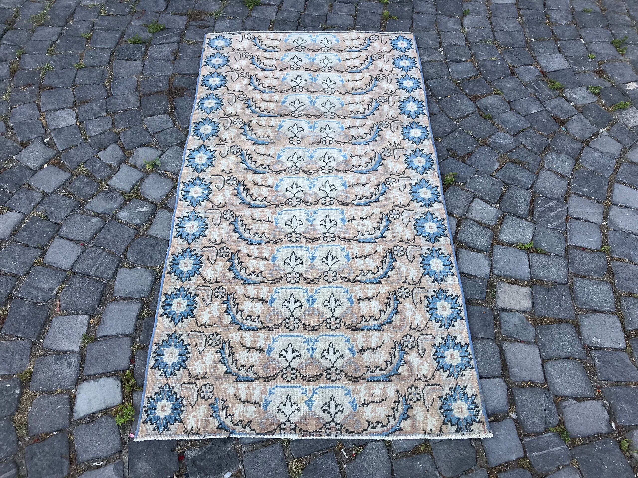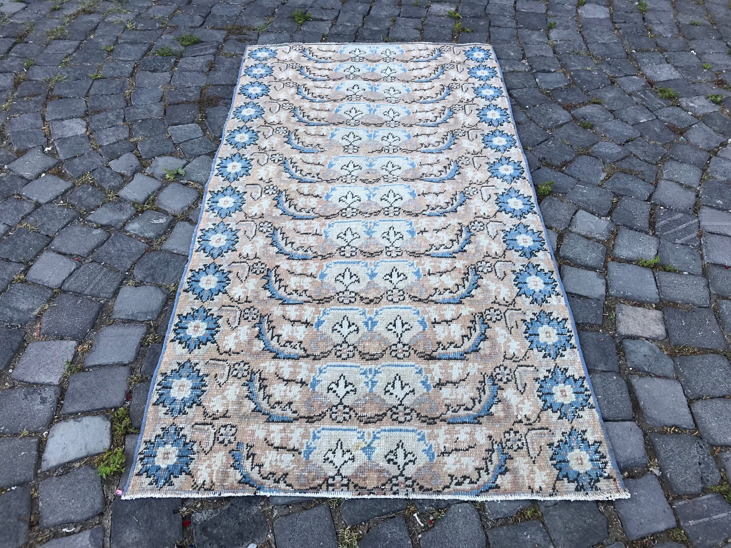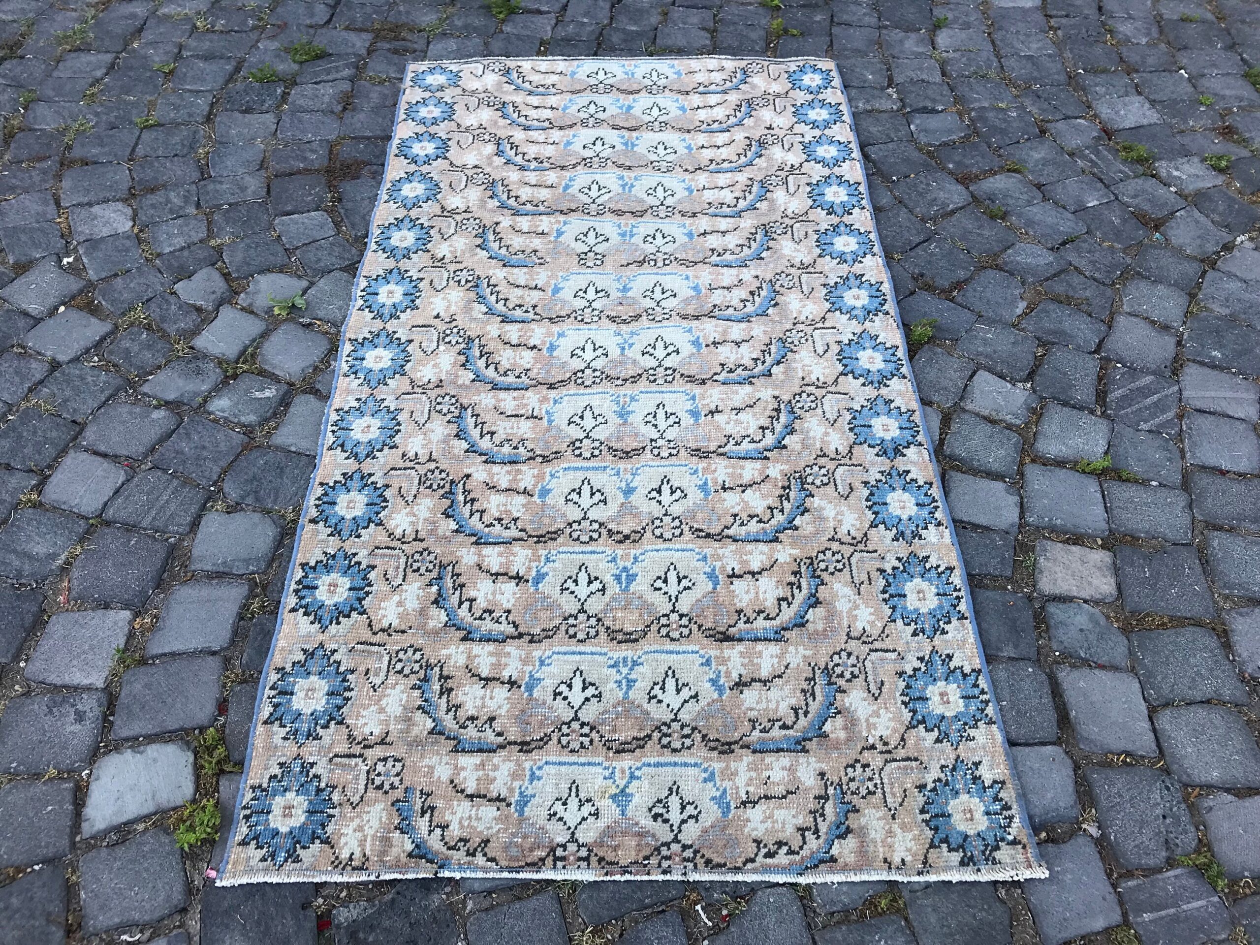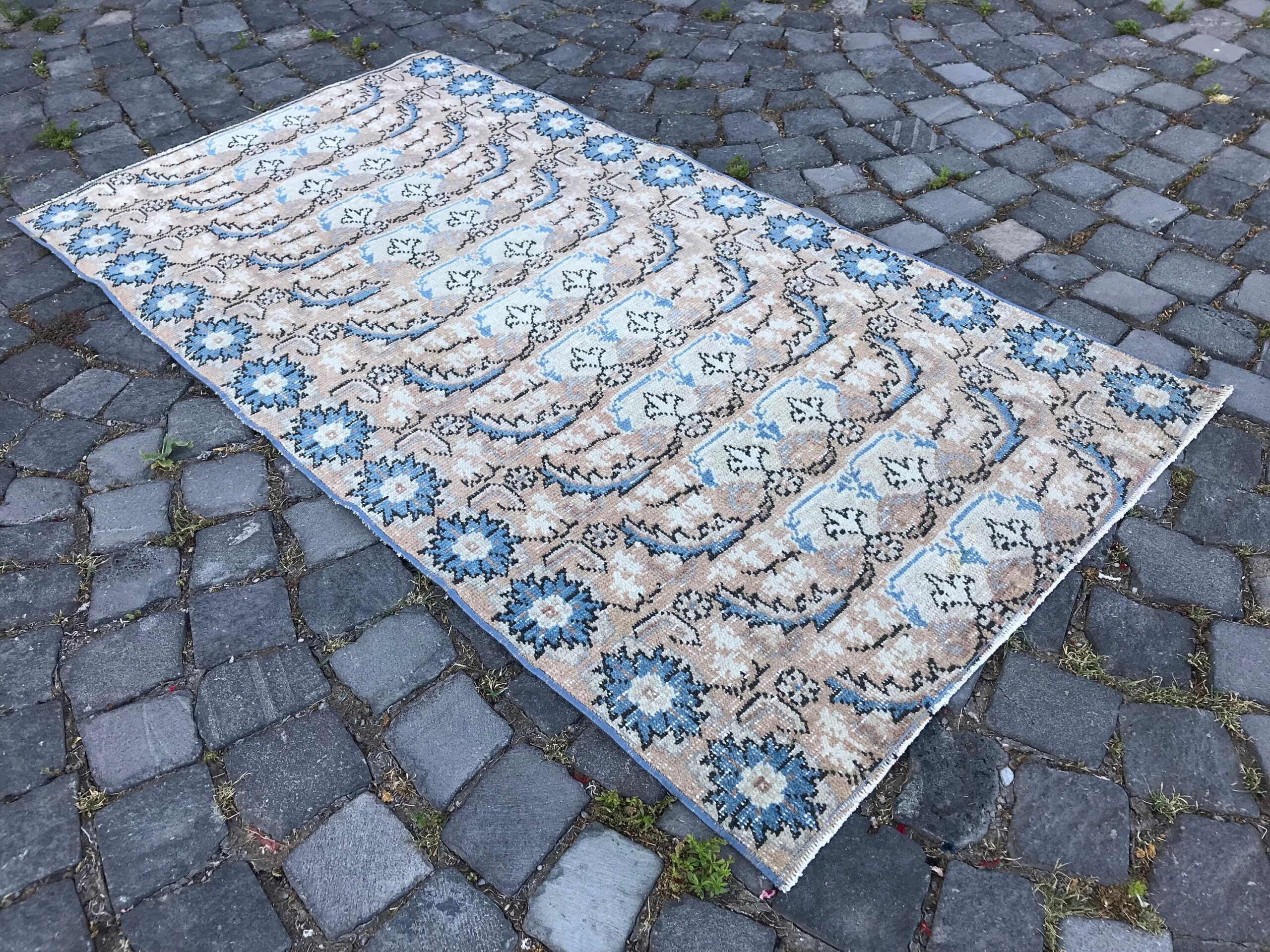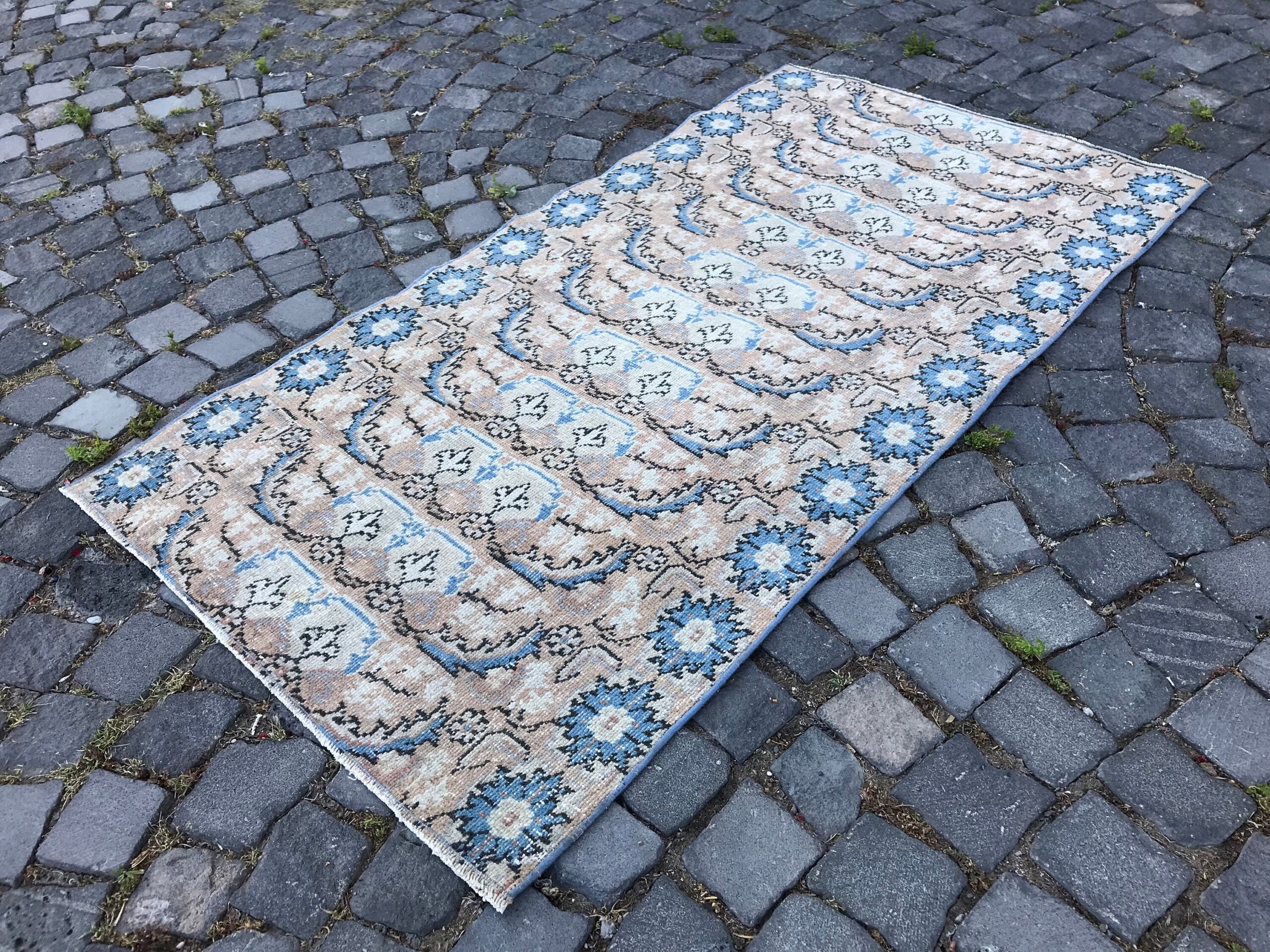 Beautiful and one-of-a-kind 2.8 ft. x 5.3 ft. (86 cm x 161 cm) vintage Turkish rug hand-knotted in Turkey from organic wool. This is an authentic vintage Turkish rug from the 1980s that has worn admirably to perfection.