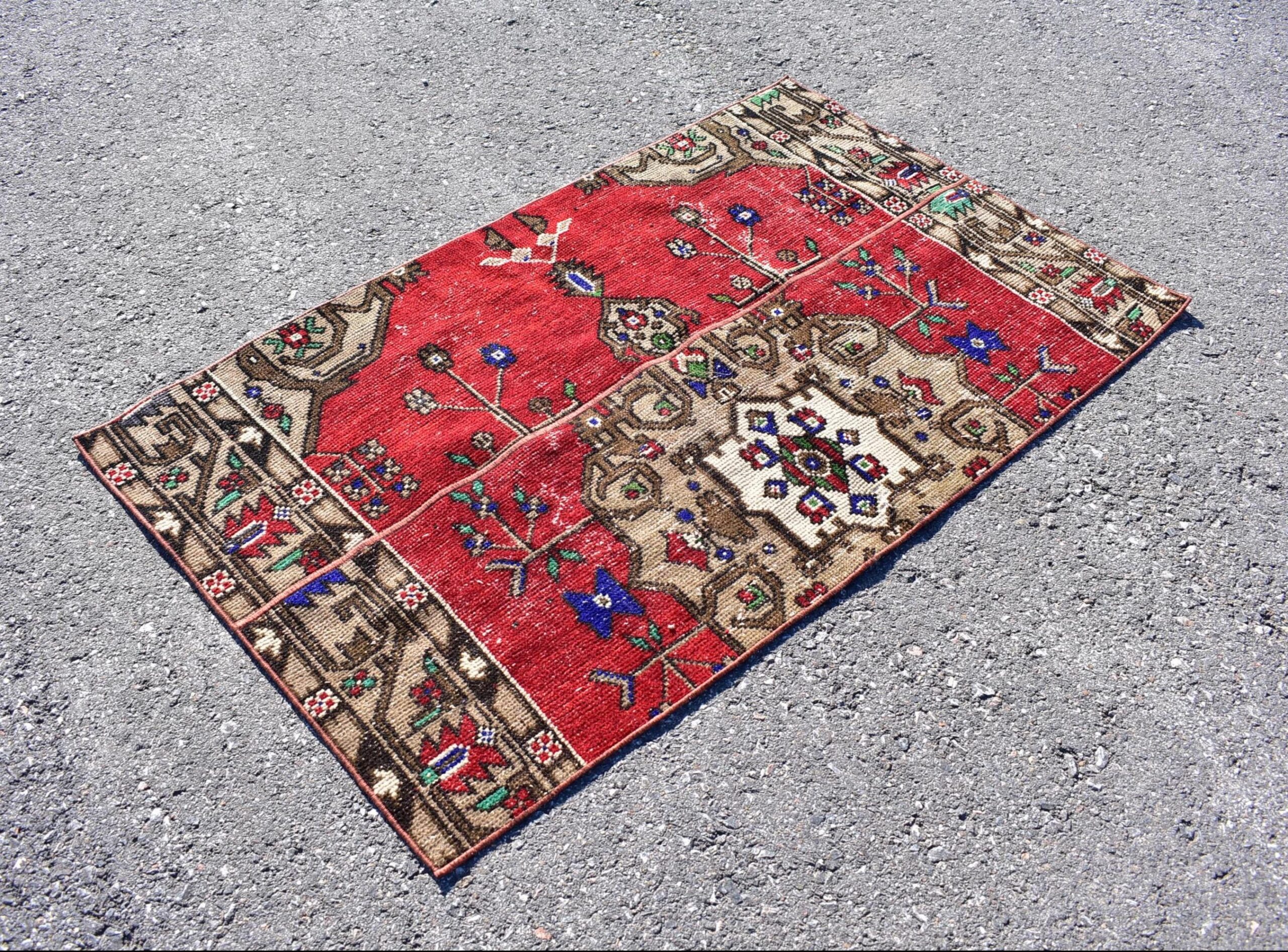 This is a vintage Turkish rug hand-knotted in a small village in Turkey by skilled Anatolian women during around the 1980s. It is made from natural wool (sheep) and dyed using all-natural (vegetable) dyes. Natural materials are more durable than synthetic materials guaranteeing a rug that can last for years while natural dyes provide colors that gets more beautiful as years pass by especially when in direct sunlight.