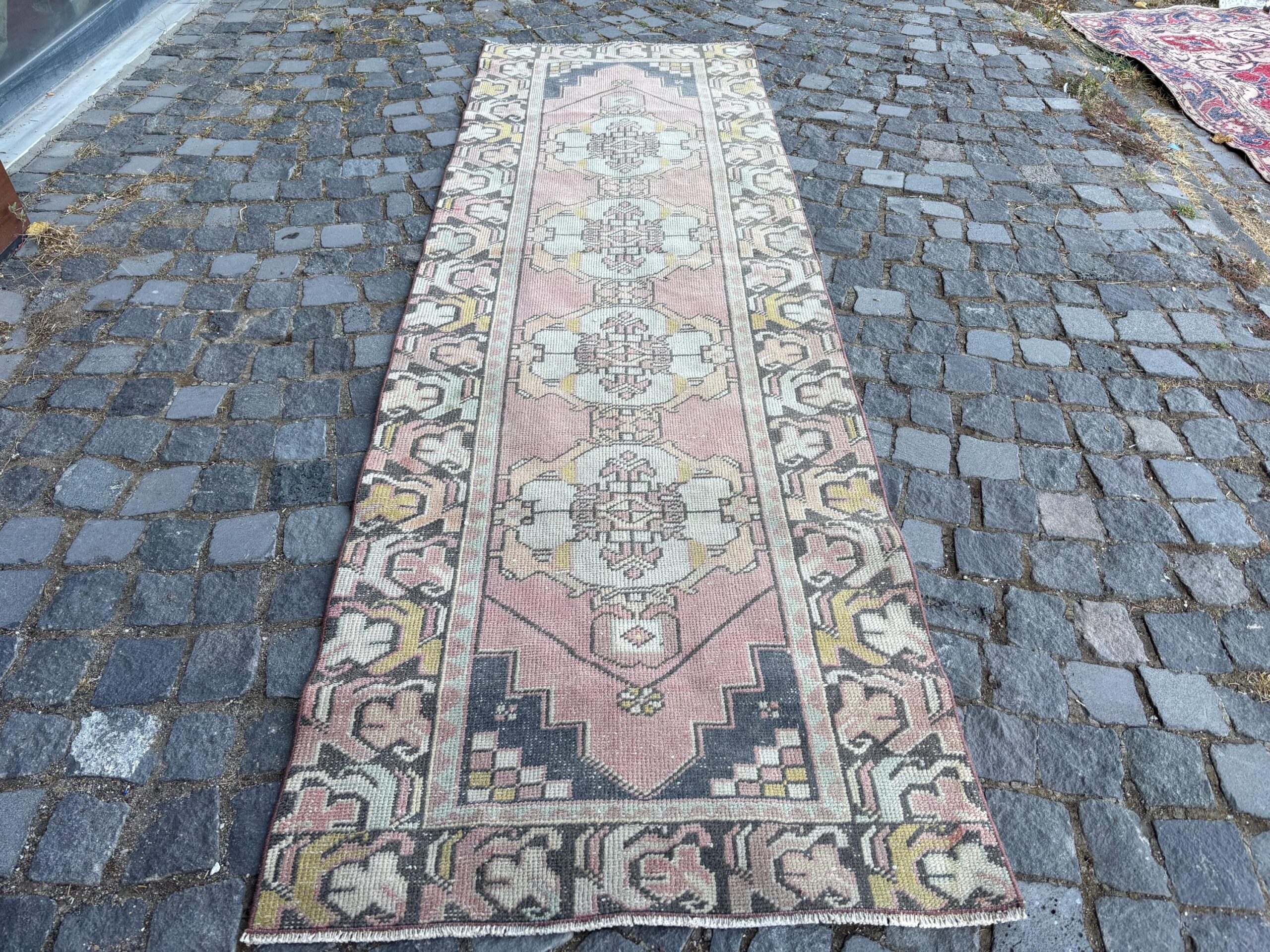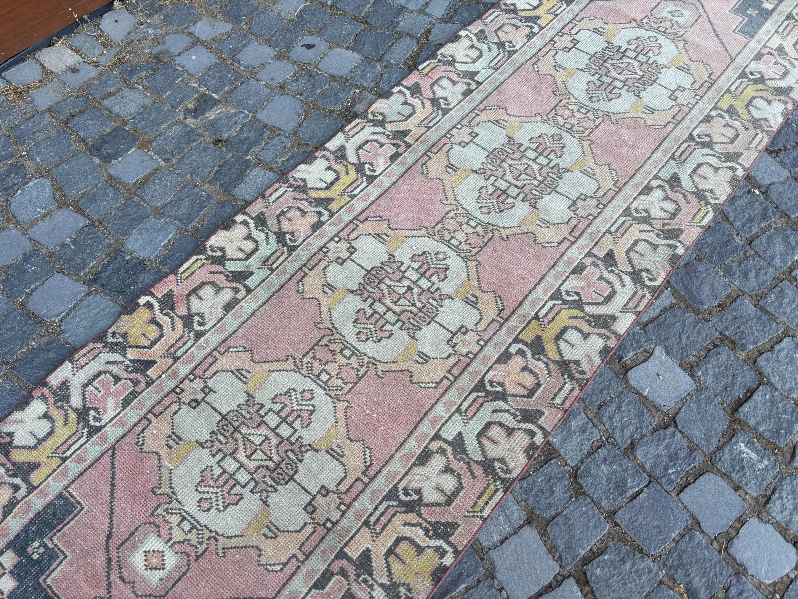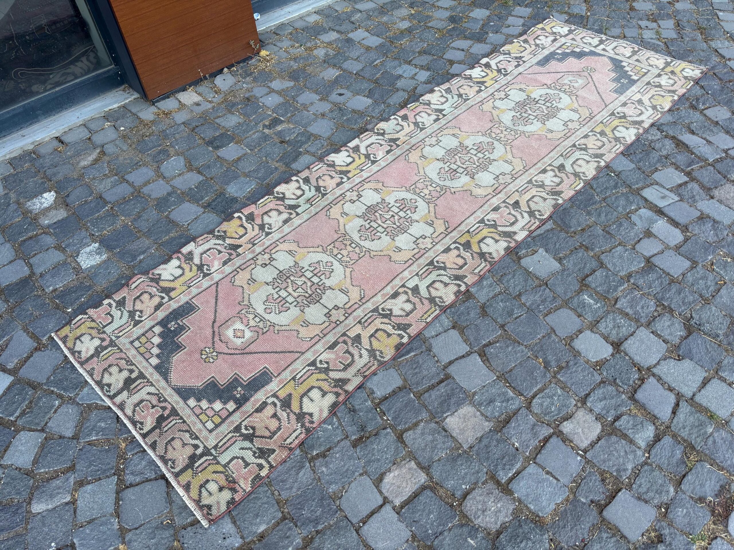 Pretty and one-of-a-kind 2.9 ft. x 9.3 ft. (87 cm x 282 cm) vintage Turkish rug hand-knotted in Turkey from organic wool. This is an authentic vintage Turkish rug from the 1970s that has worn splendidly to perfection.