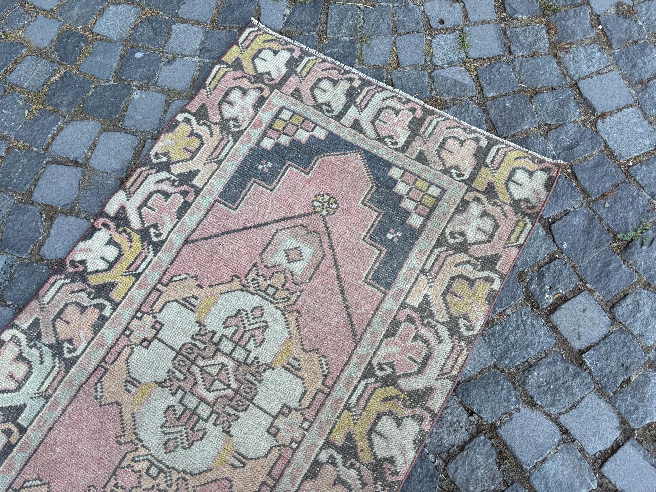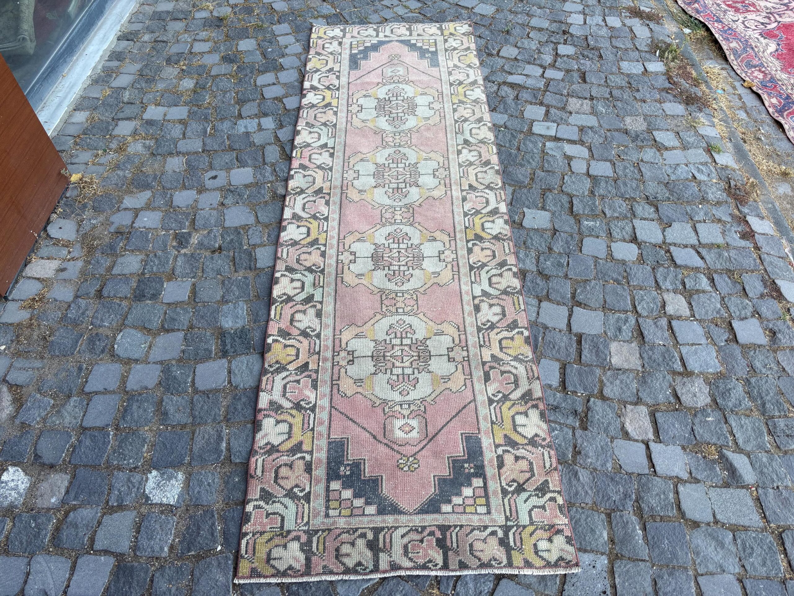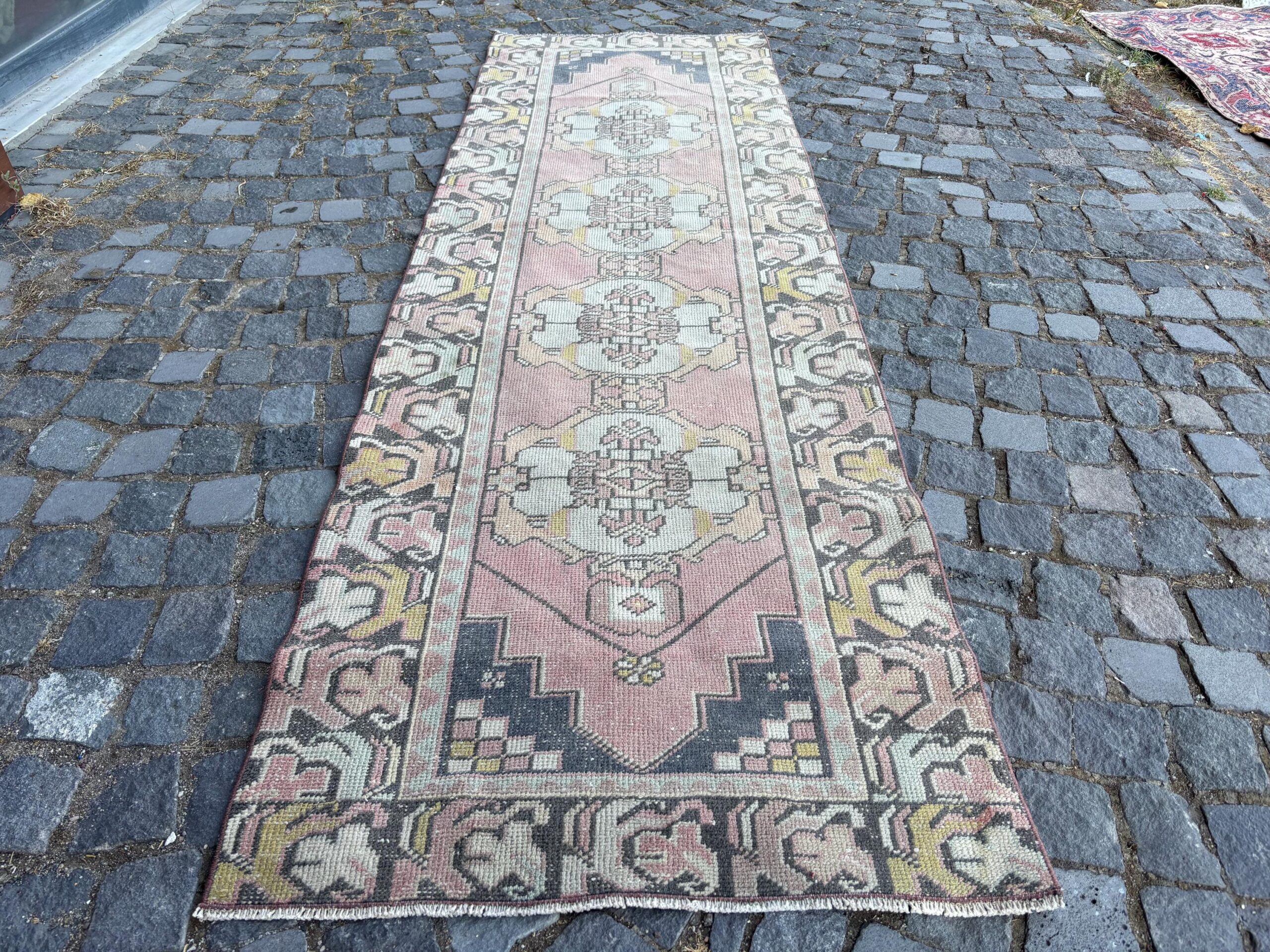 Pretty and one-of-a-kind 2.9 ft. x 9.3 ft. (87 cm x 282 cm) vintage Turkish rug hand-knotted in Turkey from organic wool. This is an authentic vintage Turkish rug from the 1970s that has worn splendidly to perfection.