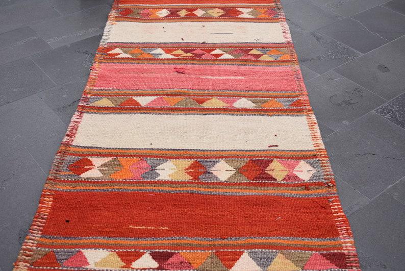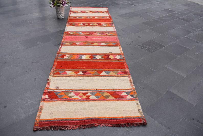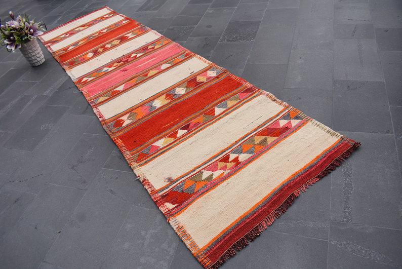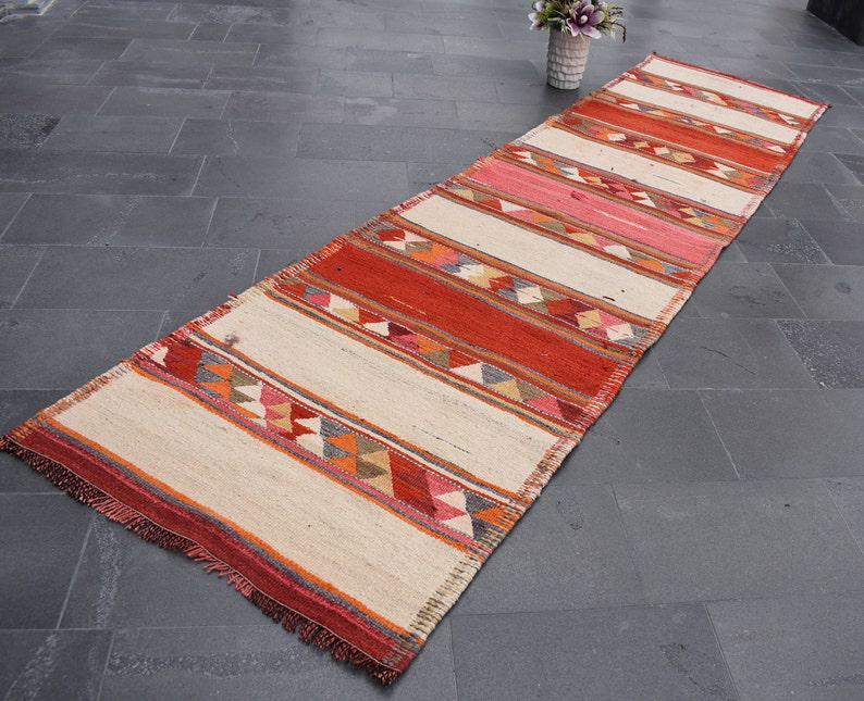 Lovely and unique 3.1 ft. x 11.7 ft. (94 cm x 356 cm) vintage kilim rug hand-woven in Turkey from organic wool. This is an authentic vintage kilim rug from the 1970s that has worn beautifully to perfection.