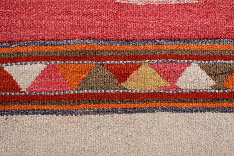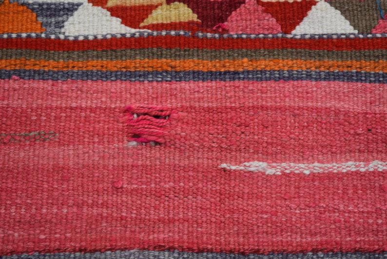 This is a vintage kilim rug hand-woven in a small village in Turkey by skilled Anatolian women during around the 1970s. It is made from natural wool (sheep) and dyed using all-natural (vegetable) dyes. Natural materials are more durable than synthetic materials guaranteeing a rug that can last for years while natural dyes provide colors that gets more beautiful as years pass by especially when in direct sunlight.