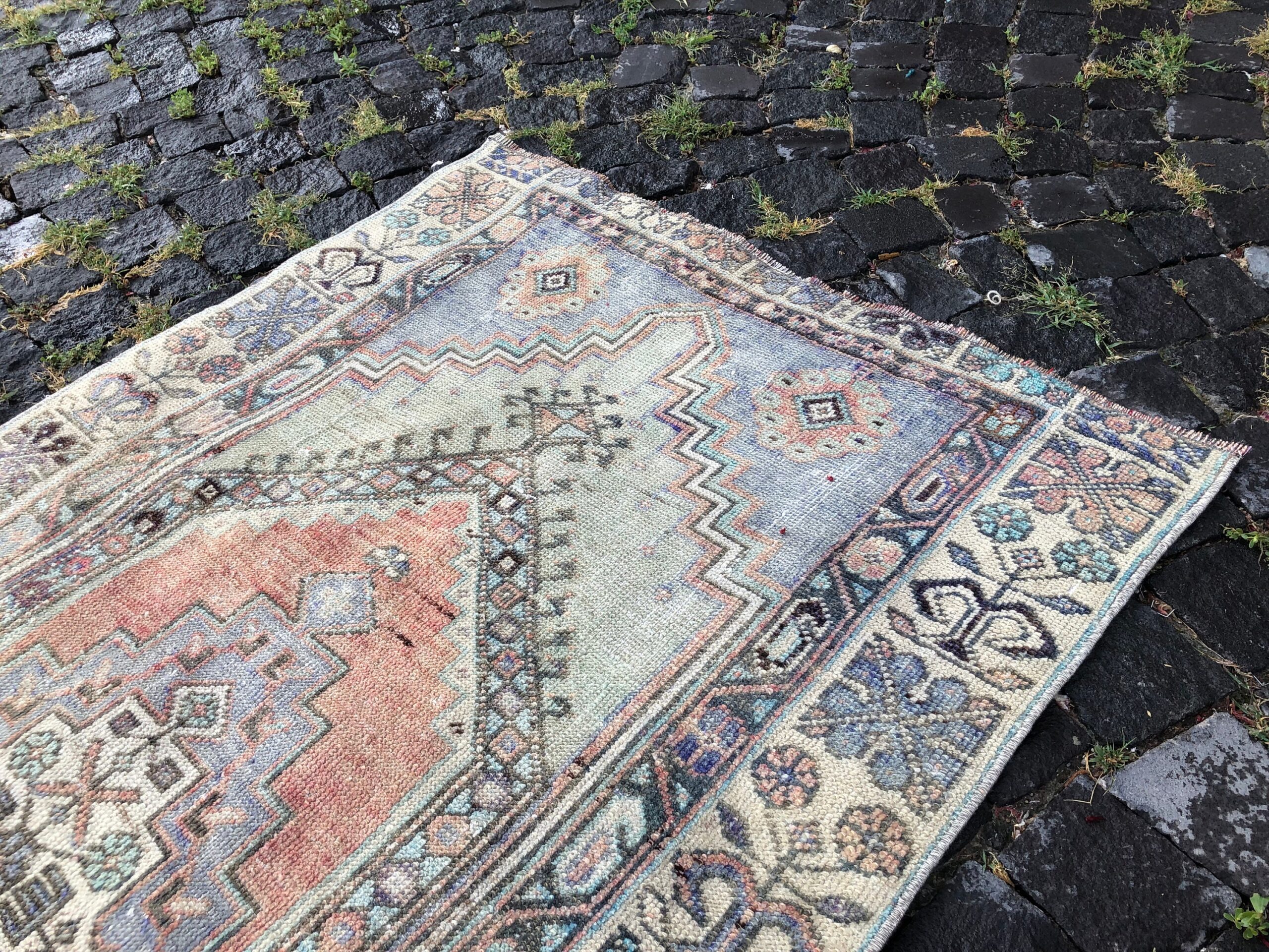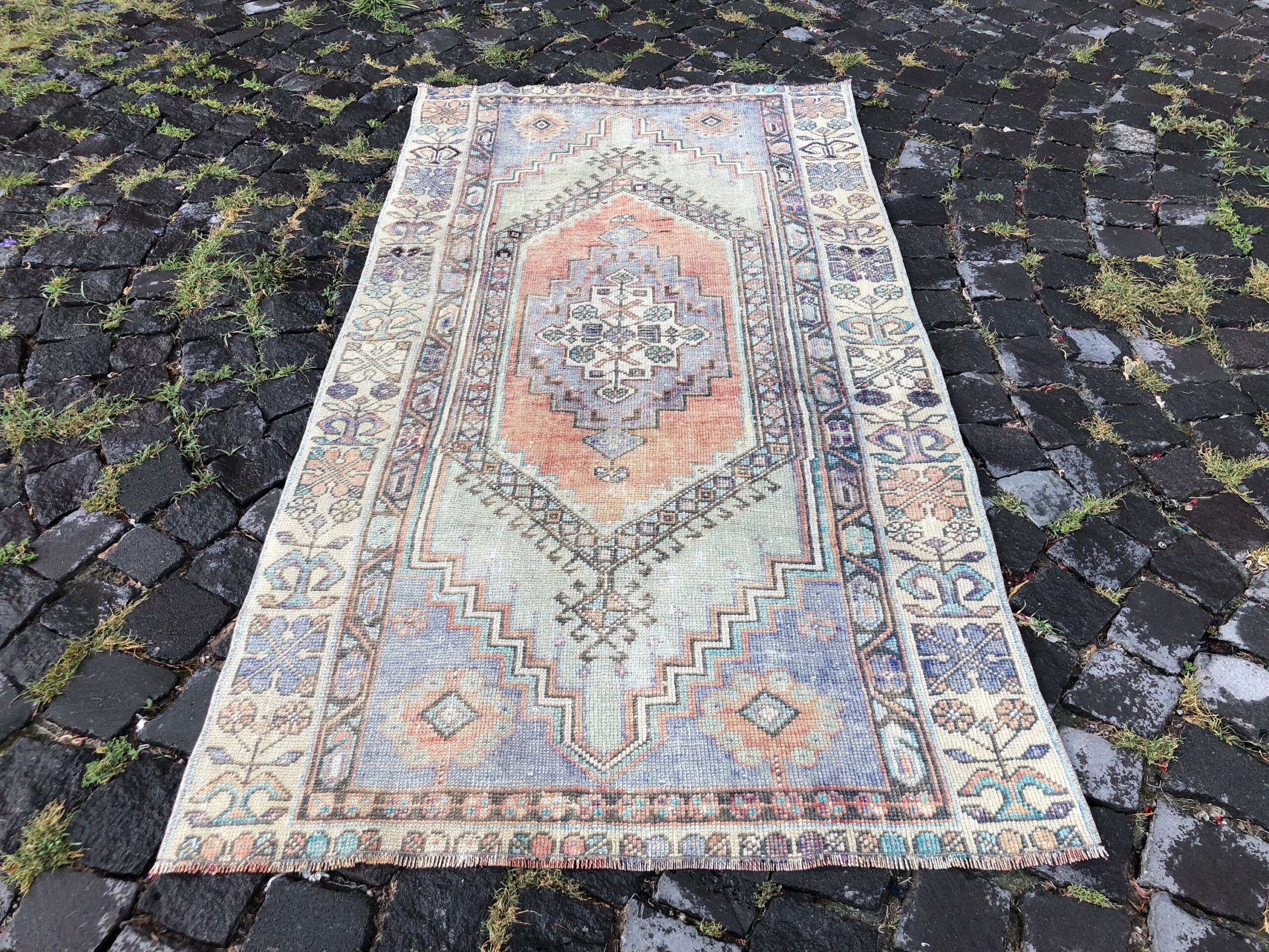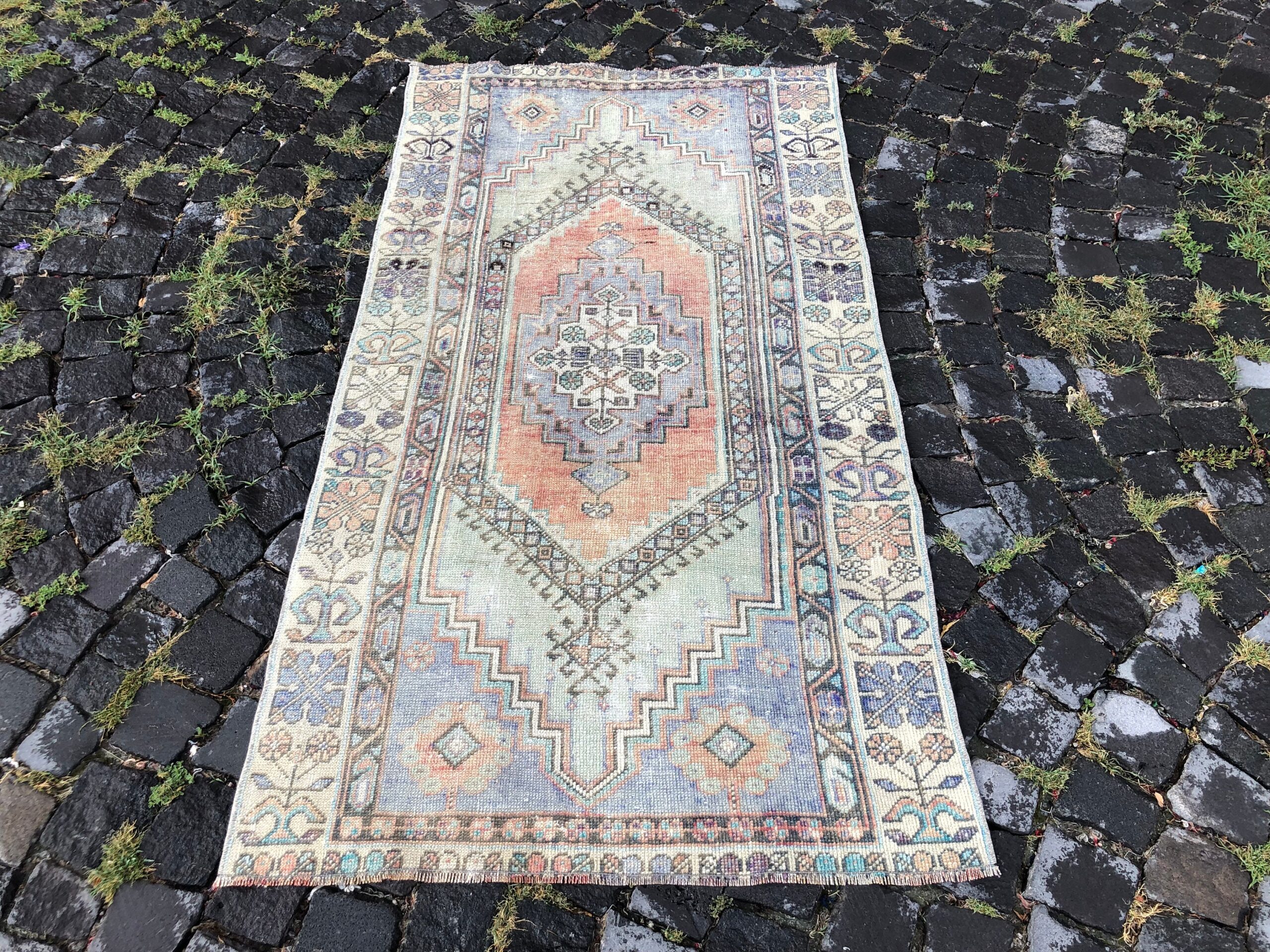 Lovely and unique 3.1 ft. x 5.8 ft. (95 cm x 176 cm) vintage Turkish rug hand-knotted in Turkey from organic wool. This is an authentic vintage Turkish rug from the 1970s that has worn beautifully to perfection.