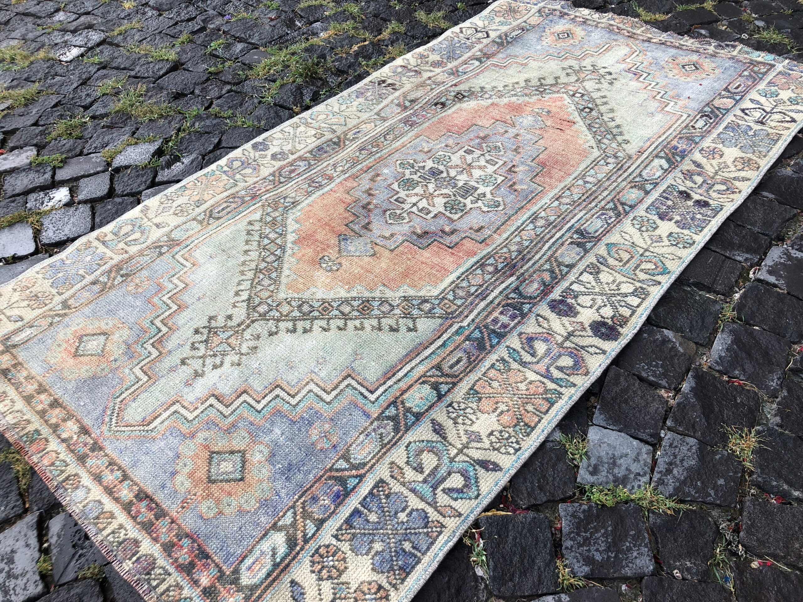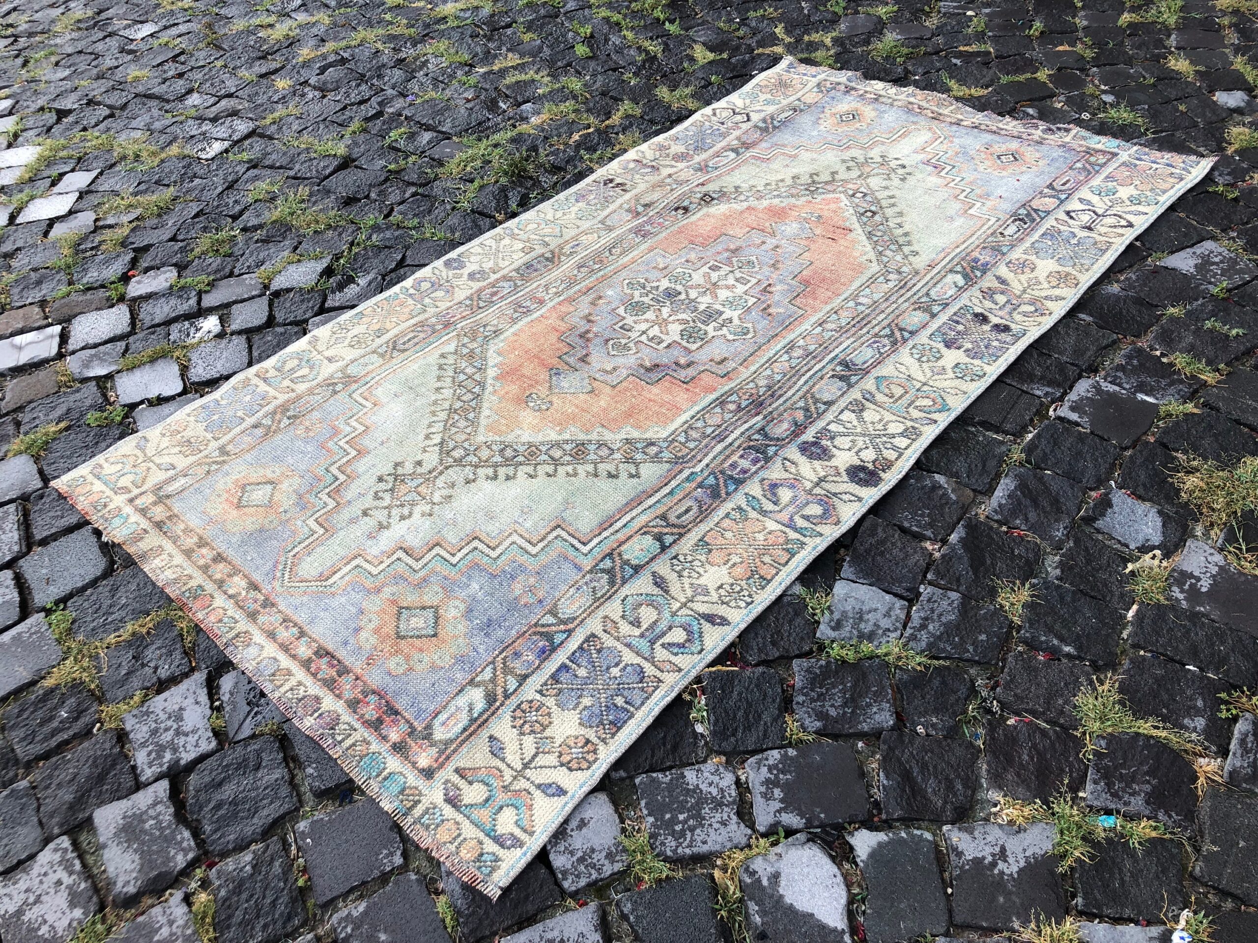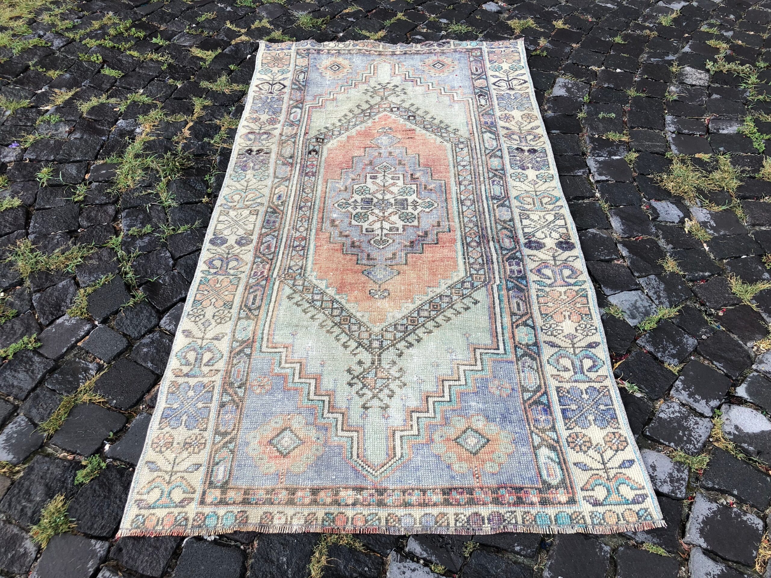 Lovely and unique 3.1 ft. x 5.8 ft. (95 cm x 176 cm) vintage Turkish rug hand-knotted in Turkey from organic wool. This is an authentic vintage Turkish rug from the 1970s that has worn beautifully to perfection.