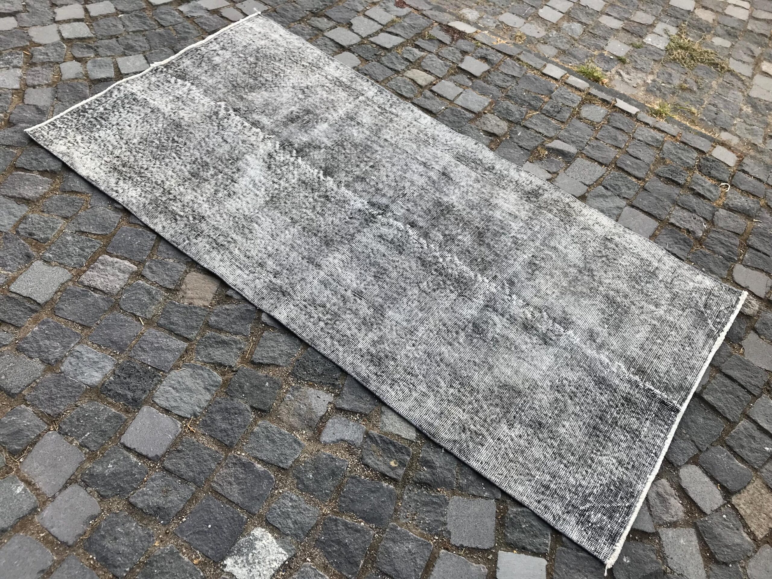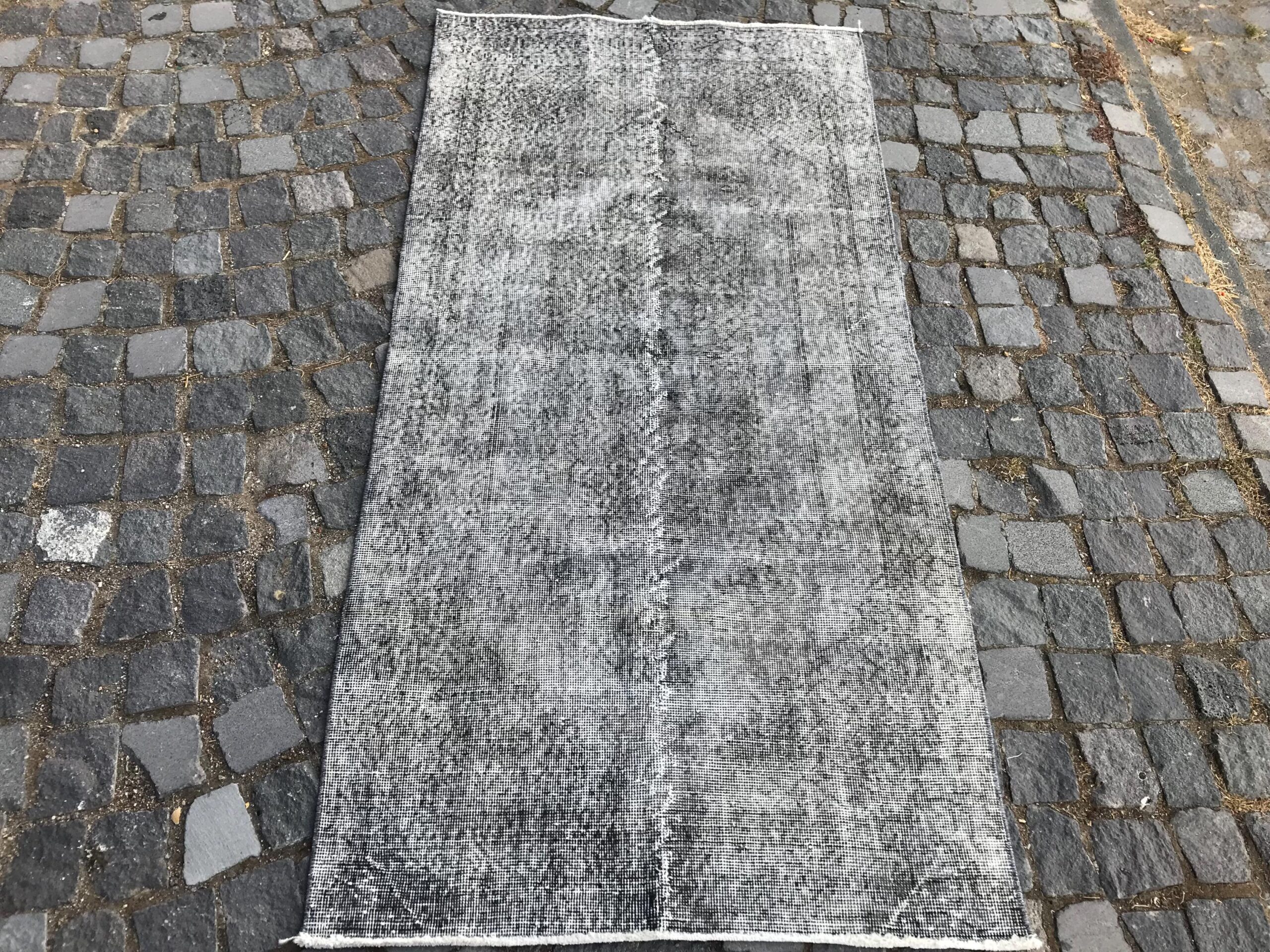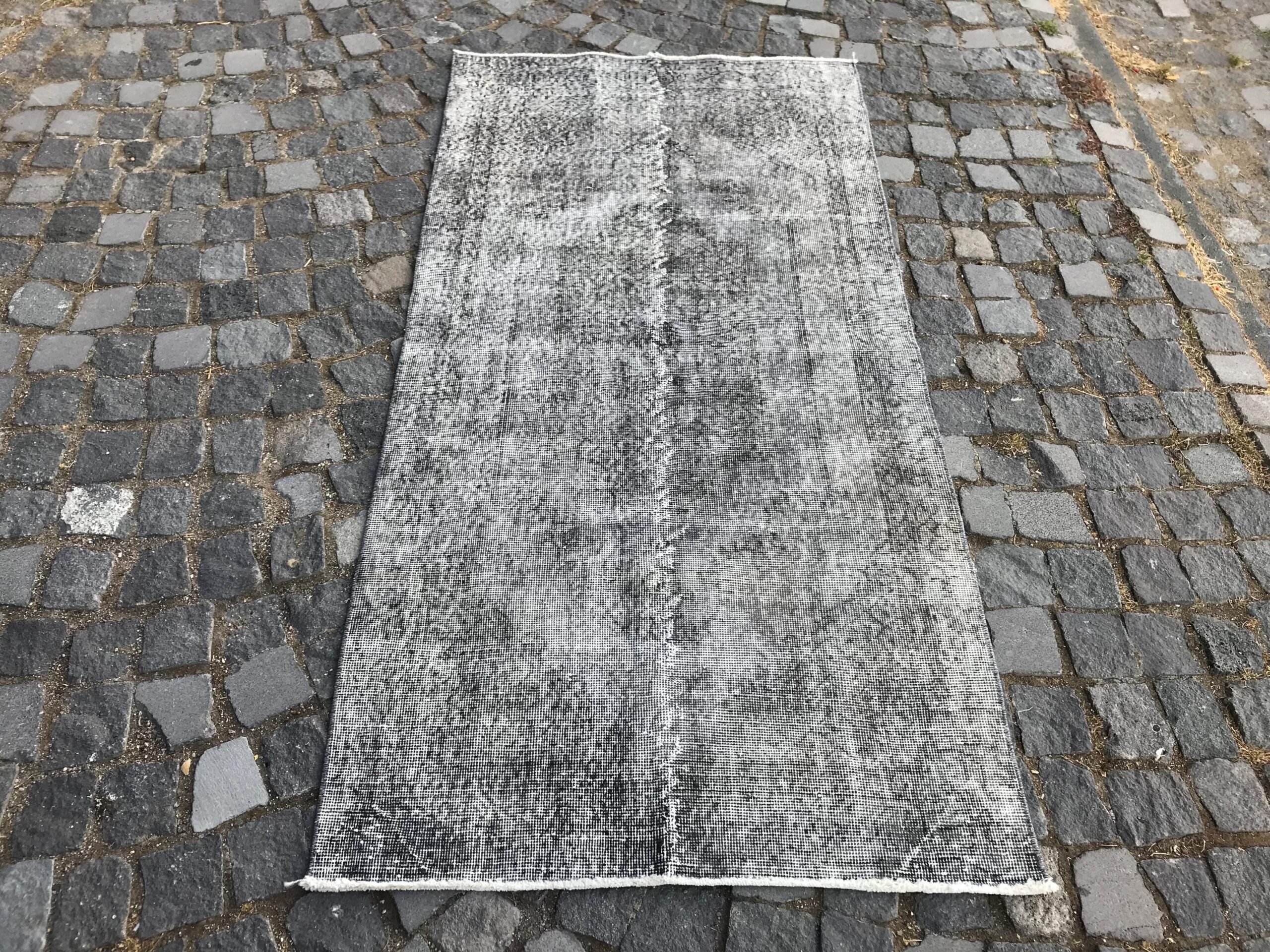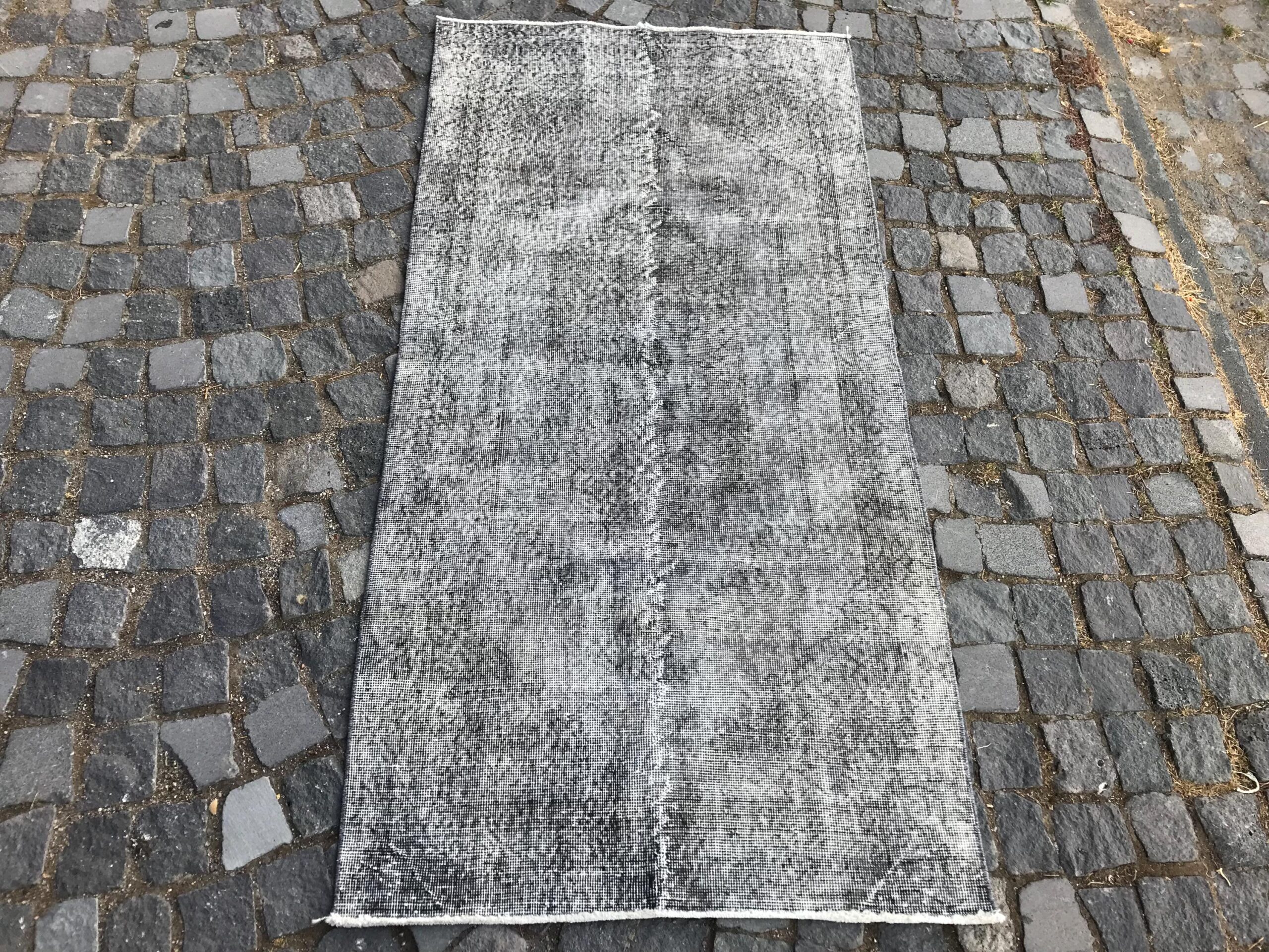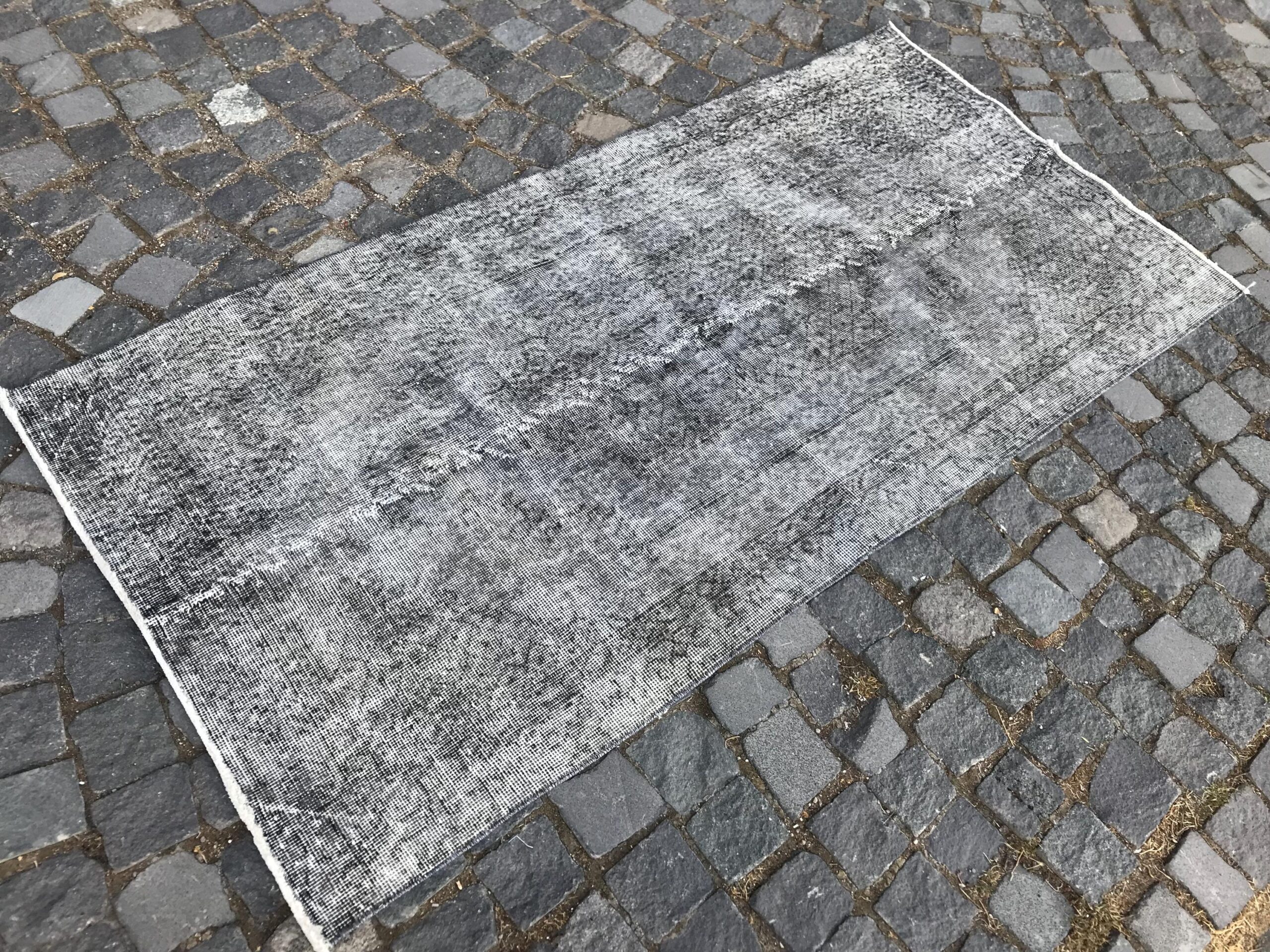 Pretty and one-of-a-kind 3.1 ft. x 6.4 ft. (96 cm x 196 cm) vintage overdyed rug hand-knotted in Turkey from organic wool. This is an authentic vintage rug from the 1980s that has worn splendidly to perfection.