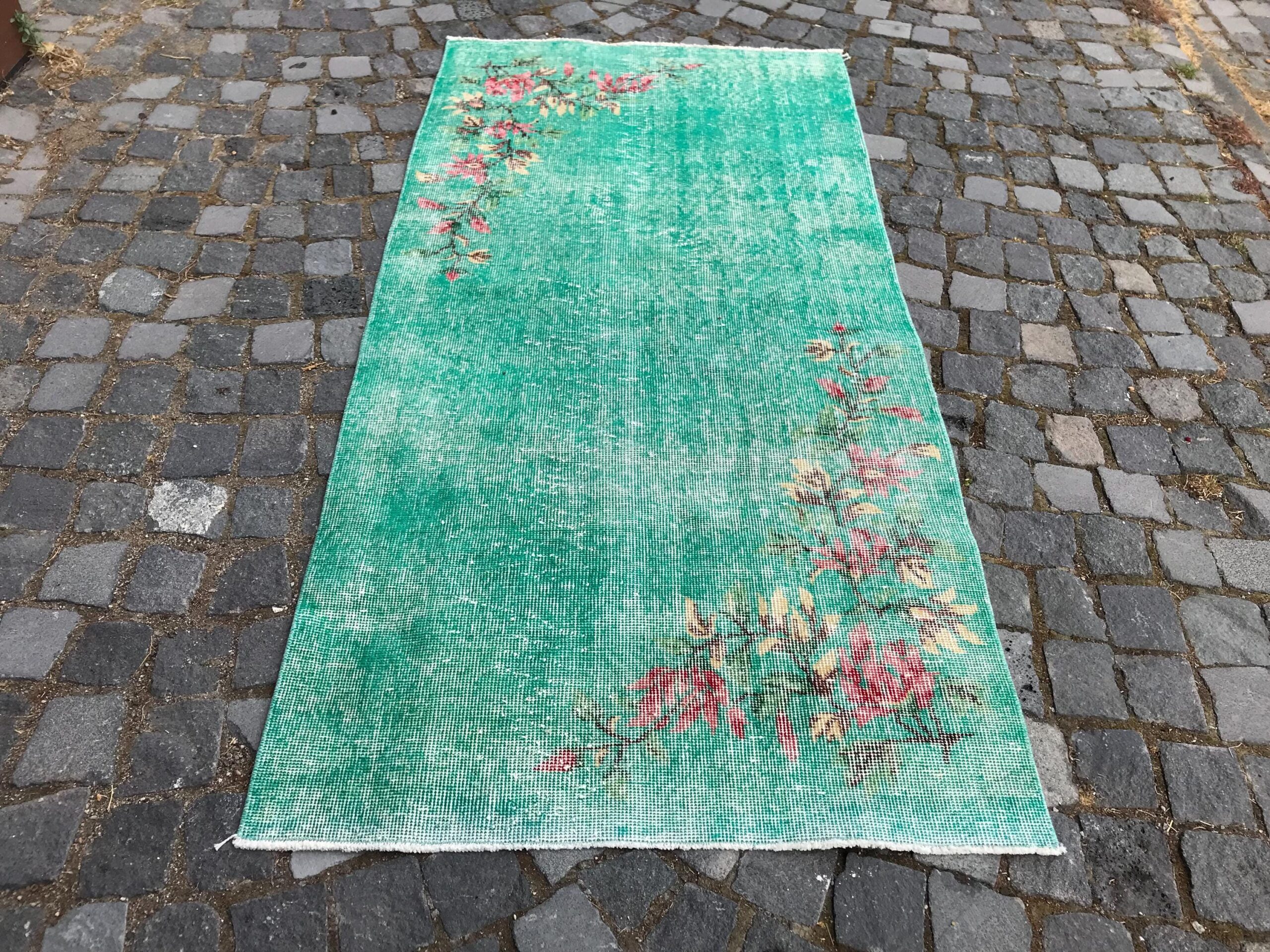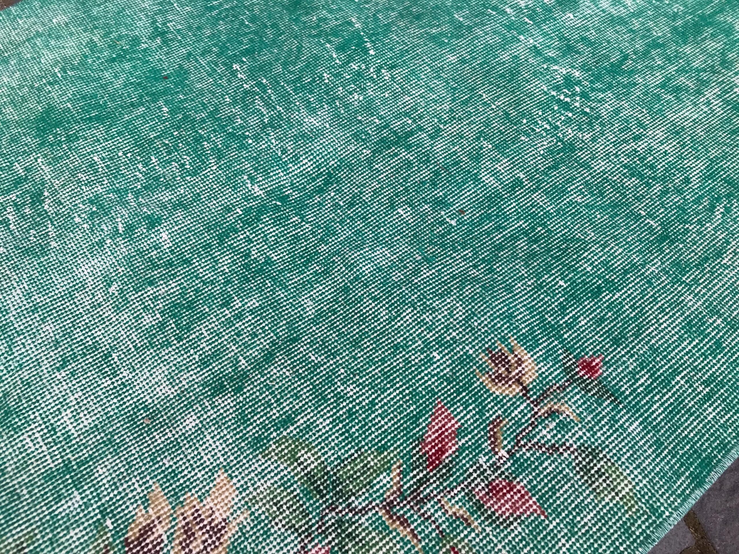 This is a vintage overdyed rug made through over-dyeing an authentic vintage Turkish rug using natural (vegetable) dyes. This rug originated in a small village in Turkey where it was hand-knotted from natural wool (sheep) by skilled Anatolian women during around the 1980s. Natural materials are more durable than synthetic materials guaranteeing a rug that can last for years while natural dyes provide colors that gets more beautiful as years pass by especially when in direct sunlight.