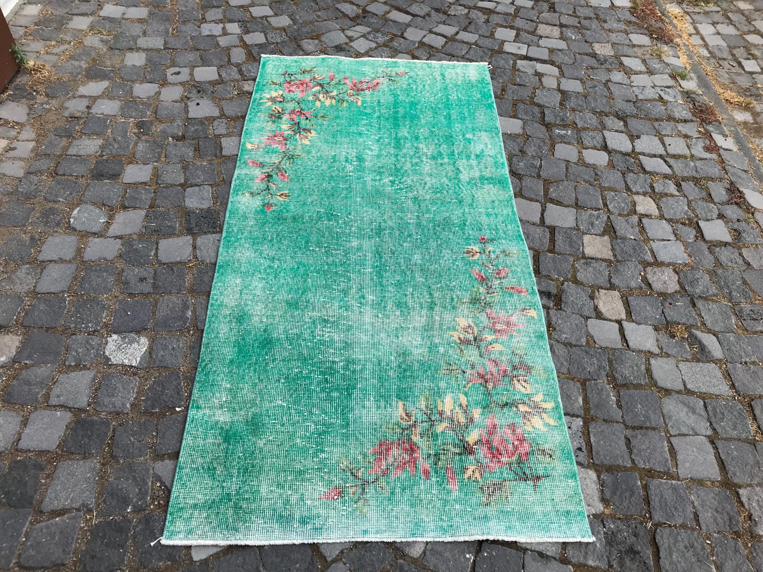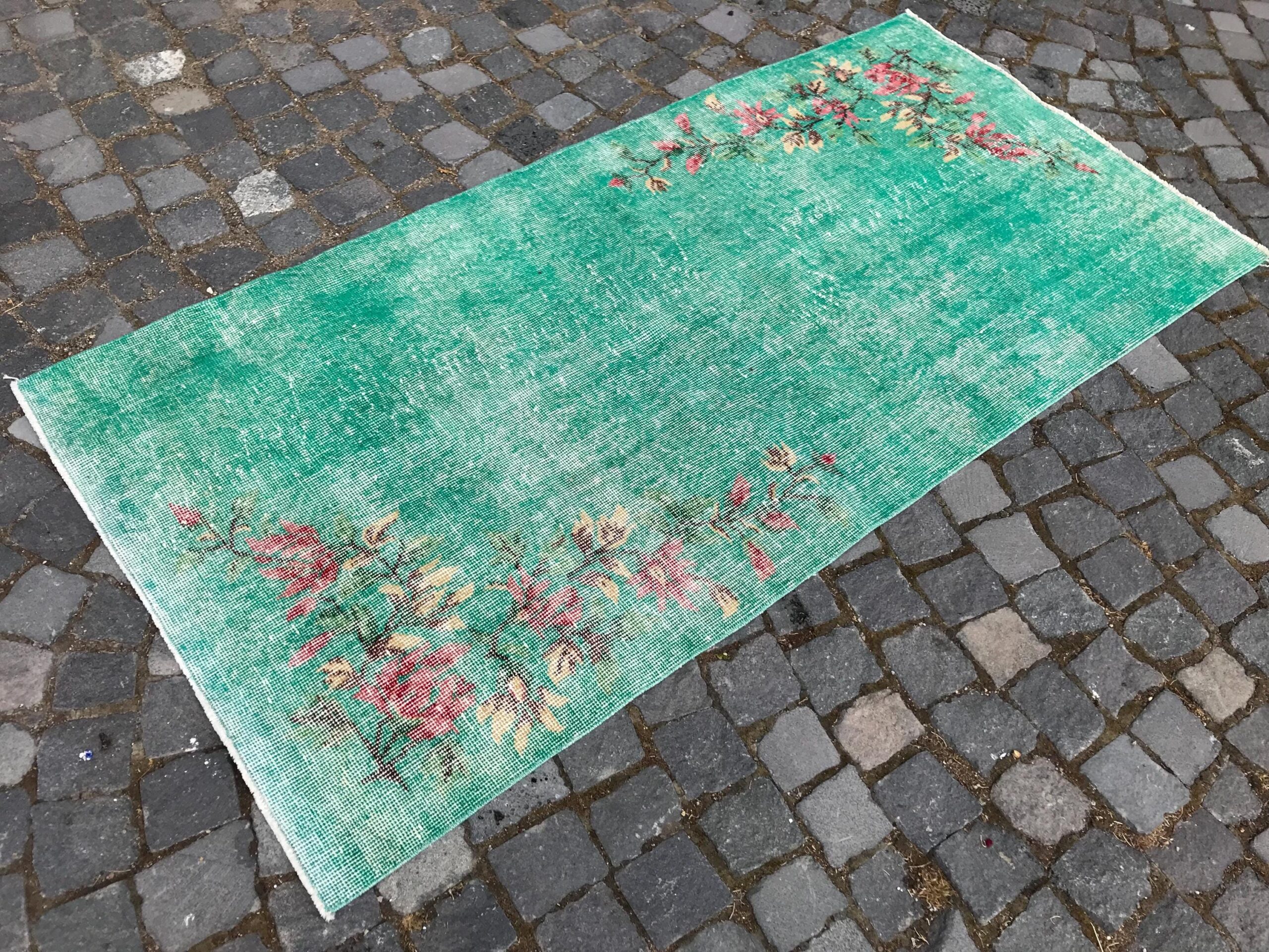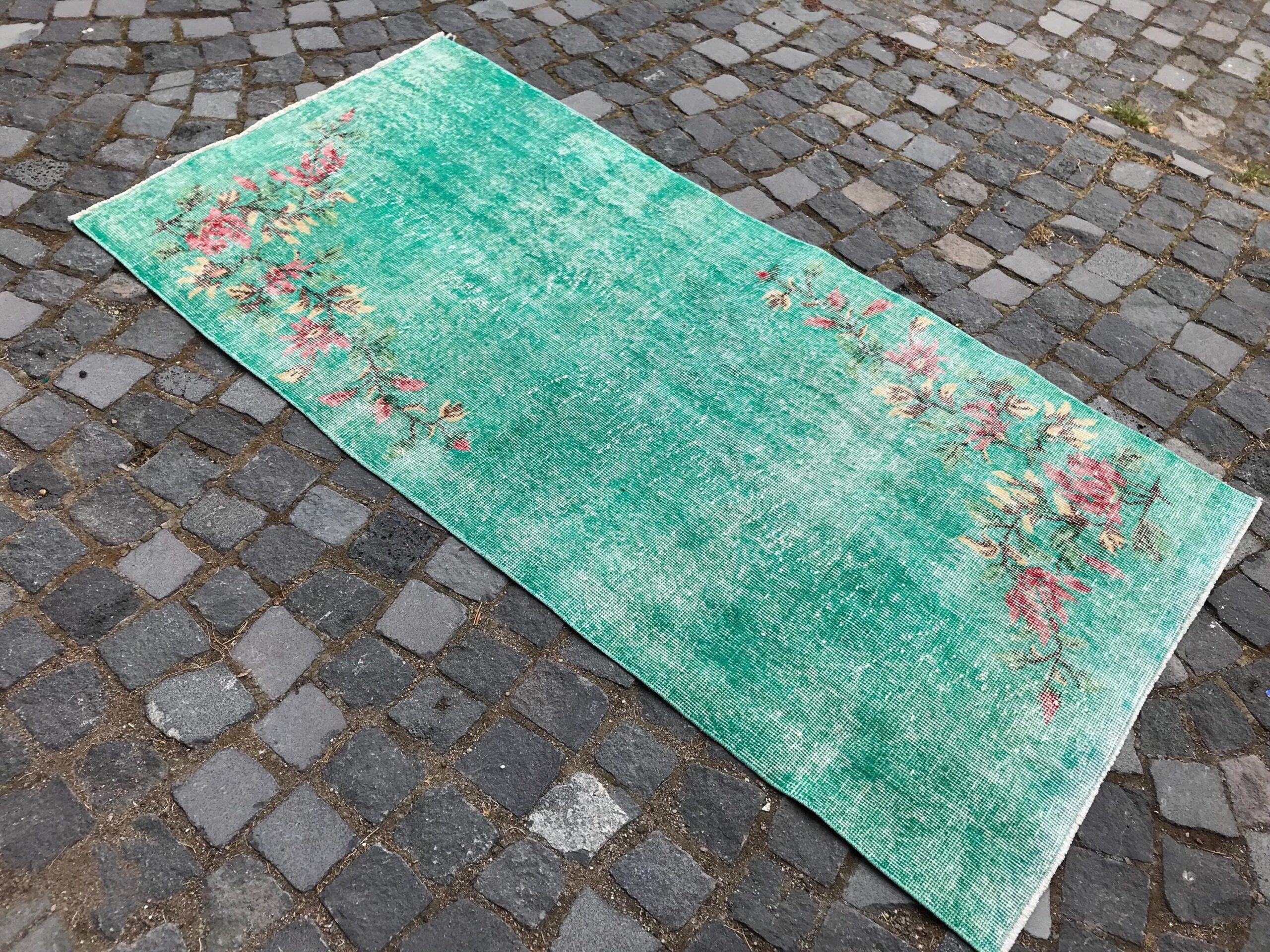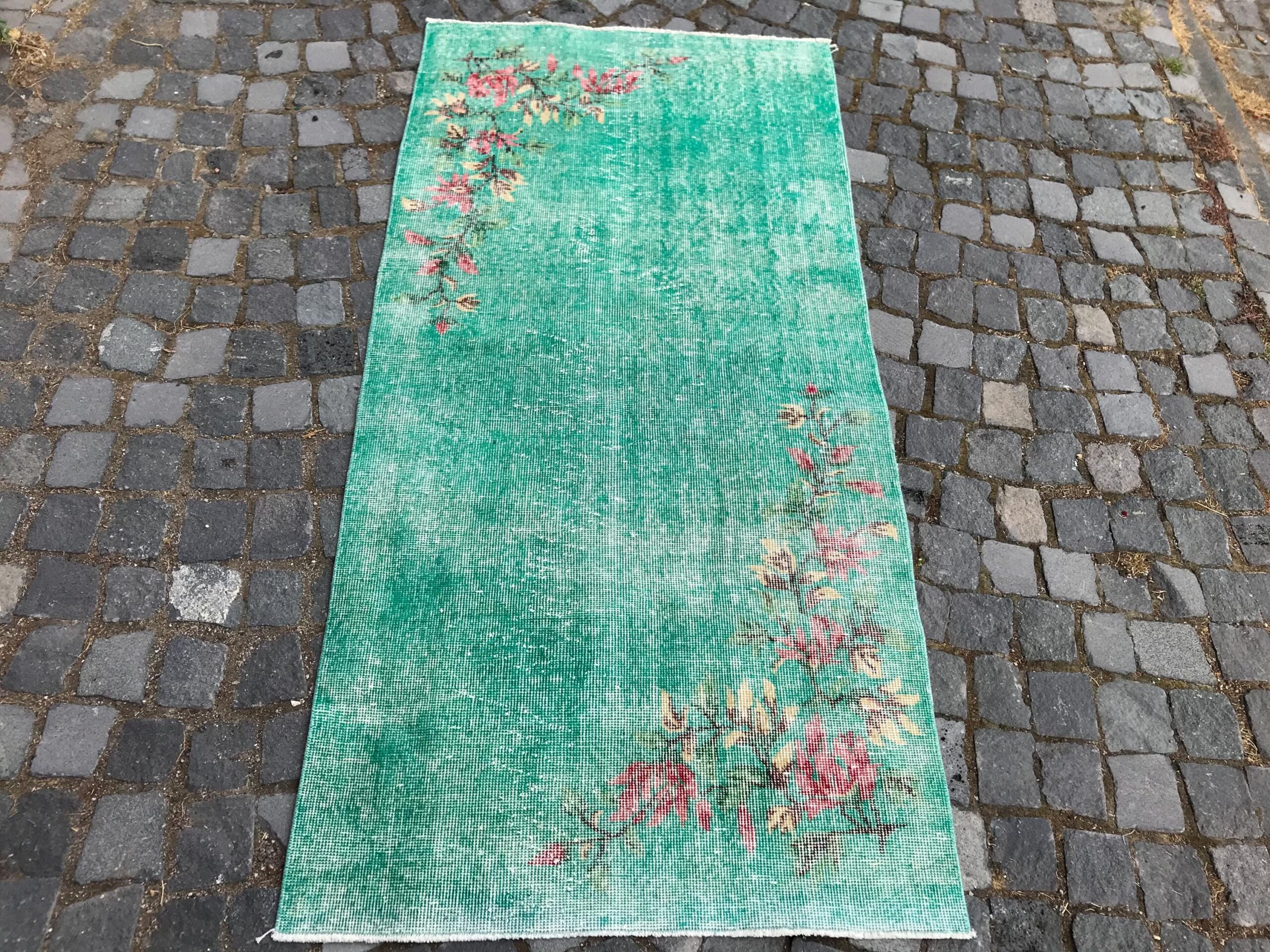 Pretty and one-of-a-kind 3.1 ft. x 6.5 ft. (95 cm x 197 cm) vintage overdyed rug hand-knotted in Turkey from organic wool. This is an authentic vintage rug from the 1980s that has worn splendidly to perfection.