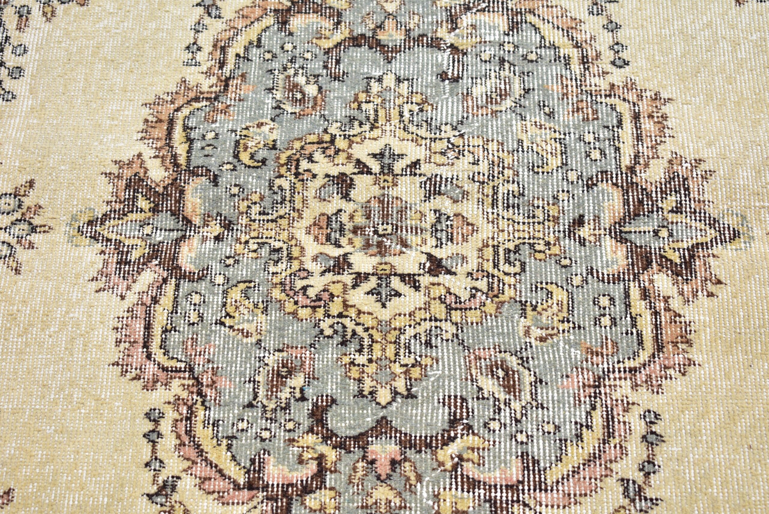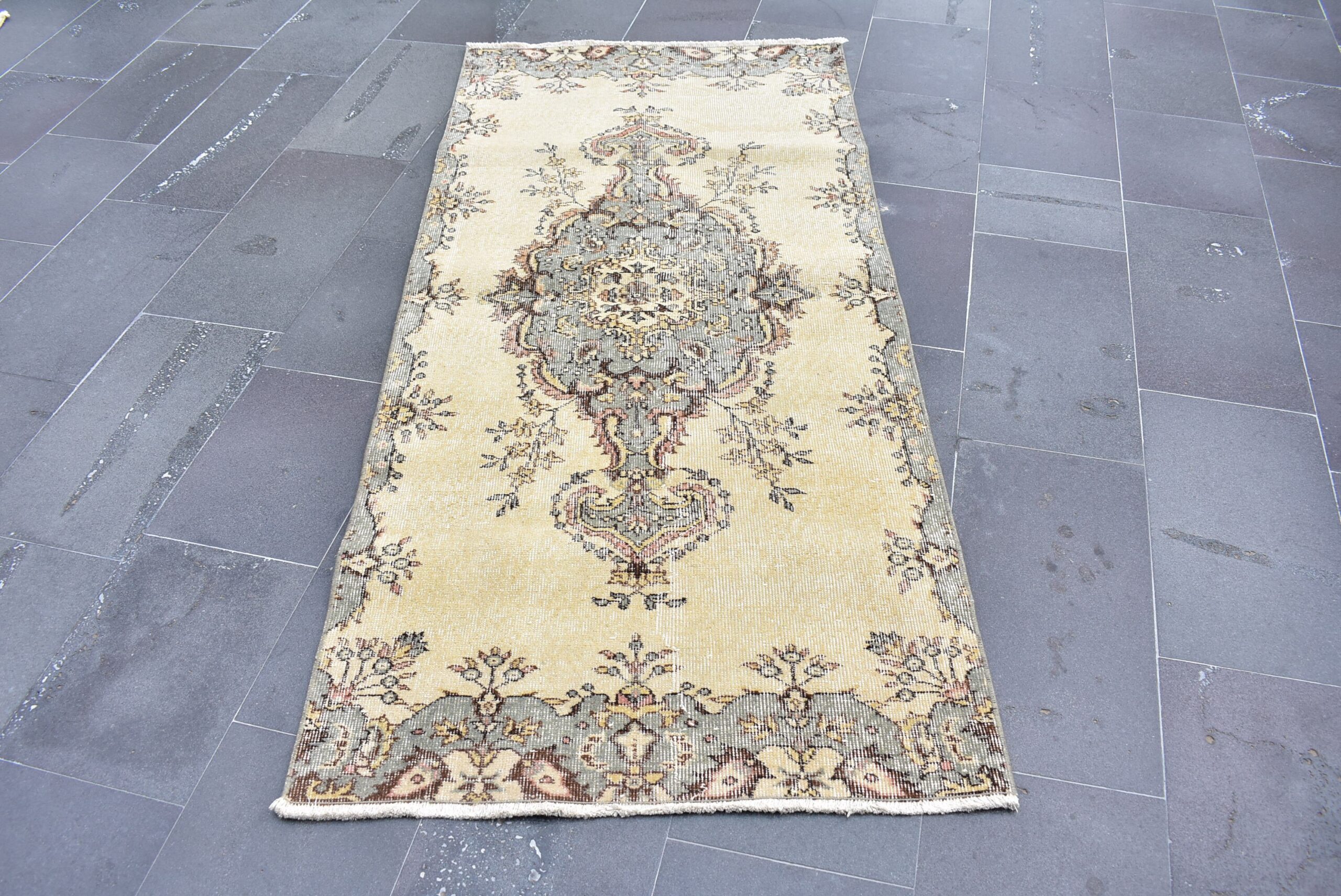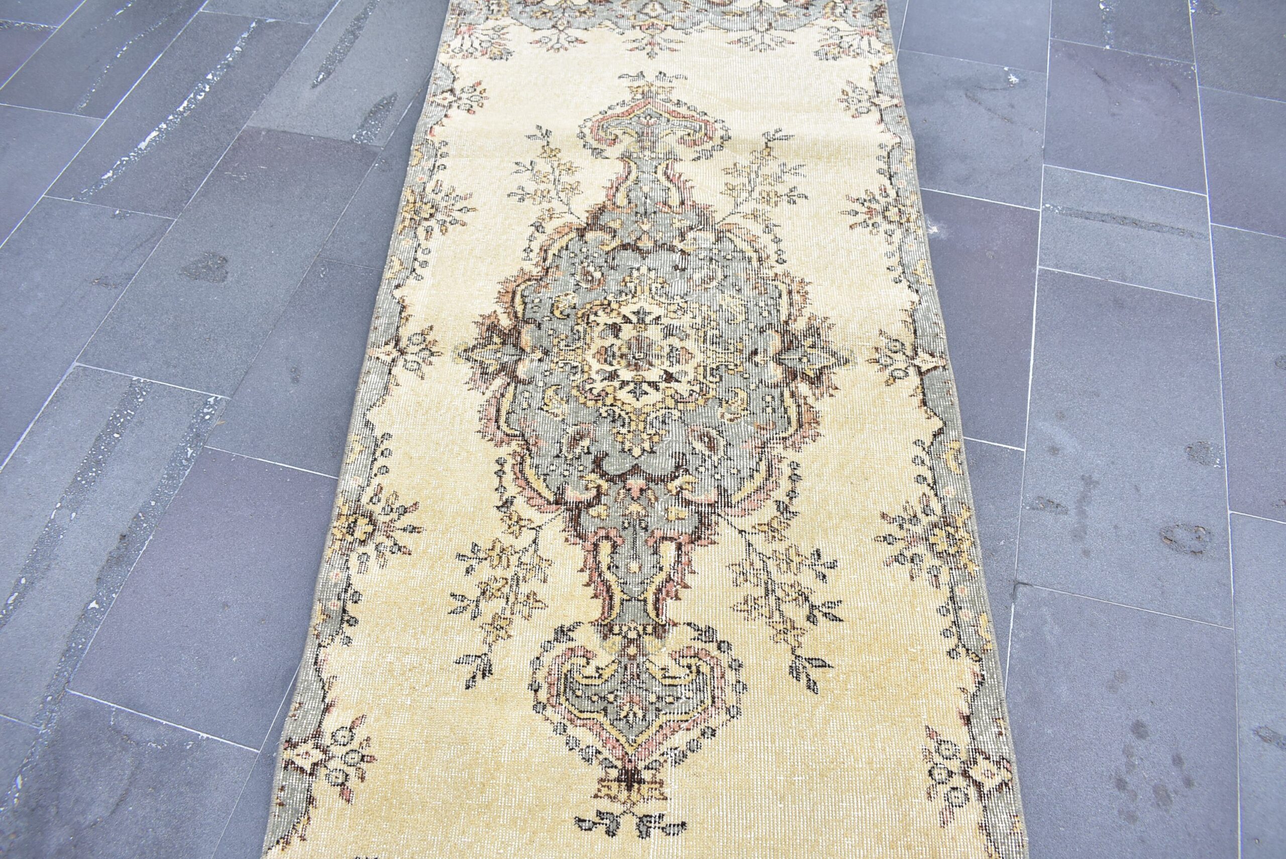 Beautiful and one-of-a-kind 3.1 ft. x 6.8 ft. (93 cm x 207 cm) vintage Turkish rug hand-knotted in Turkey from organic wool. This is an authentic vintage Turkish rug from the 1990s that has worn admirably to perfection.
