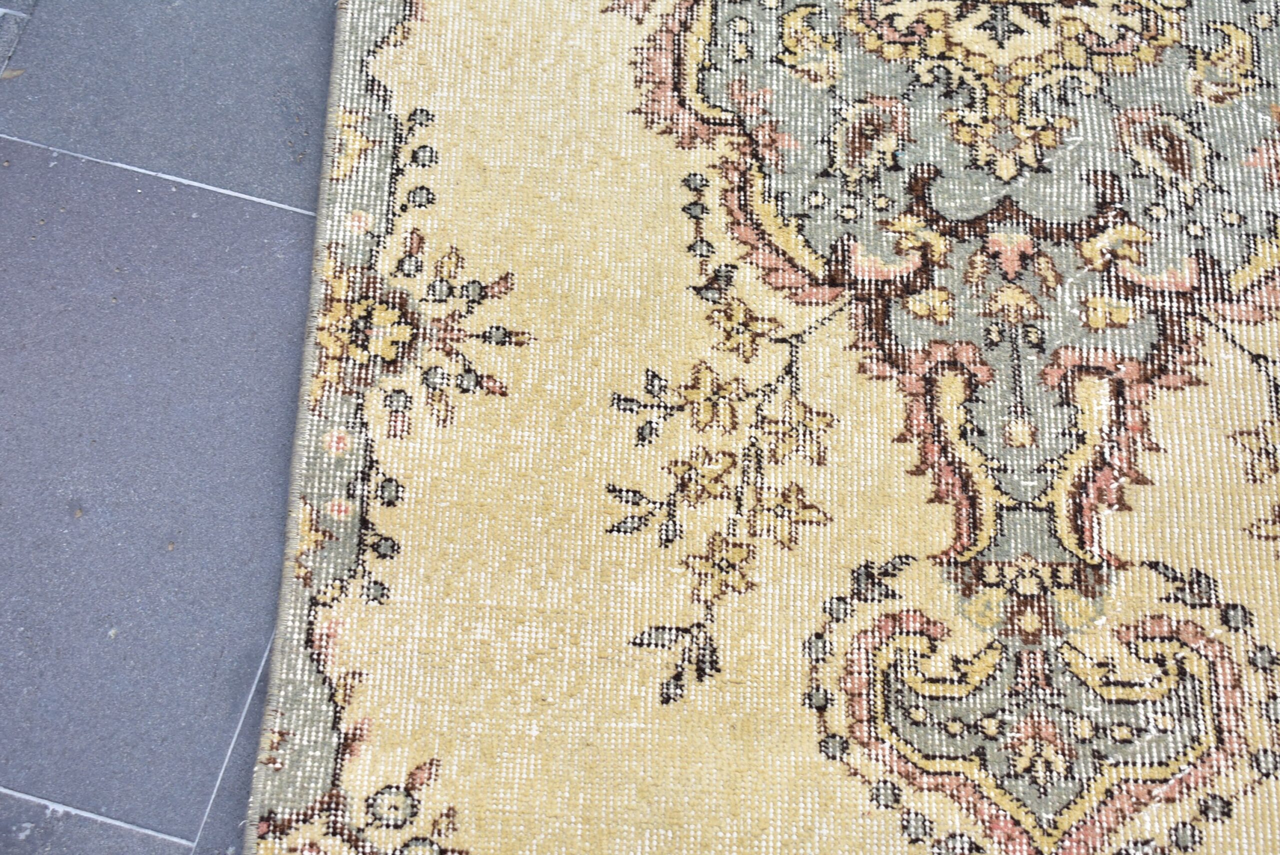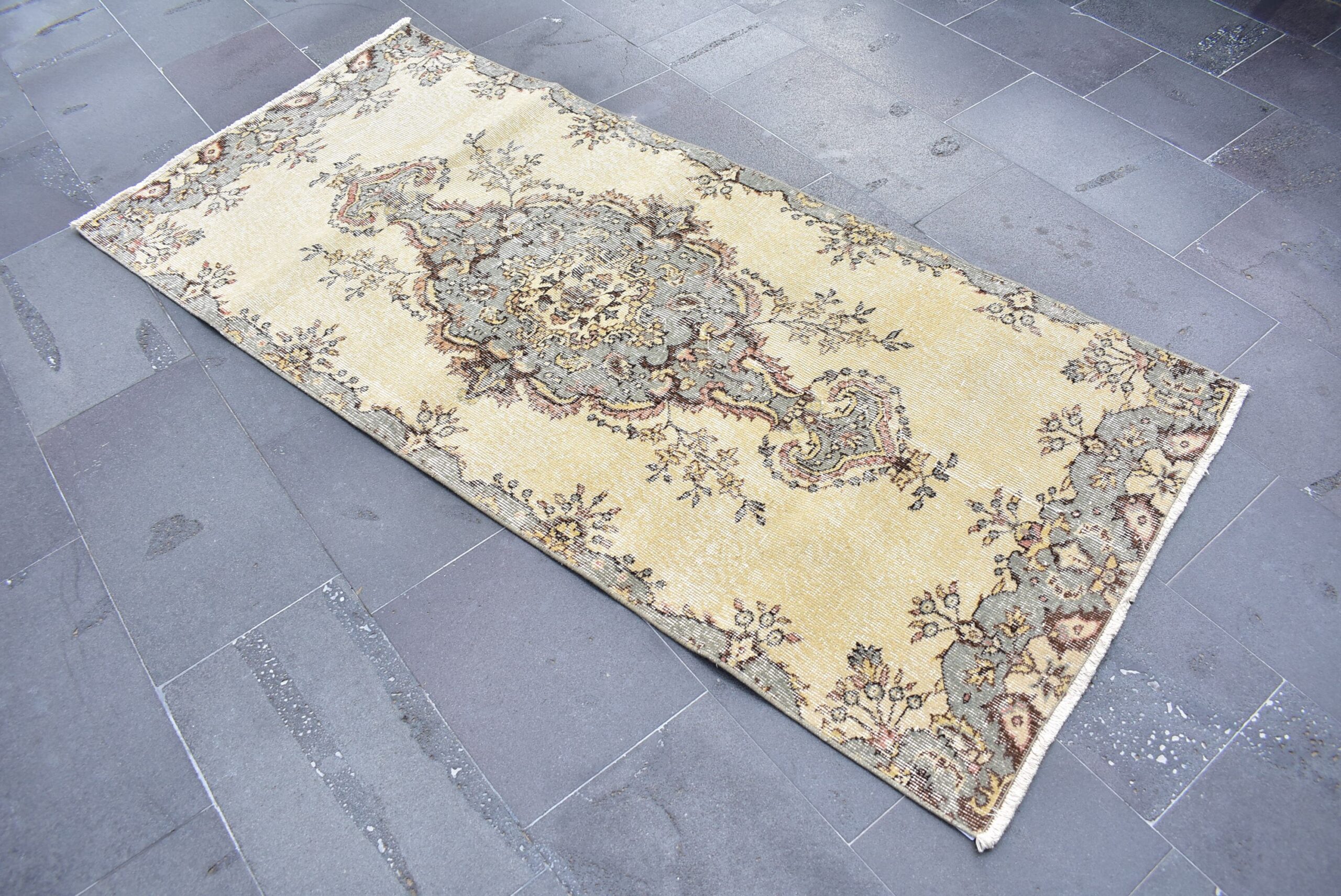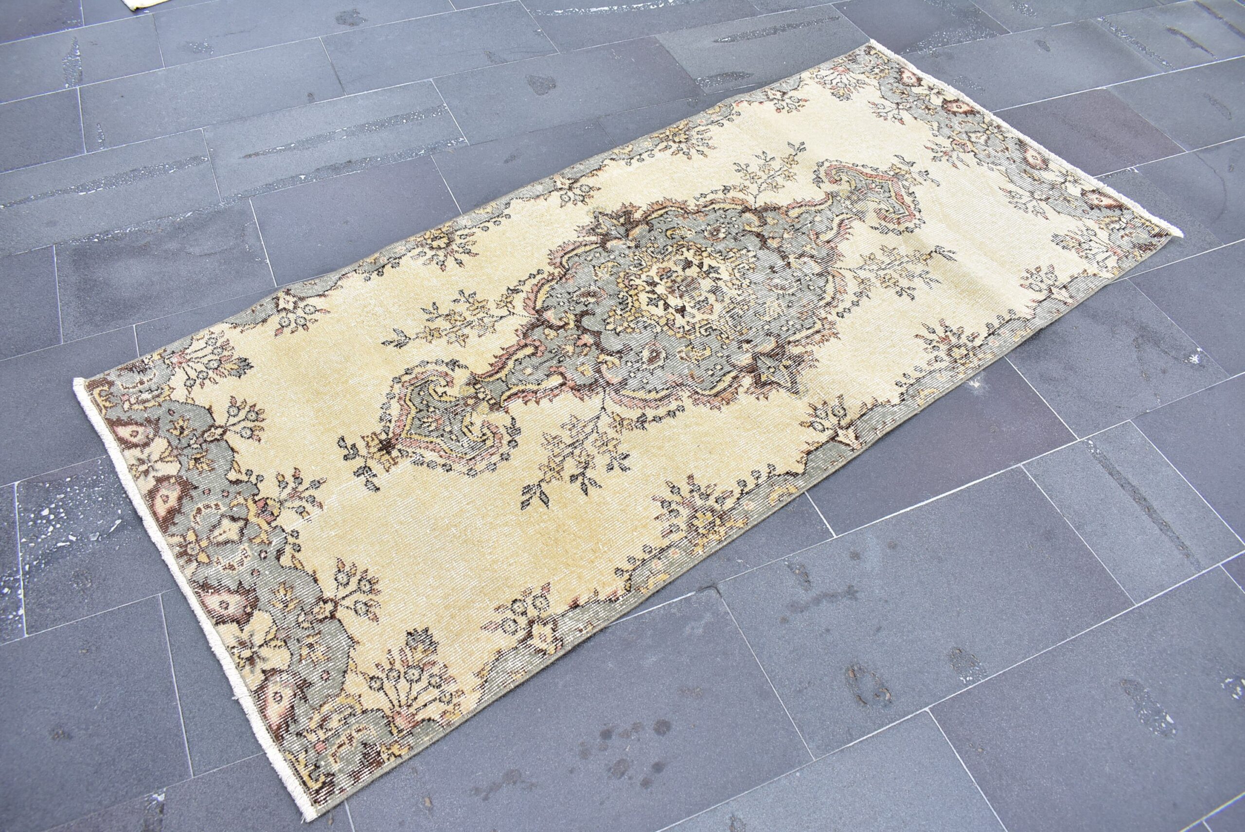 Beautiful and one-of-a-kind 3.1 ft. x 6.8 ft. (93 cm x 207 cm) vintage Turkish rug hand-knotted in Turkey from organic wool. This is an authentic vintage Turkish rug from the 1990s that has worn admirably to perfection.