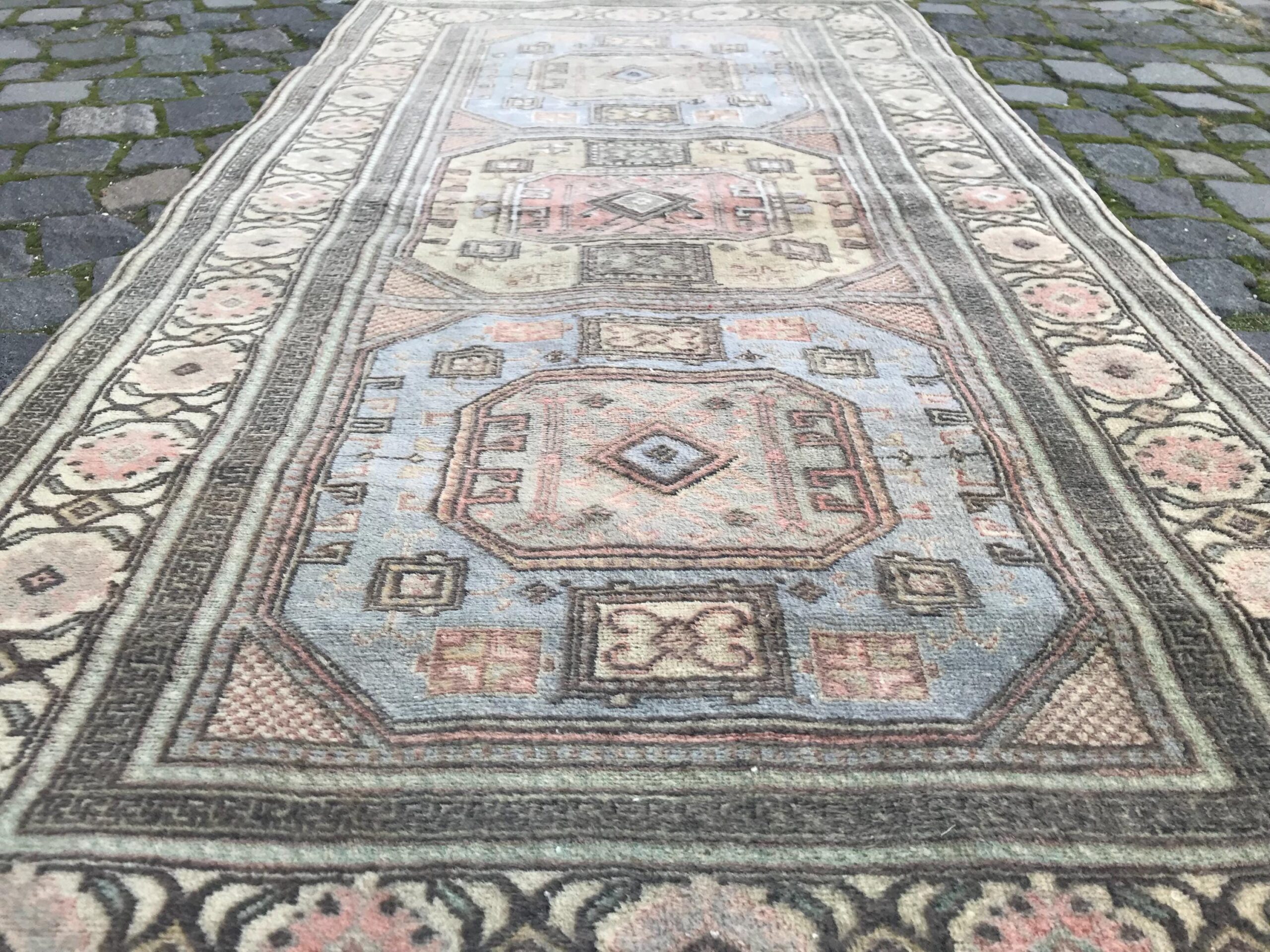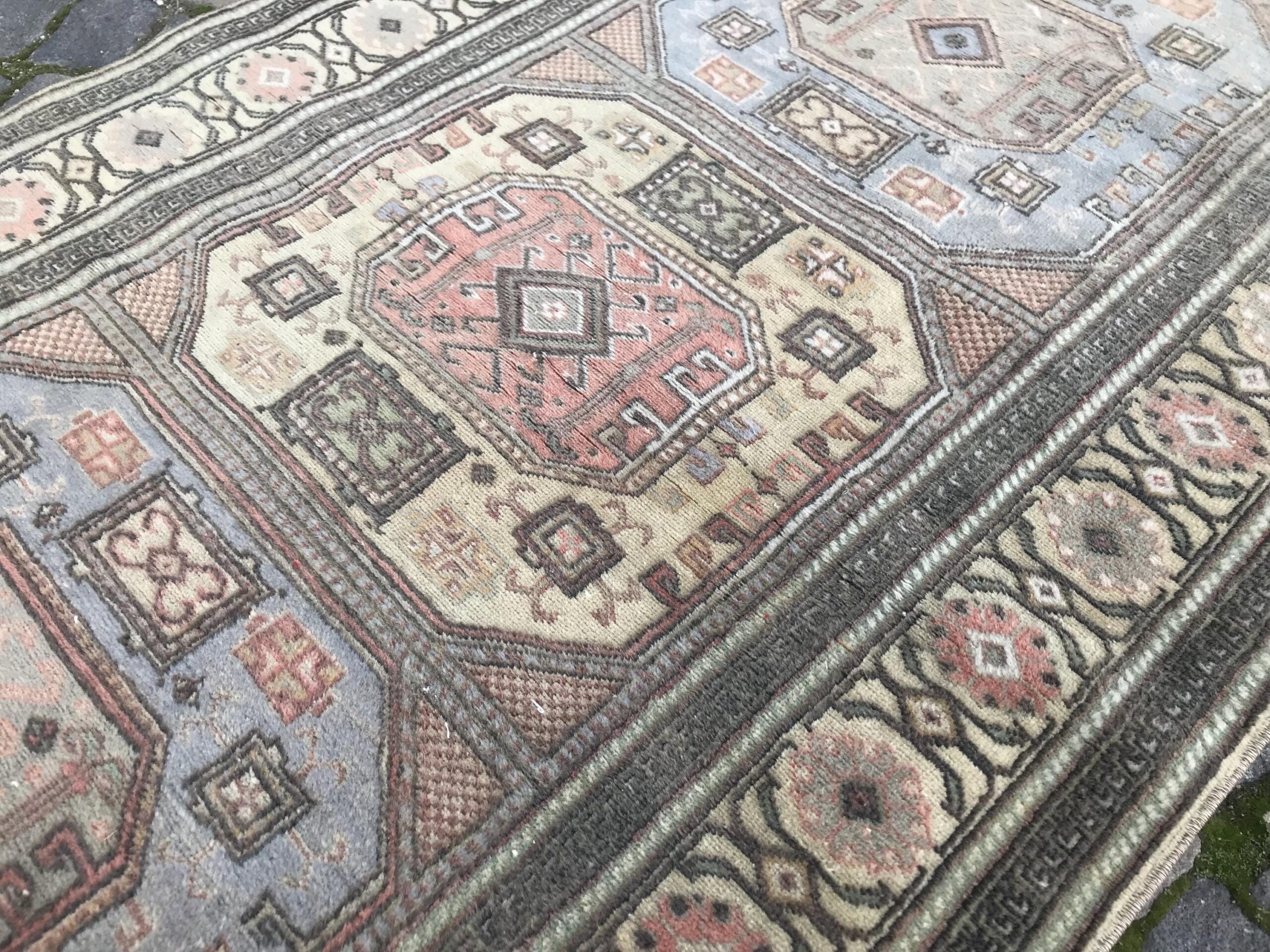 This is a vintage Turkish rug hand-knotted in a small village in Turkey by skilled Anatolian women during around the 1990s. It is made from natural wool (sheep) and dyed using all-natural (vegetable) dyes. Natural materials are more durable than synthetic materials guaranteeing a rug that can last for years while natural dyes provide colors that gets more beautiful as years pass by especially when in direct sunlight.