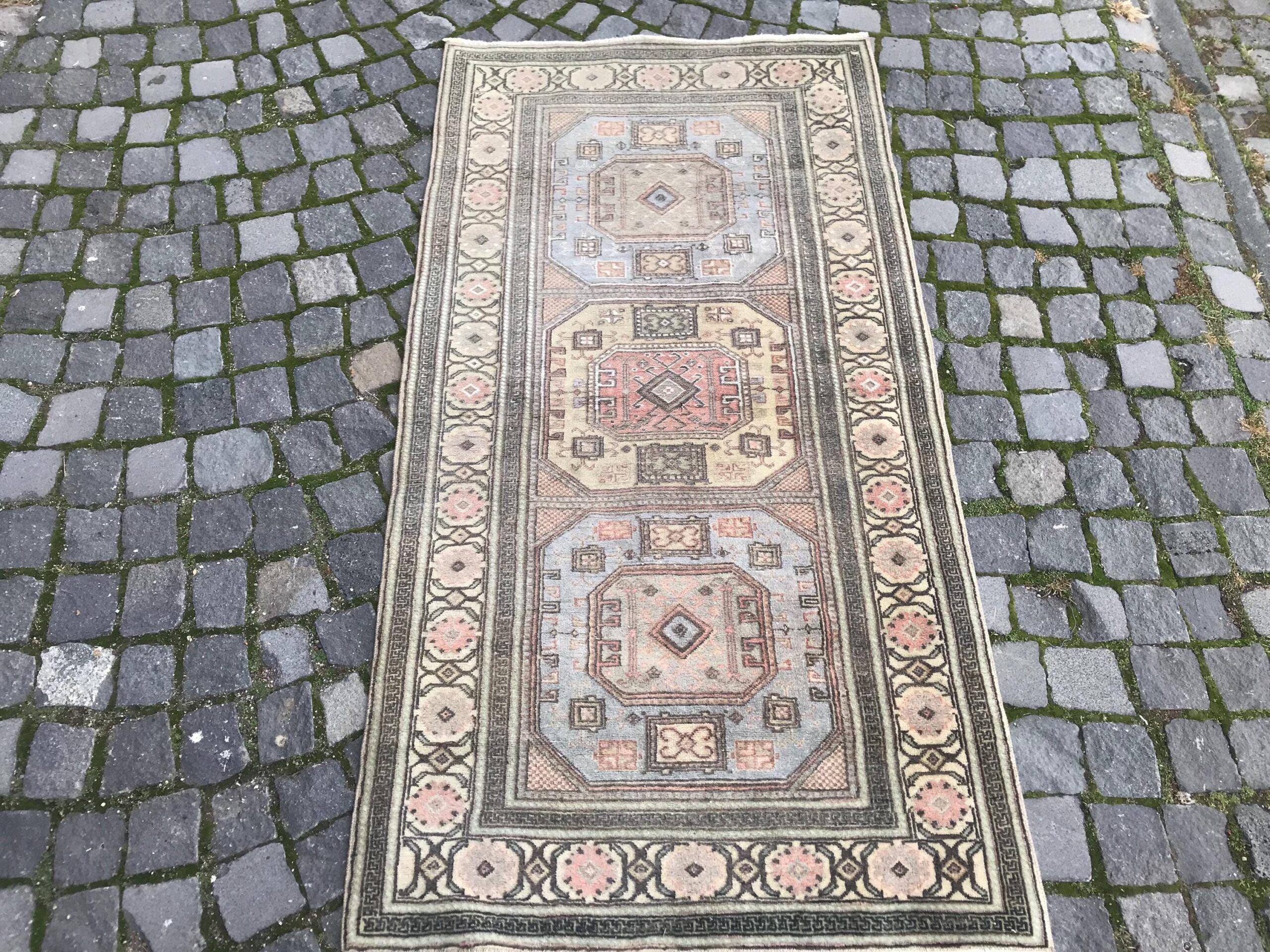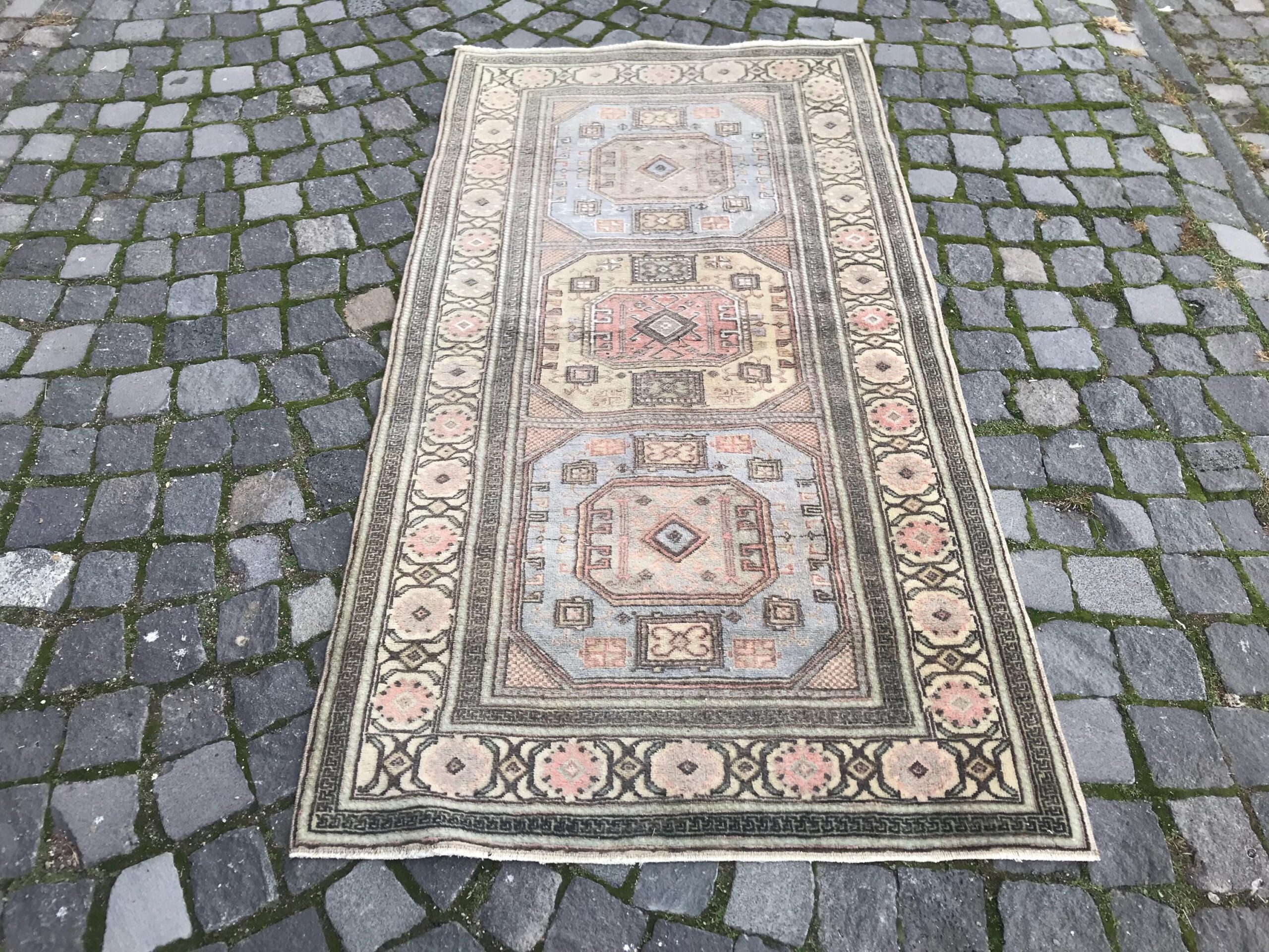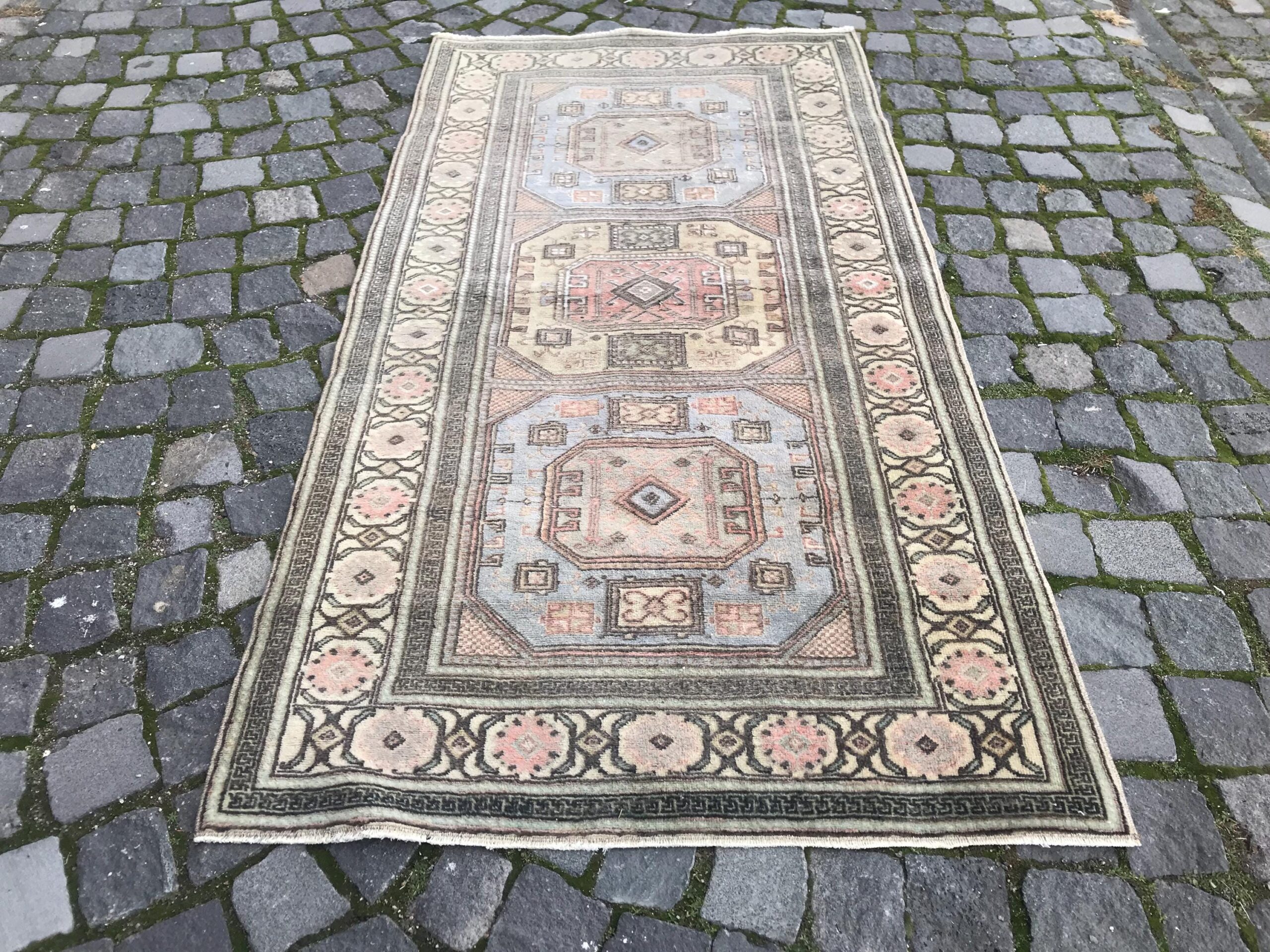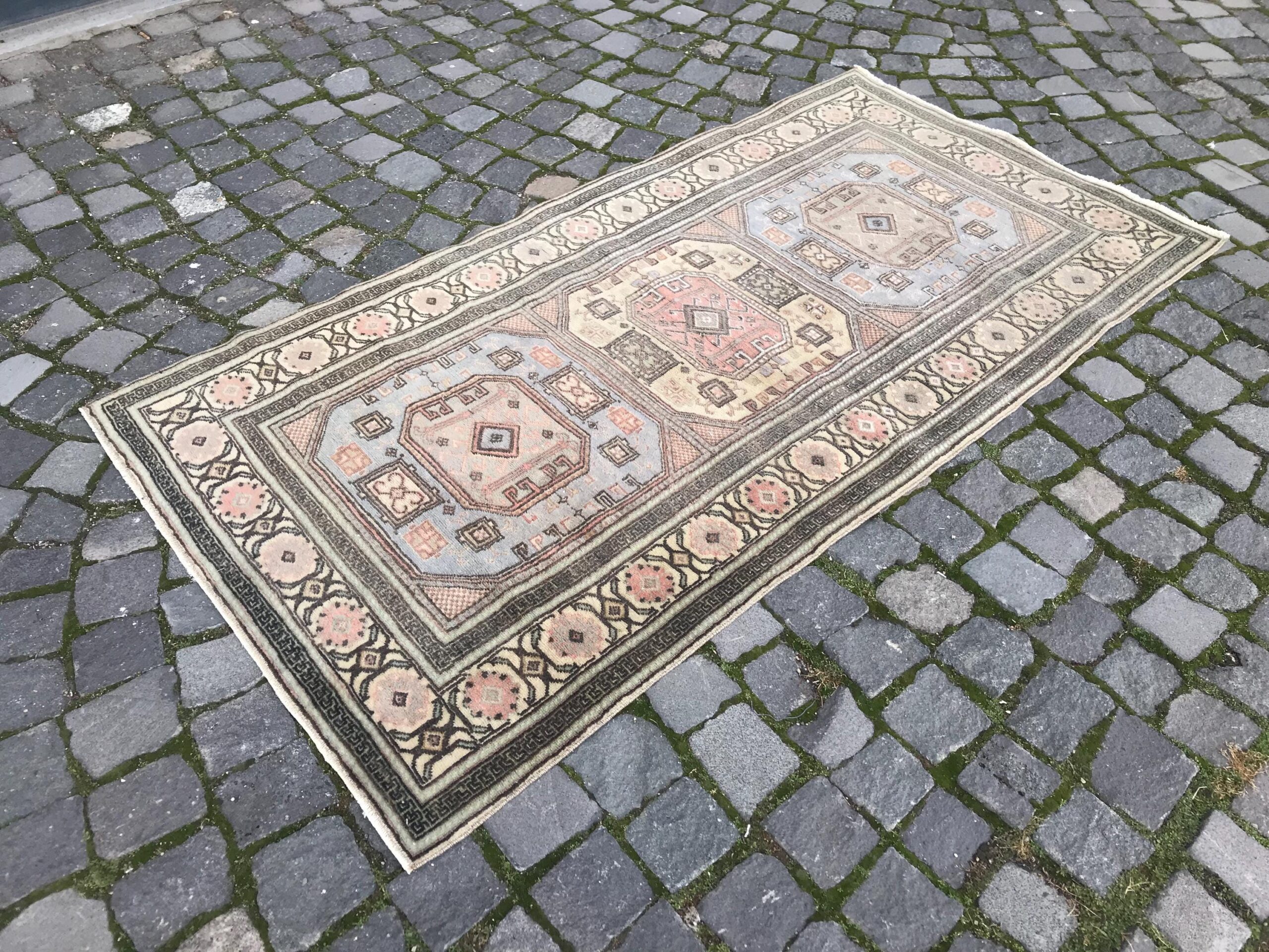 Beautiful and one-of-a-kind 3.1 ft. x 6 ft. (96 cm x 182 cm) vintage Turkish rug hand-knotted in Turkey from organic wool. This is an authentic vintage Turkish rug from the 1990s that has worn admirably to perfection.