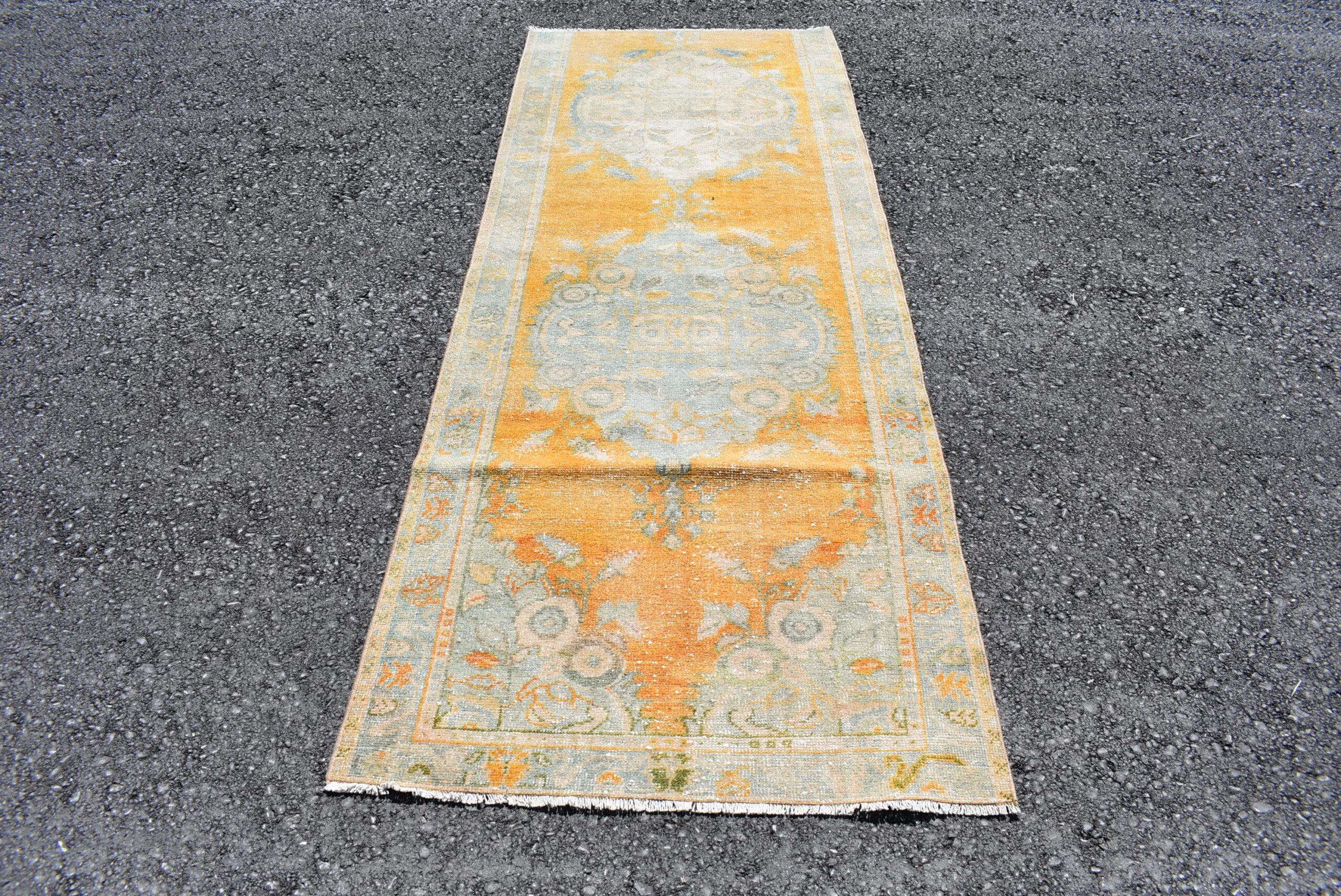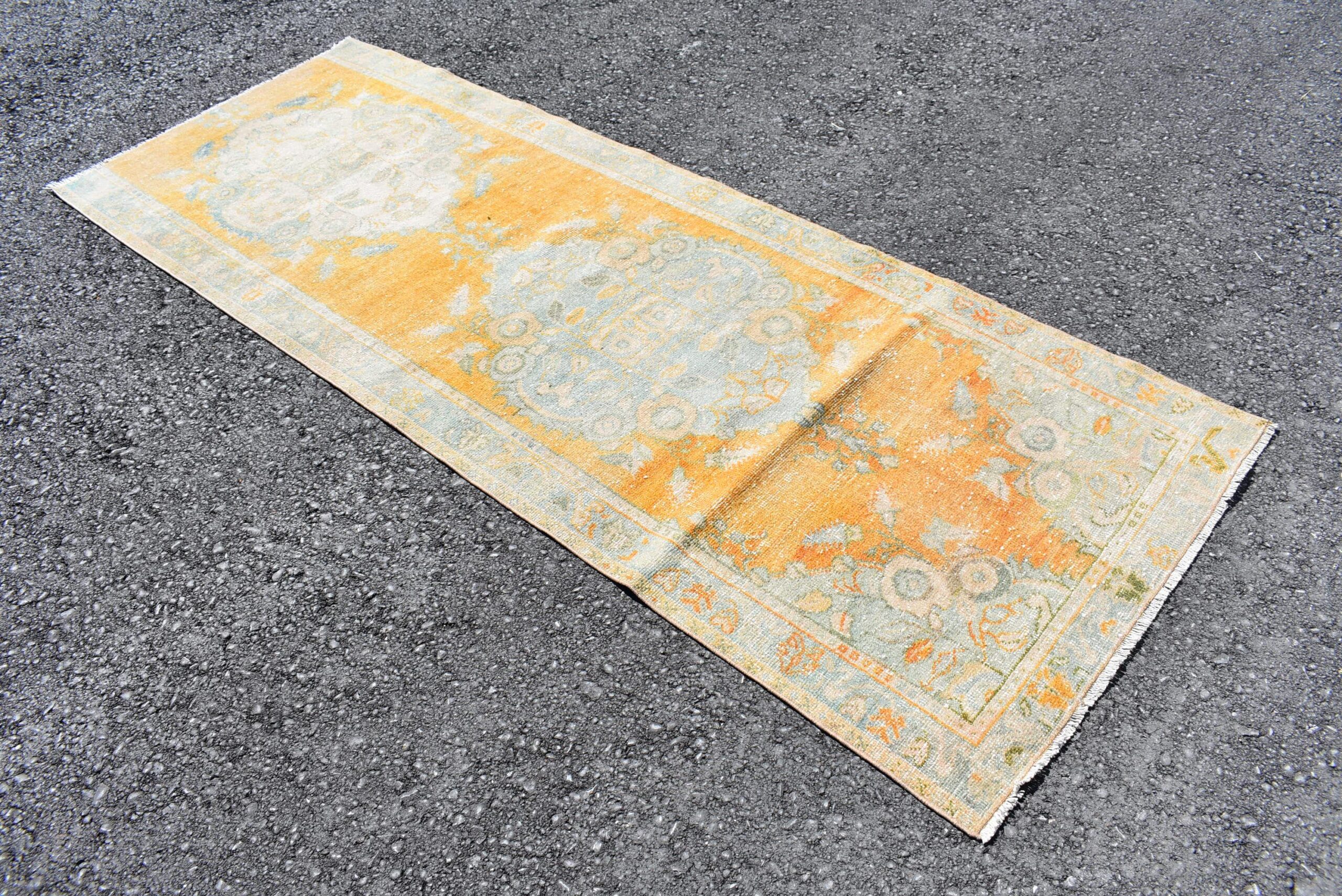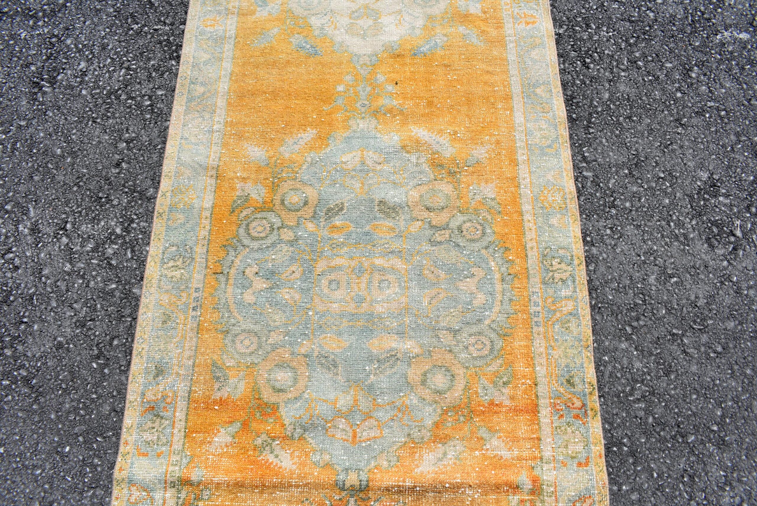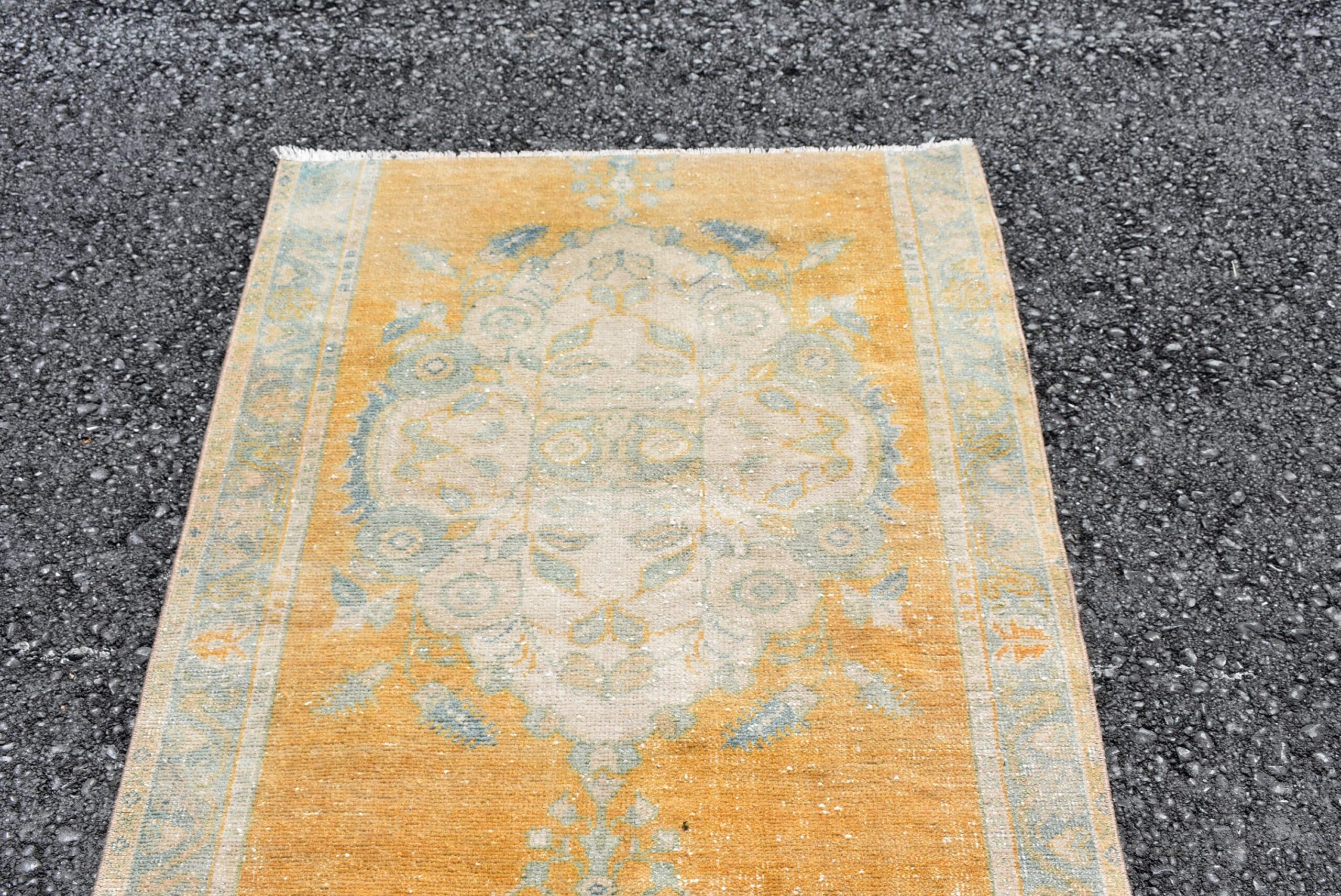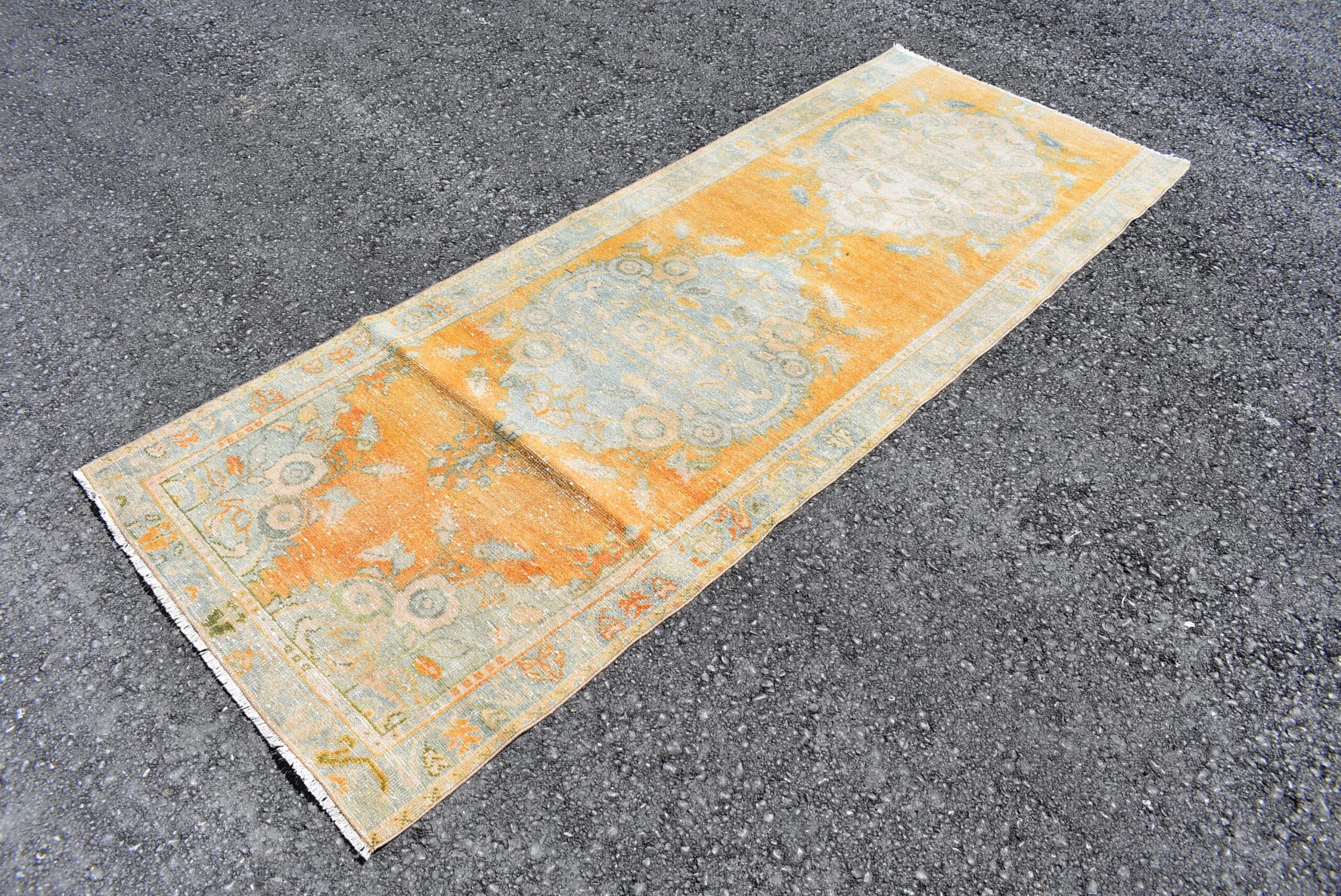 Beautiful and one-of-a-kind 3.1 ft. x 8.2 ft. (95 cm x 250 cm) vintage Turkish rug hand-knotted in Turkey from organic wool. This is an authentic vintage Turkish rug from the 1970s that has worn admirably to perfection.