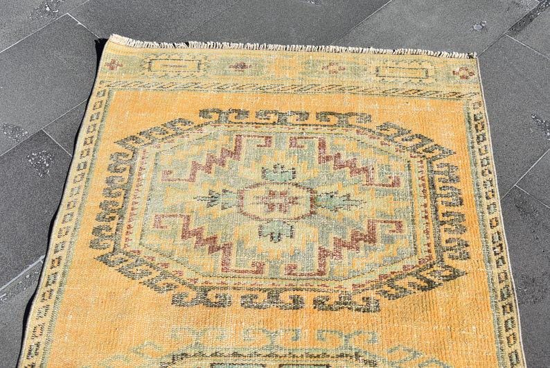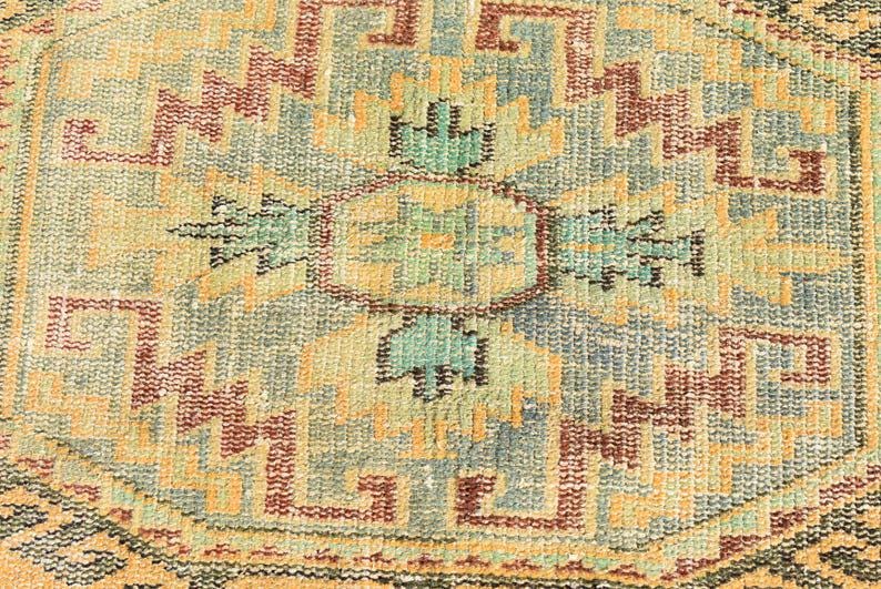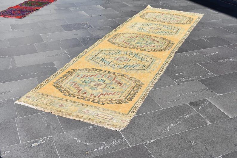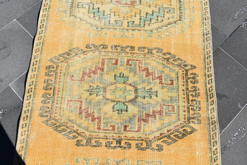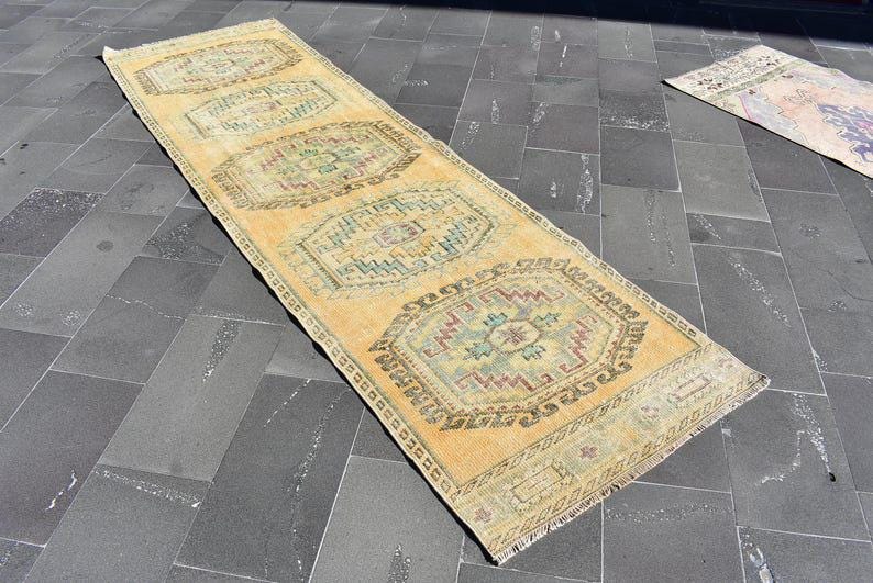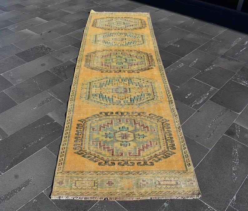 Lovely and unique 3.2 ft. x 11.1 ft. (98 cm x 337 cm) vintage Turkish rug hand-knotted in Turkey from organic wool. This is an authentic vintage Turkish rug from the 1970s that has worn beautifully to perfection.