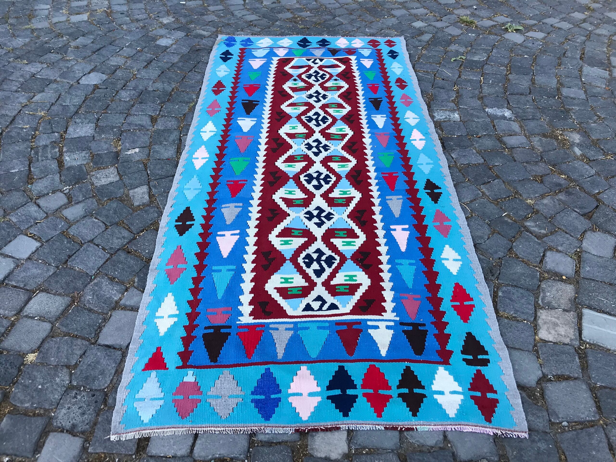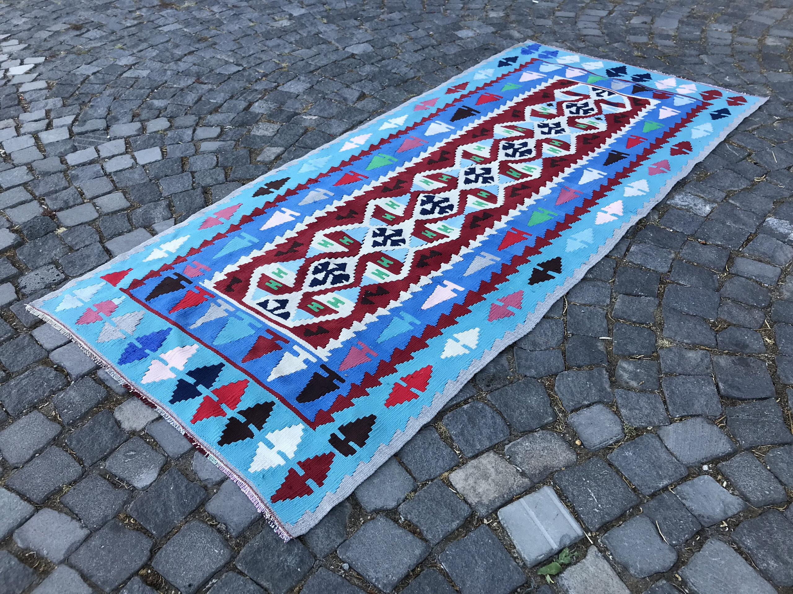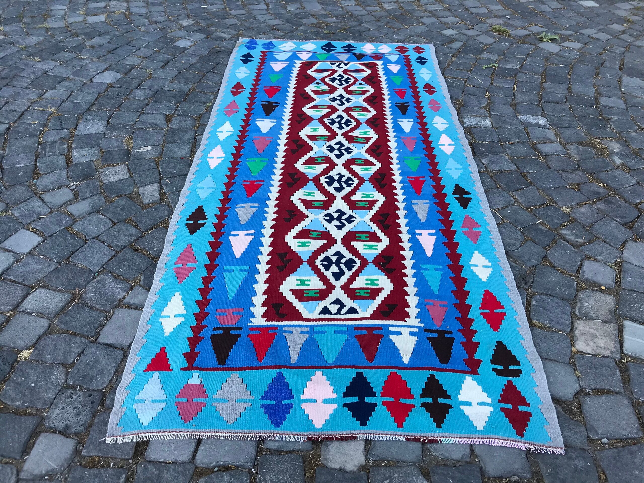 This is a vintage kilim rug hand-woven in a small village in Turkey by skilled Anatolian women during around the 1990s. It is made from natural wool (sheep) and dyed using all-natural (vegetable) dyes. Natural materials are more durable than synthetic materials guaranteeing a rug that can last for years while natural dyes provide colors that gets more beautiful as years pass by especially when in direct sunlight.