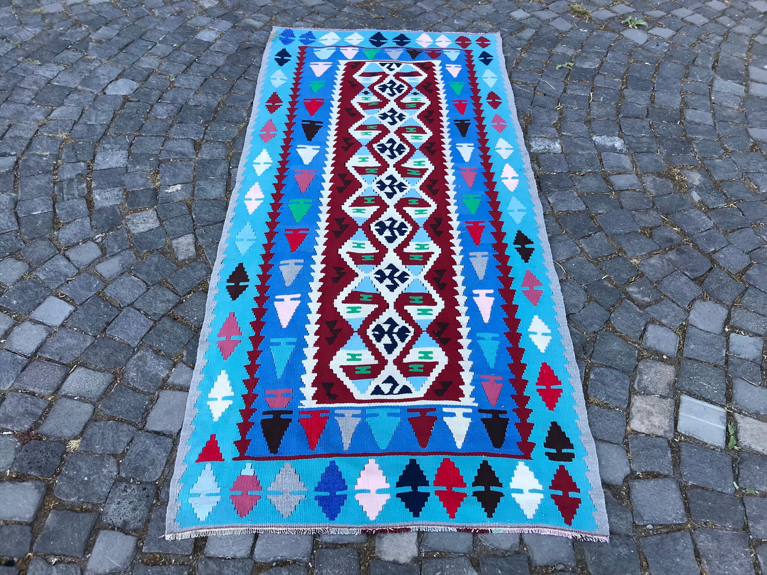 Beautiful and one-of-a-kind 3.4 ft. x 7.4 ft. (103 cm x 225 cm) vintage kilim rug hand-woven in Turkey from organic wool. This is an authentic vintage kilim rug from the 1990s that has worn admirably to perfection.
