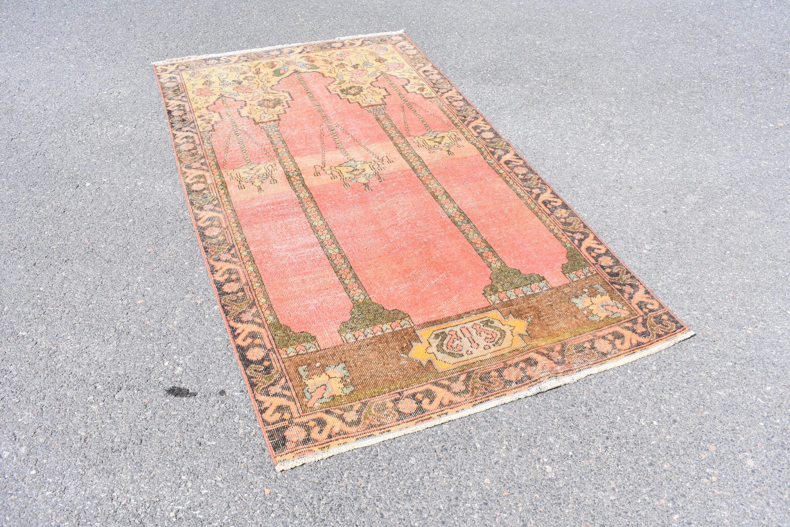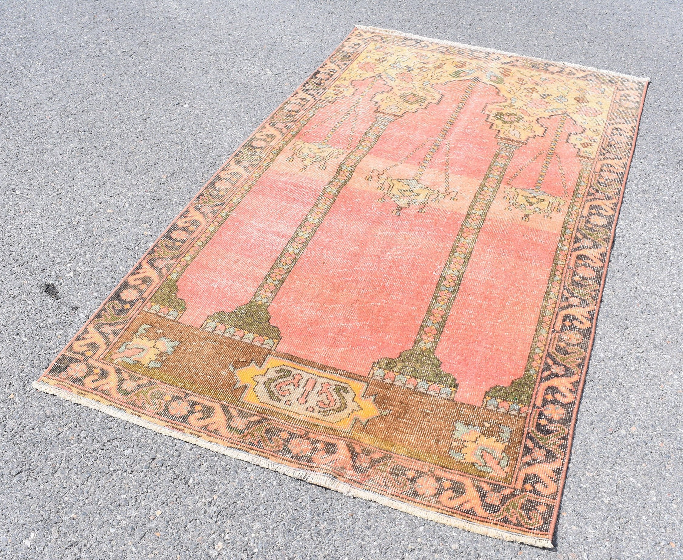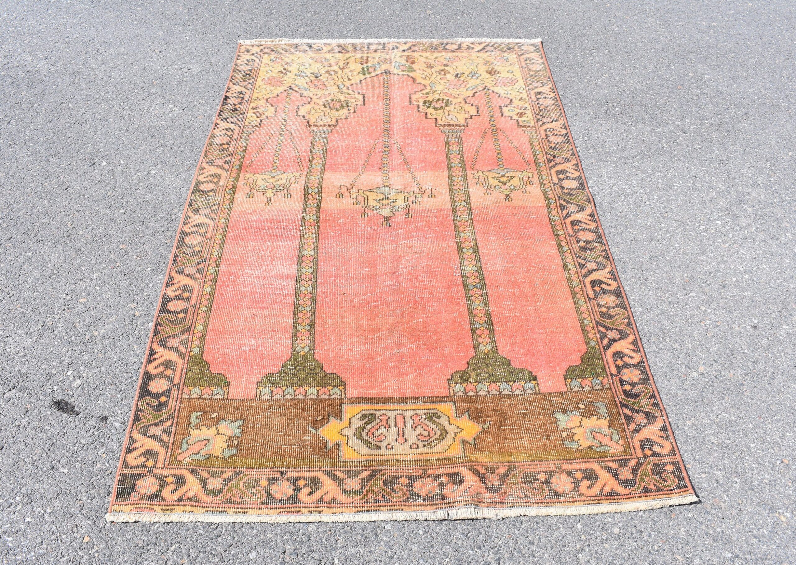 This is a vintage Turkish rug hand-knotted in a small village in Turkey by skilled Anatolian women during around the 1970s. It is made from natural wool (sheep) and dyed using all-natural (vegetable) dyes. Natural materials are more durable than synthetic materials guaranteeing a rug that can last for years while natural dyes provide colors that gets more beautiful as years pass by especially when in direct sunlight.