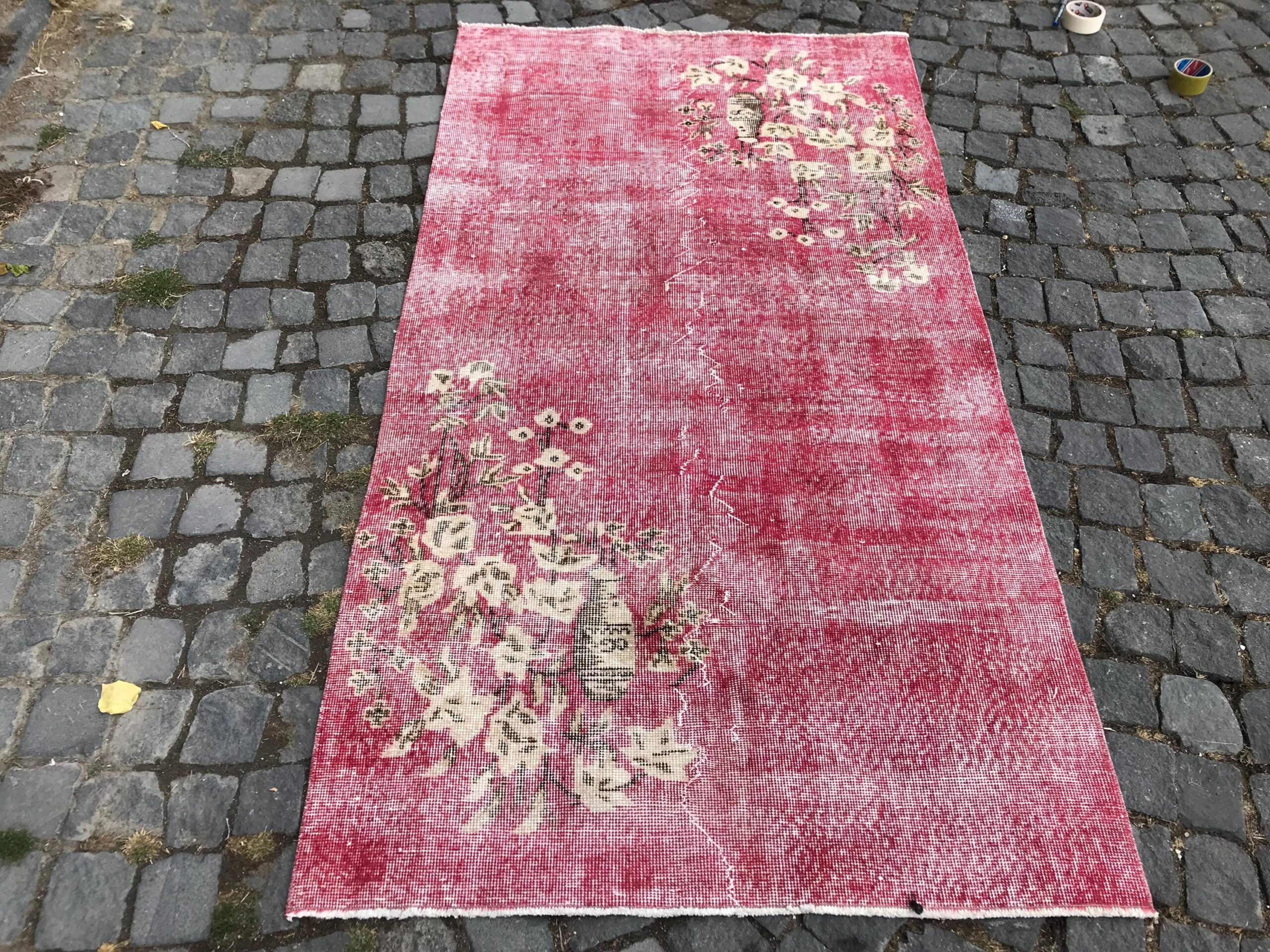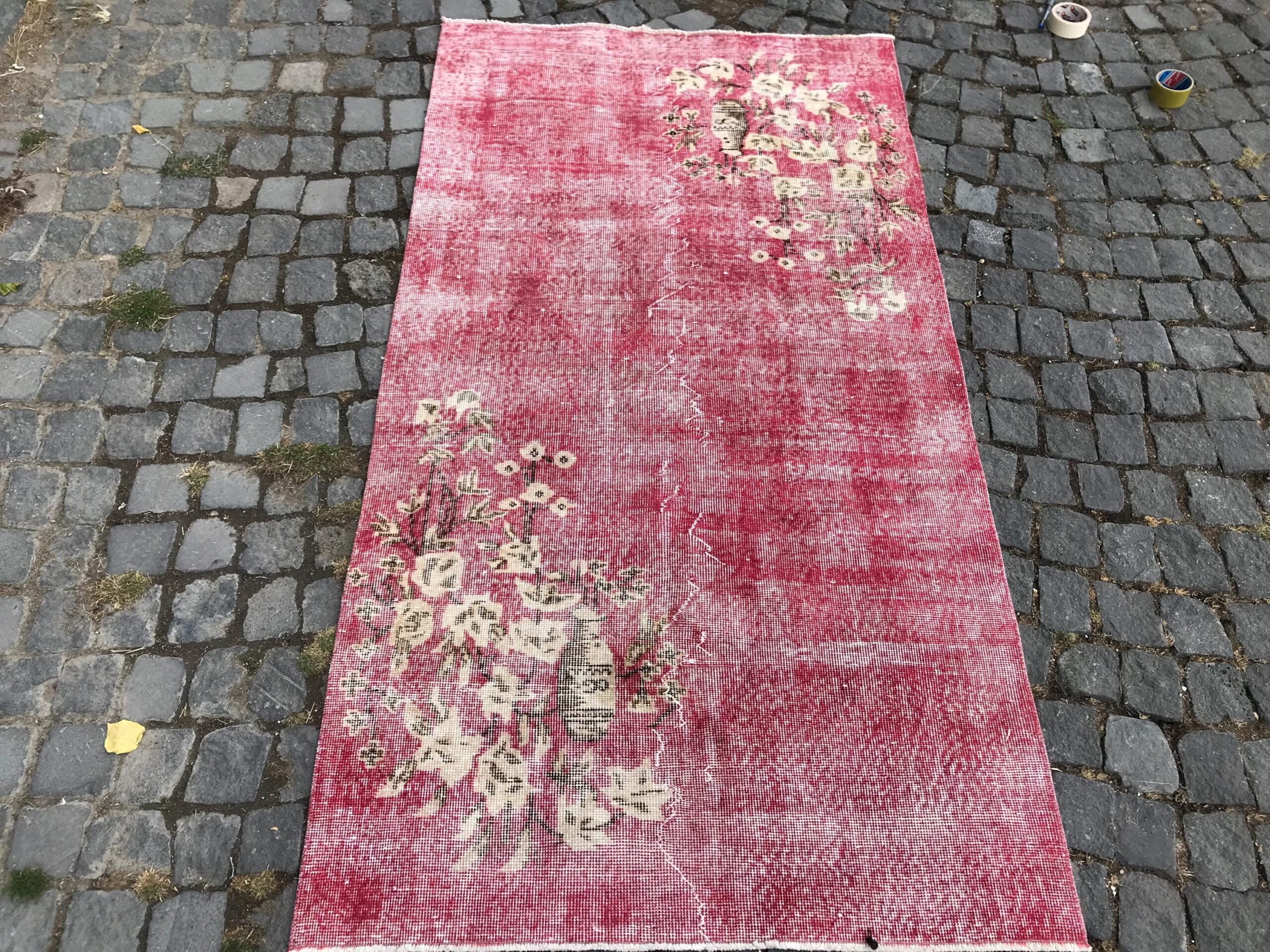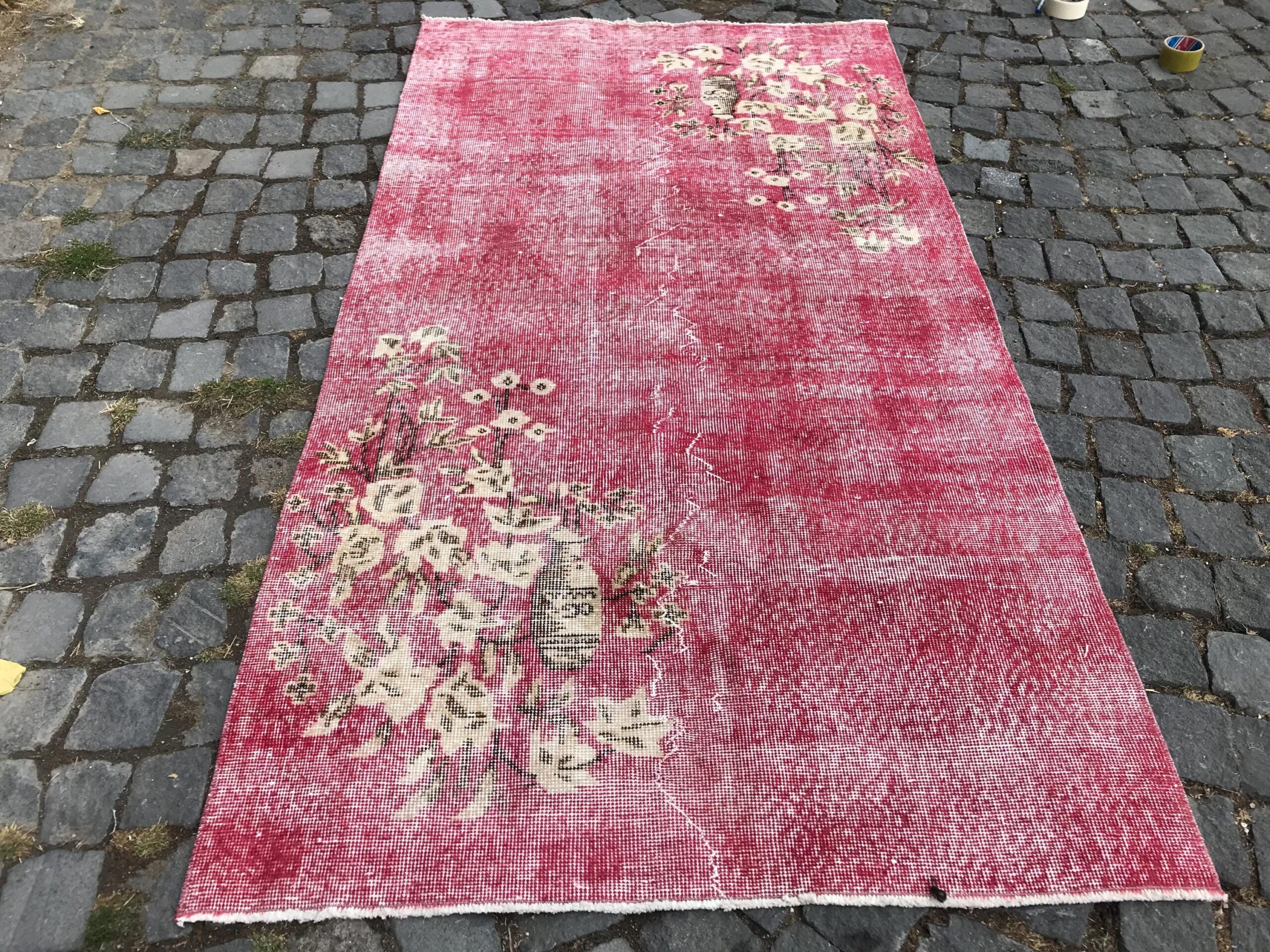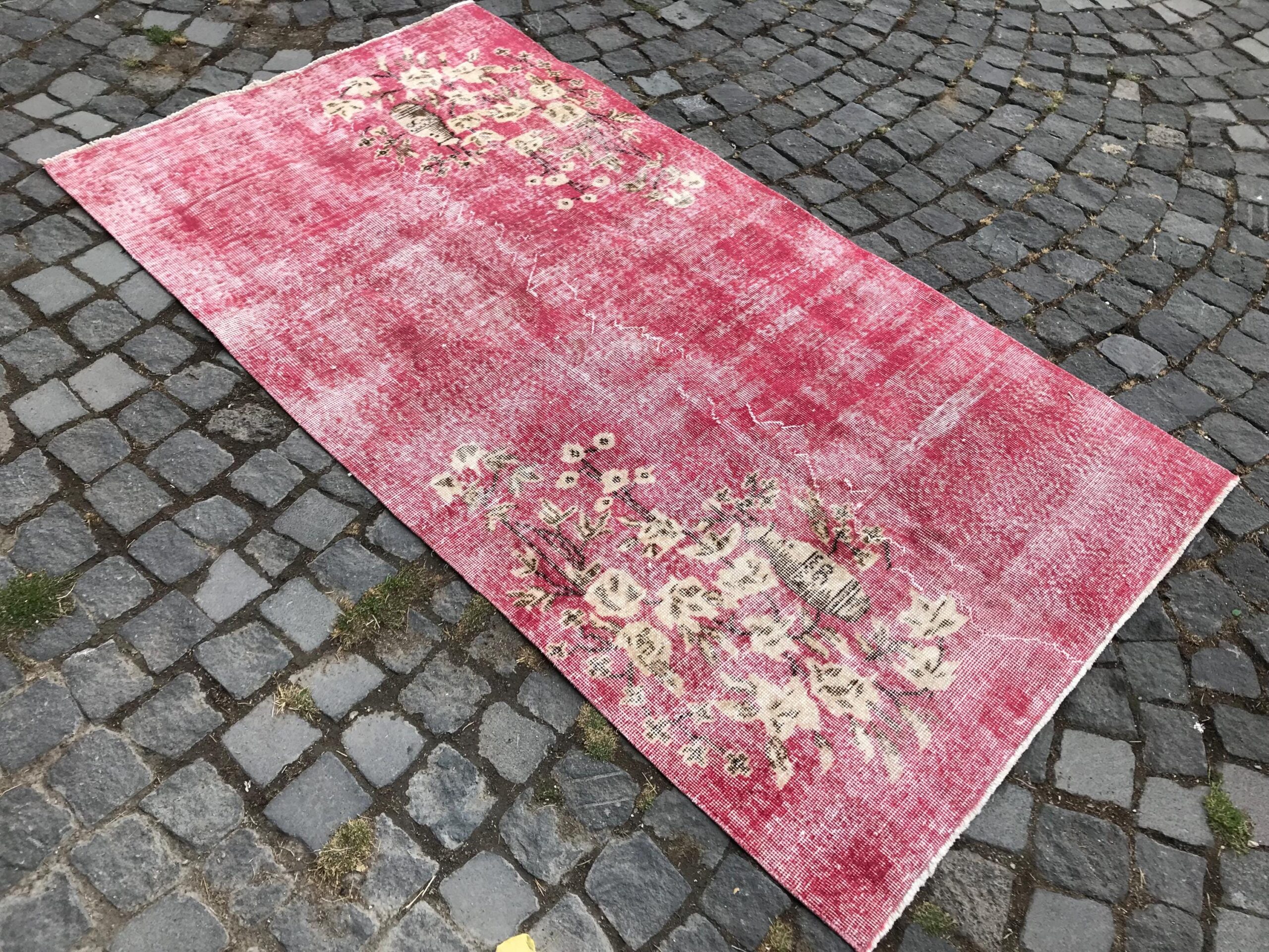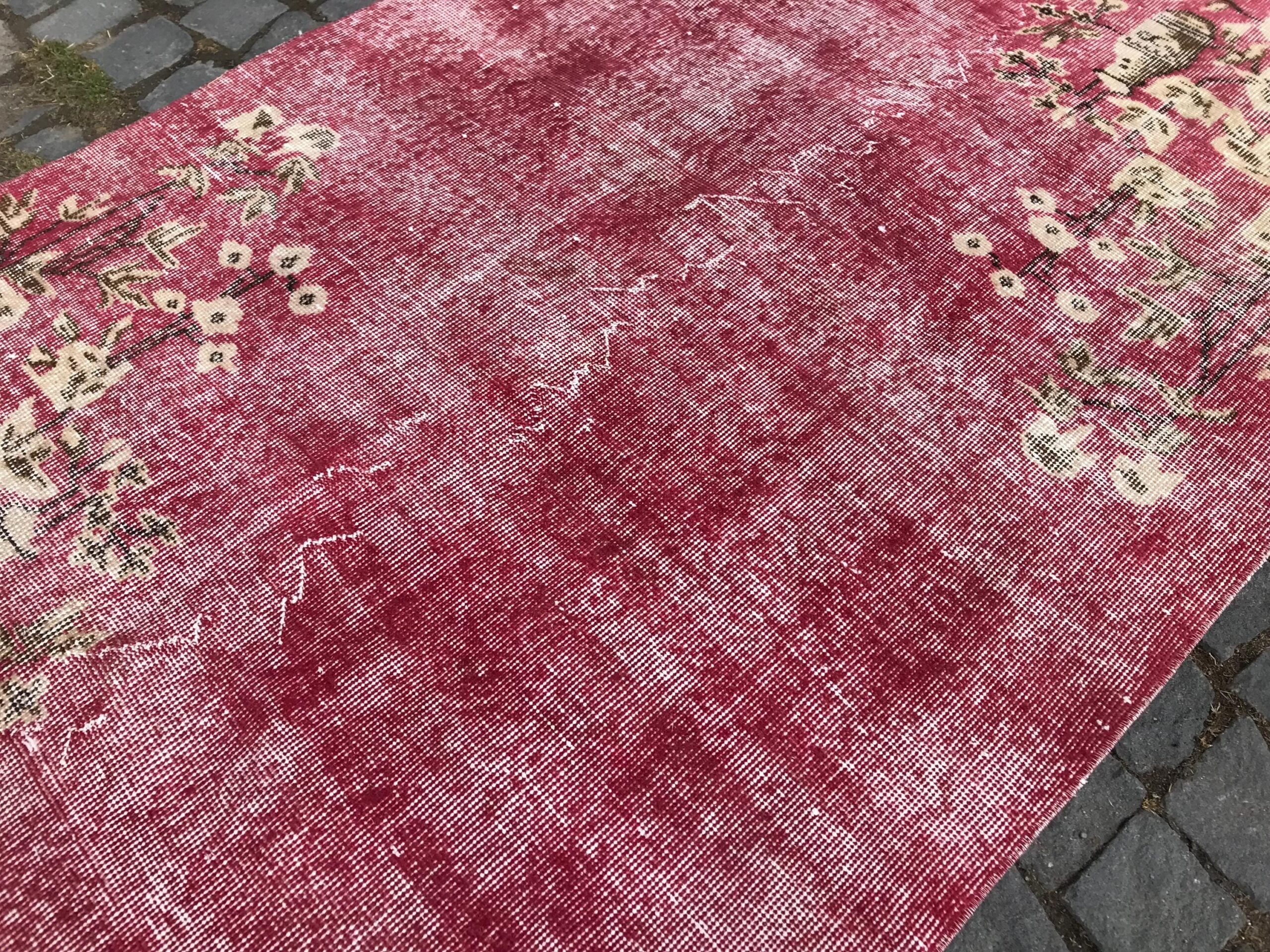 This is a vintage overdyed rug made through over-dyeing an authentic vintage Turkish rug using natural (vegetable) dyes. This rug originated in a small village in Turkey where it was hand-knotted from natural wool (sheep) by skilled Anatolian women during around the 1980s. Natural materials are more durable than synthetic materials guaranteeing a rug that can last for years while natural dyes provide colors that gets more beautiful as years pass by especially when in direct sunlight.