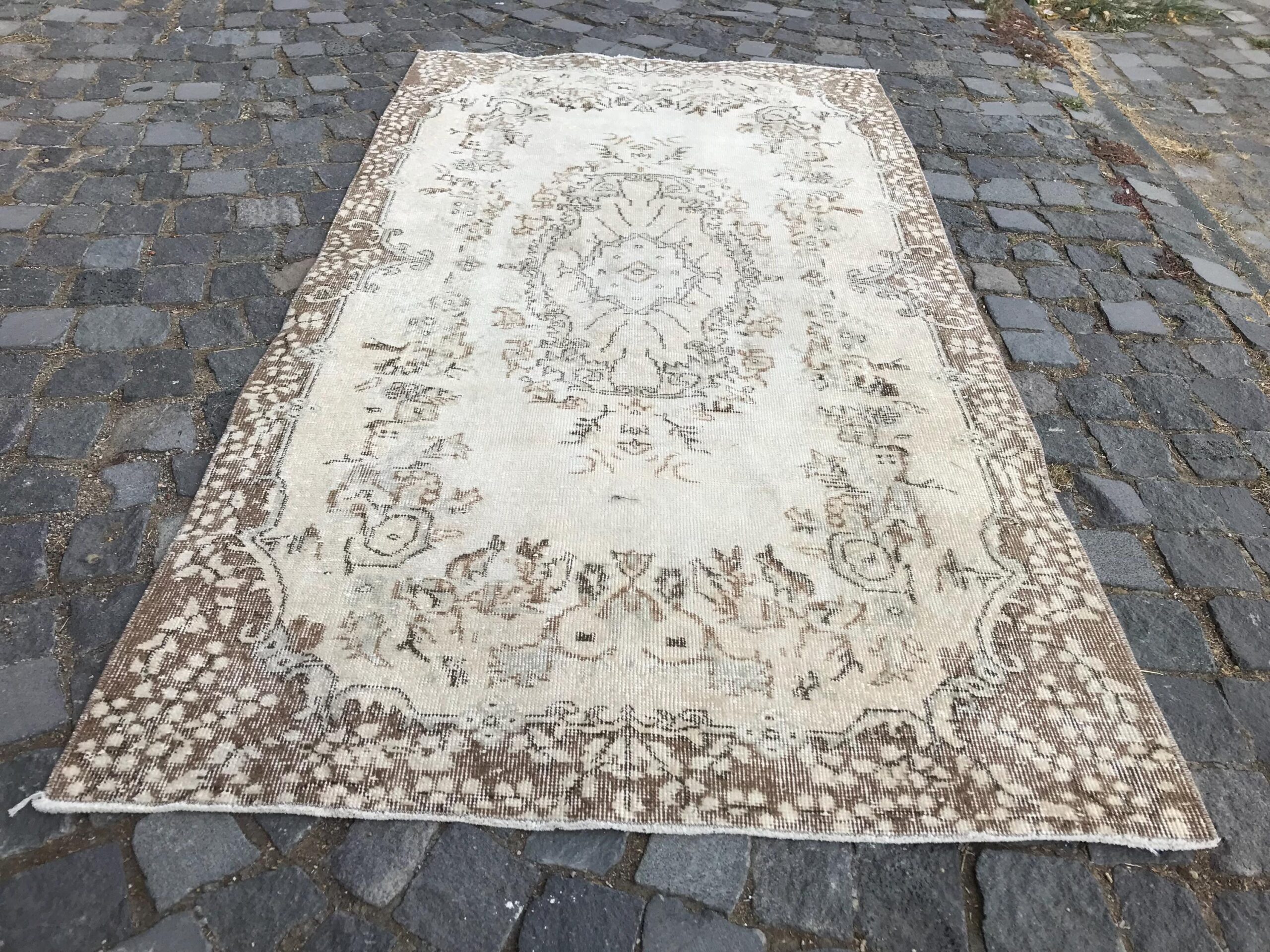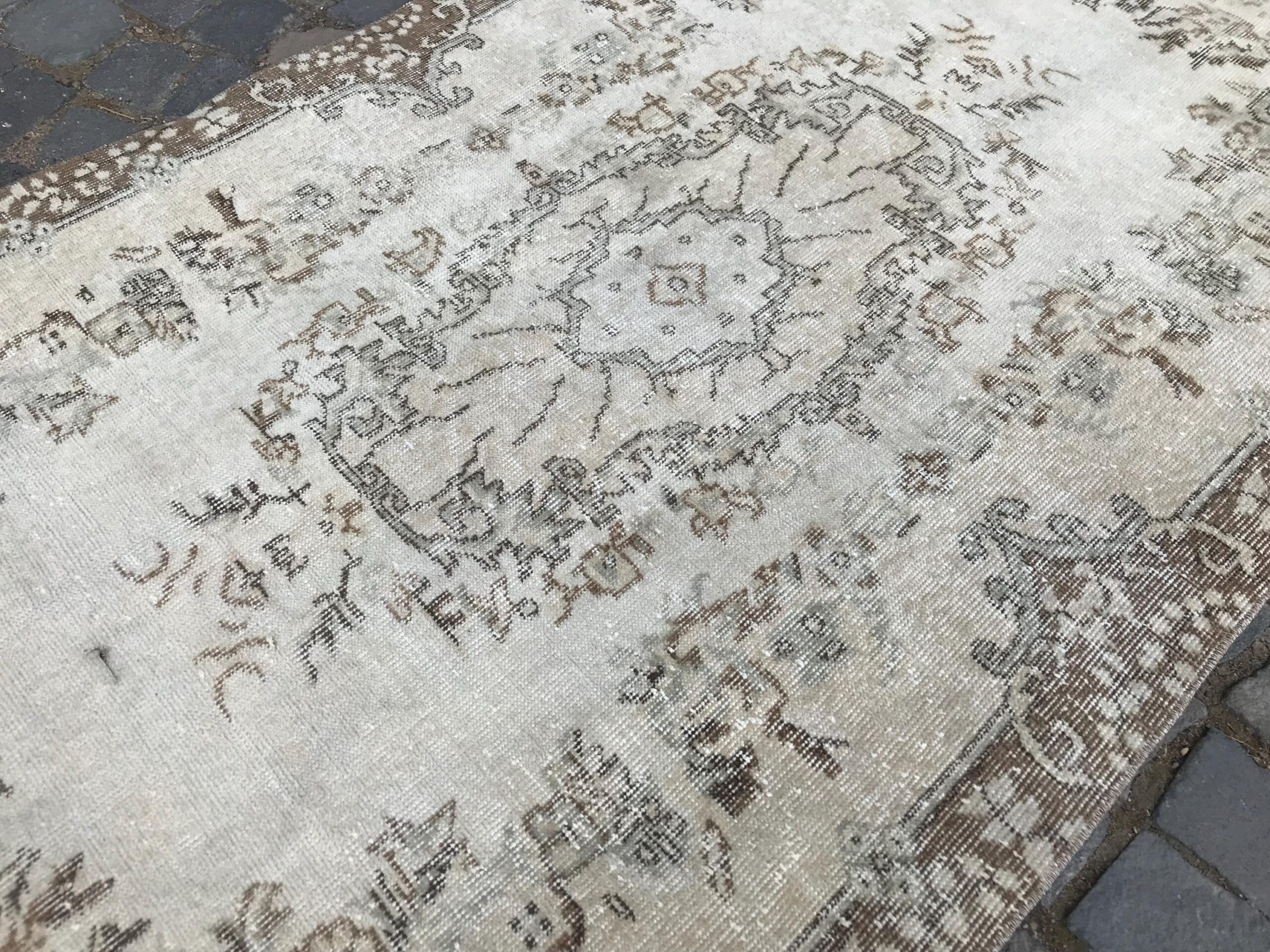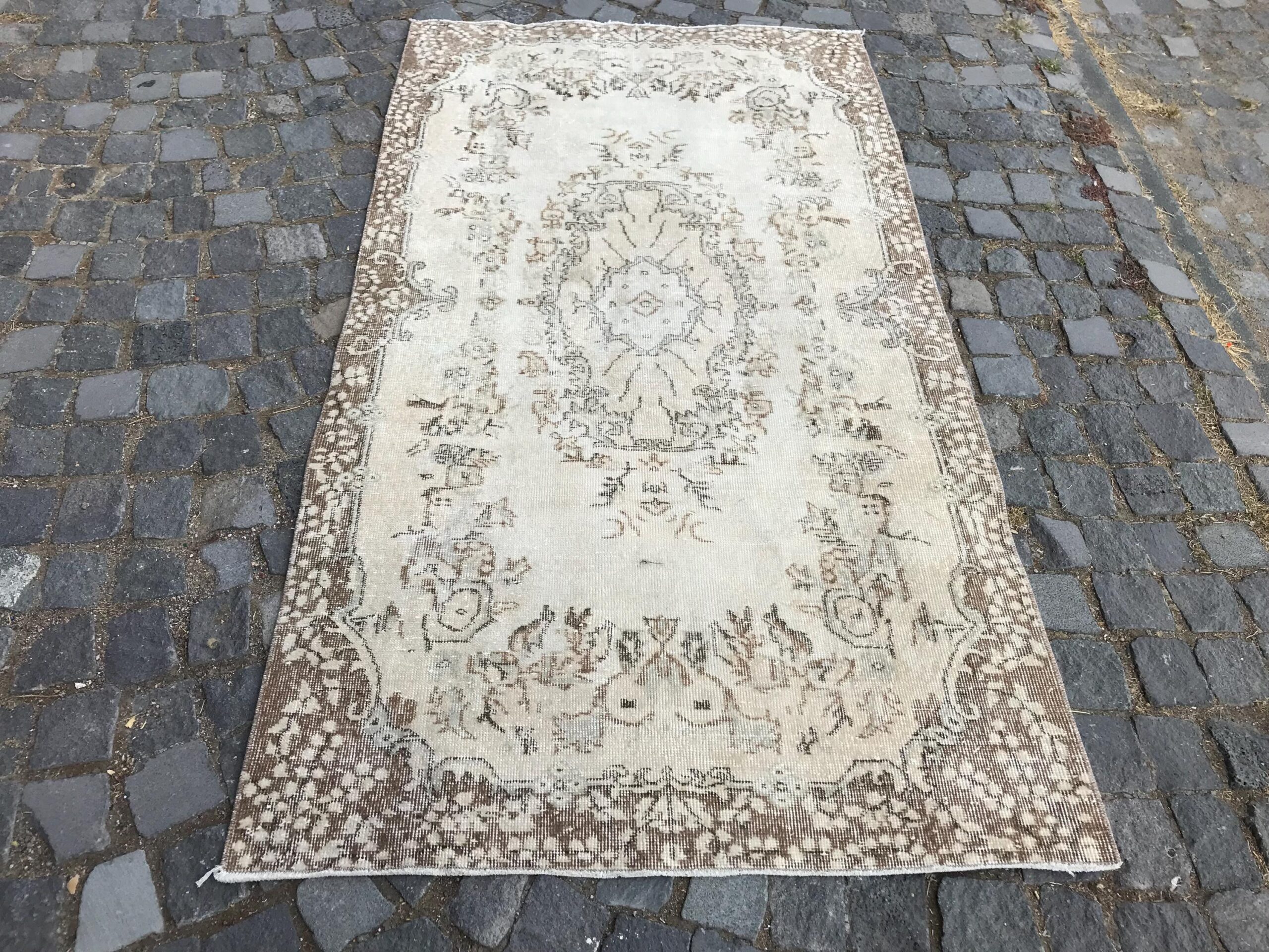 Pretty and one-of-a-kind 3.6 ft. x 6.8 ft. (111 cm x 206 cm) vintage Turkish rug hand-knotted in Turkey from organic wool. This is an authentic vintage Turkish rug from the 1980s that has worn splendidly to perfection.