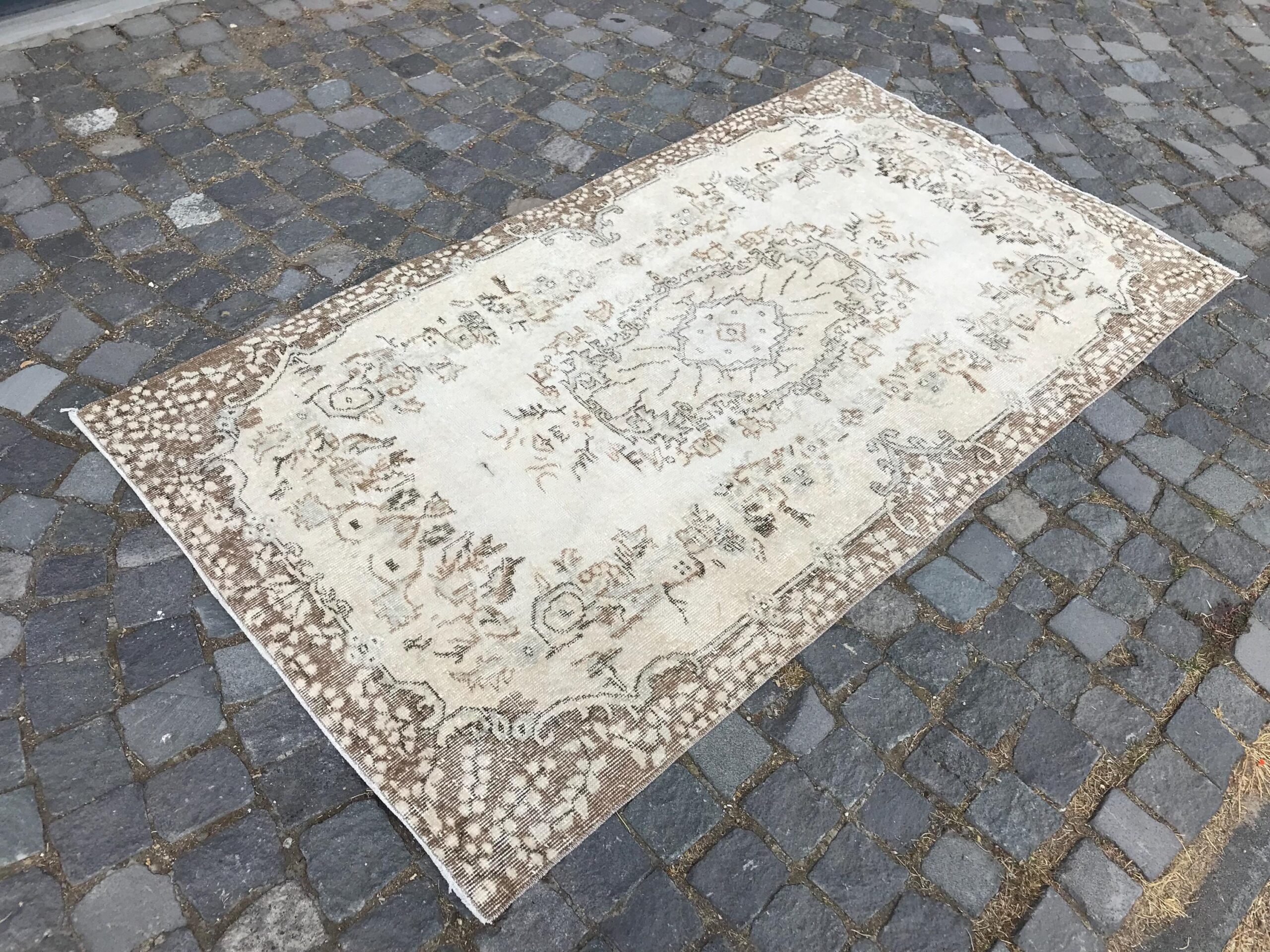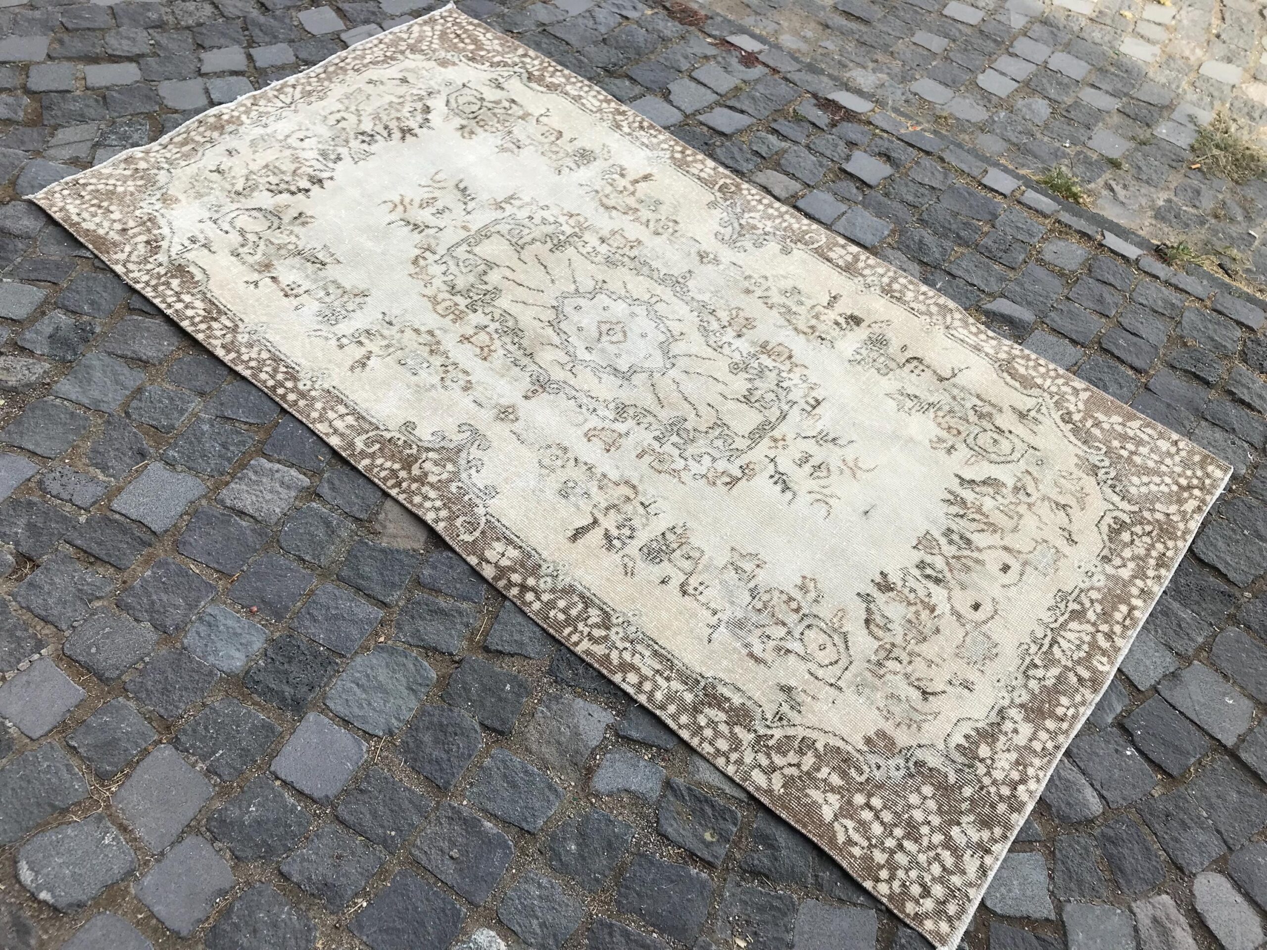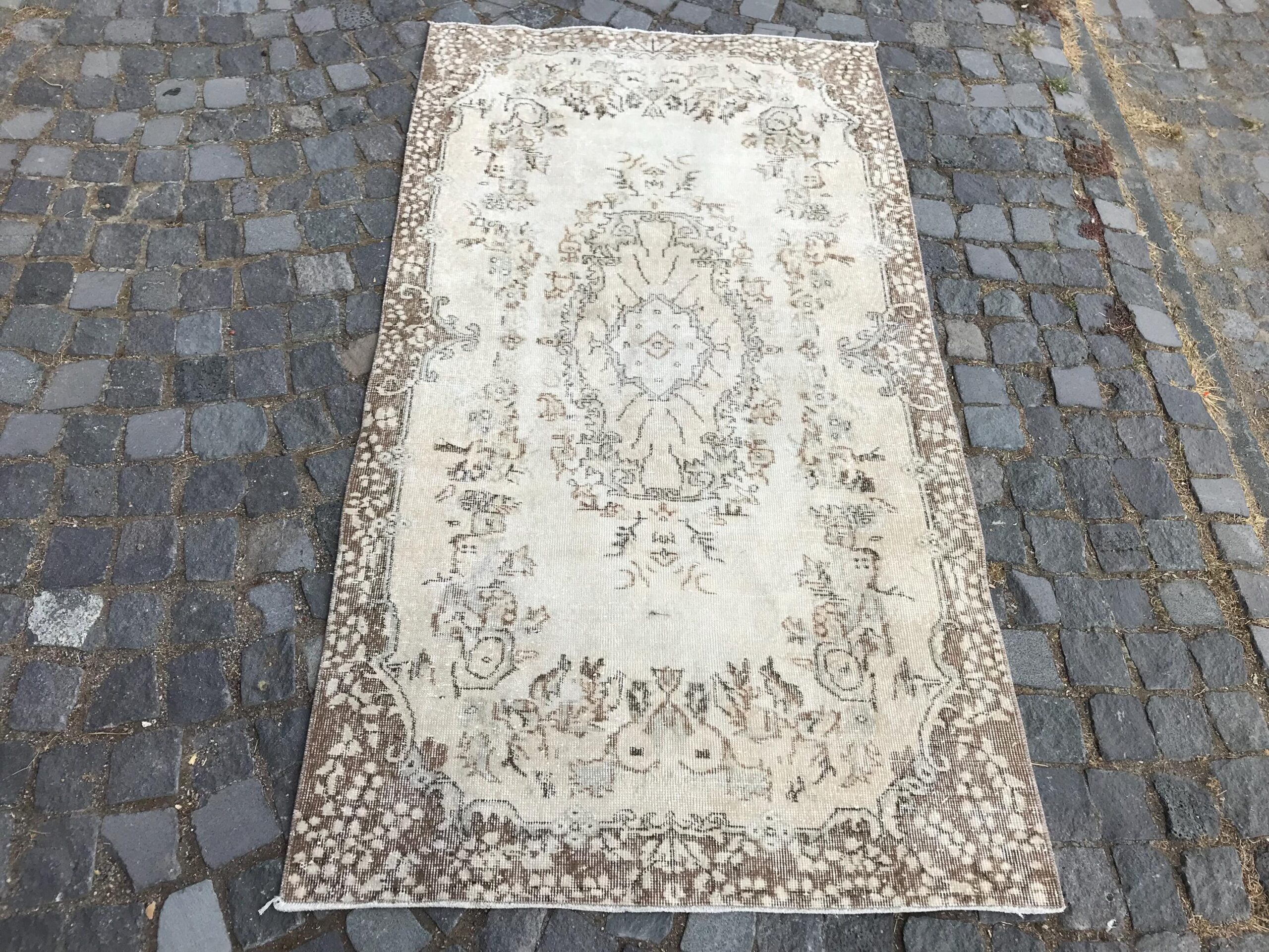 Pretty and one-of-a-kind 3.6 ft. x 6.8 ft. (111 cm x 206 cm) vintage Turkish rug hand-knotted in Turkey from organic wool. This is an authentic vintage Turkish rug from the 1980s that has worn splendidly to perfection.
