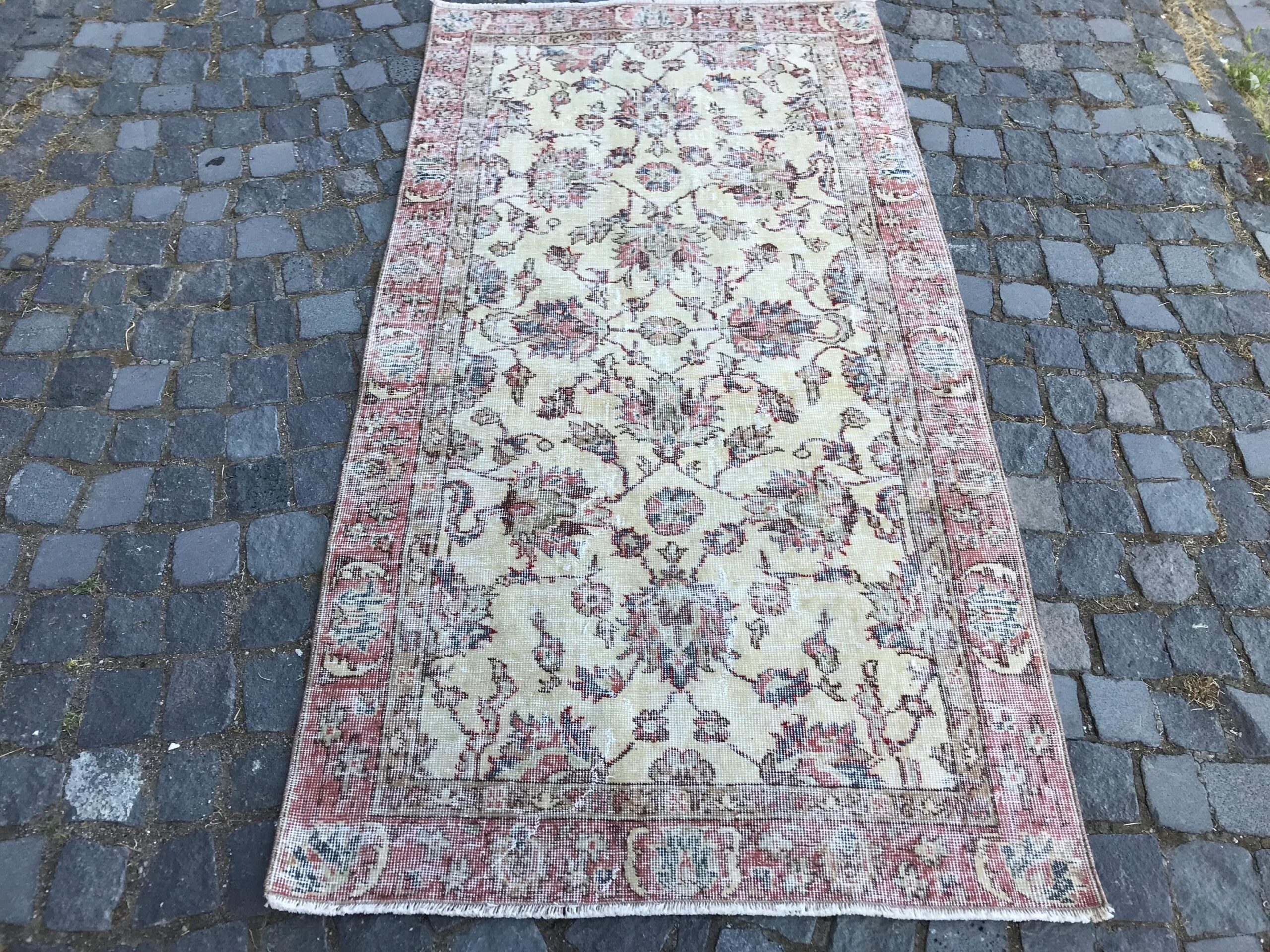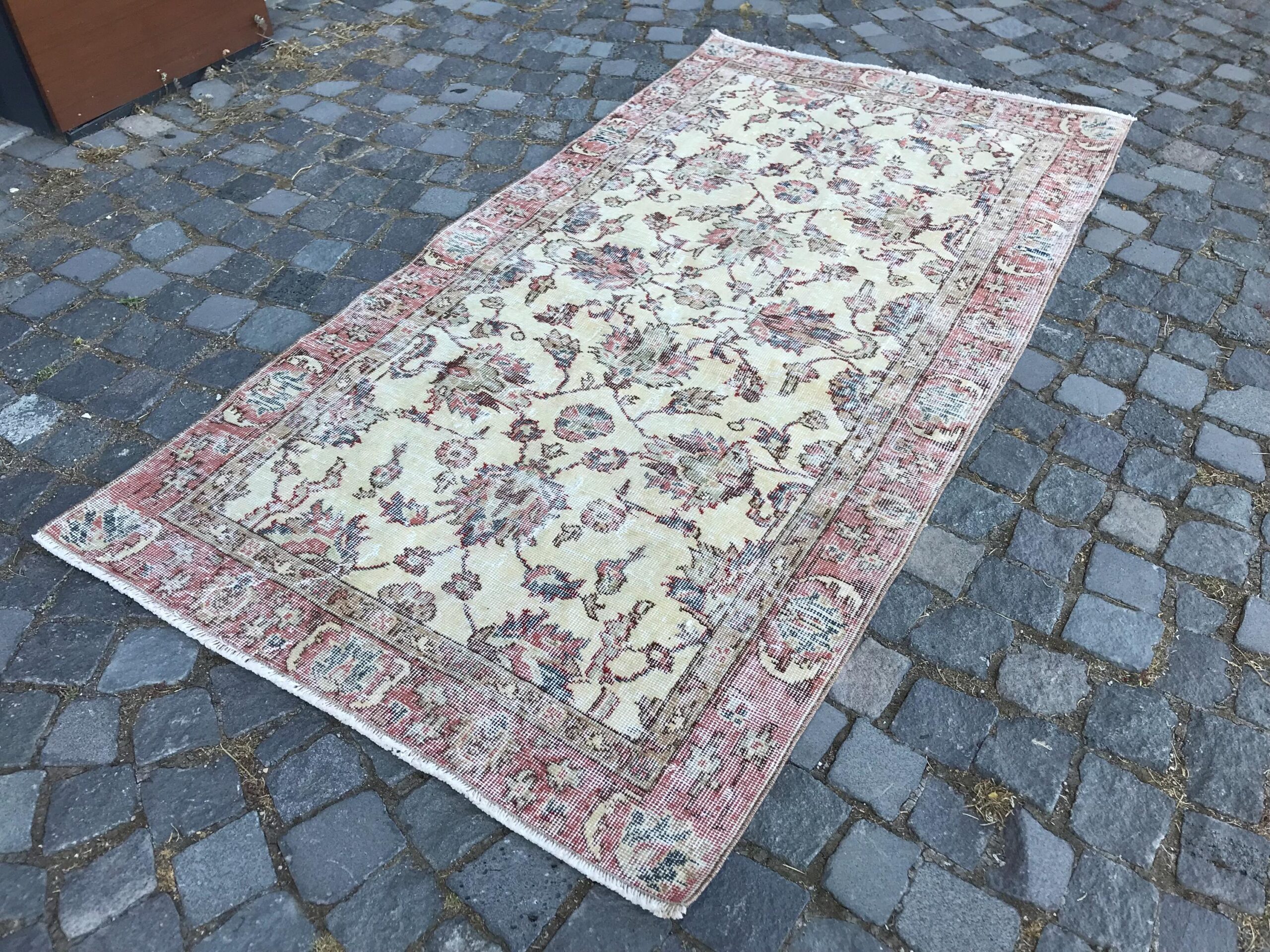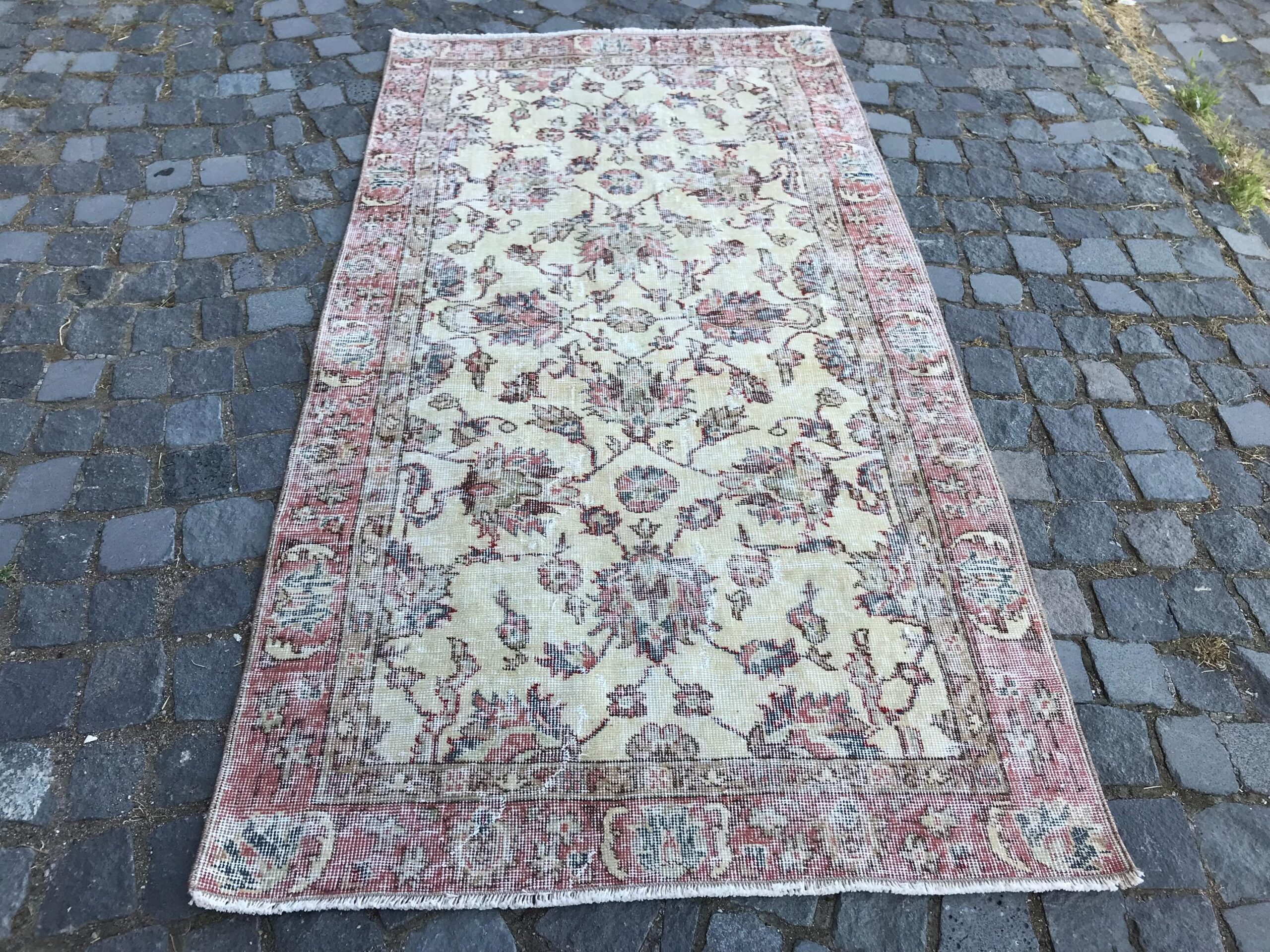 Lovely and unique 3.6 ft. x 6.8 ft. (110 cm x 208 cm) vintage Turkish rug hand-knotted in Turkey from organic wool. This is an authentic vintage Turkish rug from the 1980s that has worn beautifully to perfection.