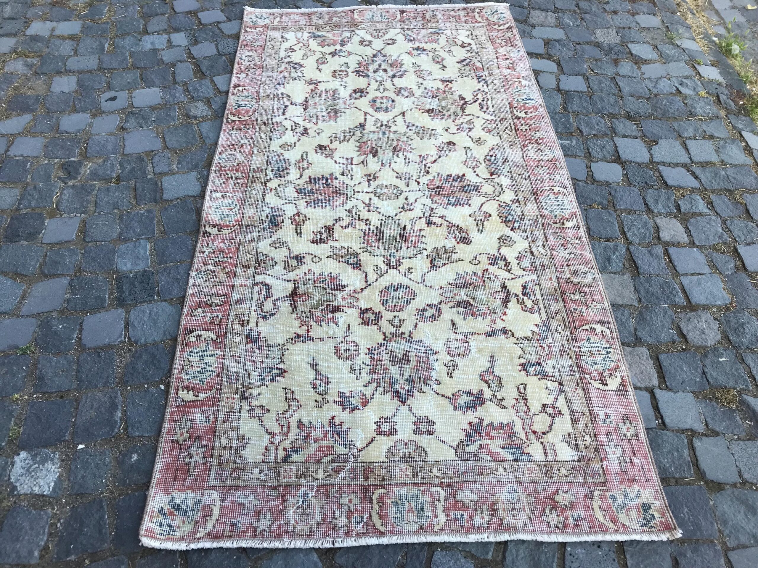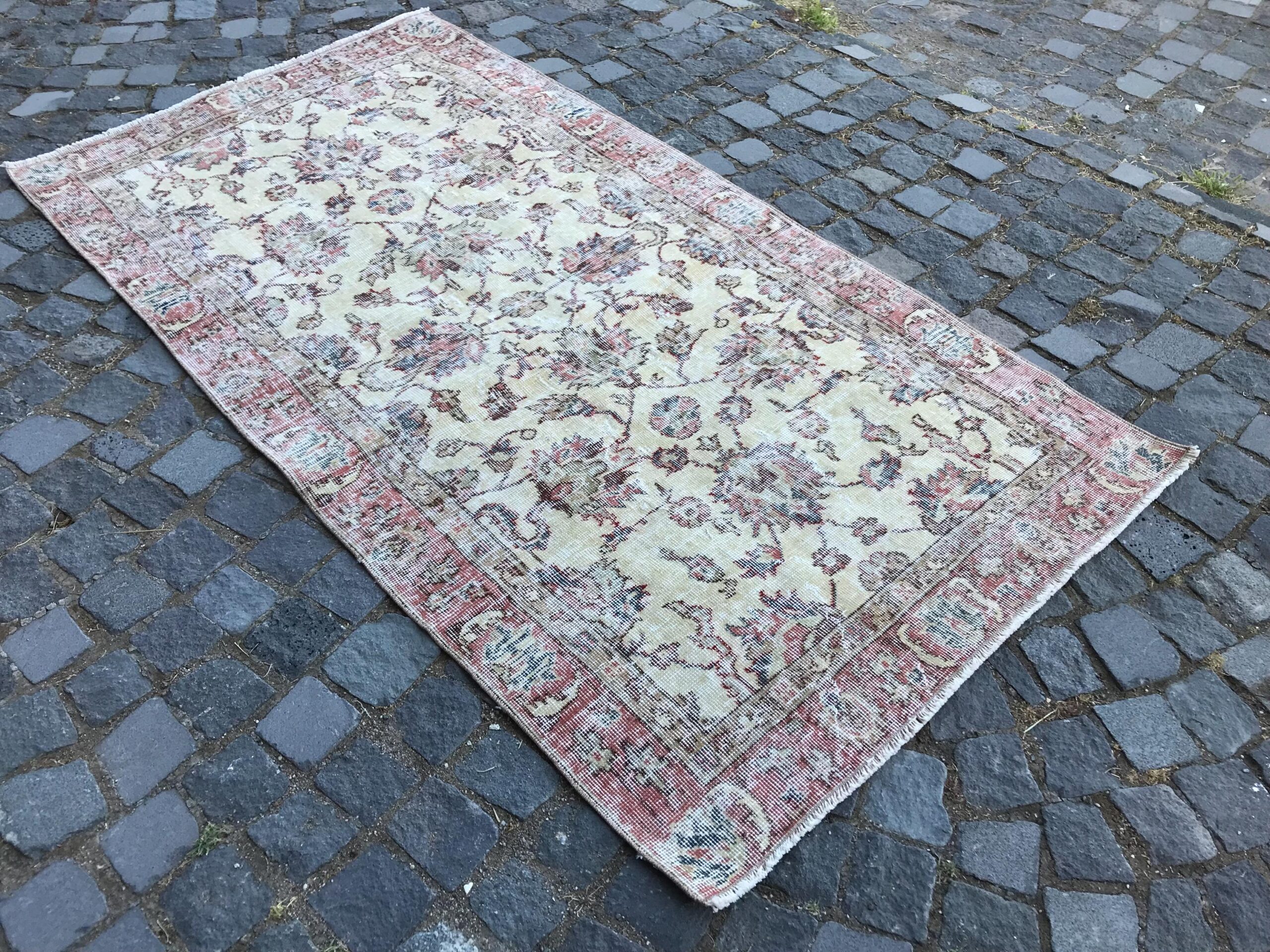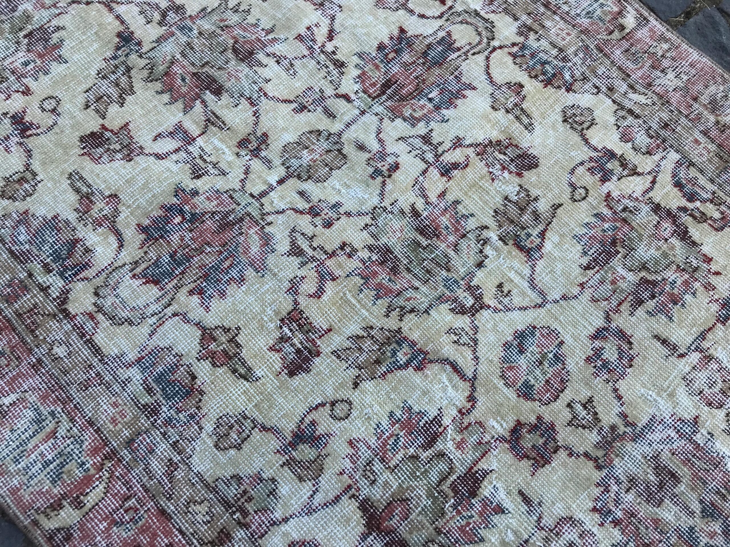 Lovely and unique 3.6 ft. x 6.8 ft. (110 cm x 208 cm) vintage Turkish rug hand-knotted in Turkey from organic wool. This is an authentic vintage Turkish rug from the 1980s that has worn beautifully to perfection.