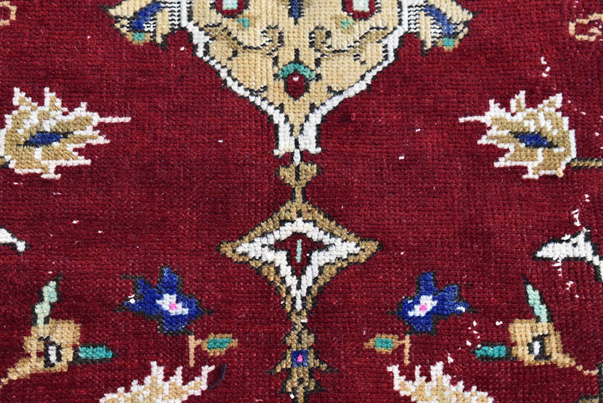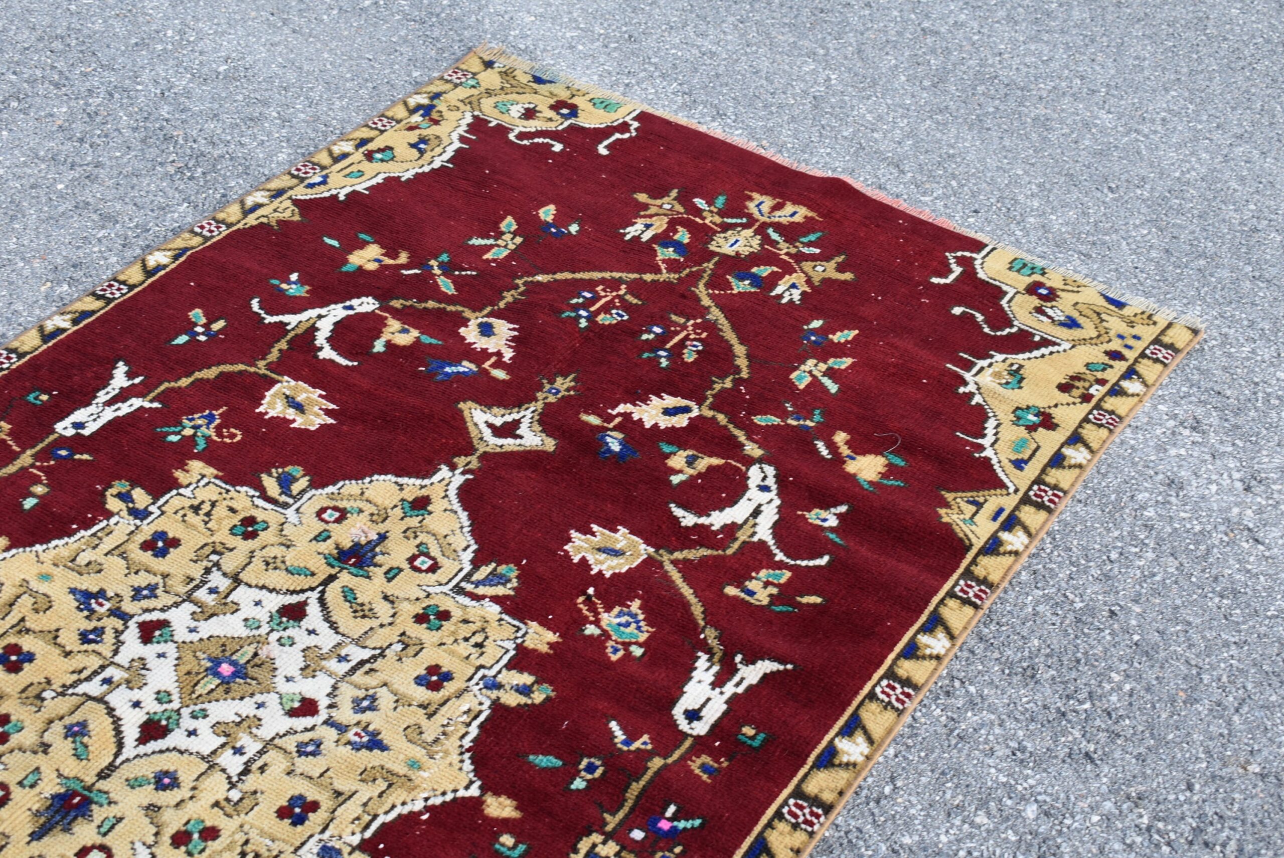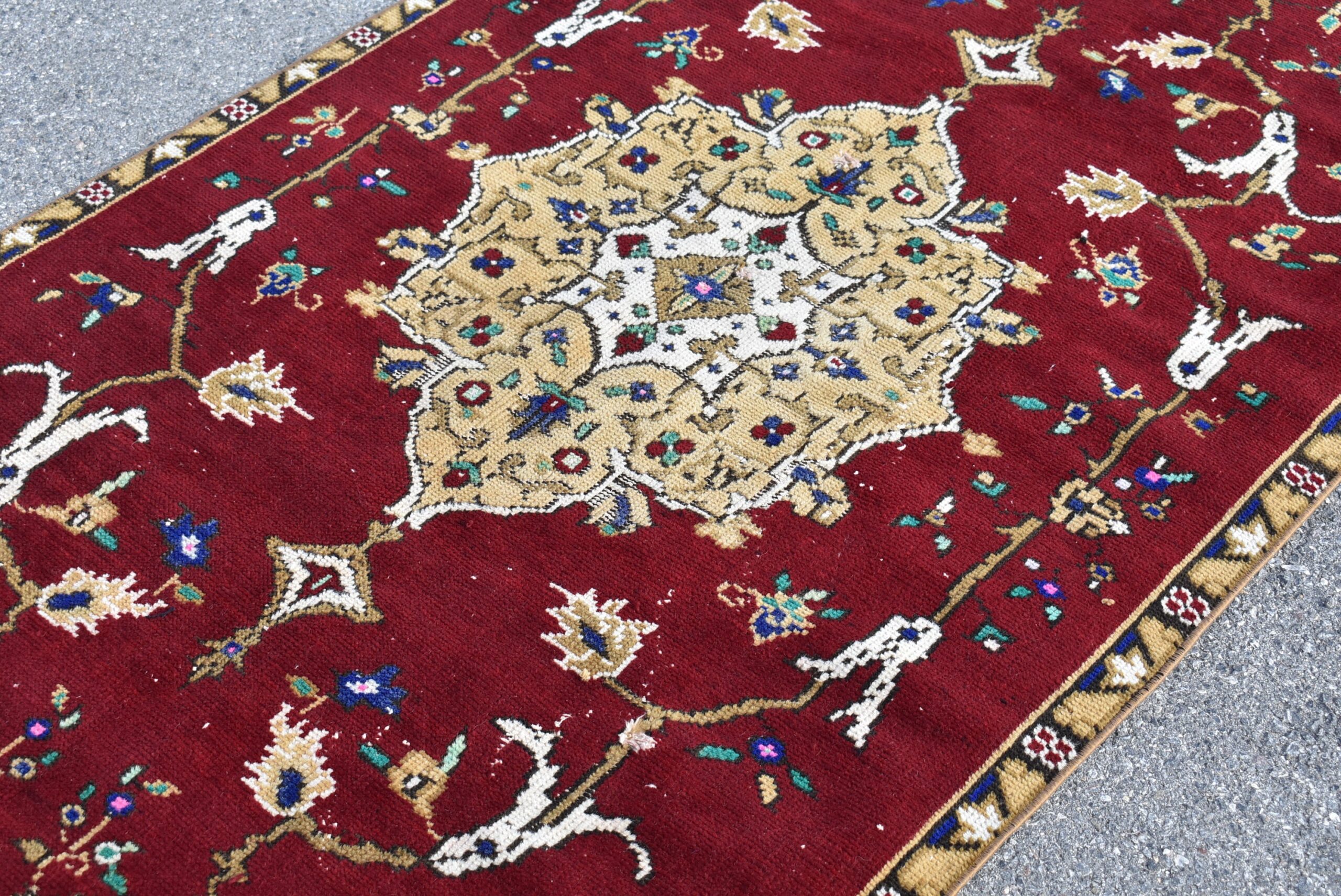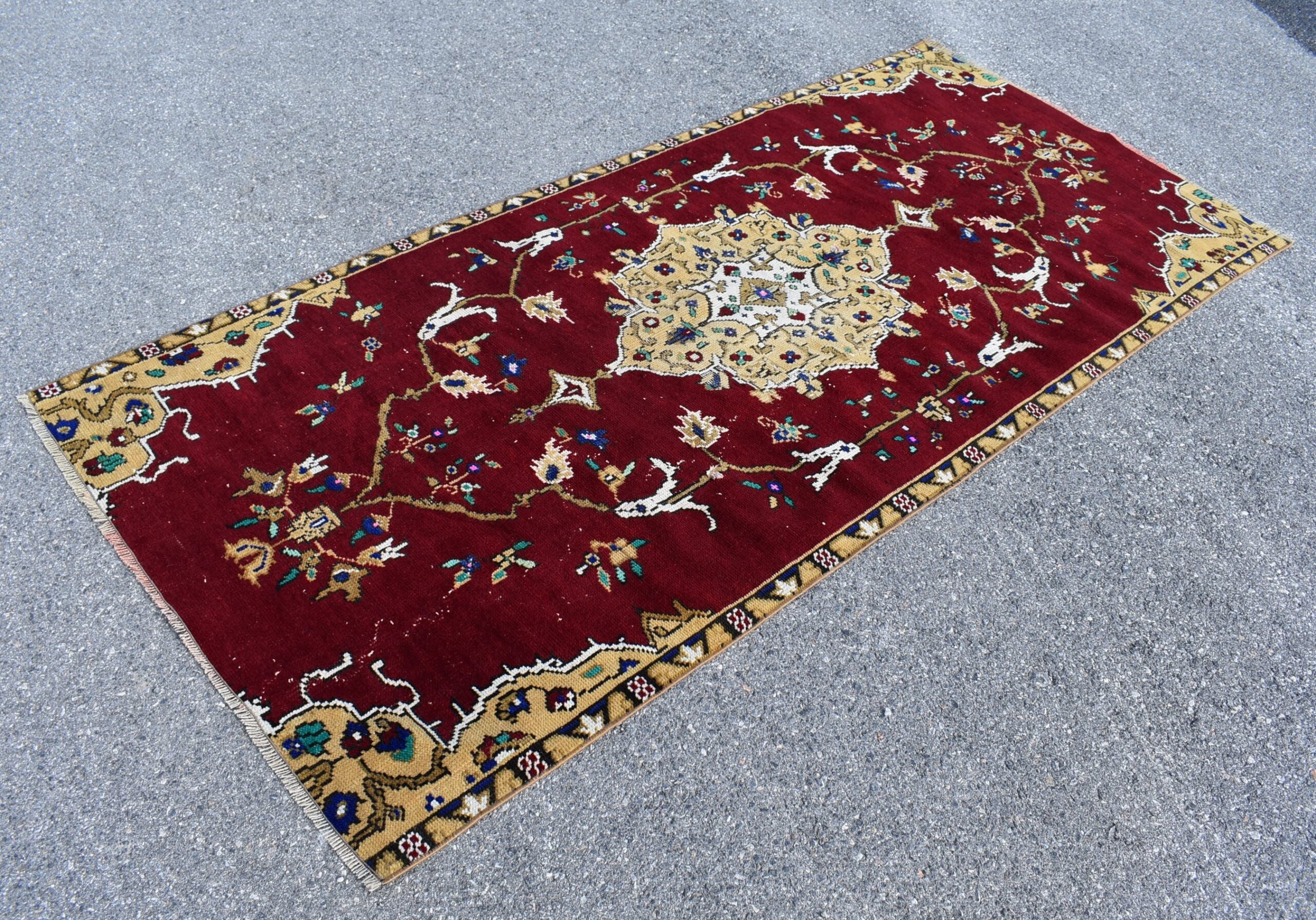 This is a vintage Turkish rug hand-knotted in a small village in Turkey by skilled Anatolian women during around the 1990s. It is made from natural wool (sheep) and dyed using all-natural (vegetable) dyes. Natural materials are more durable than synthetic materials guaranteeing a rug that can last for years while natural dyes provide colors that gets more beautiful as years pass by especially when in direct sunlight.