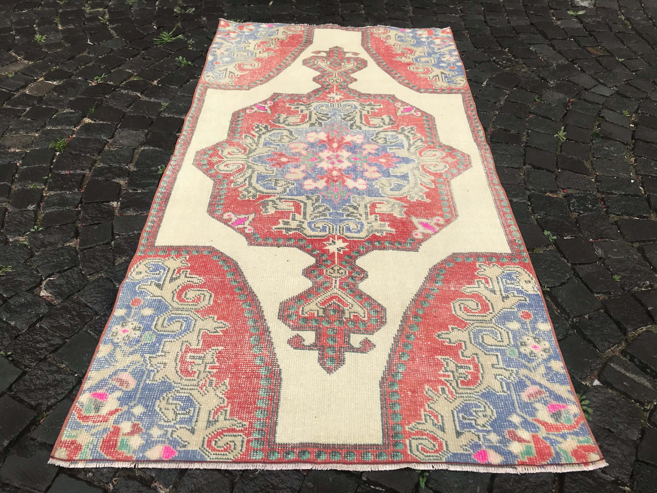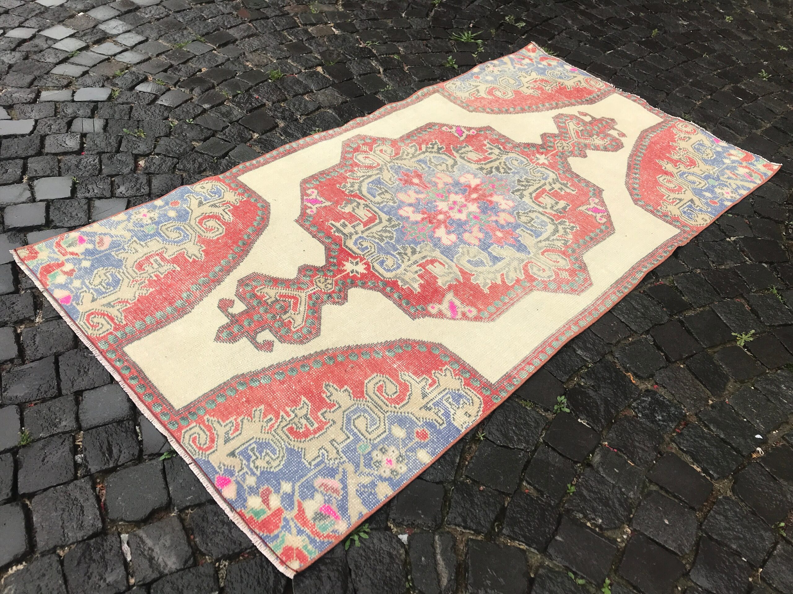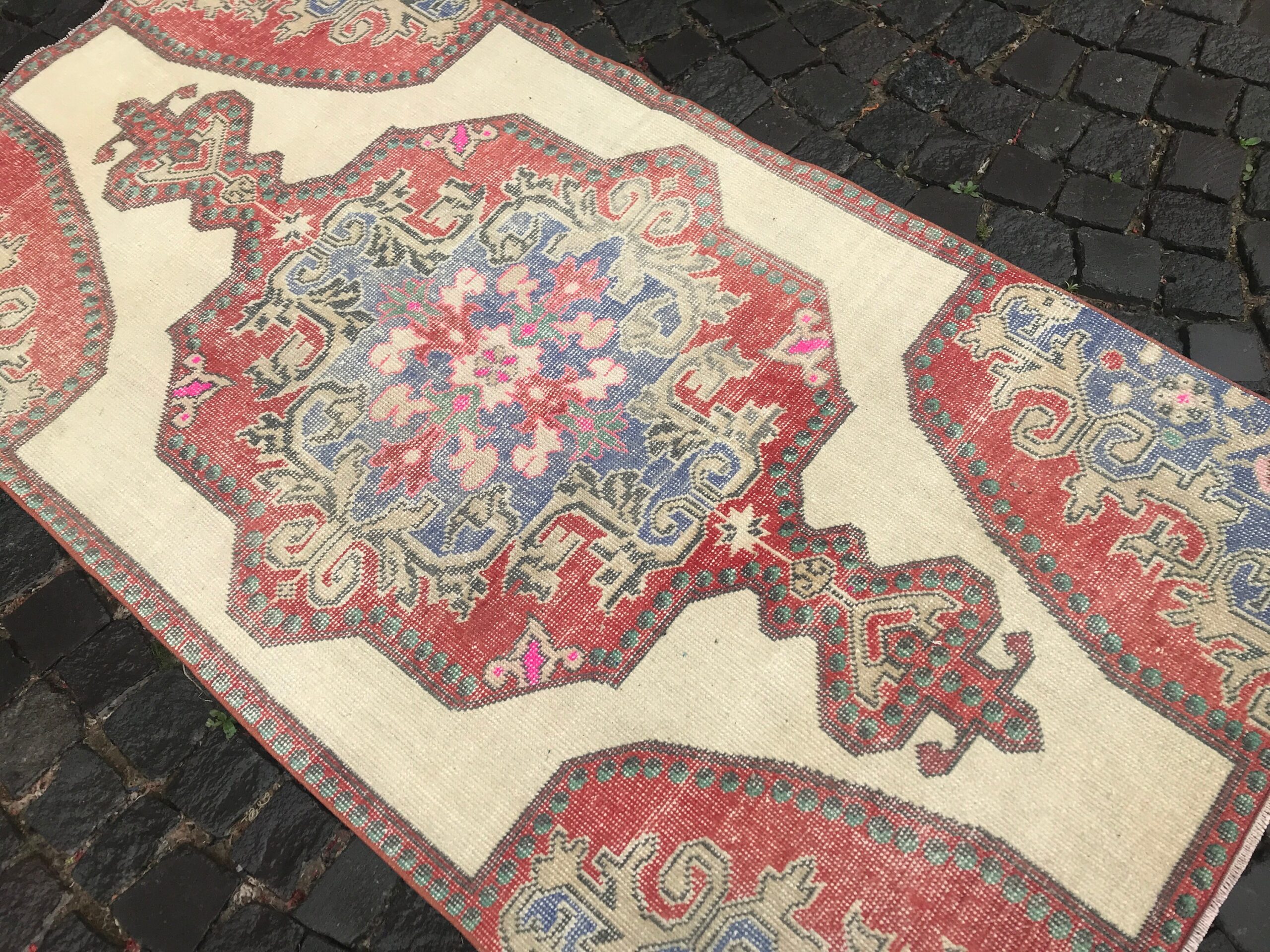 This is a vintage Turkish rug hand-knotted in a small village in Turkey by skilled Anatolian women during around the 1980s. It is made from natural wool (sheep) and dyed using all-natural (vegetable) dyes. Natural materials are more durable than synthetic materials guaranteeing a rug that can last for years while natural dyes provide colors that gets more beautiful as years pass by especially when in direct sunlight.