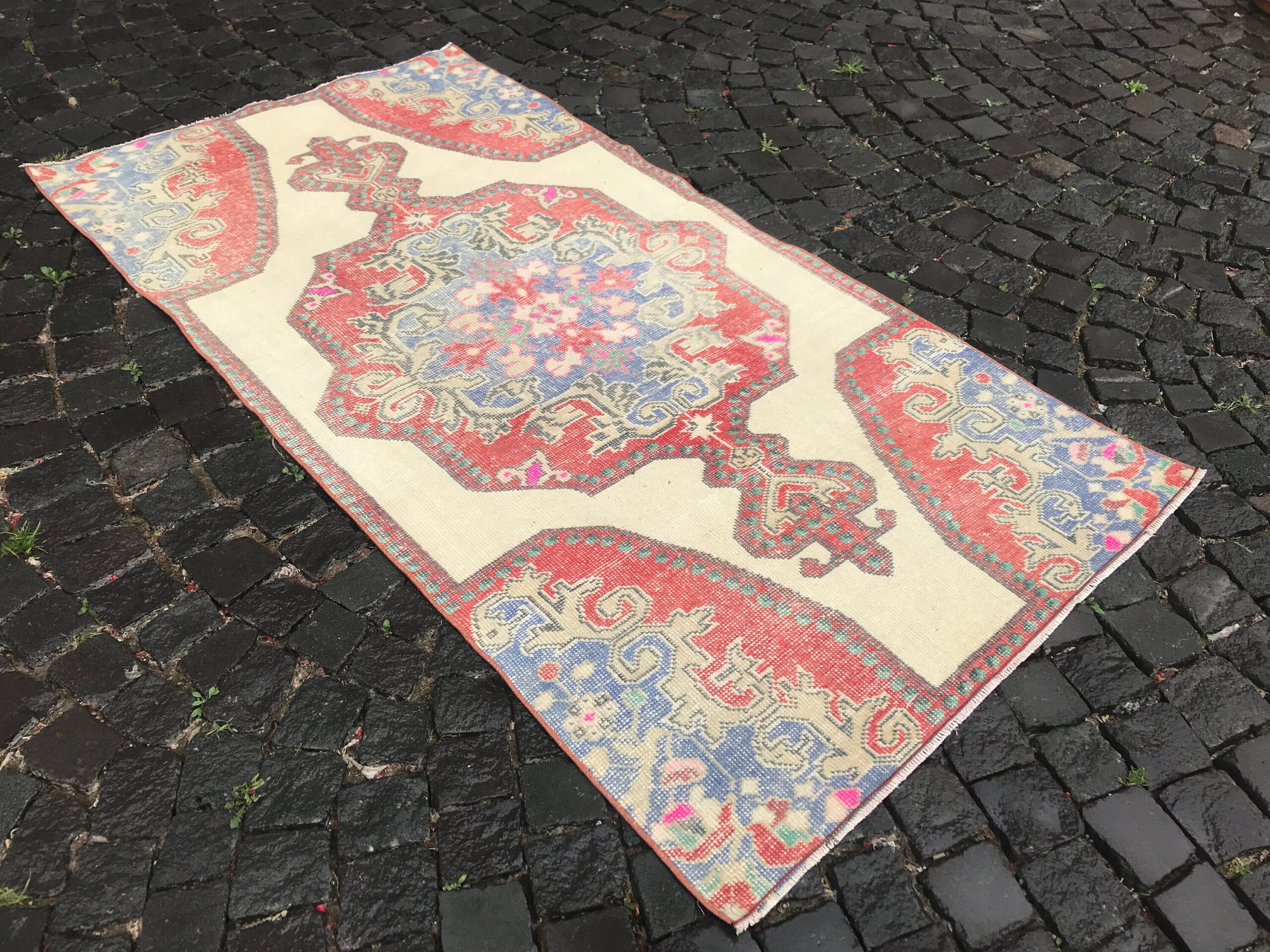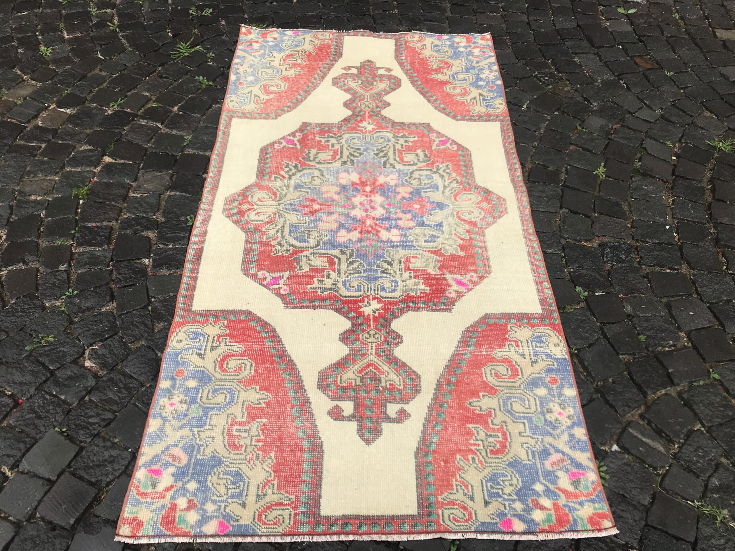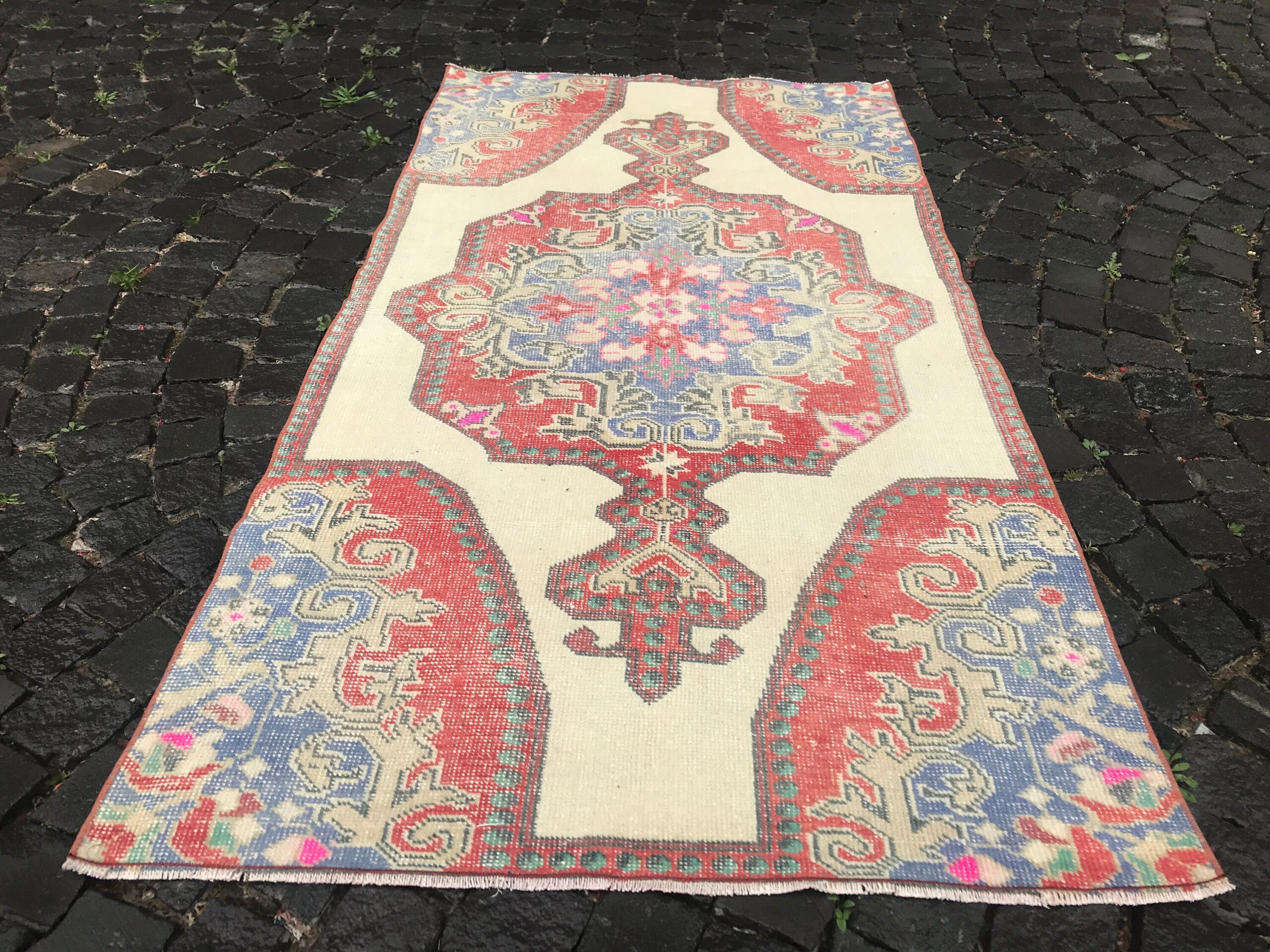 This is a vintage Turkish rug hand-knotted in a small village in Turkey by skilled Anatolian women during around the 1980s. It is made from natural wool (sheep) and dyed using all-natural (vegetable) dyes. Natural materials are more durable than synthetic materials guaranteeing a rug that can last for years while natural dyes provide colors that gets more beautiful as years pass by especially when in direct sunlight.