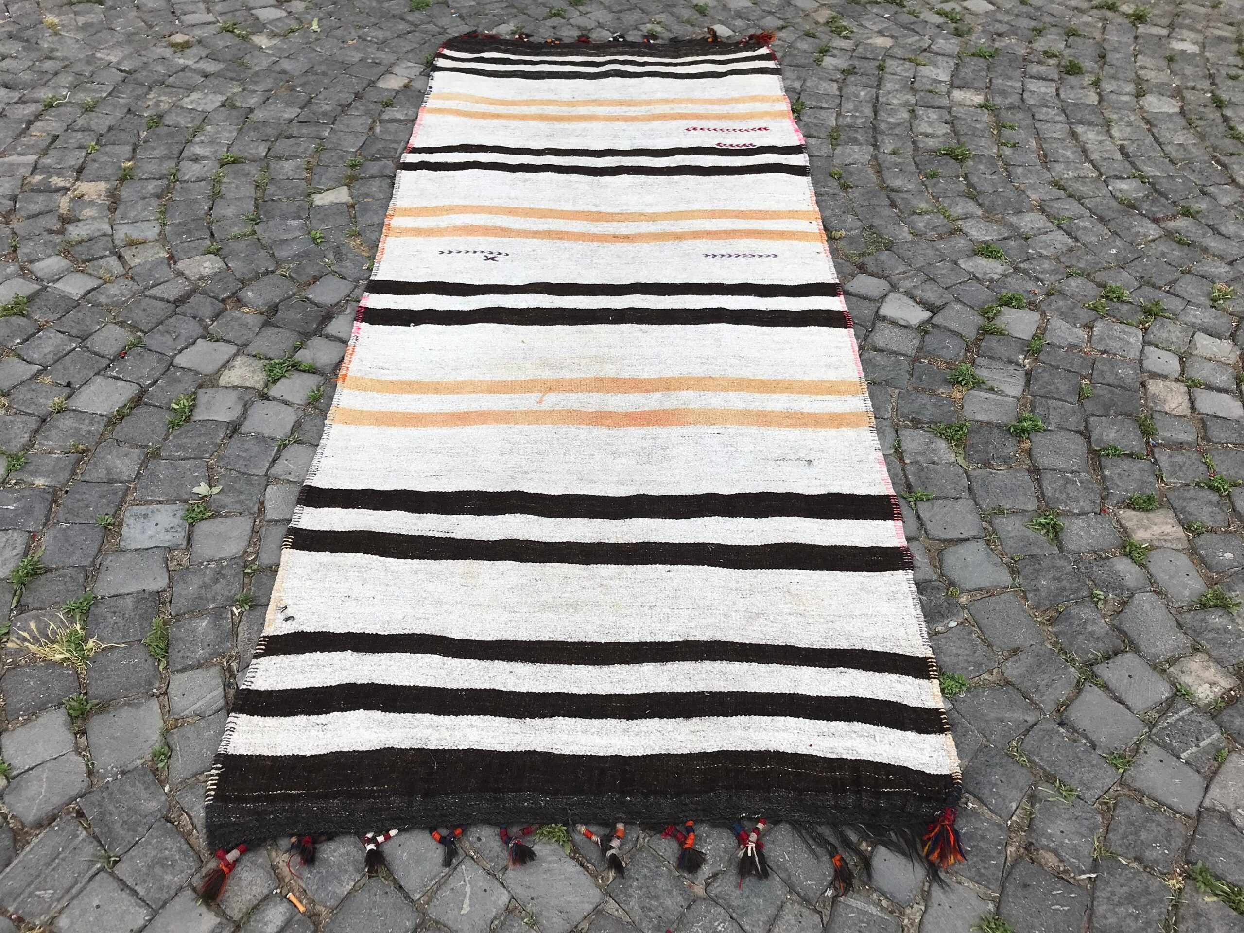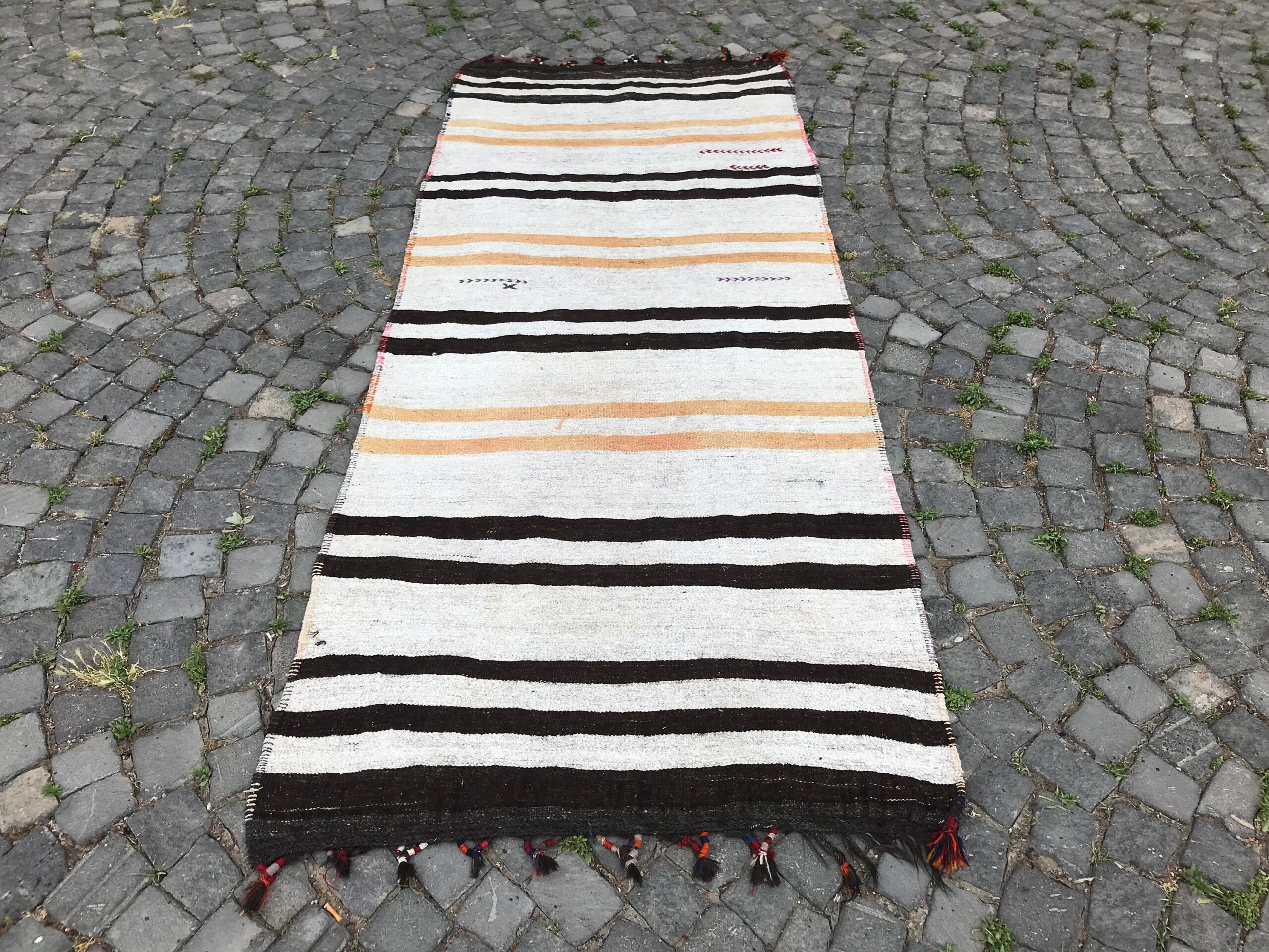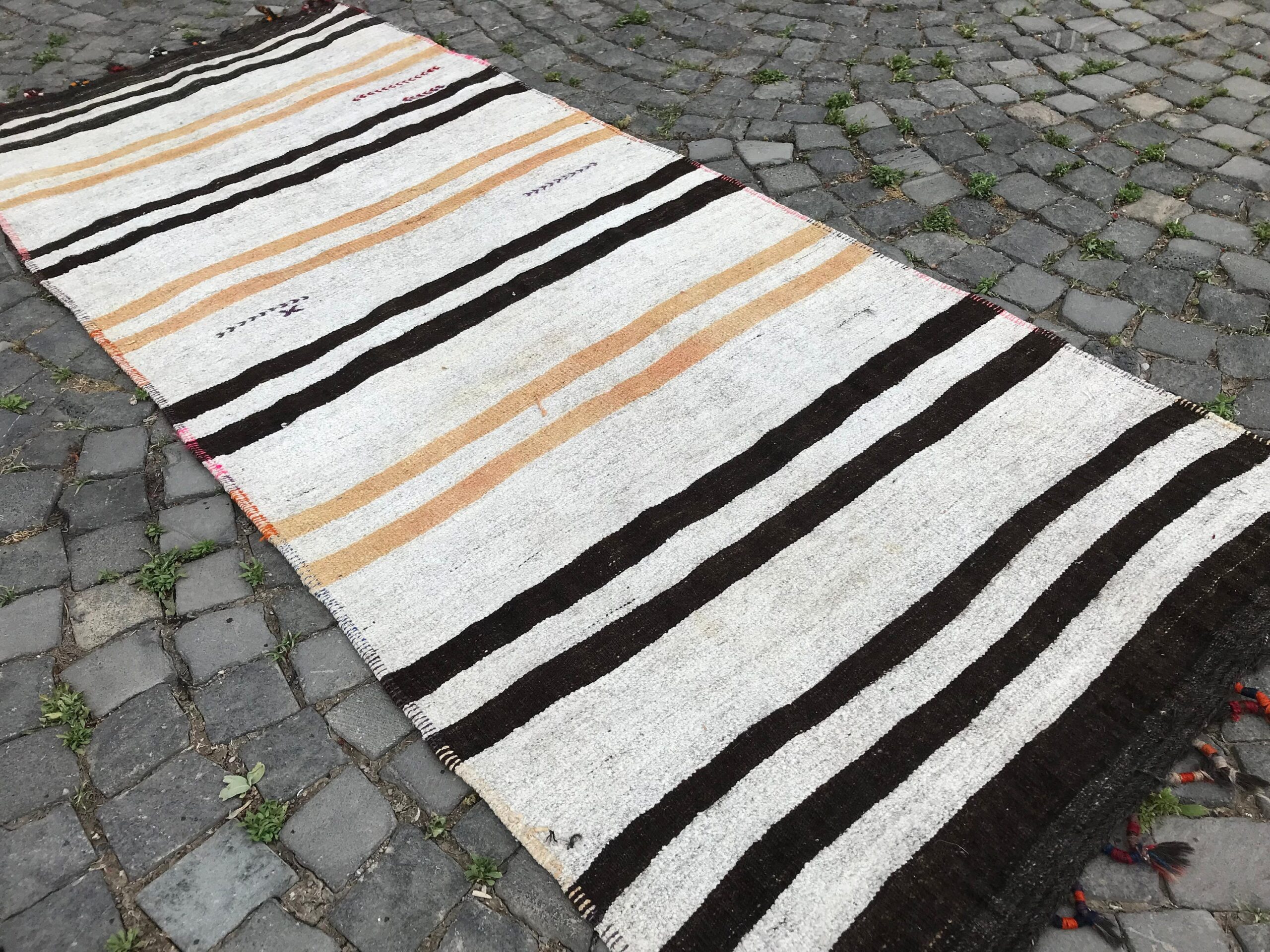 Lovely and unique 3.6 ft. x 8.9 ft. (111 cm x 272 cm) vintage kilim rug hand-woven in Turkey from organic wool. This is an authentic vintage kilim rug from the 1970s that has worn beautifully to perfection.
