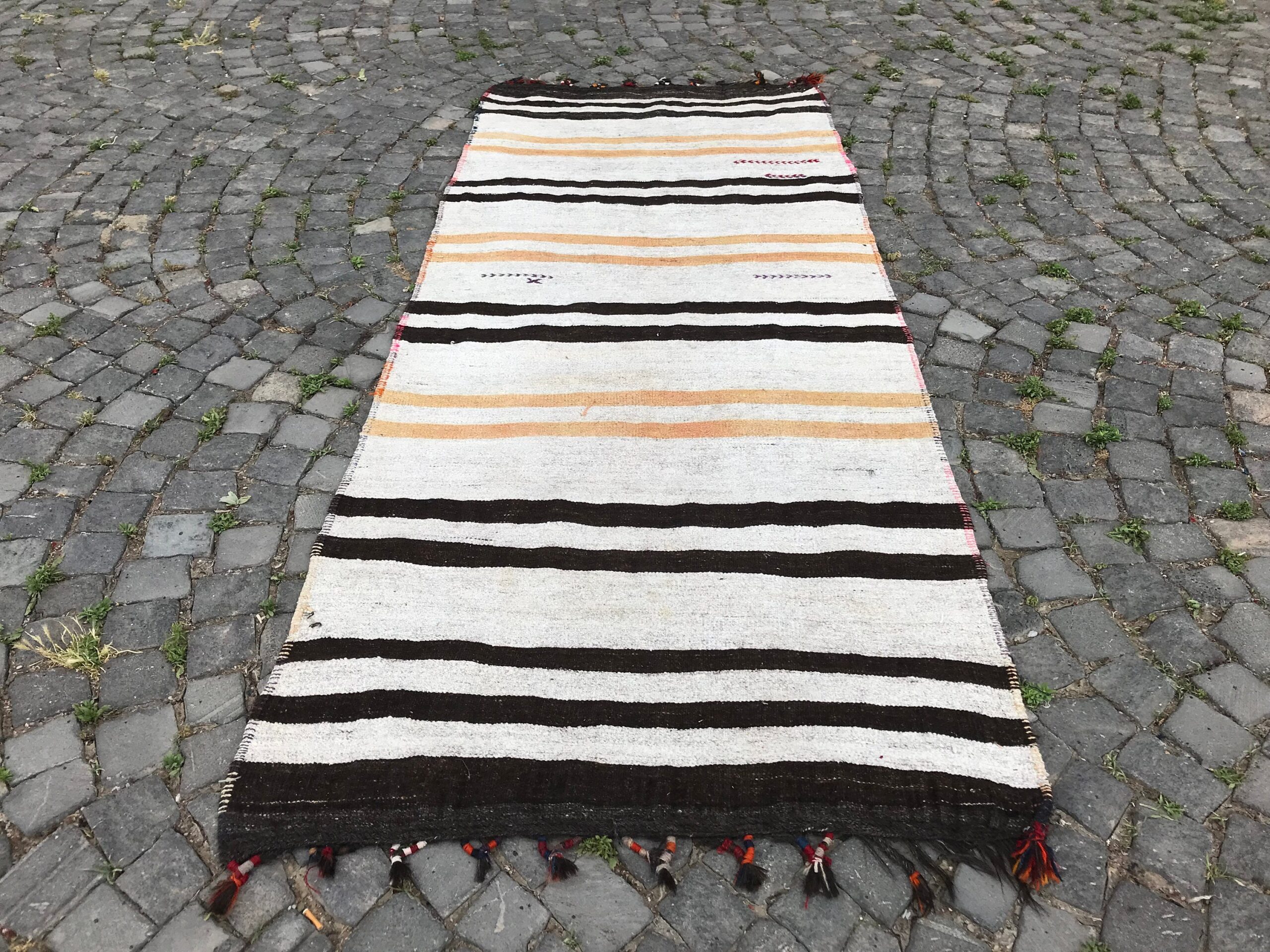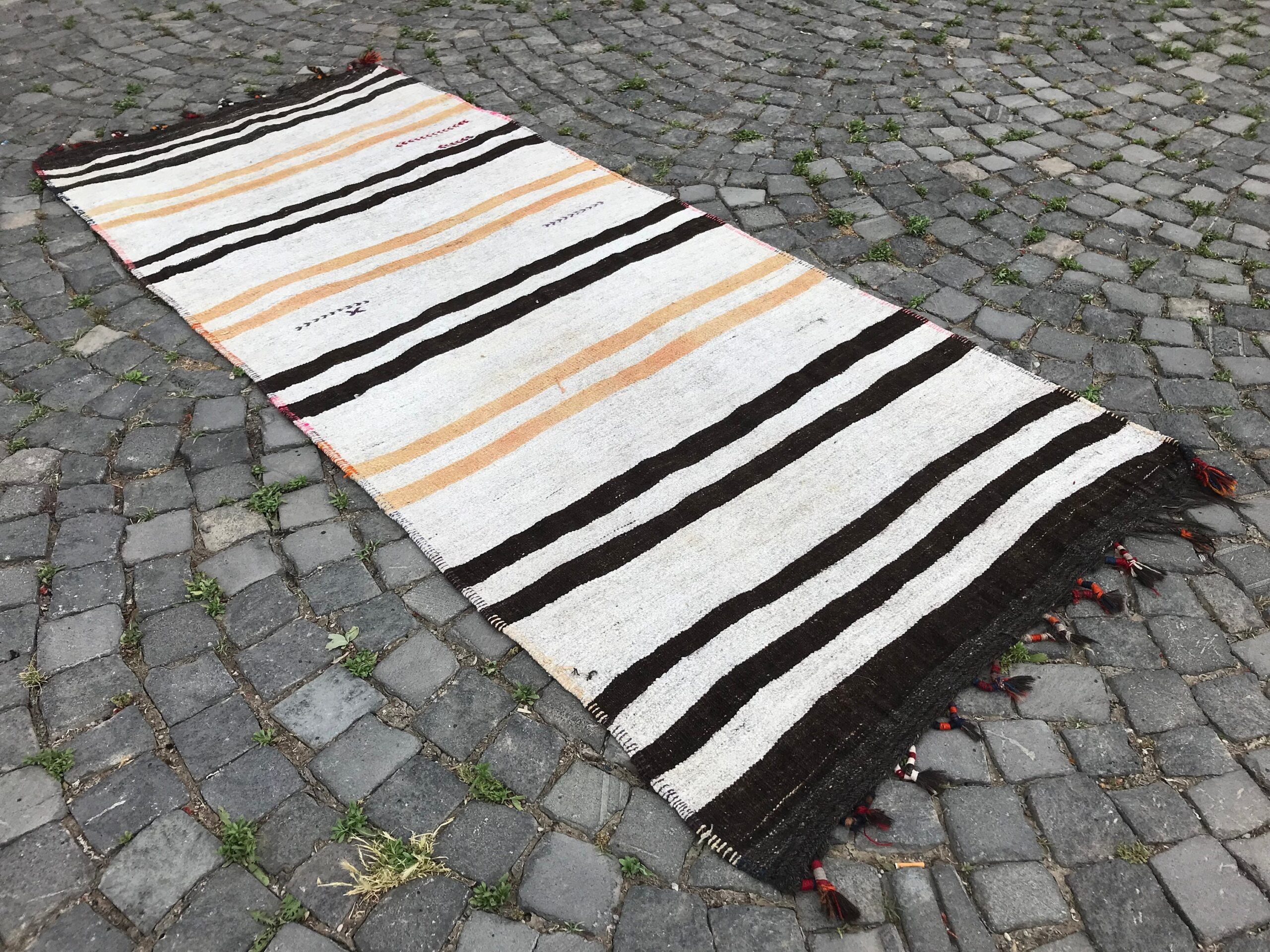 This is a vintage kilim rug hand-woven in a small village in Turkey by skilled Anatolian women during around the 1970s. It is made from natural wool (sheep) and dyed using all-natural (vegetable) dyes. Natural materials are more durable than synthetic materials guaranteeing a rug that can last for years while natural dyes provide colors that gets more beautiful as years pass by especially when in direct sunlight.