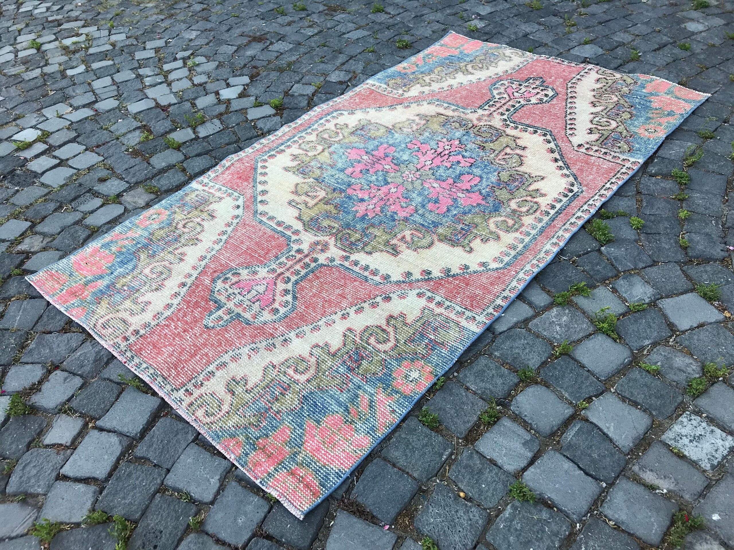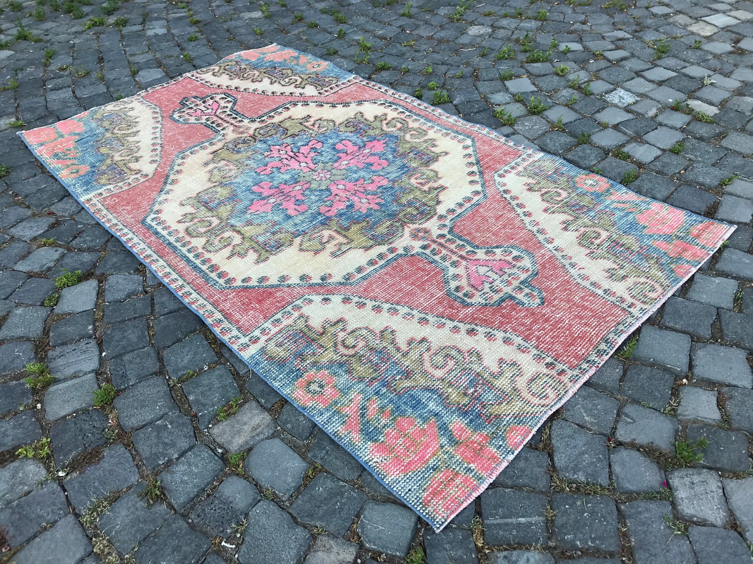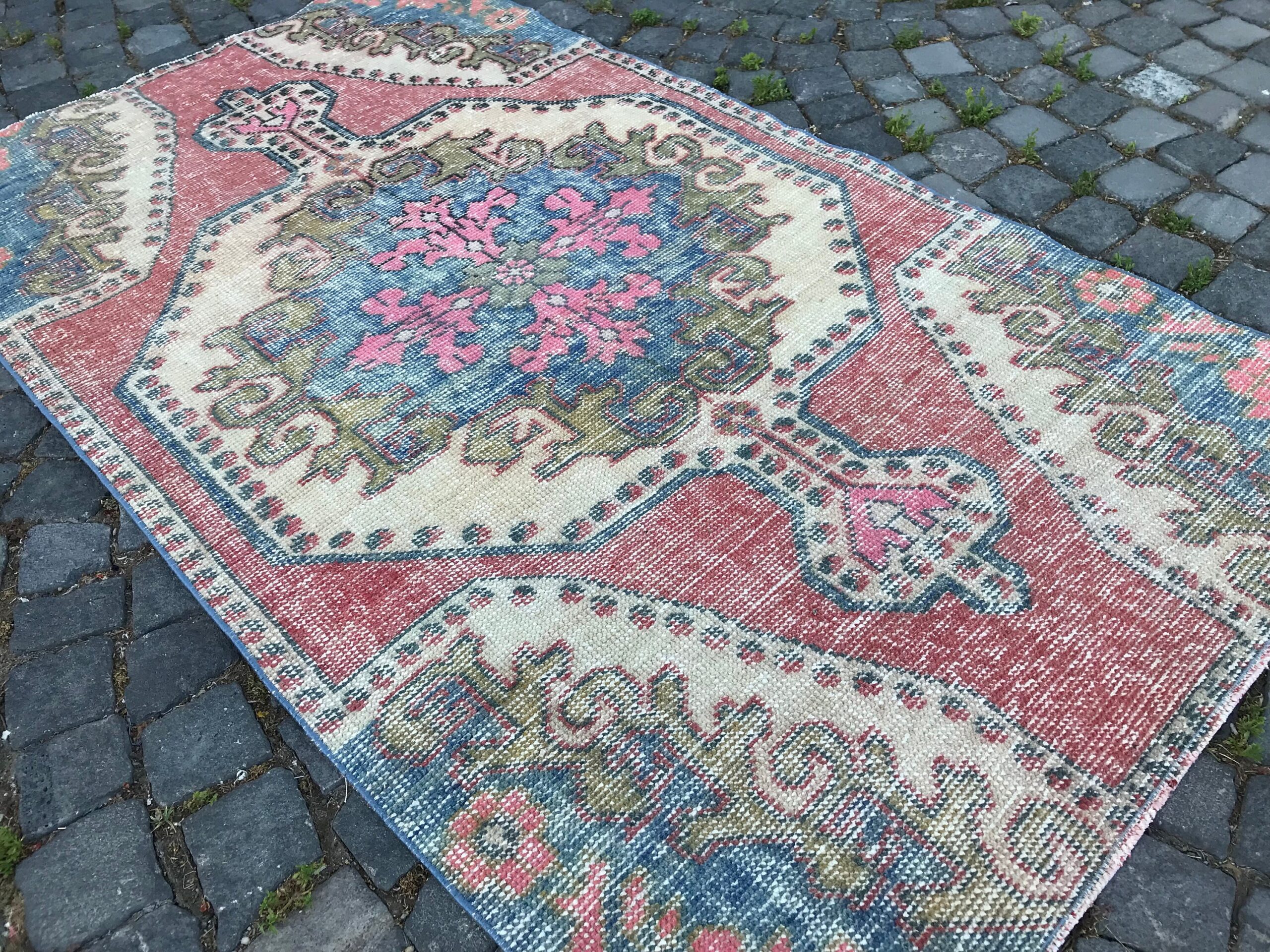 This is a vintage Turkish rug hand-knotted in a small village in Turkey by skilled Anatolian women during around the 1980s. It is made from natural wool (sheep) and dyed using all-natural (vegetable) dyes. Natural materials are more durable than synthetic materials guaranteeing a rug that can last for years while natural dyes provide colors that gets more beautiful as years pass by especially when in direct sunlight.