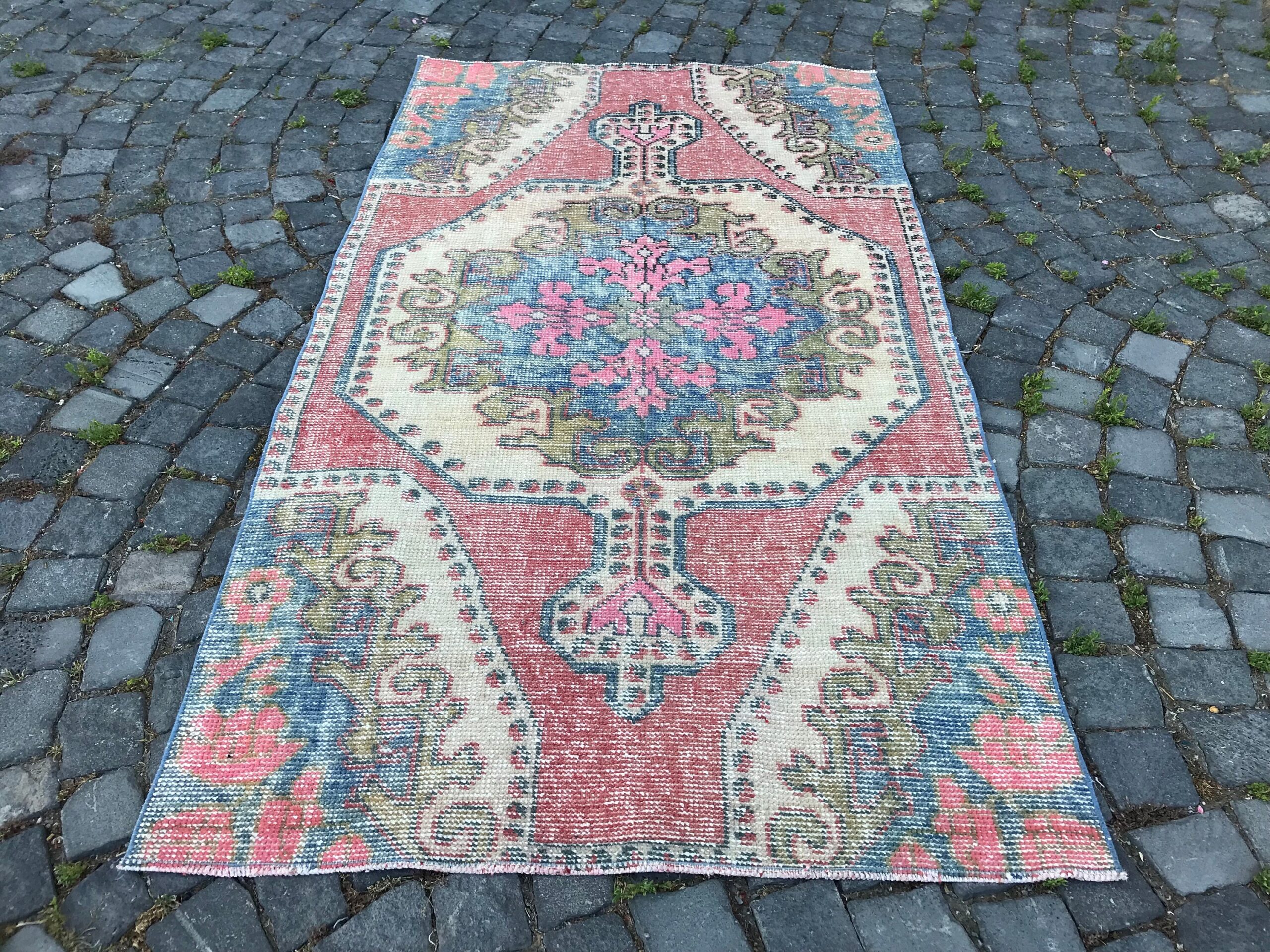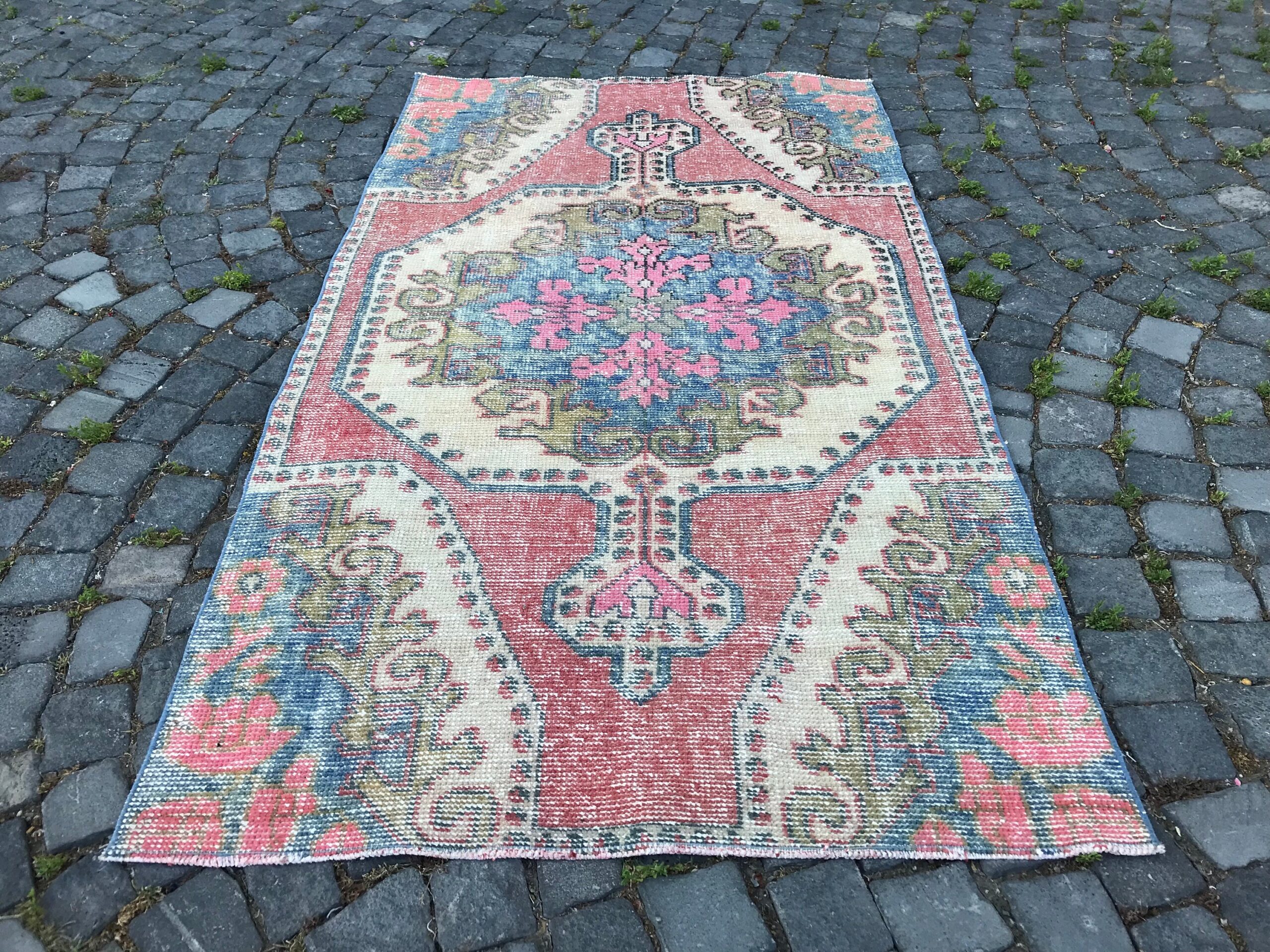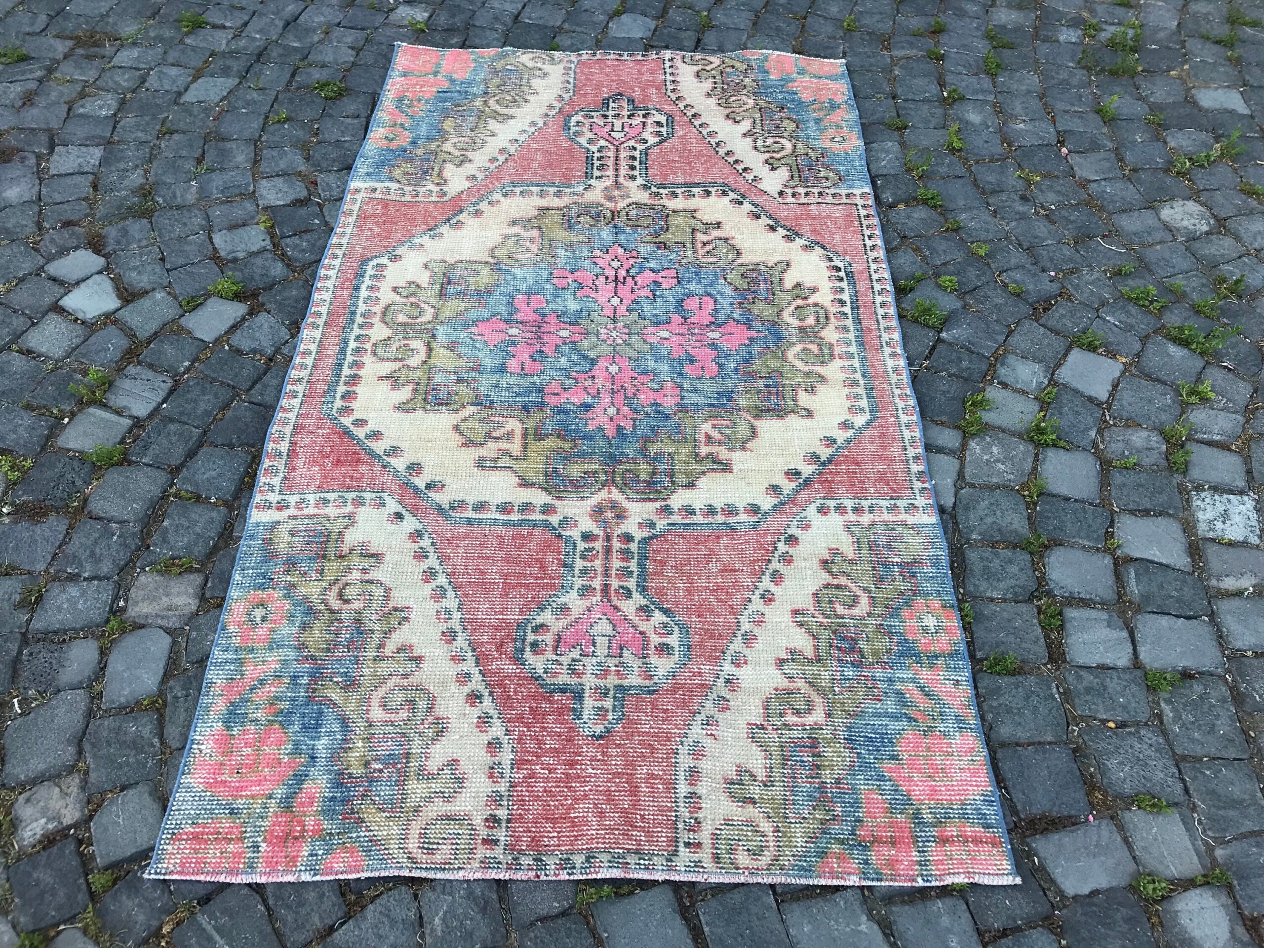 This is a vintage Turkish rug hand-knotted in a small village in Turkey by skilled Anatolian women during around the 1980s. It is made from natural wool (sheep) and dyed using all-natural (vegetable) dyes. Natural materials are more durable than synthetic materials guaranteeing a rug that can last for years while natural dyes provide colors that gets more beautiful as years pass by especially when in direct sunlight.