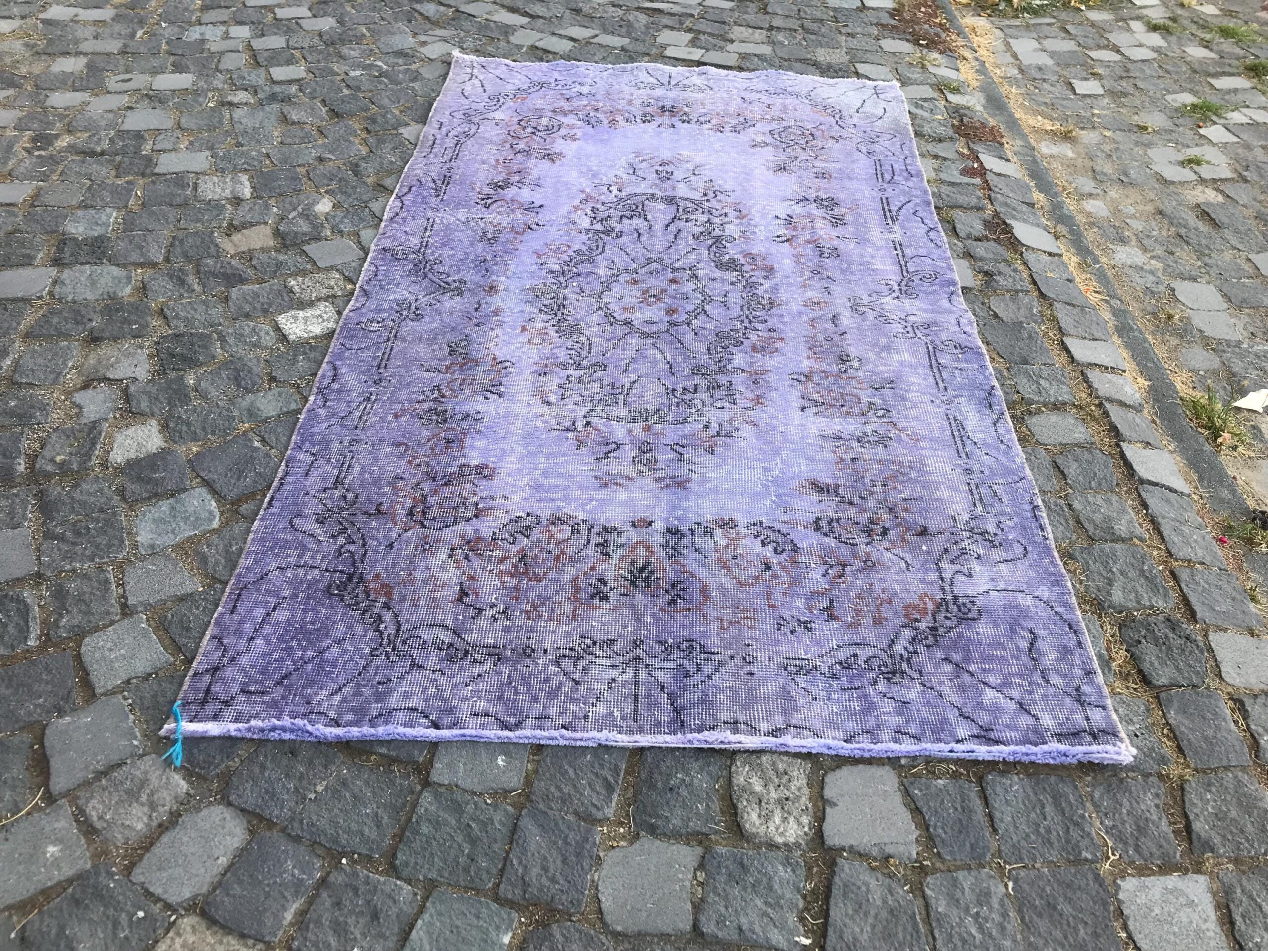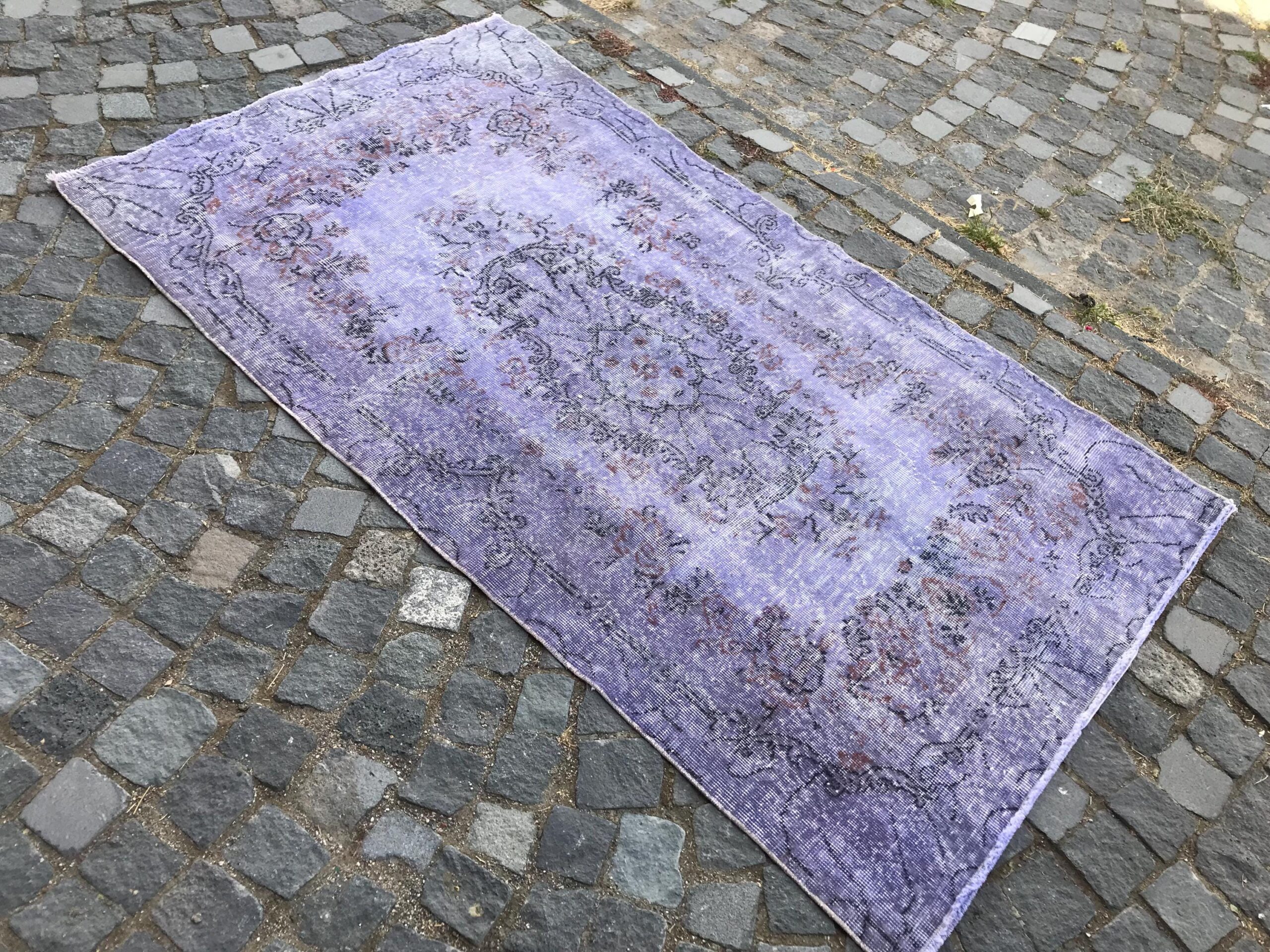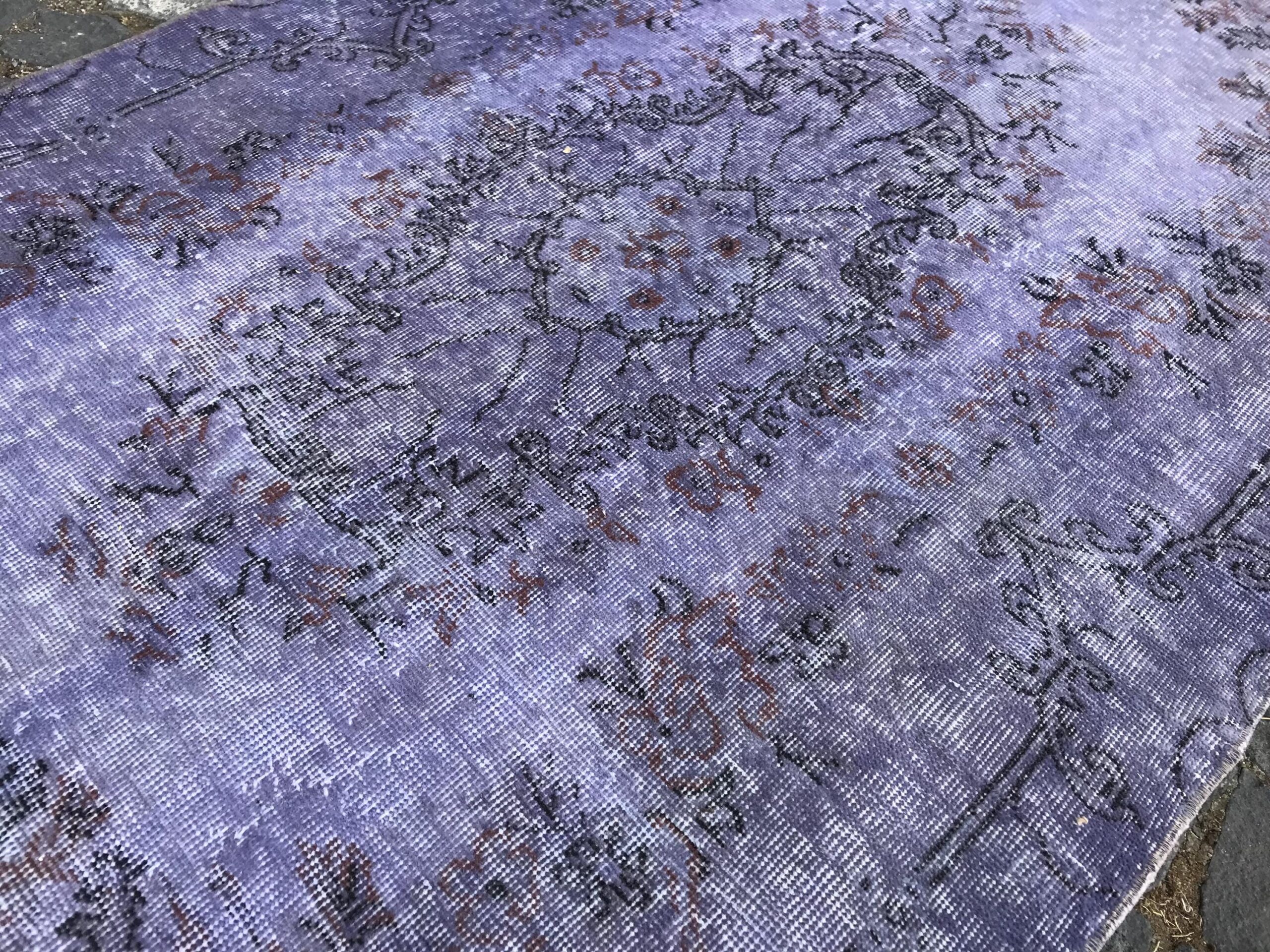 This is a vintage overdyed rug made through over-dyeing an authentic vintage Turkish rug using natural (vegetable) dyes. This rug originated in a small village in Turkey where it was hand-knotted from natural wool (sheep) by skilled Anatolian women during around the 1980s. Natural materials are more durable than synthetic materials guaranteeing a rug that can last for years while natural dyes provide colors that gets more beautiful as years pass by especially when in direct sunlight.