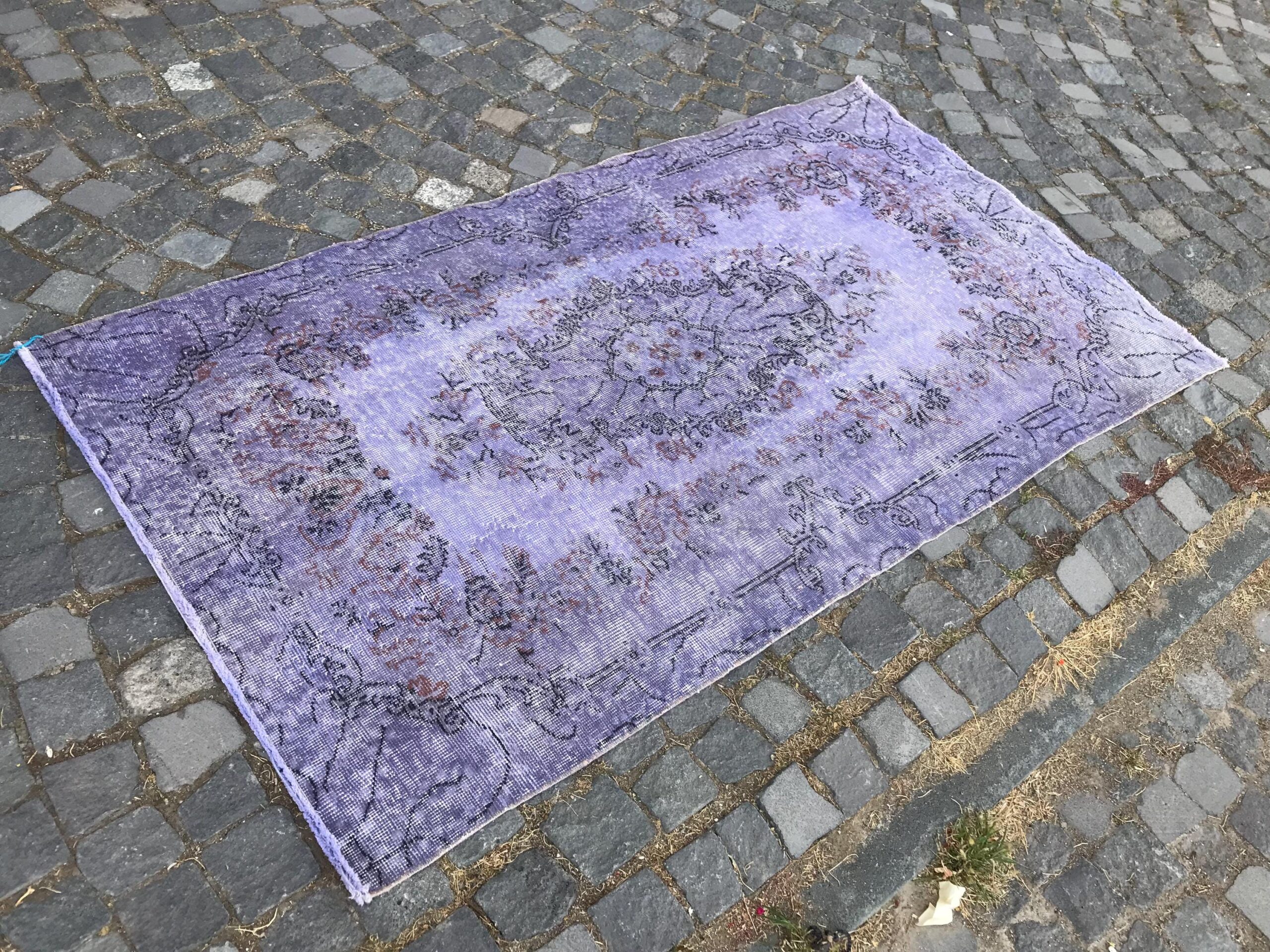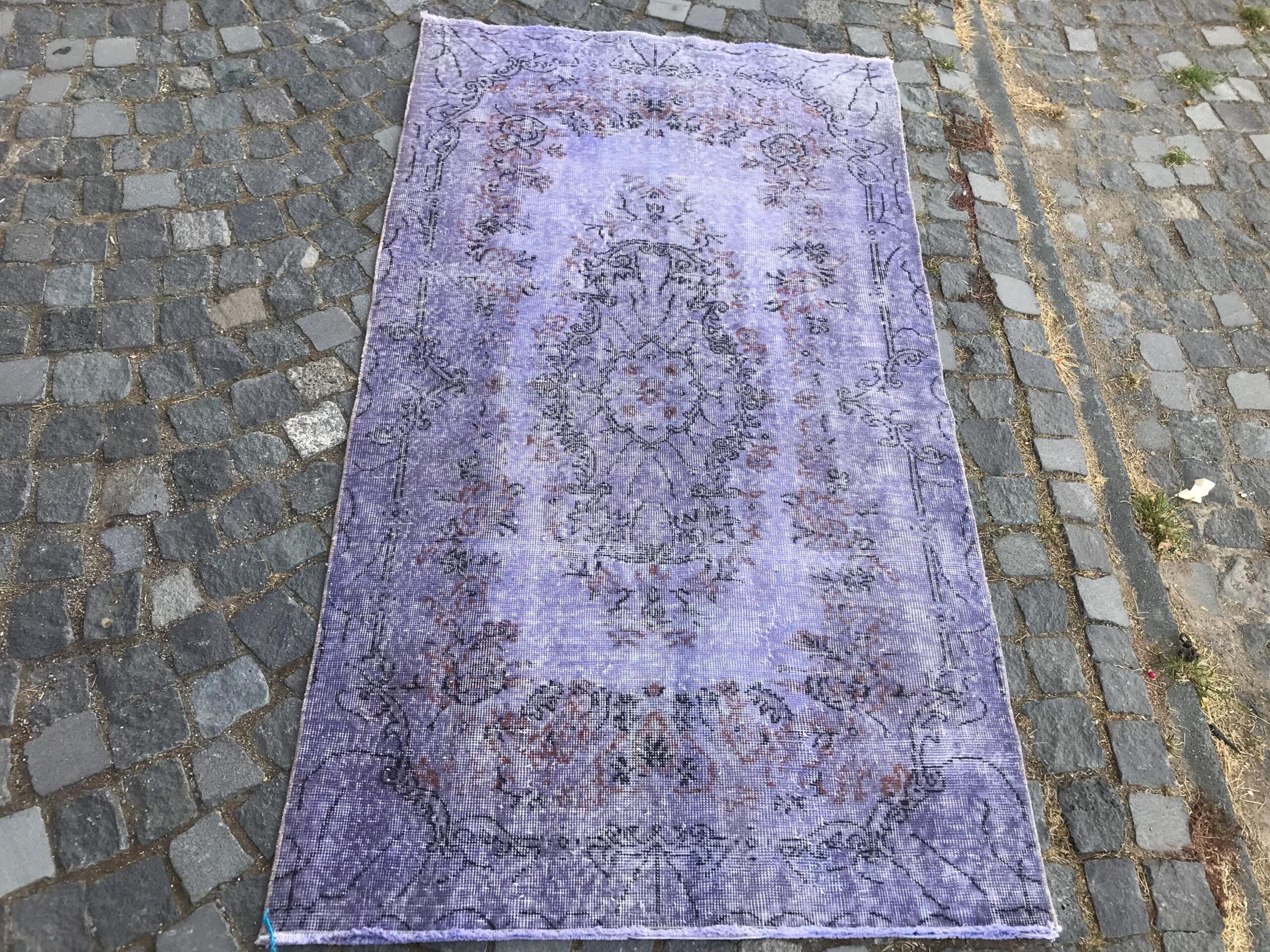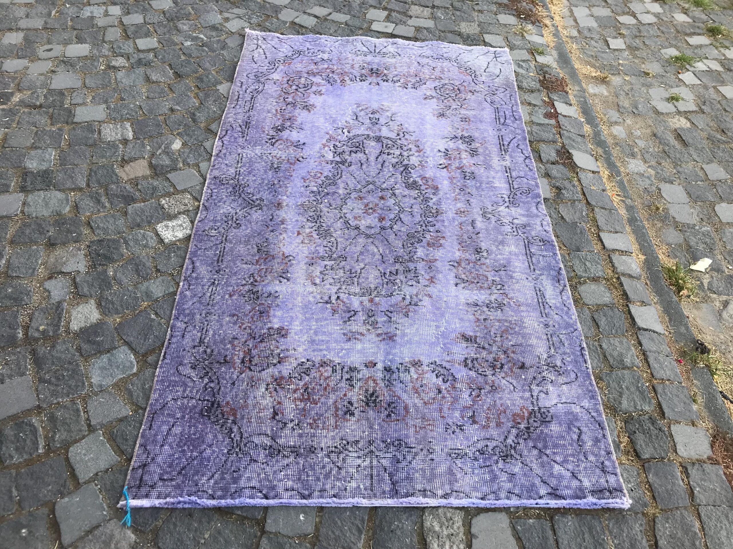 This is a vintage overdyed rug made through over-dyeing an authentic vintage Turkish rug using natural (vegetable) dyes. This rug originated in a small village in Turkey where it was hand-knotted from natural wool (sheep) by skilled Anatolian women during around the 1980s. Natural materials are more durable than synthetic materials guaranteeing a rug that can last for years while natural dyes provide colors that gets more beautiful as years pass by especially when in direct sunlight.