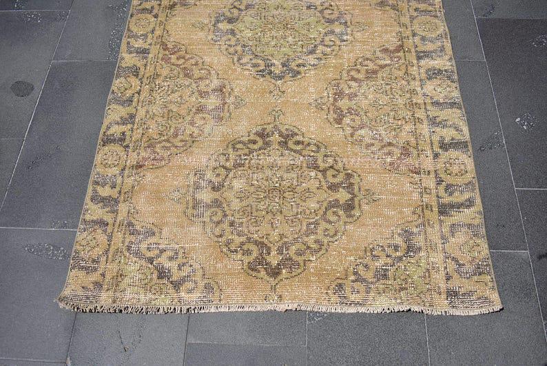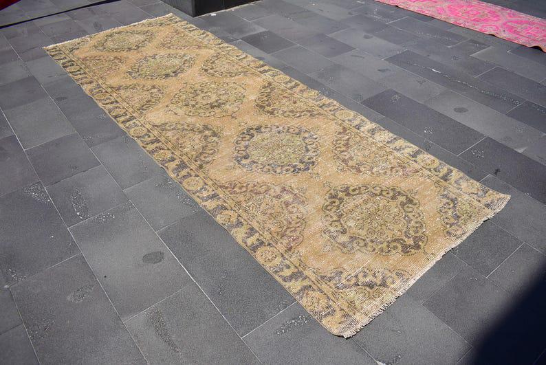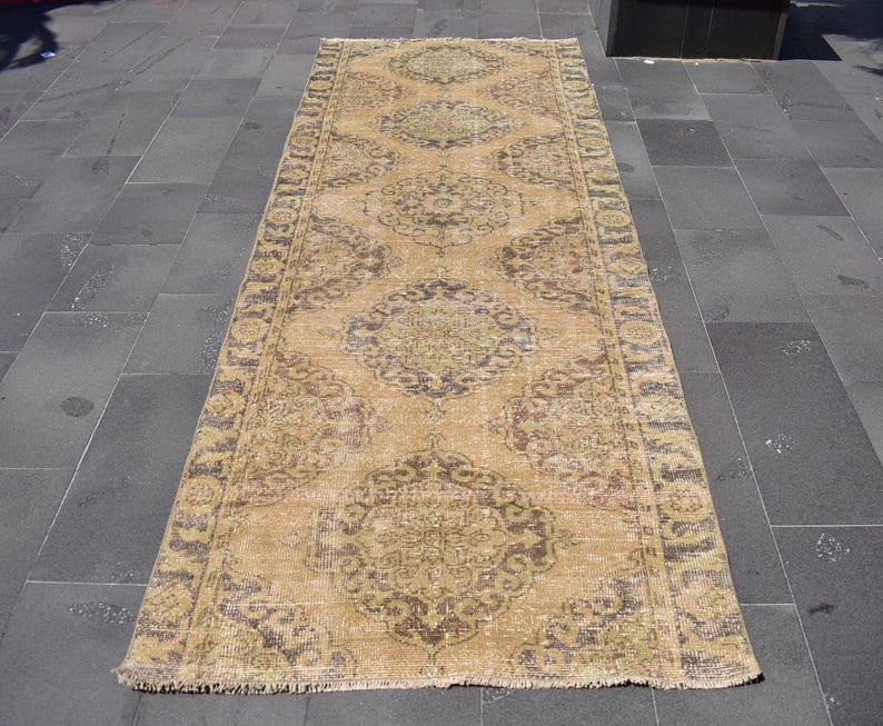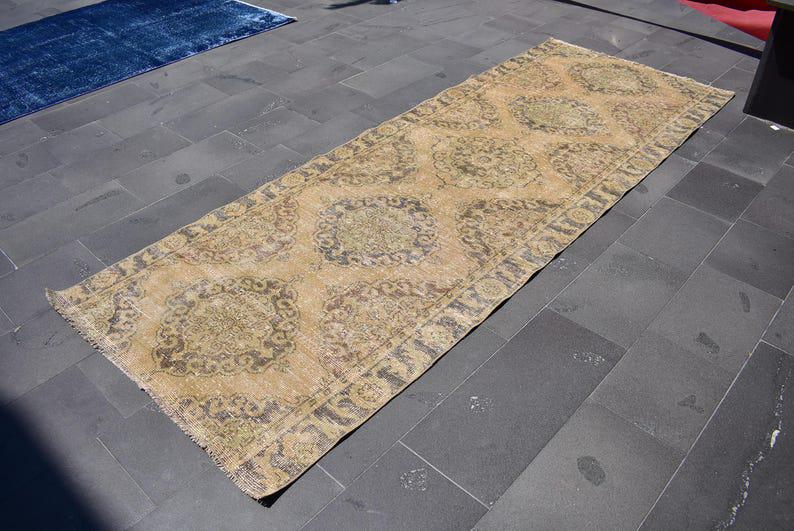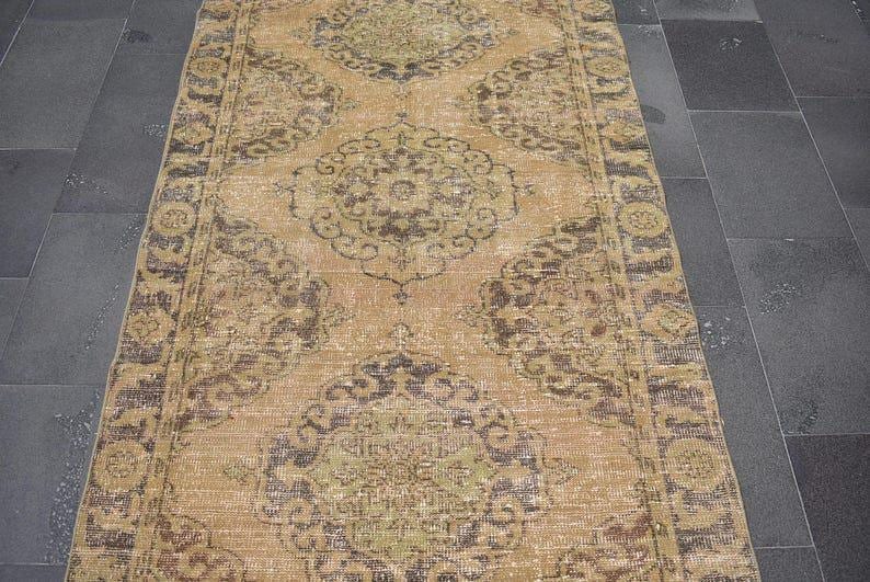 Pretty and one-of-a-kind 3.8 ft. x 10.1 ft. (115 cm x 308 cm) vintage Turkish rug hand-knotted in Turkey from organic wool. This is an authentic vintage Turkish rug from the 1970s that has worn splendidly to perfection.